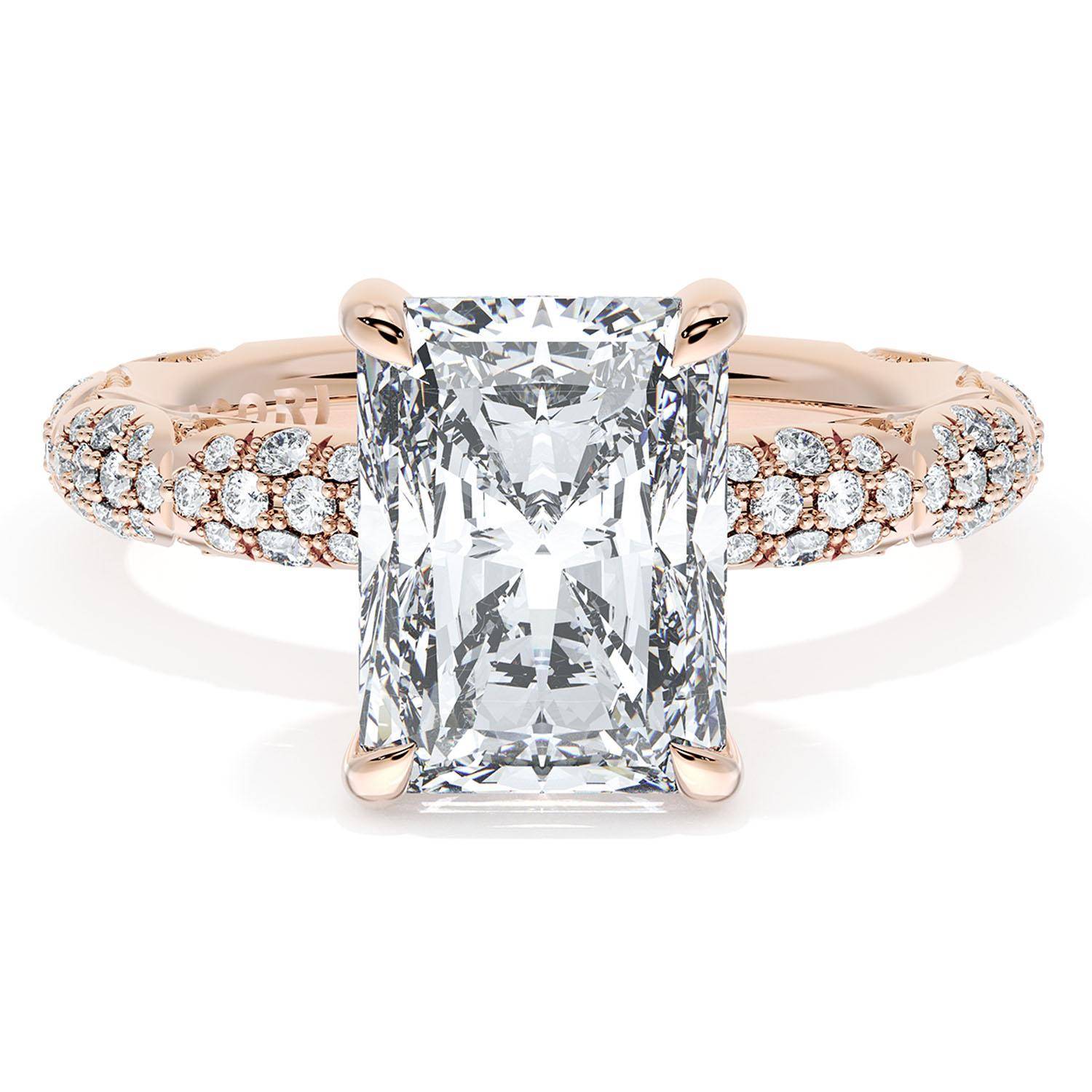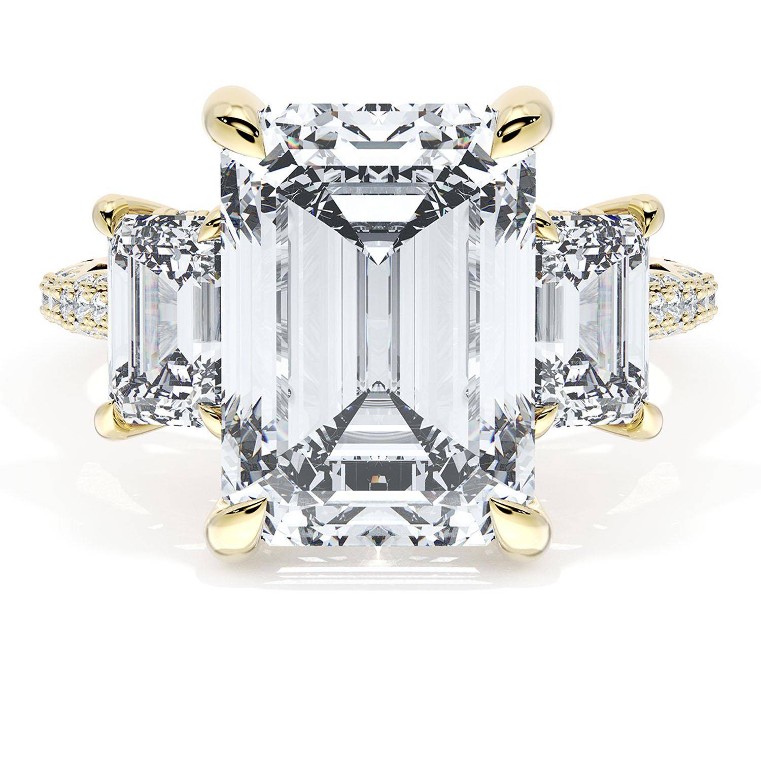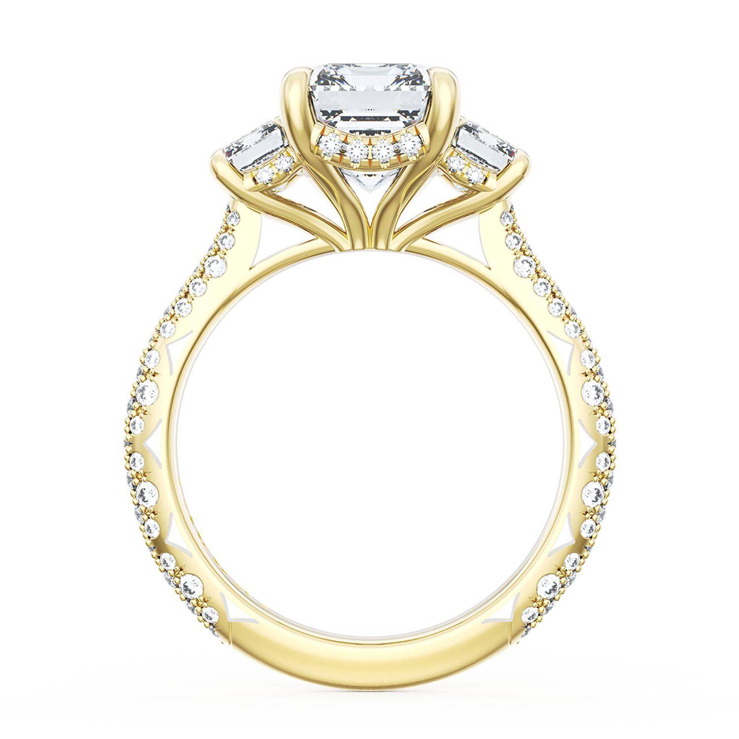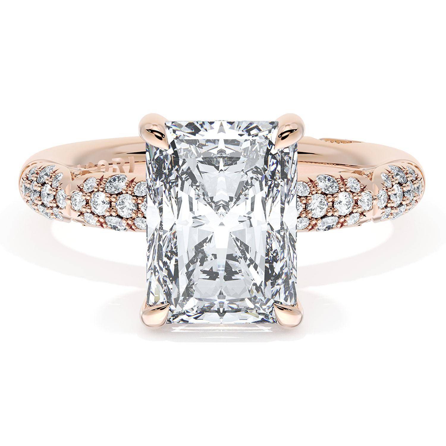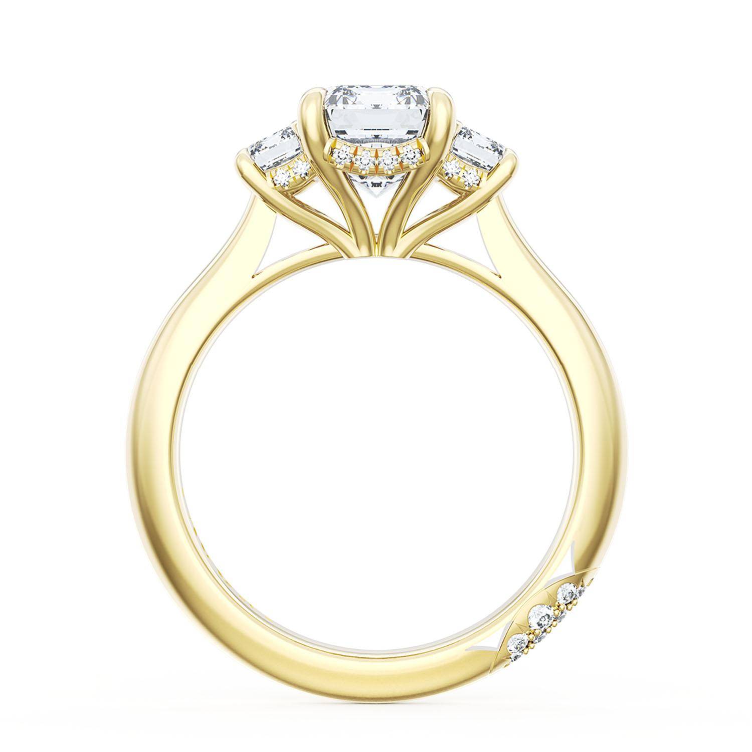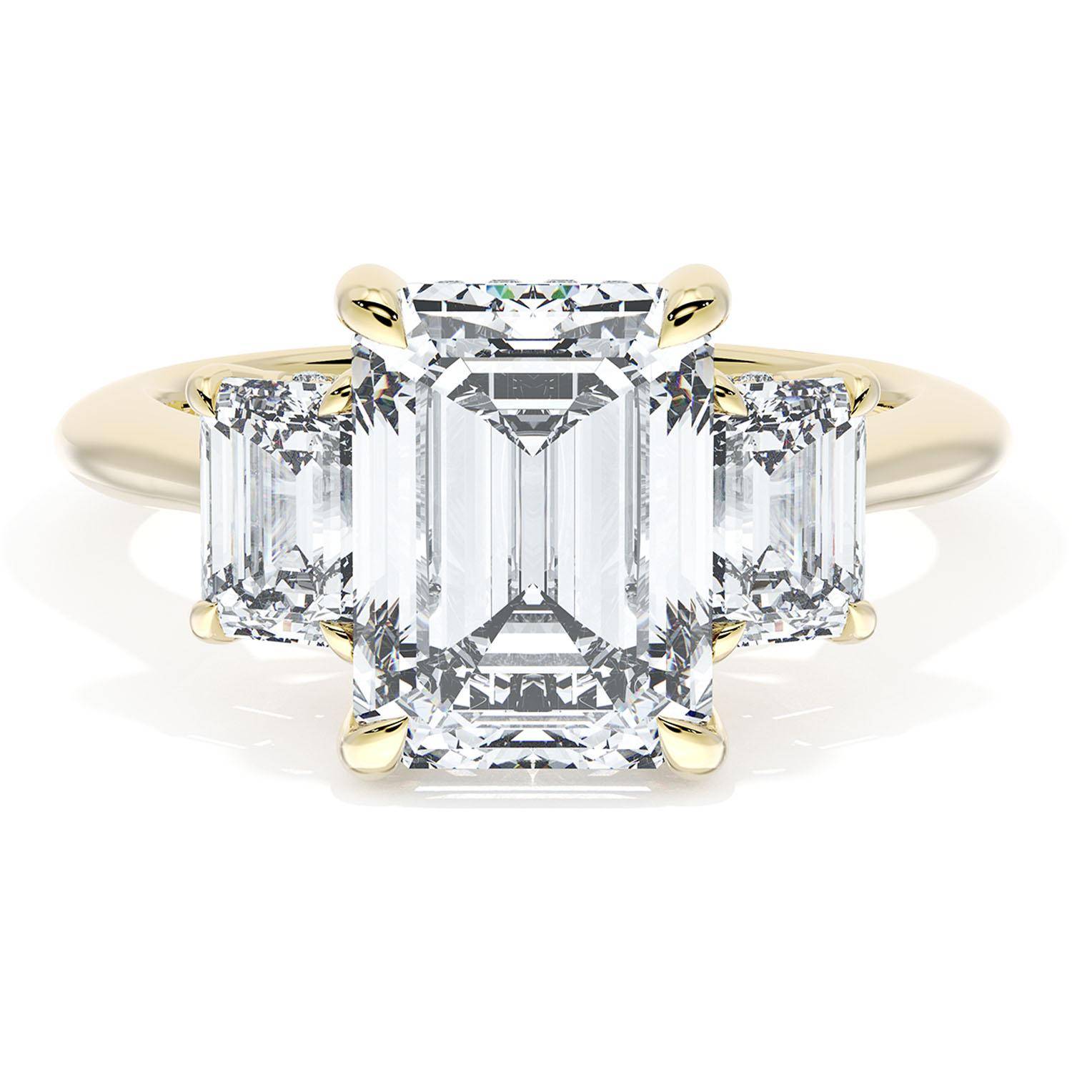 This 3-stone ring features an emerald center and matching emerald side stones, each accented with a hidden bloom. The Founder's Crescent Fabric wraps around the ceiling of the ring and continues for 3/4 diamond coverage.