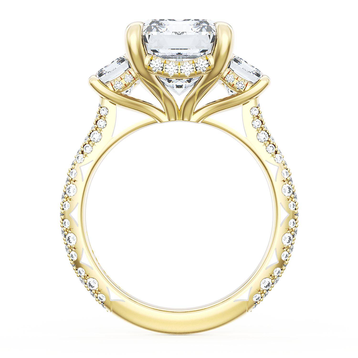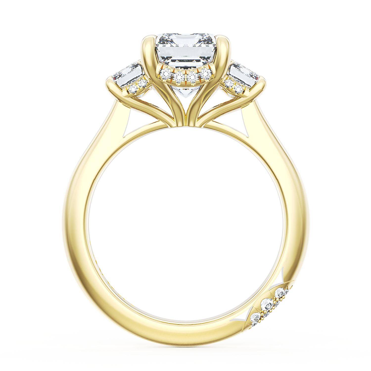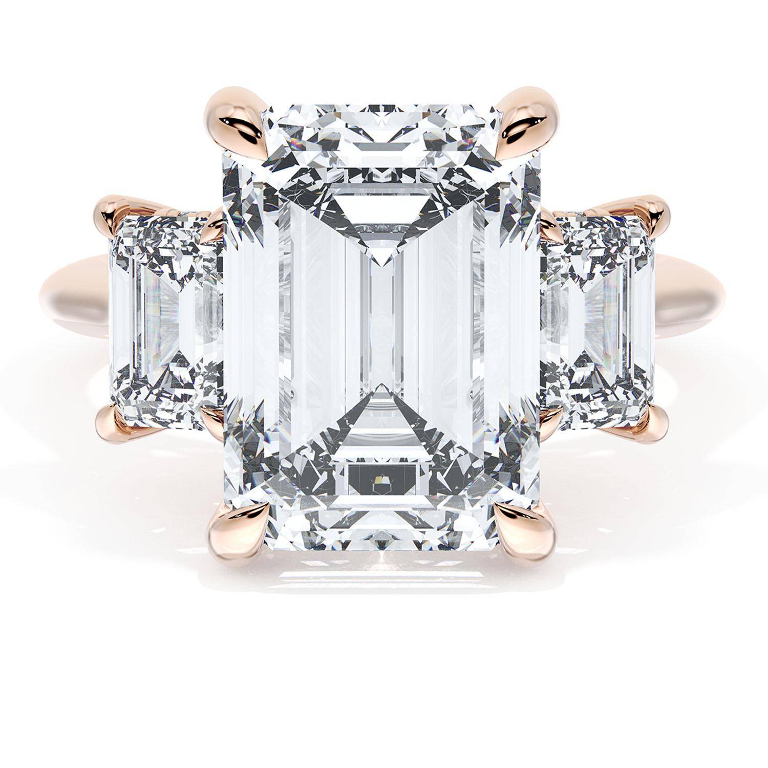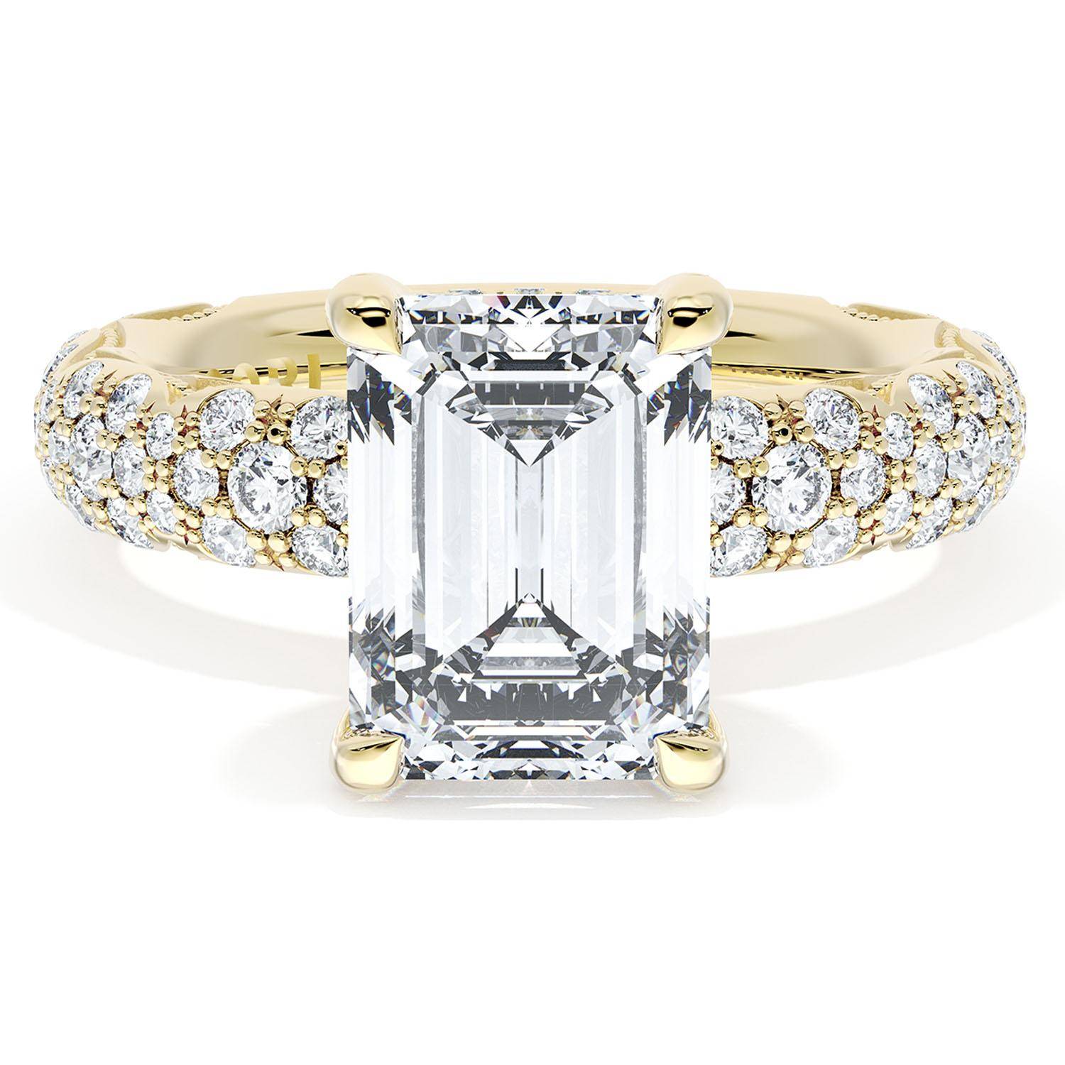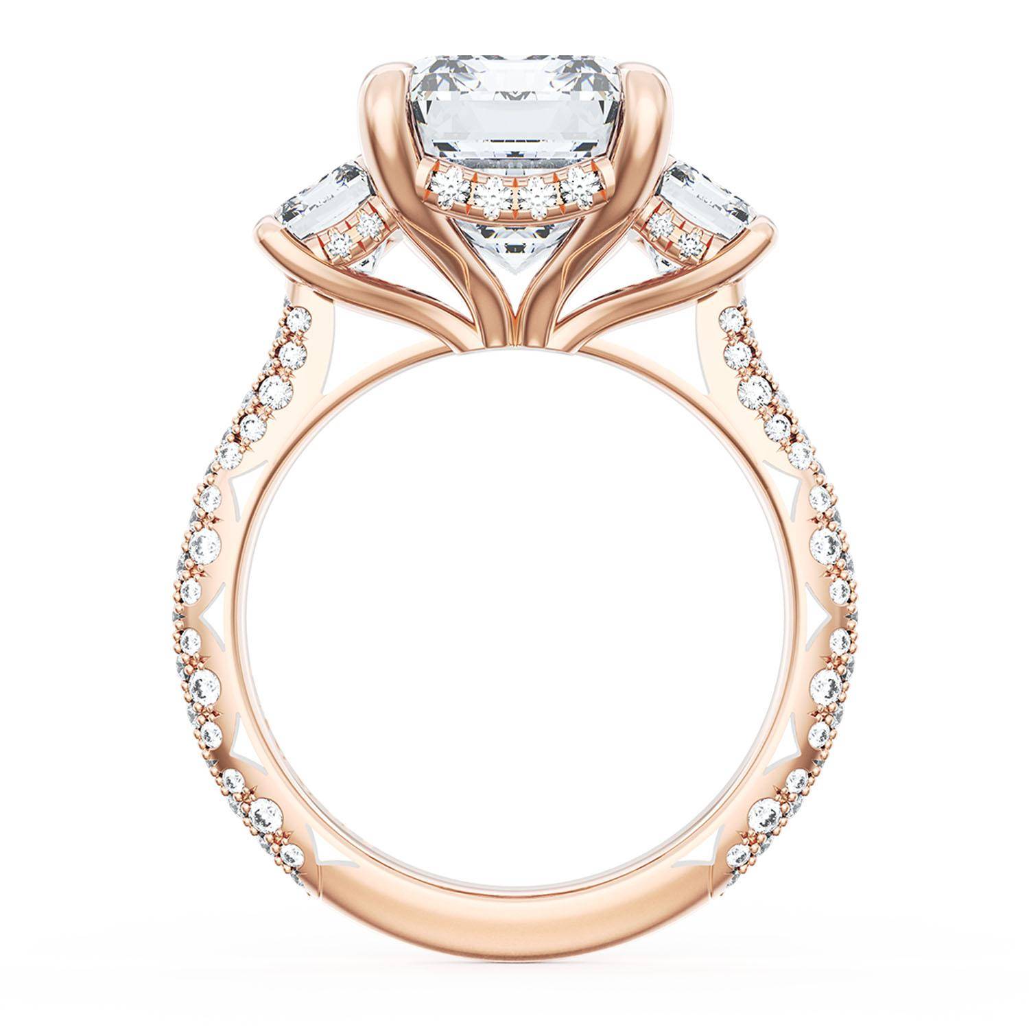 This 3-stone ring features an emerald center and matching emerald side stones, each accented with a hidden bloom. The Founder's Crescent Fabric wraps around the ceiling of the ring and continues for 3/4 diamond coverage.