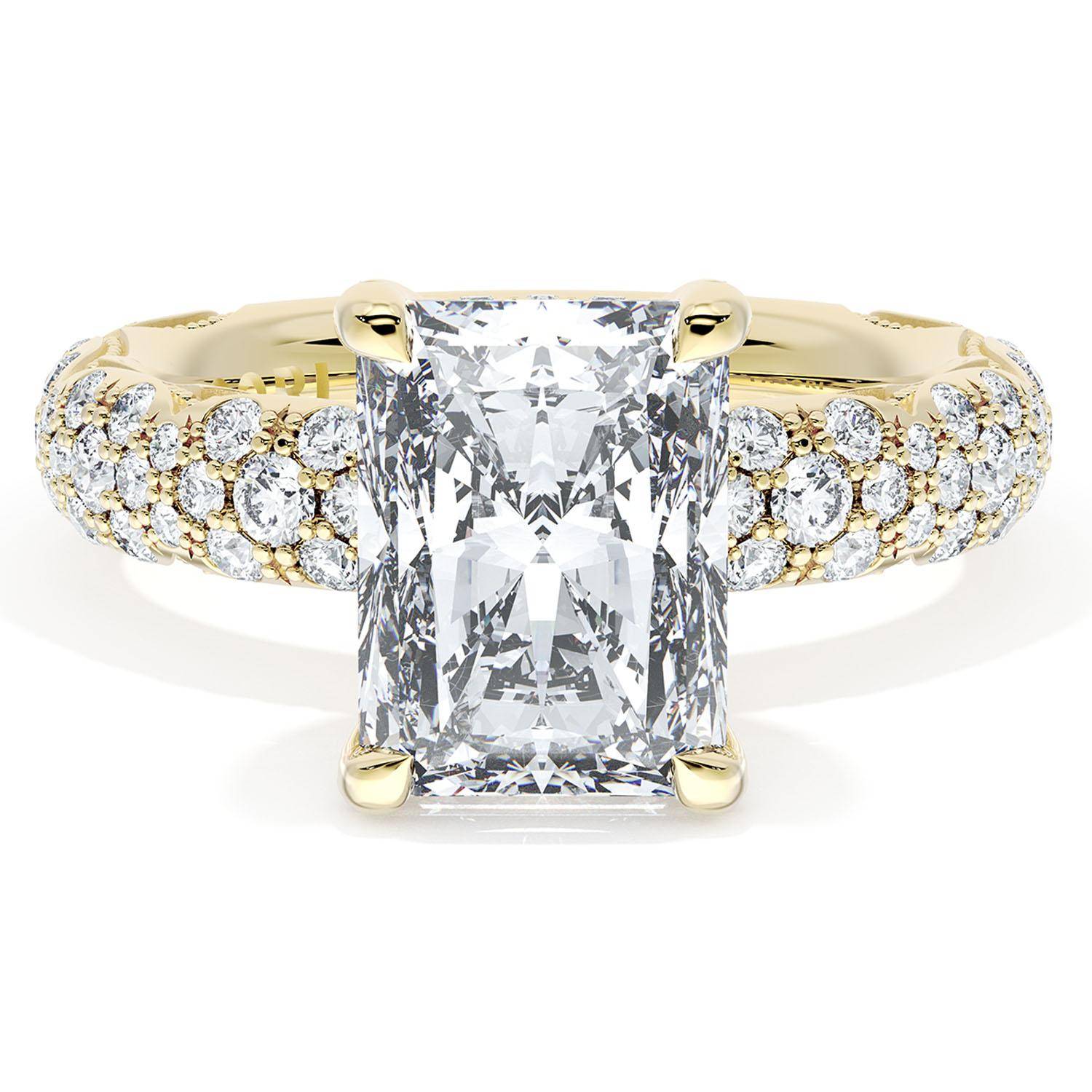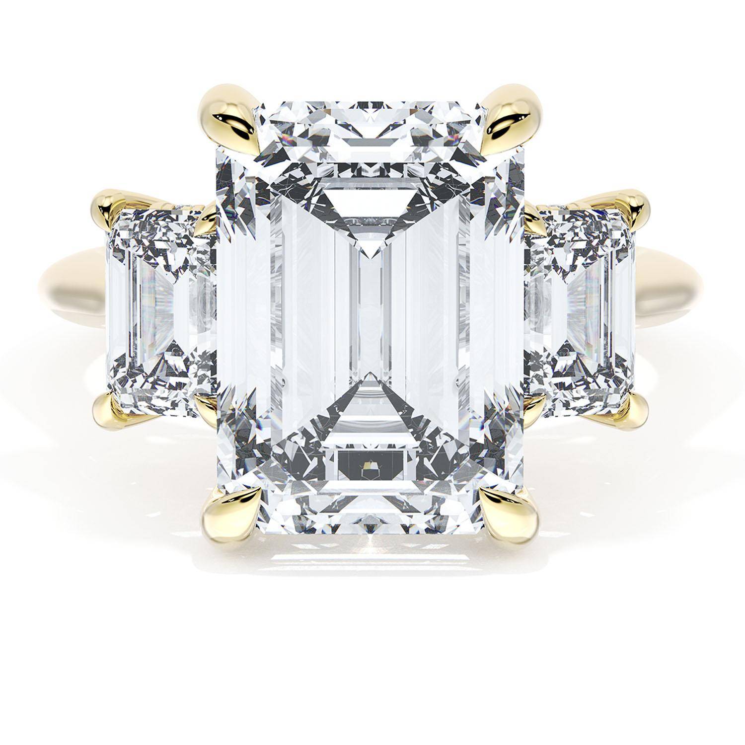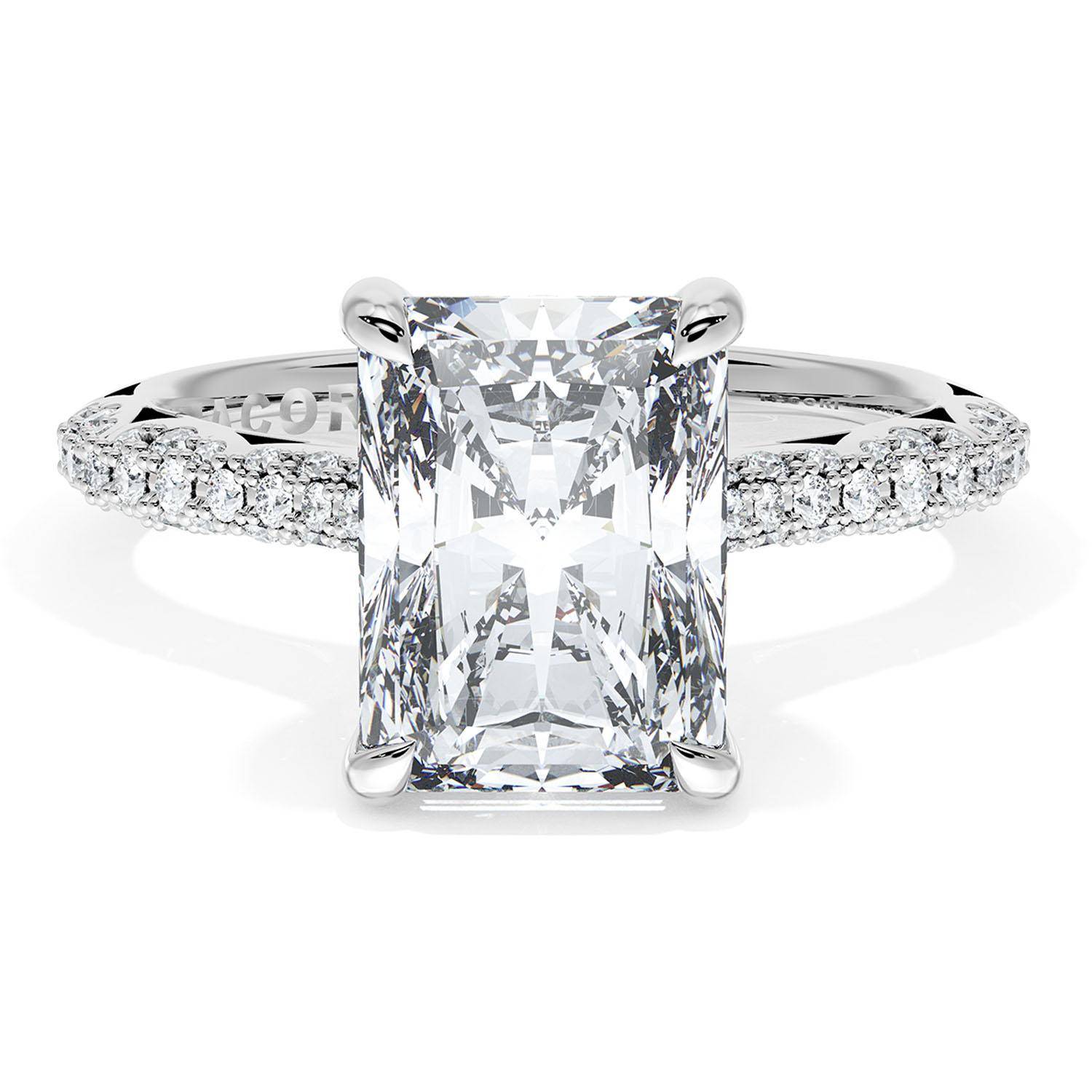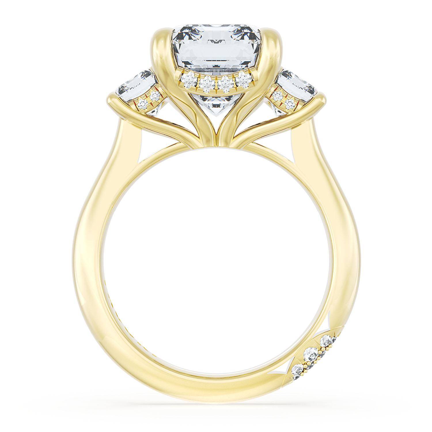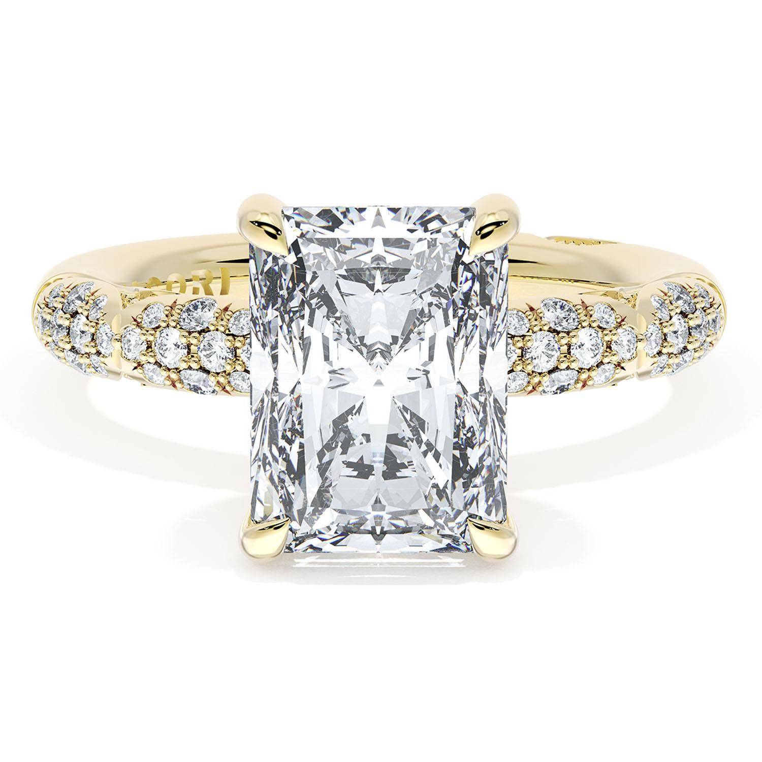 This 3-stone ring features an emerald center and matching emerald side stones, each accented with a hidden bloom. The Founder's Crescent Fabric wraps around the ceiling of the ring and continues for 3/4 diamond coverage.
