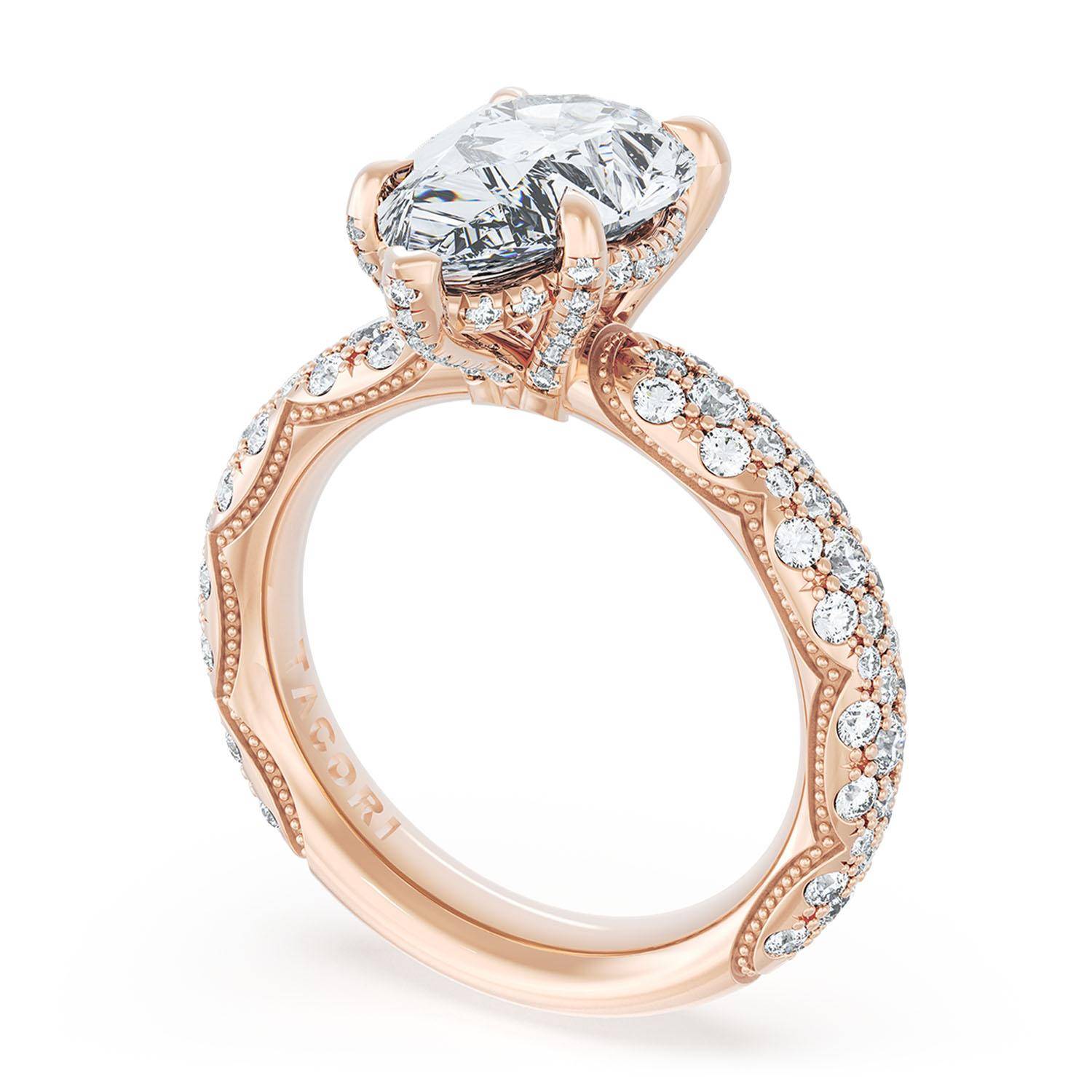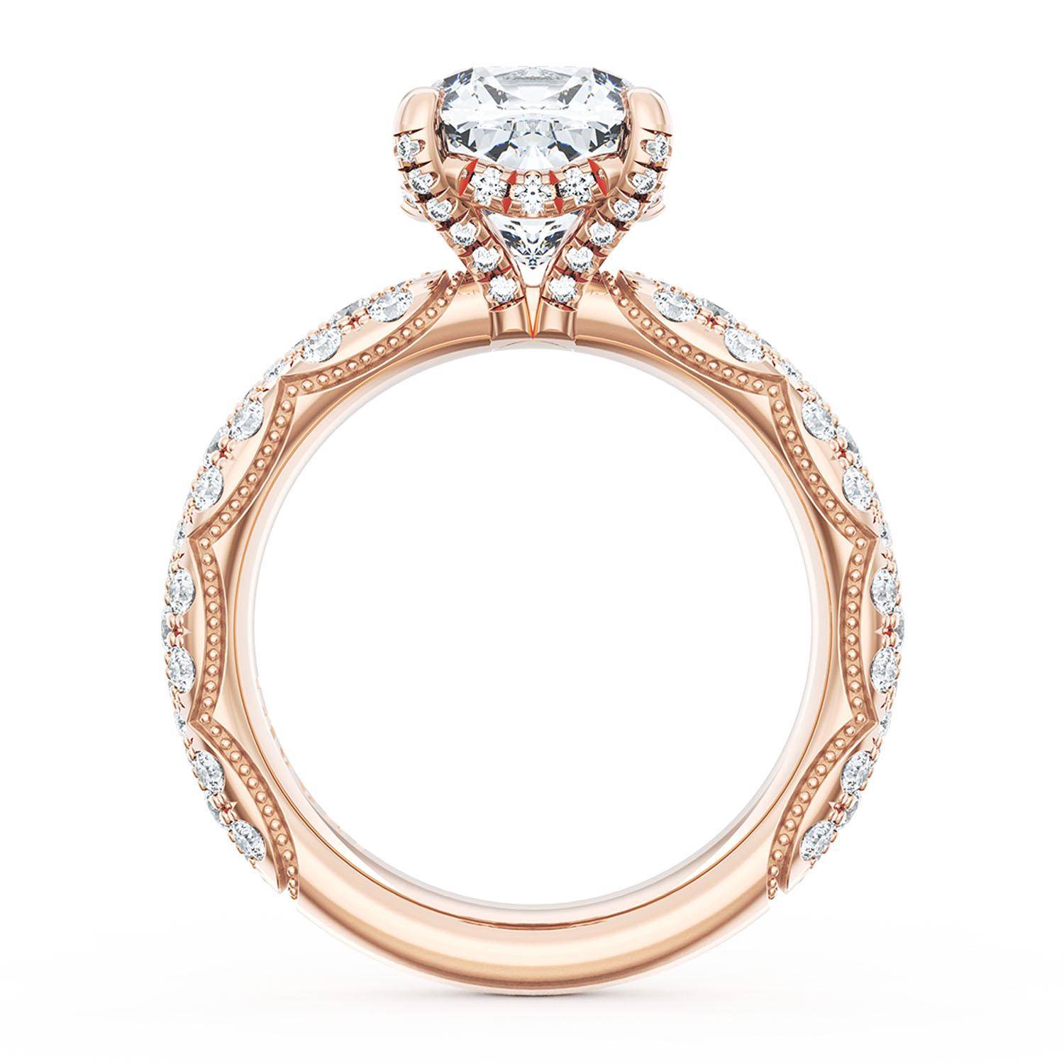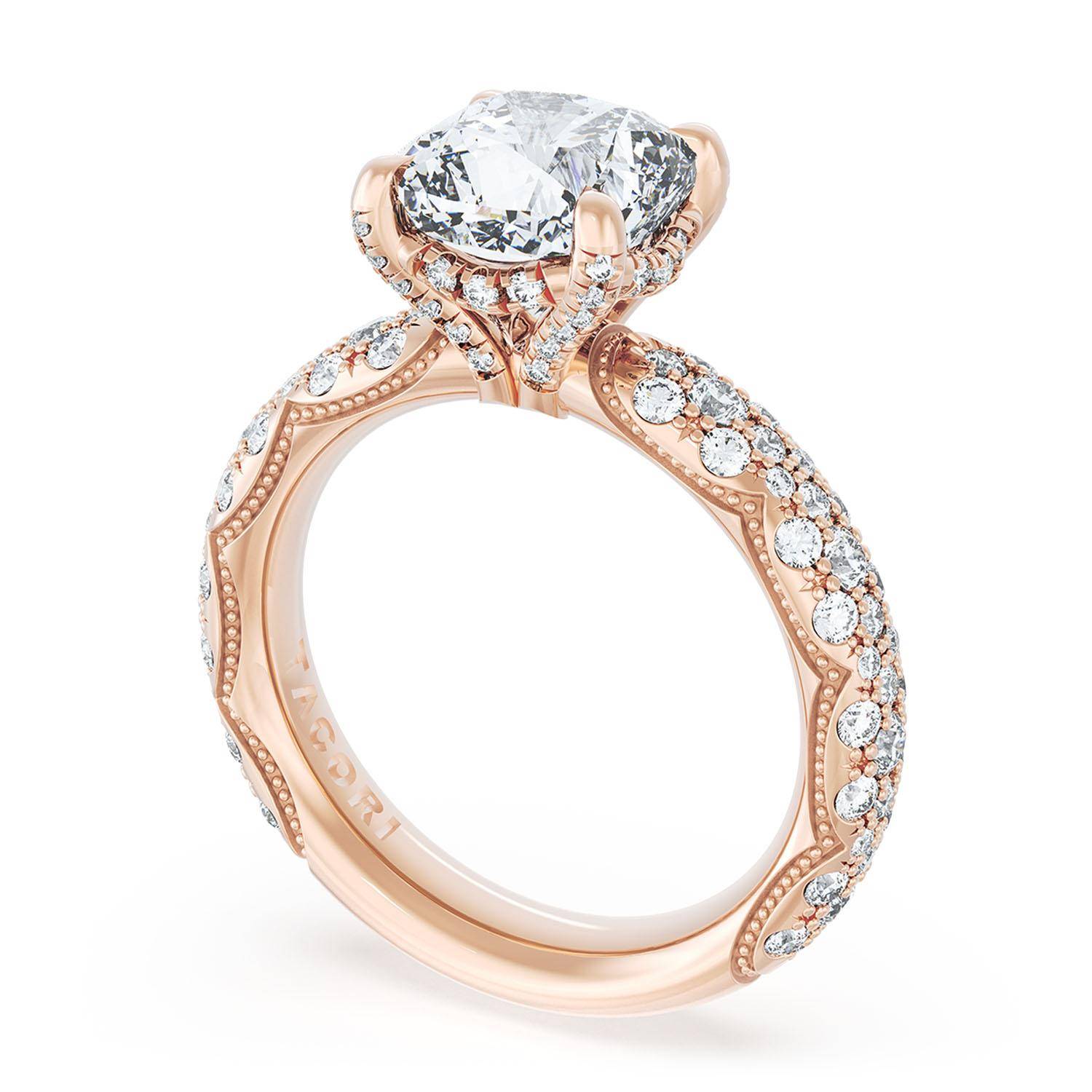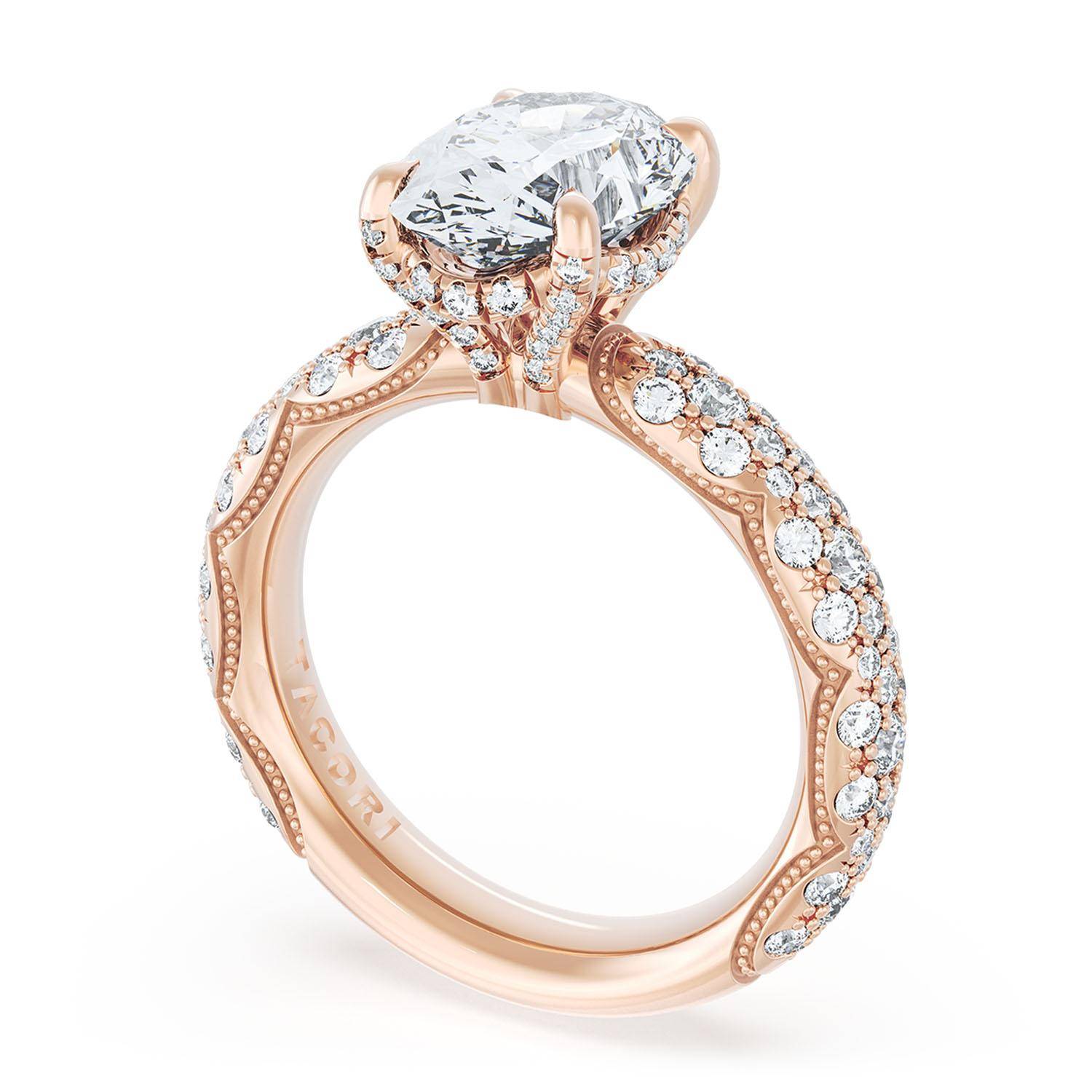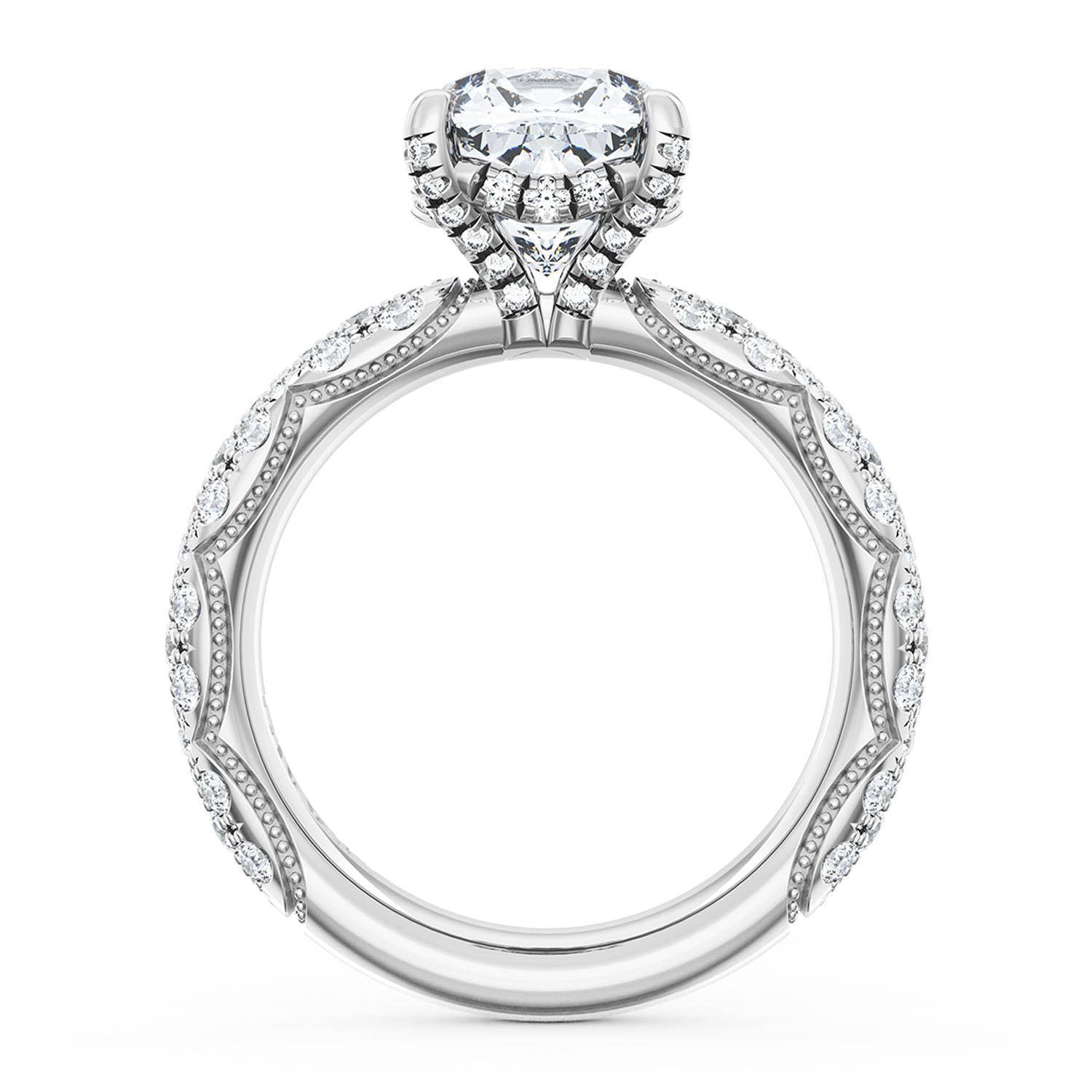 A 360 foundation is accented with a hidden bloom of diamonds, while the Founder's Crescent Fabric wraps around the ceiling of the ring. The ring is finished with a diamond-studded Signature Crescent.