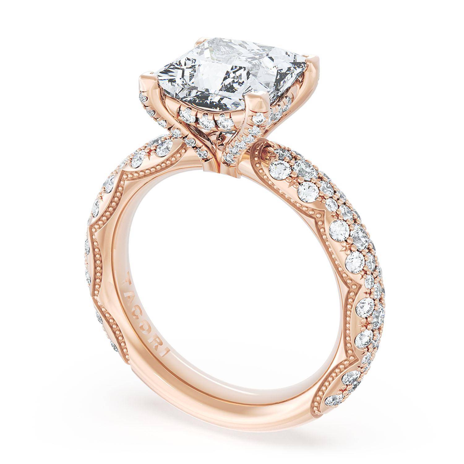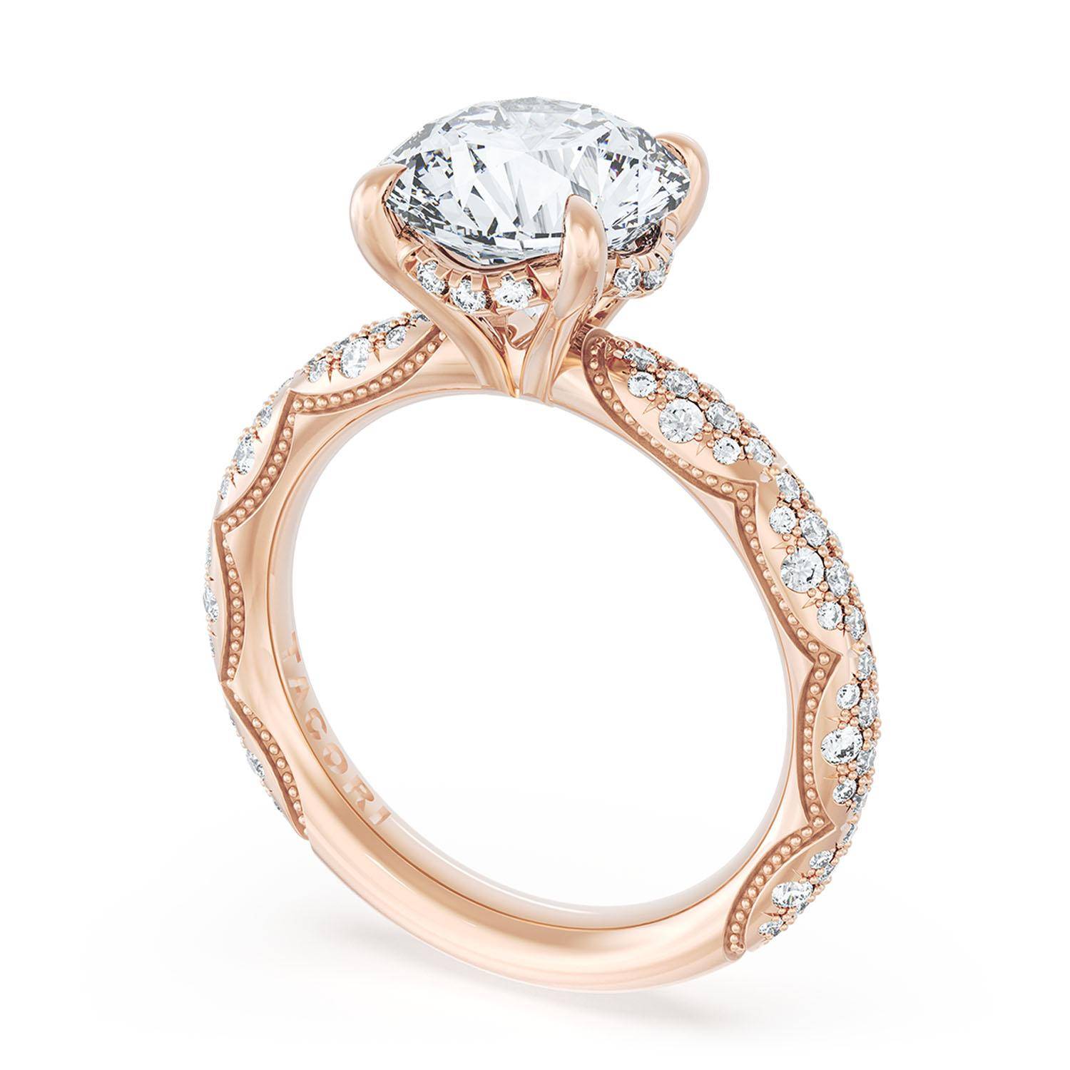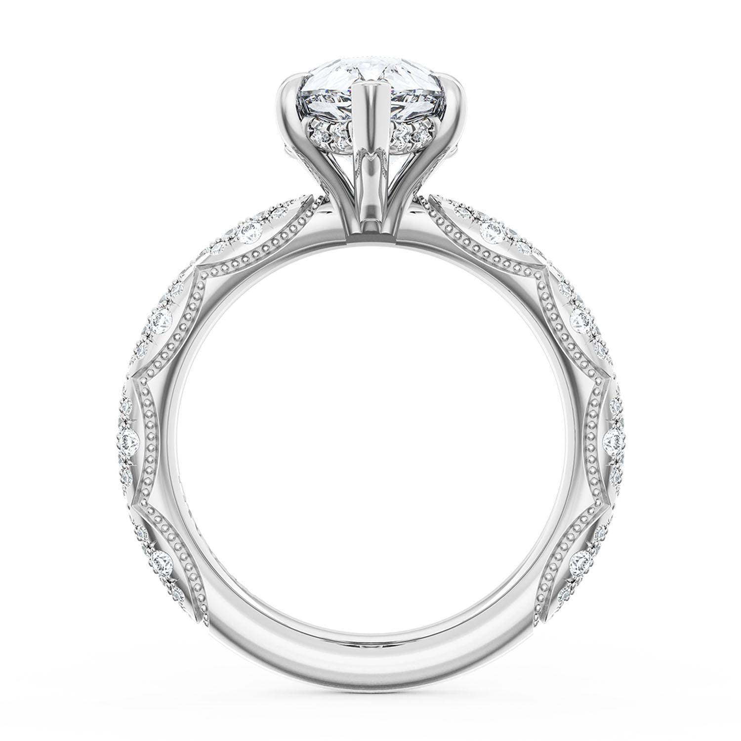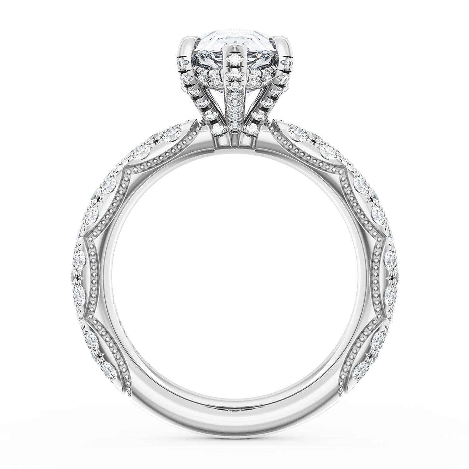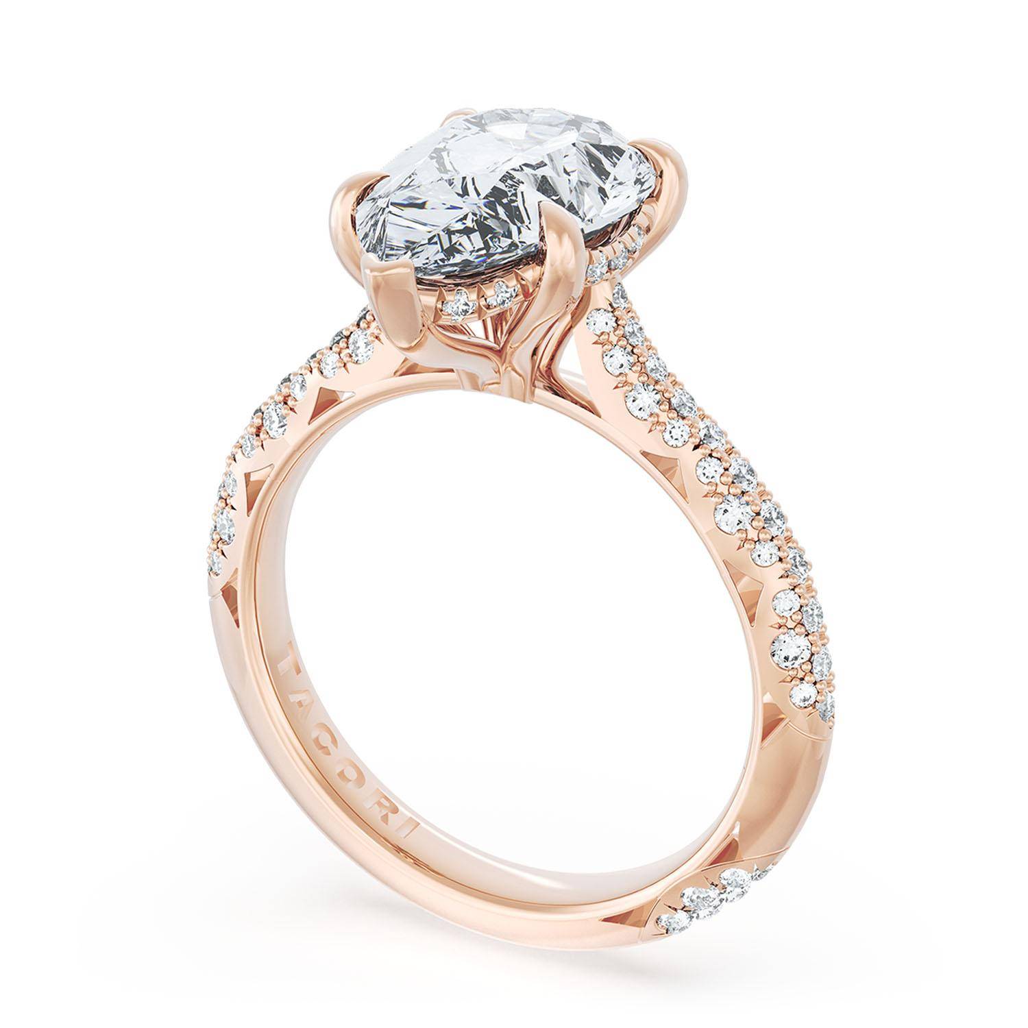A 360 foundation is accented with a hidden bloom of diamonds, while the Founder's Crescent Fabric wraps around the ceiling of the ring. The ring is finished with a diamond-studded Signature Crescent.