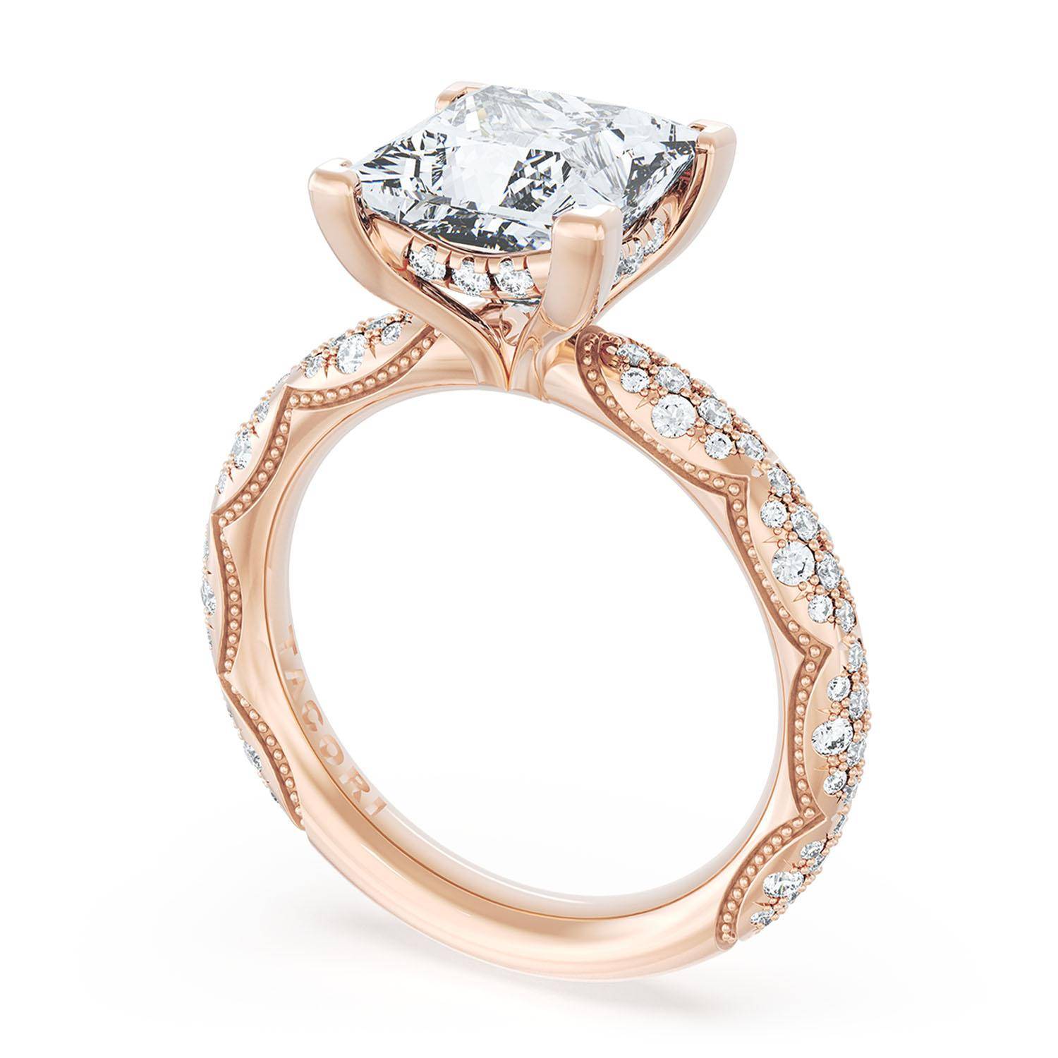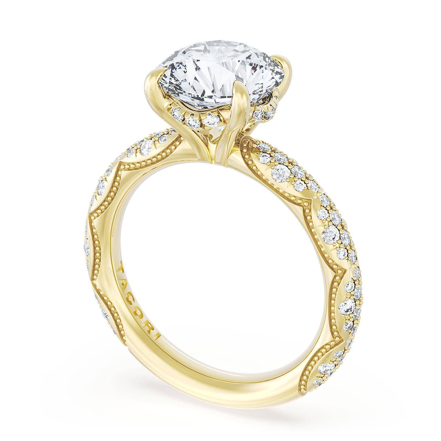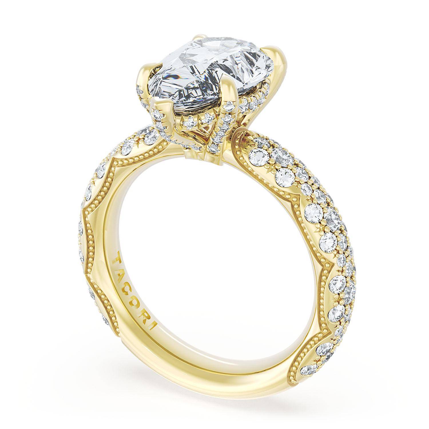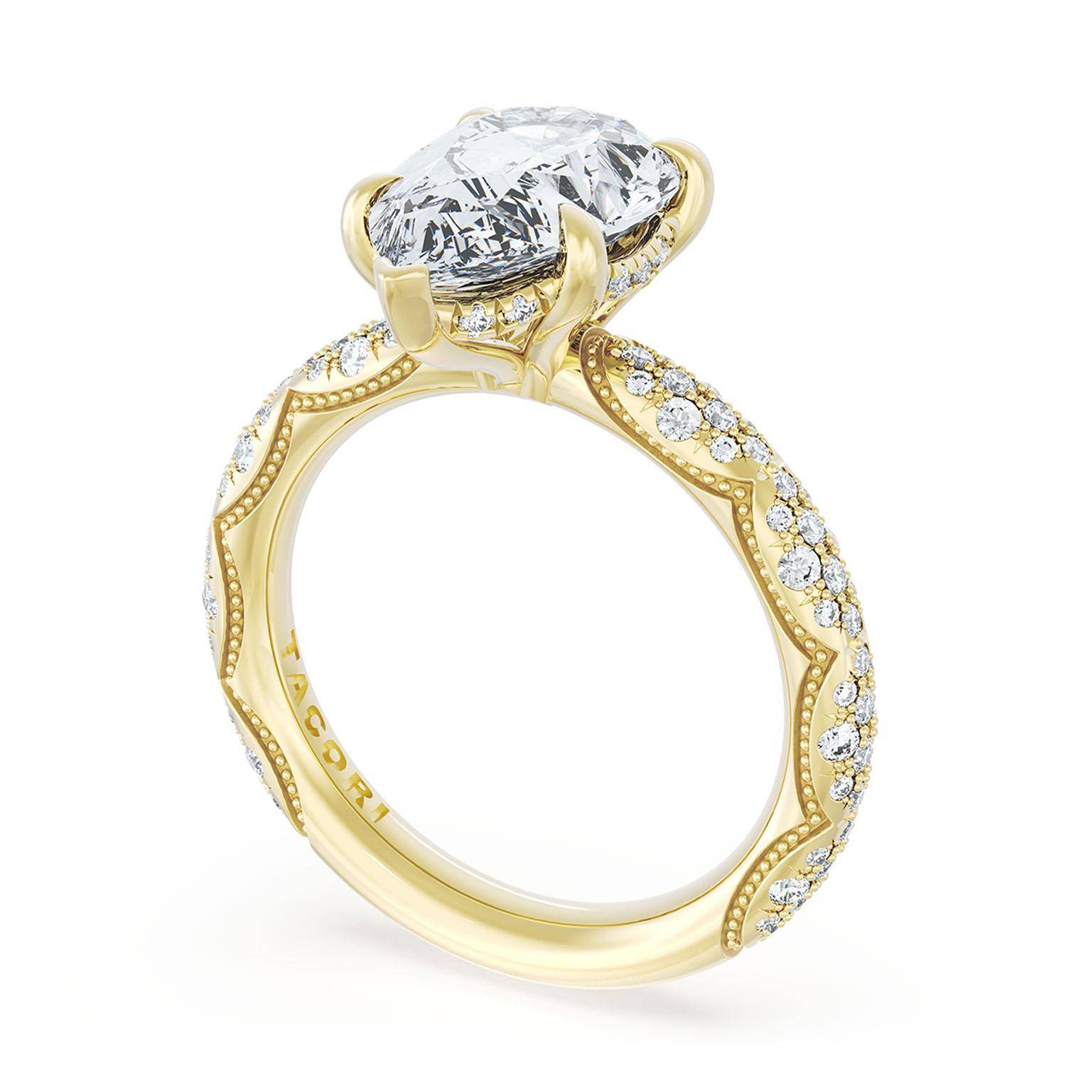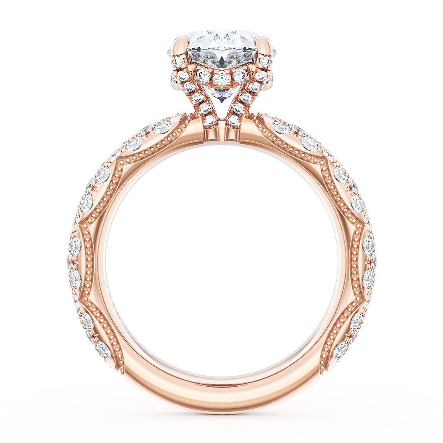A 360 foundation is accented with a hidden bloom of diamonds, while the Founder's Crescent Fabric wraps around the ceiling of the ring. The ring is finished with a diamond-studded Signature Crescent.