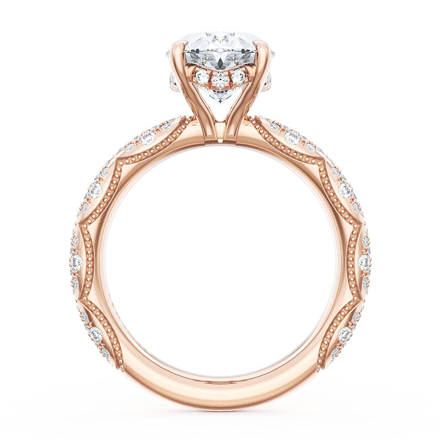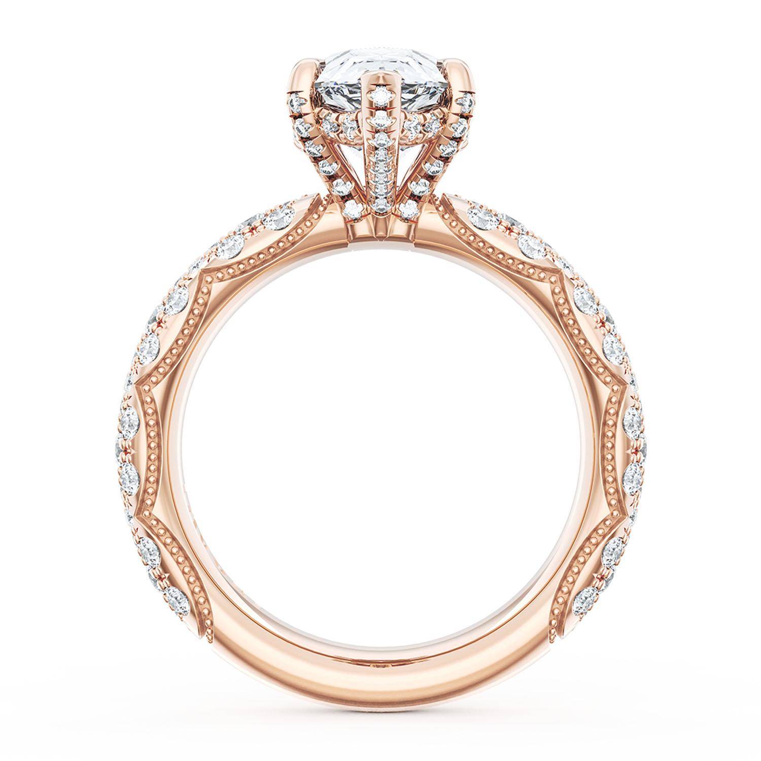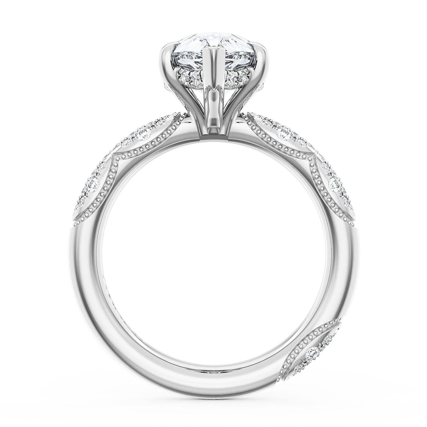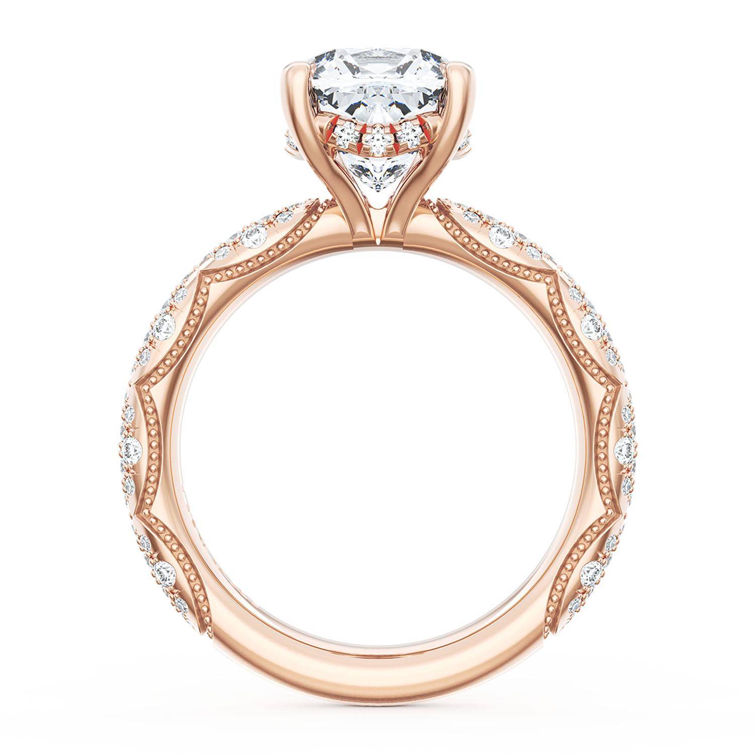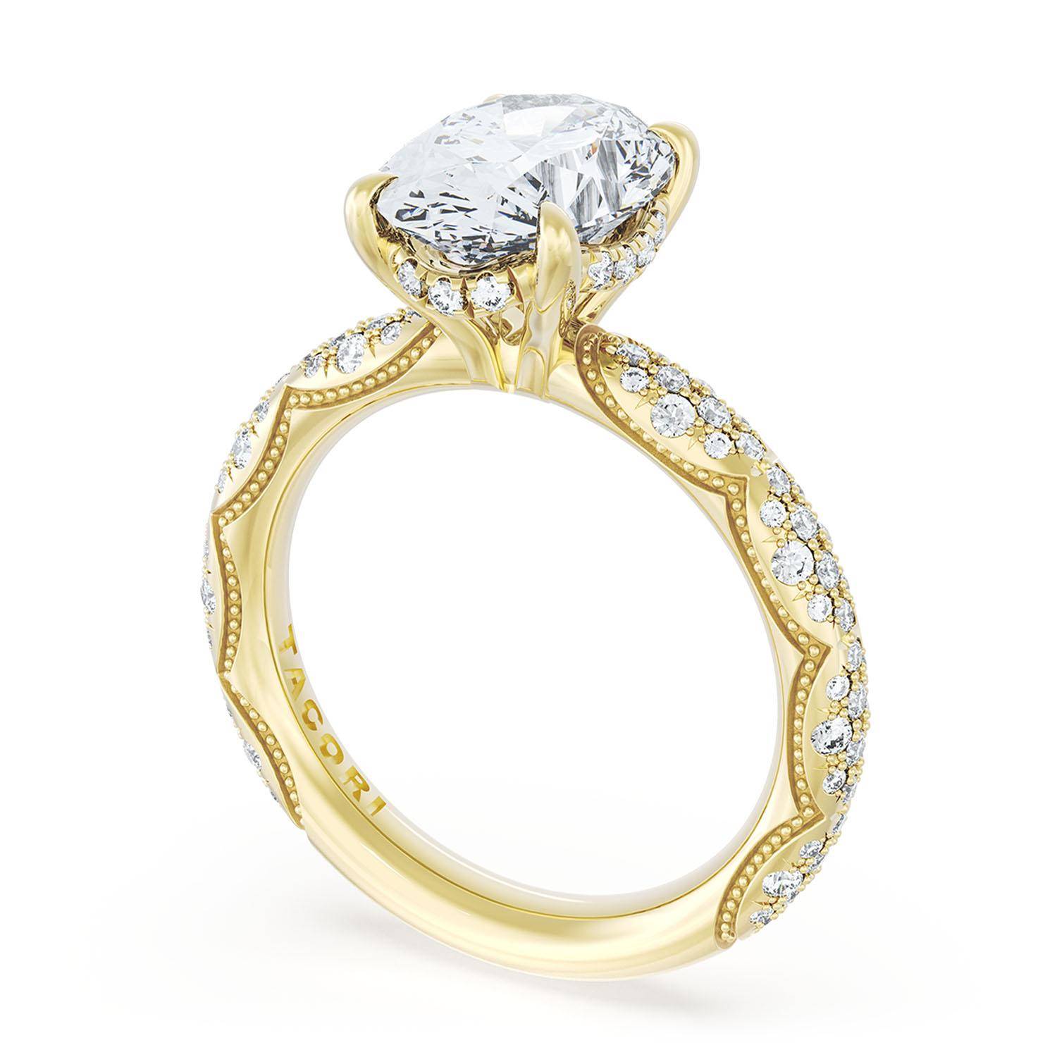 A 360 foundation is accented with a hidden bloom of diamonds, while the Founder's Crescent Fabric wraps around the ceiling of the ring. The ring is finished with a diamond-studded Signature Crescent.