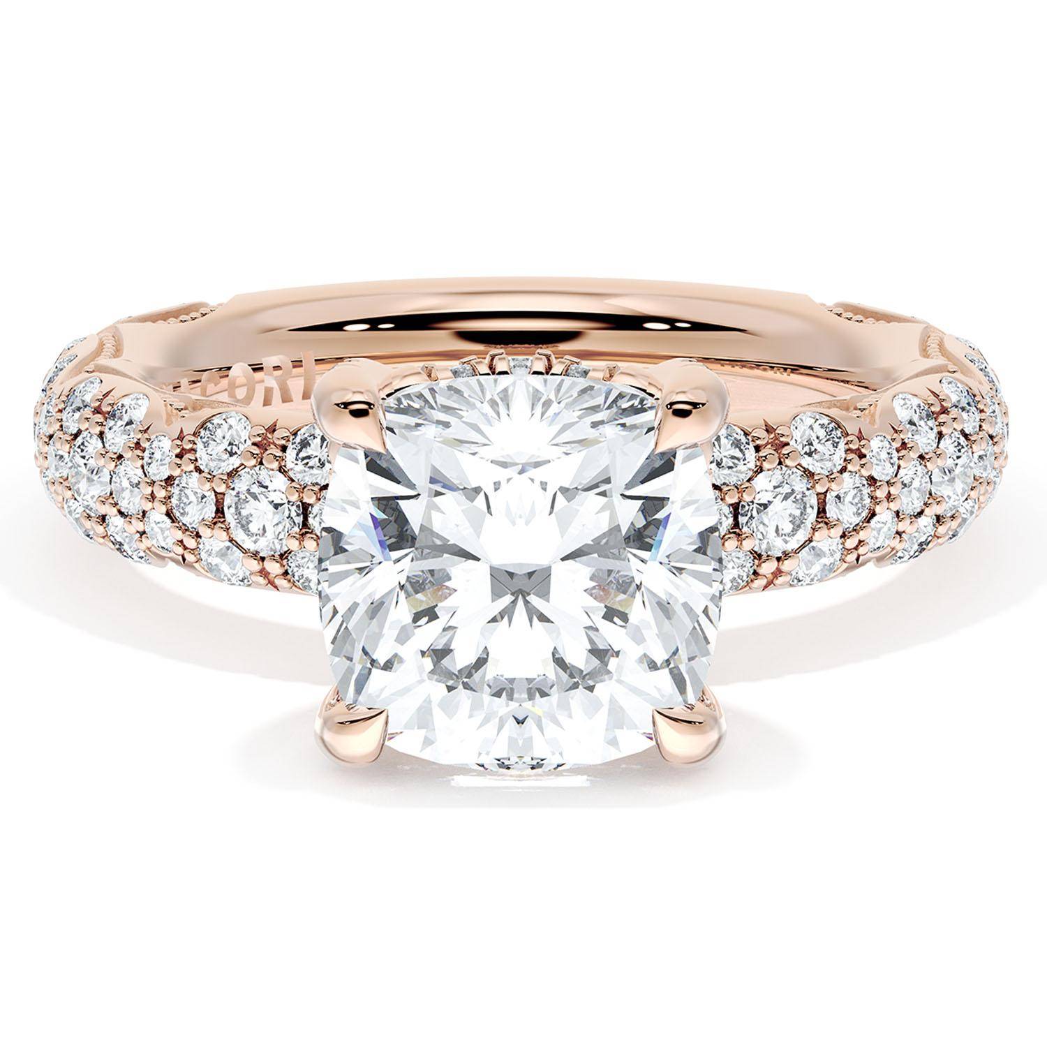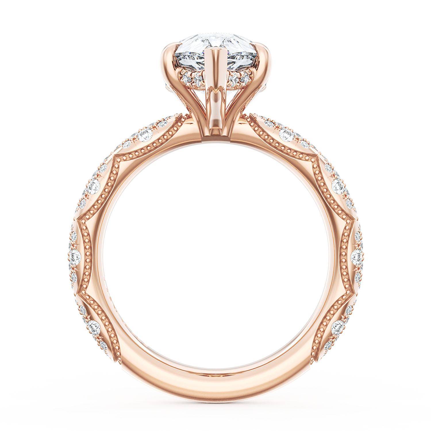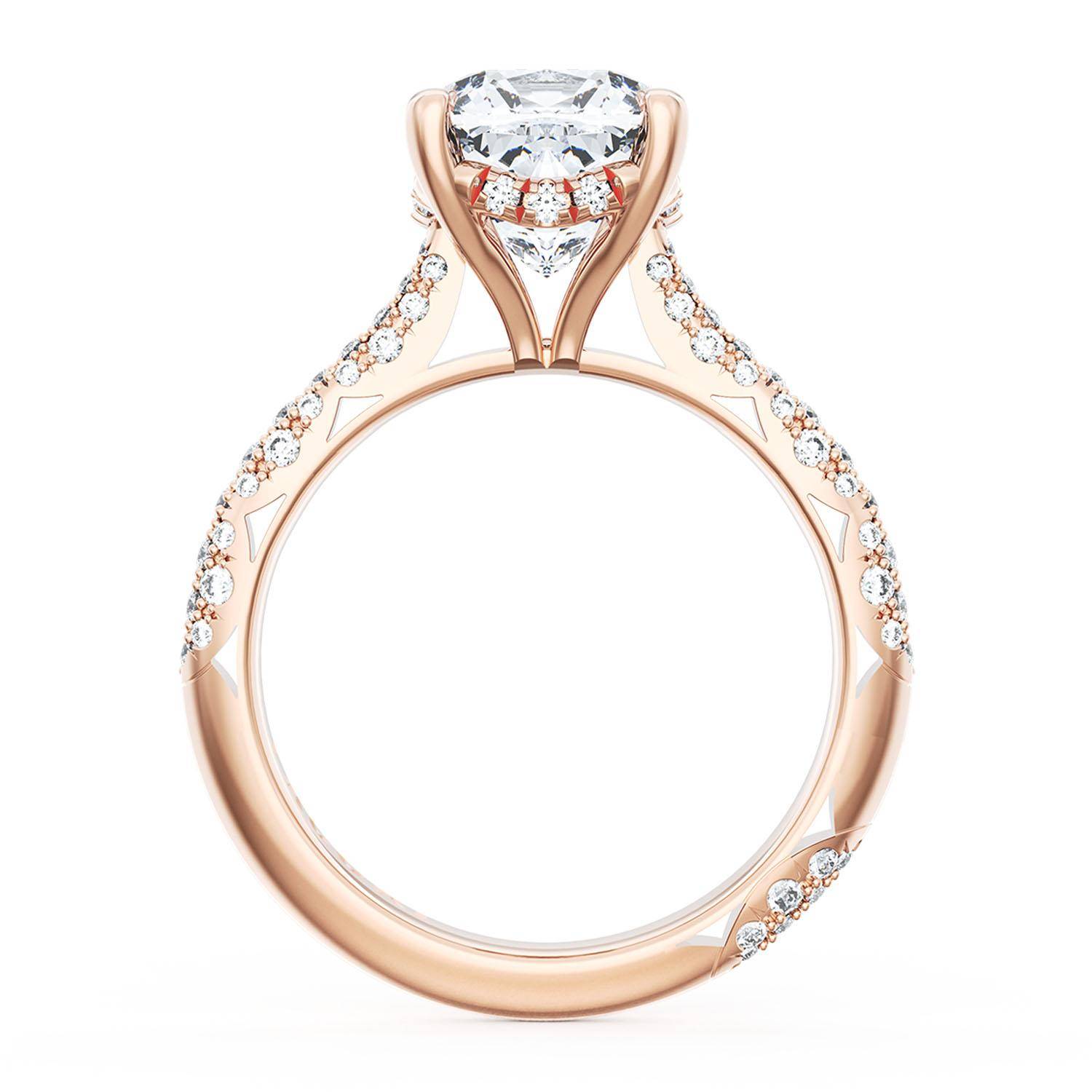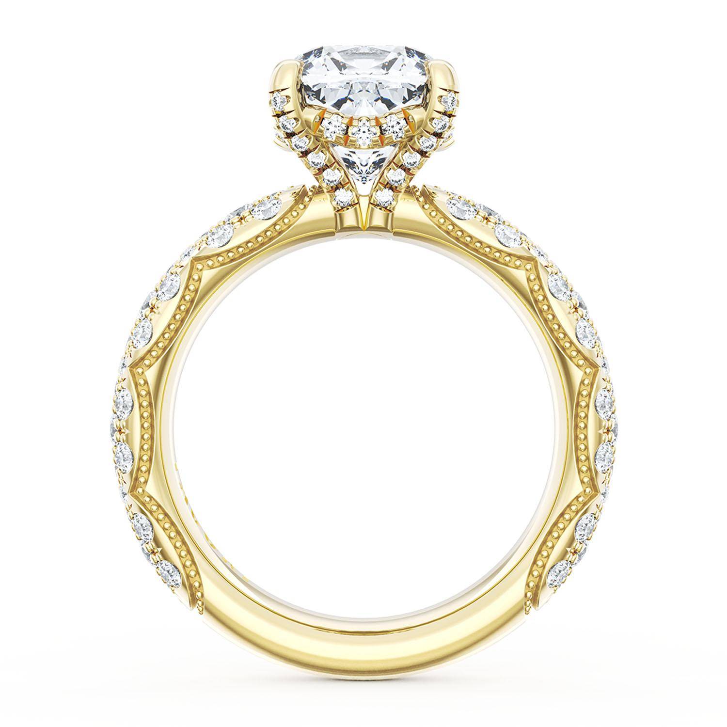 A 360 foundation is accented with a hidden bloom of diamonds, while the Founder's Crescent Fabric wraps around the ceiling of the ring. The ring is finished with a diamond-studded Signature Crescent.