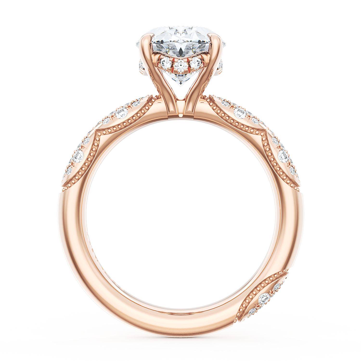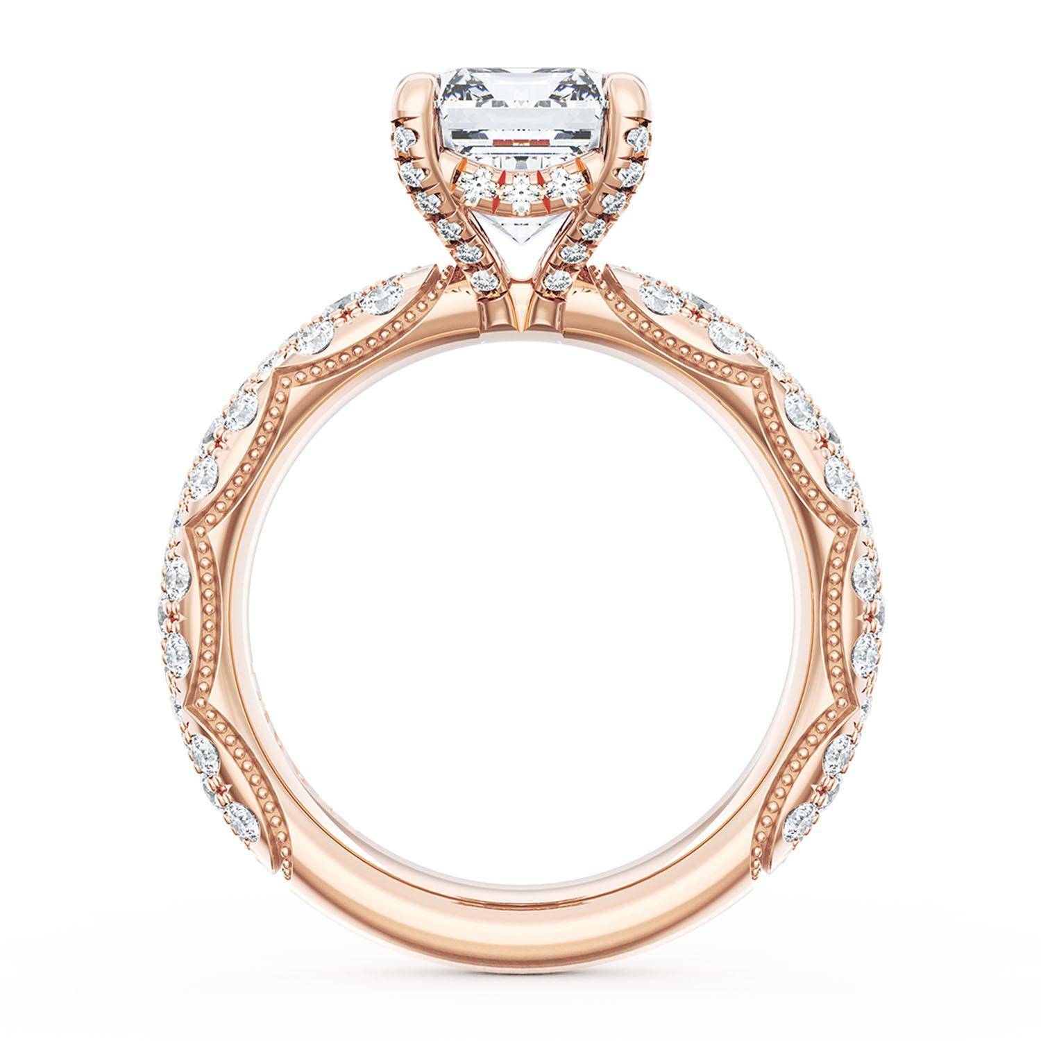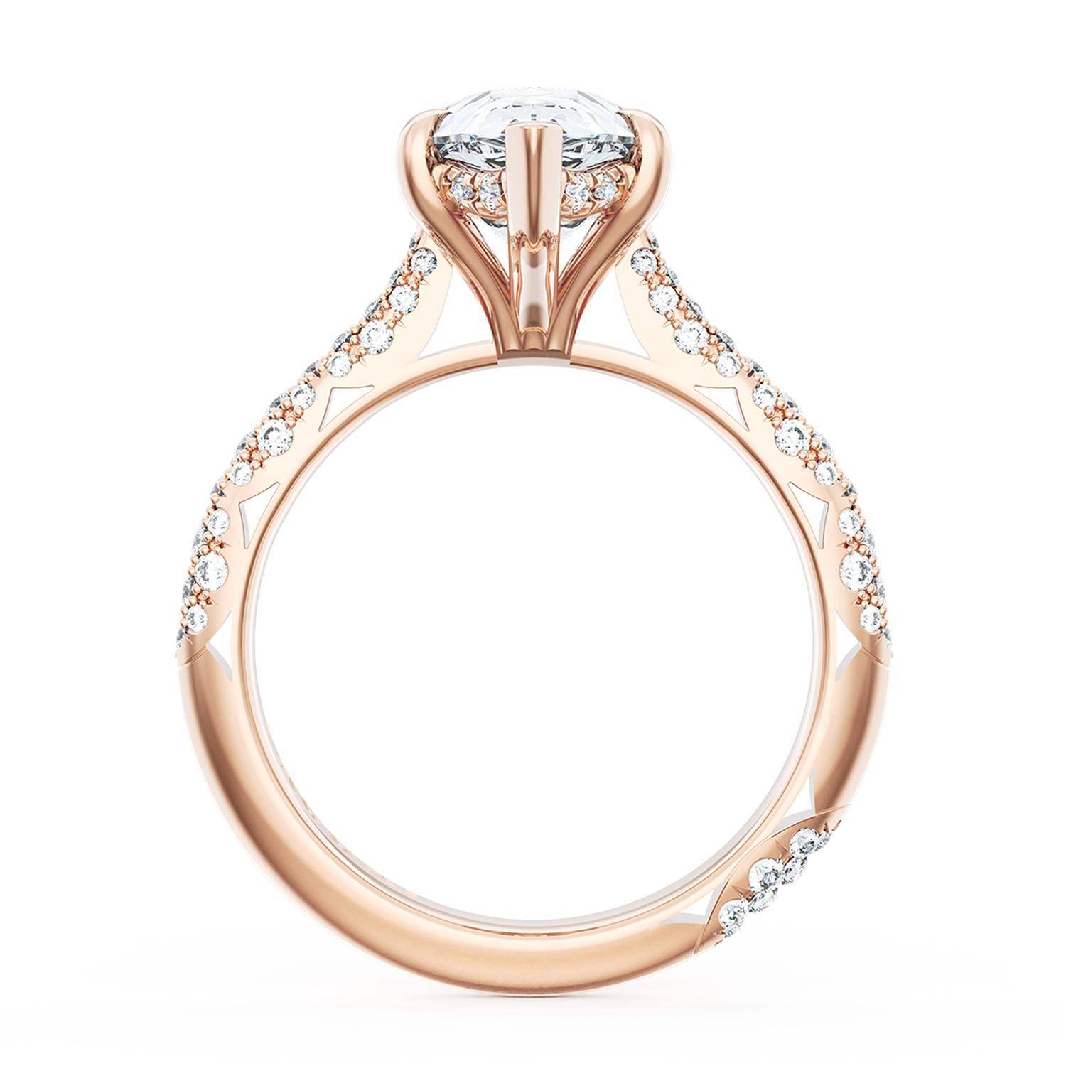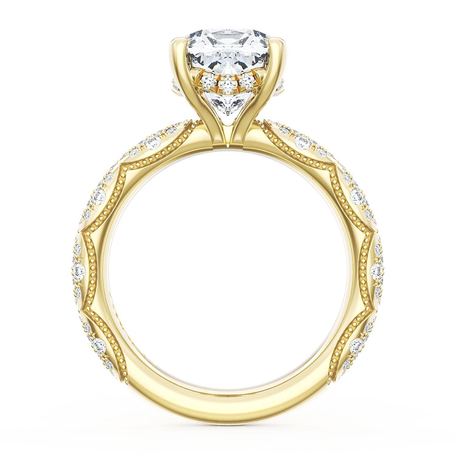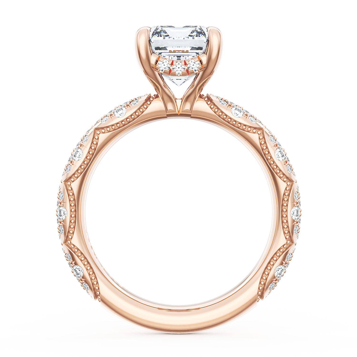 A 360 foundation is accented with a hidden bloom of diamonds, while the Founder's Crescent Fabric wraps around the ceiling of the ring. The ring is finished with a diamond-studded Signature Crescent.