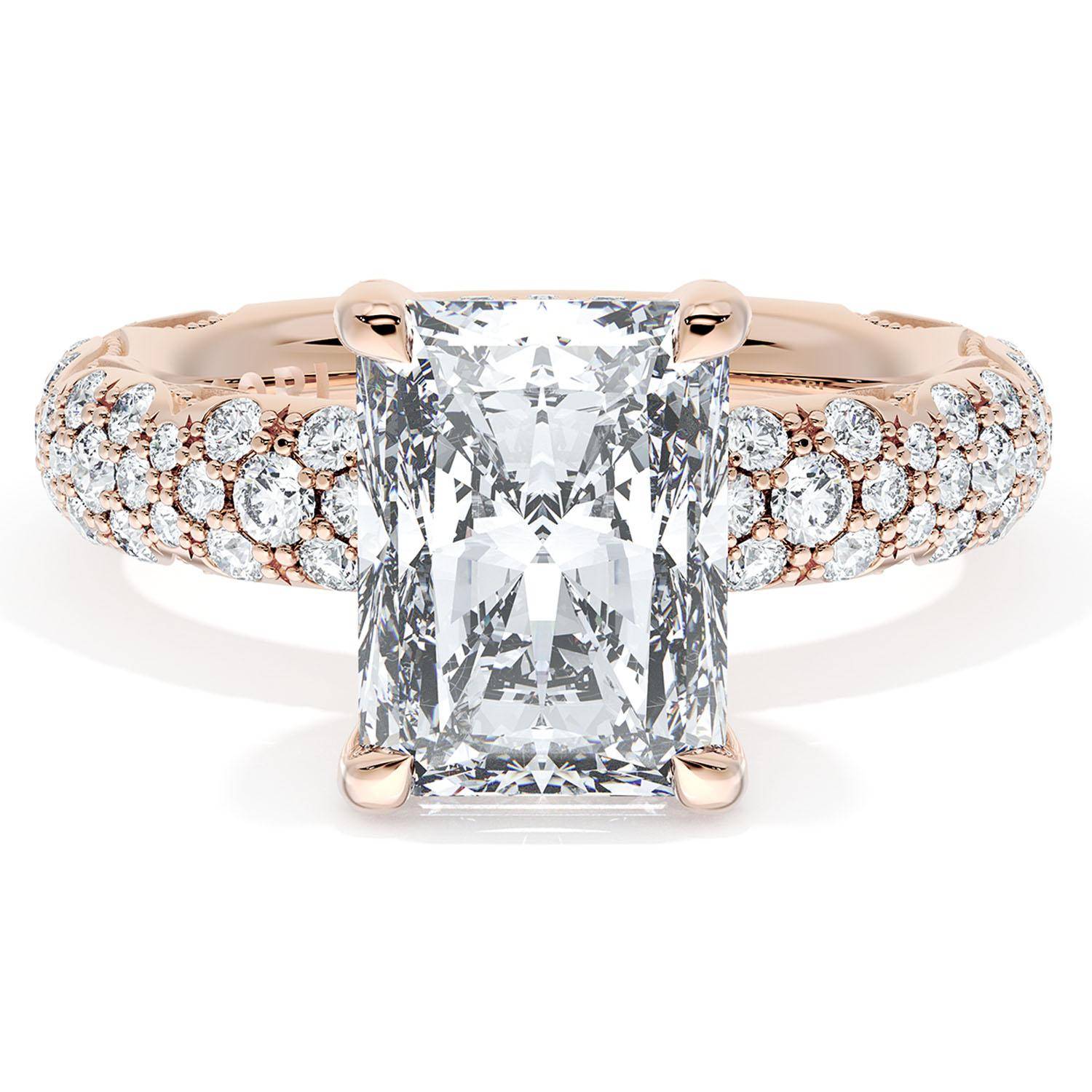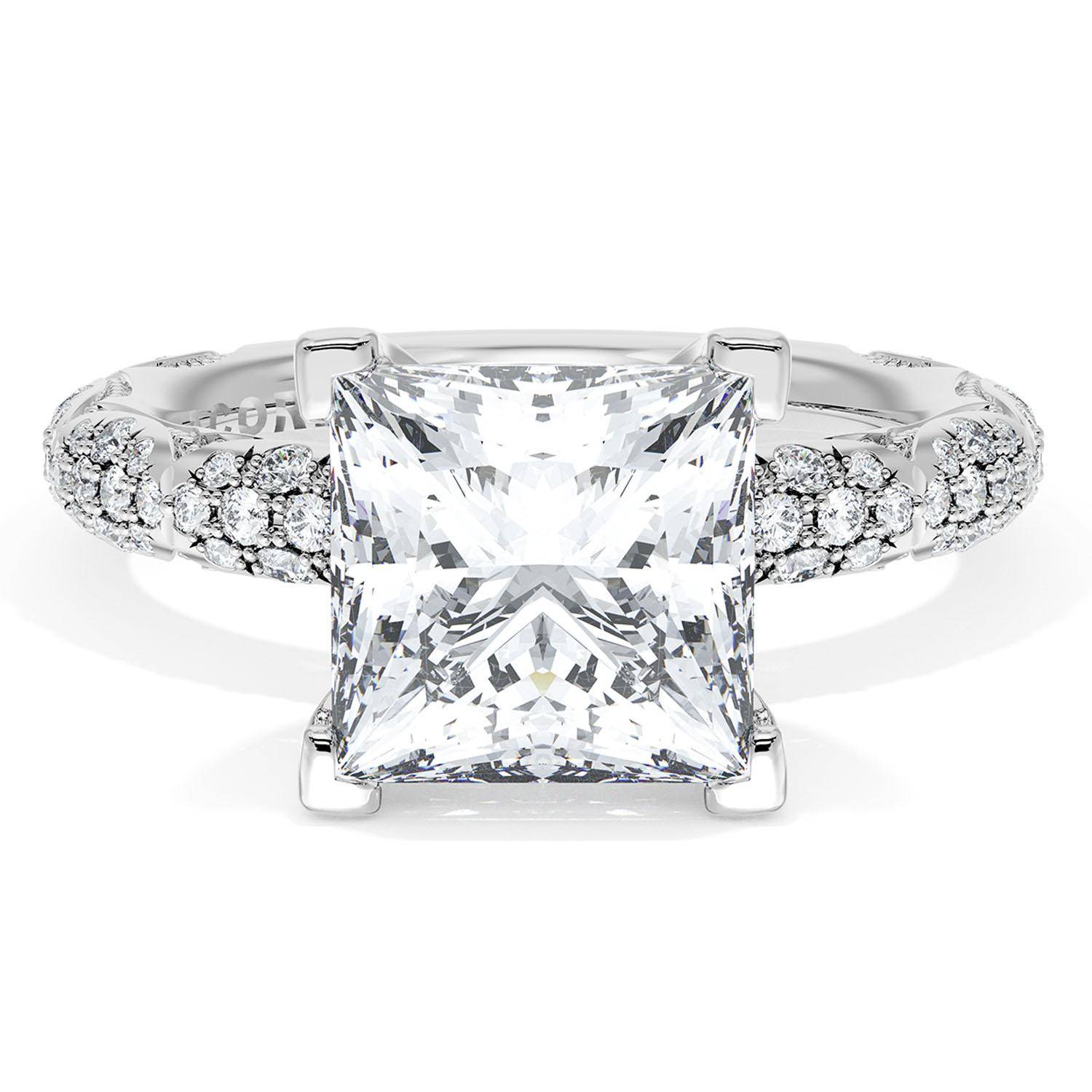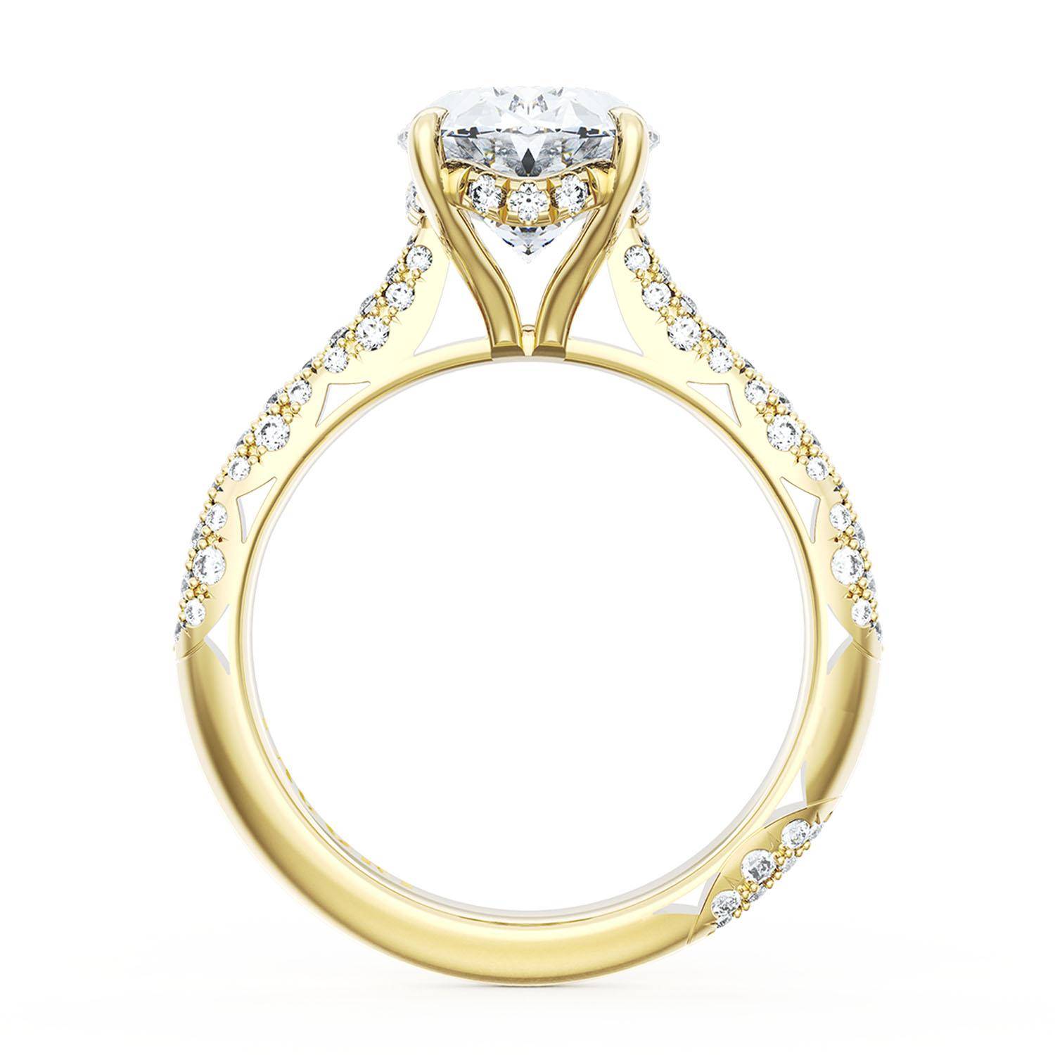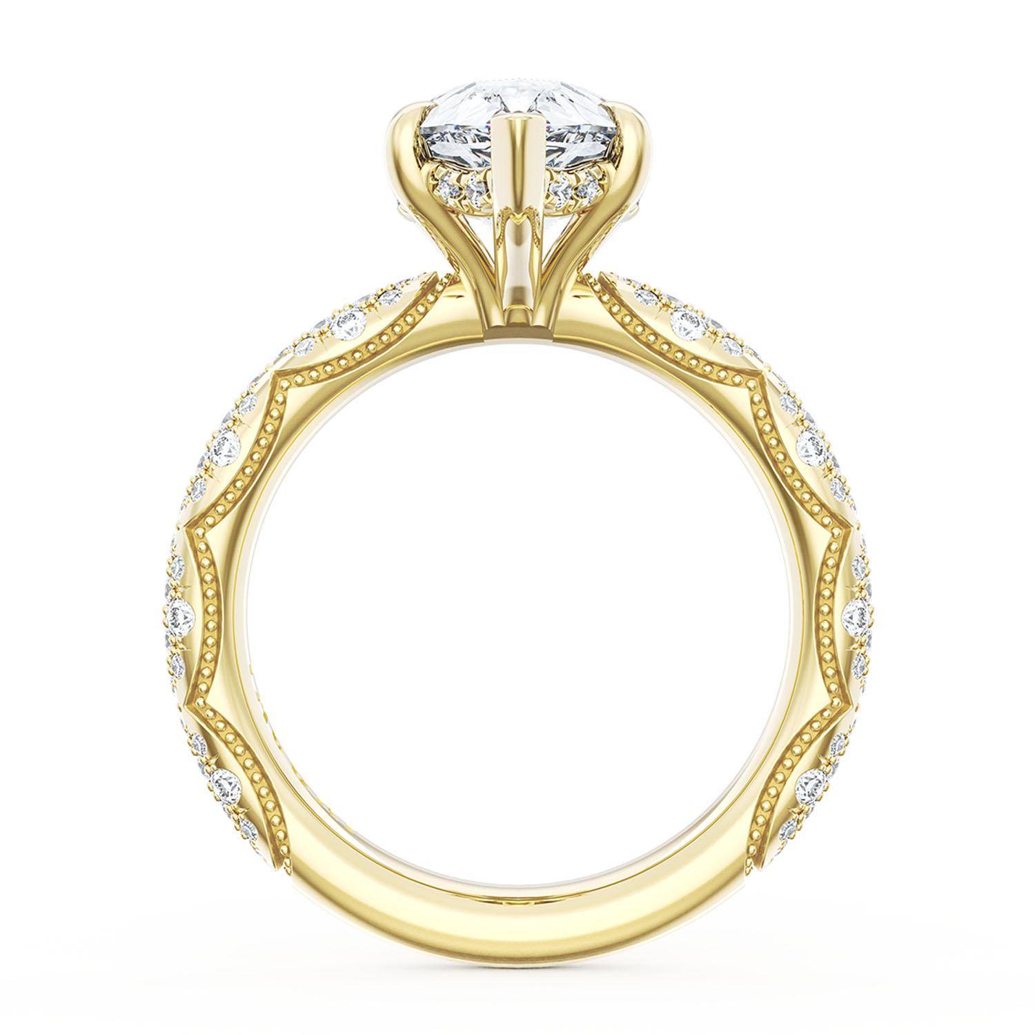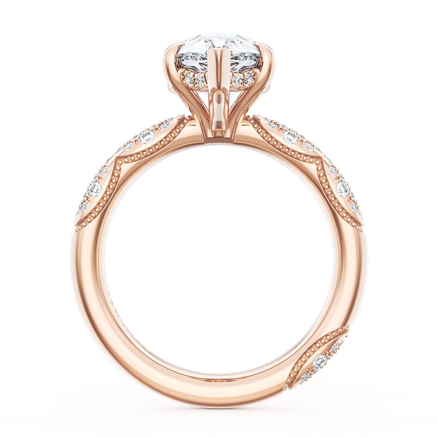 A 360 foundation is accented with a hidden bloom of diamonds, while the Founder's Crescent Fabric wraps around the ceiling of the ring. The ring is finished with a diamond-studded Signature Crescent.