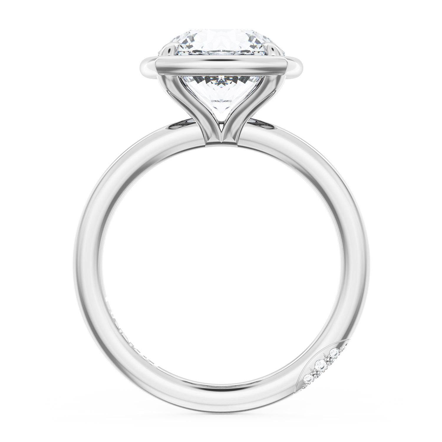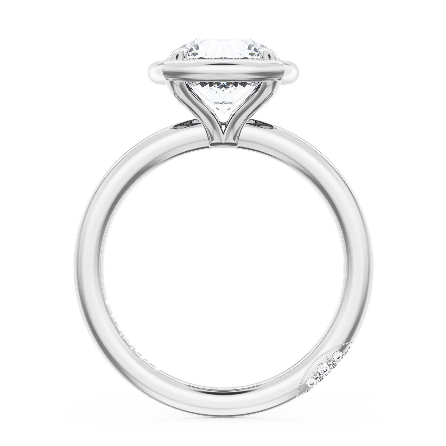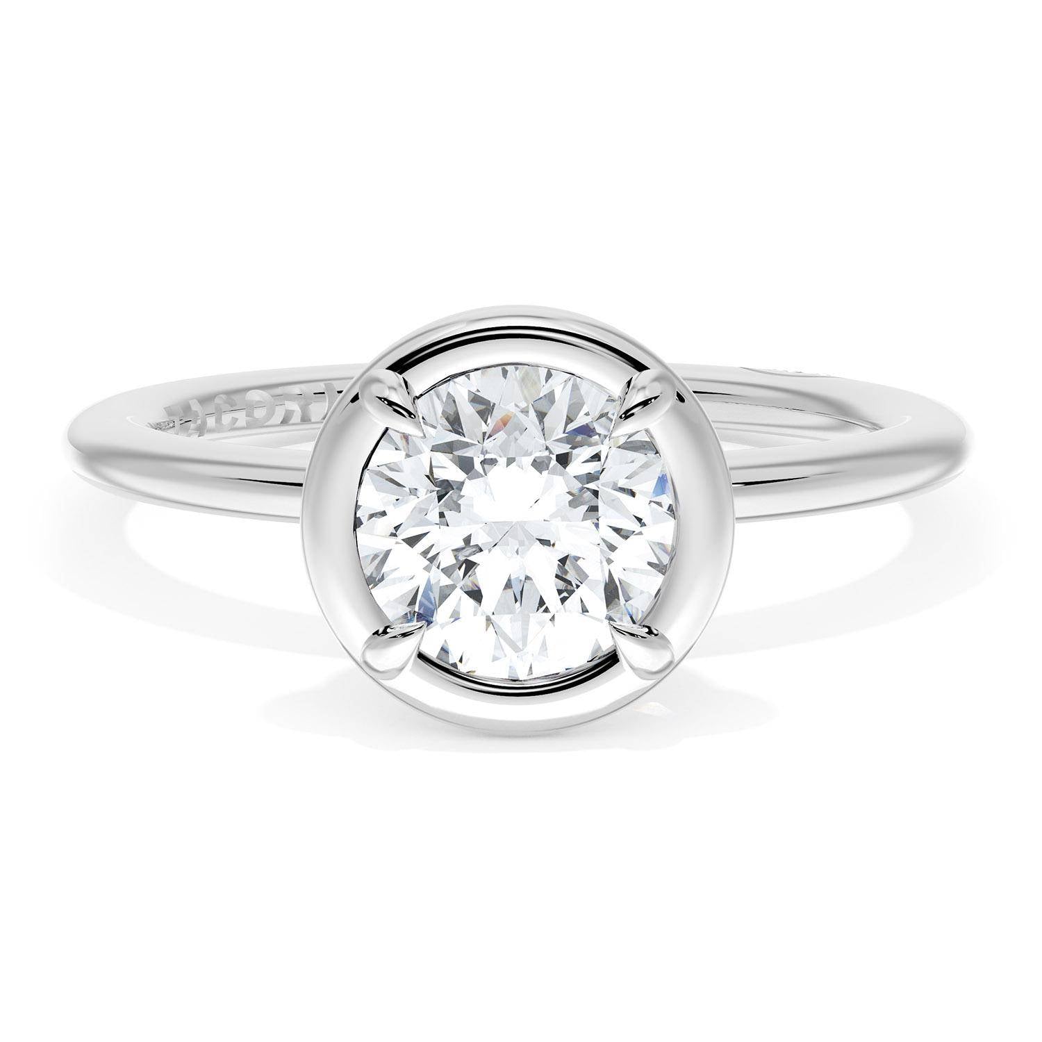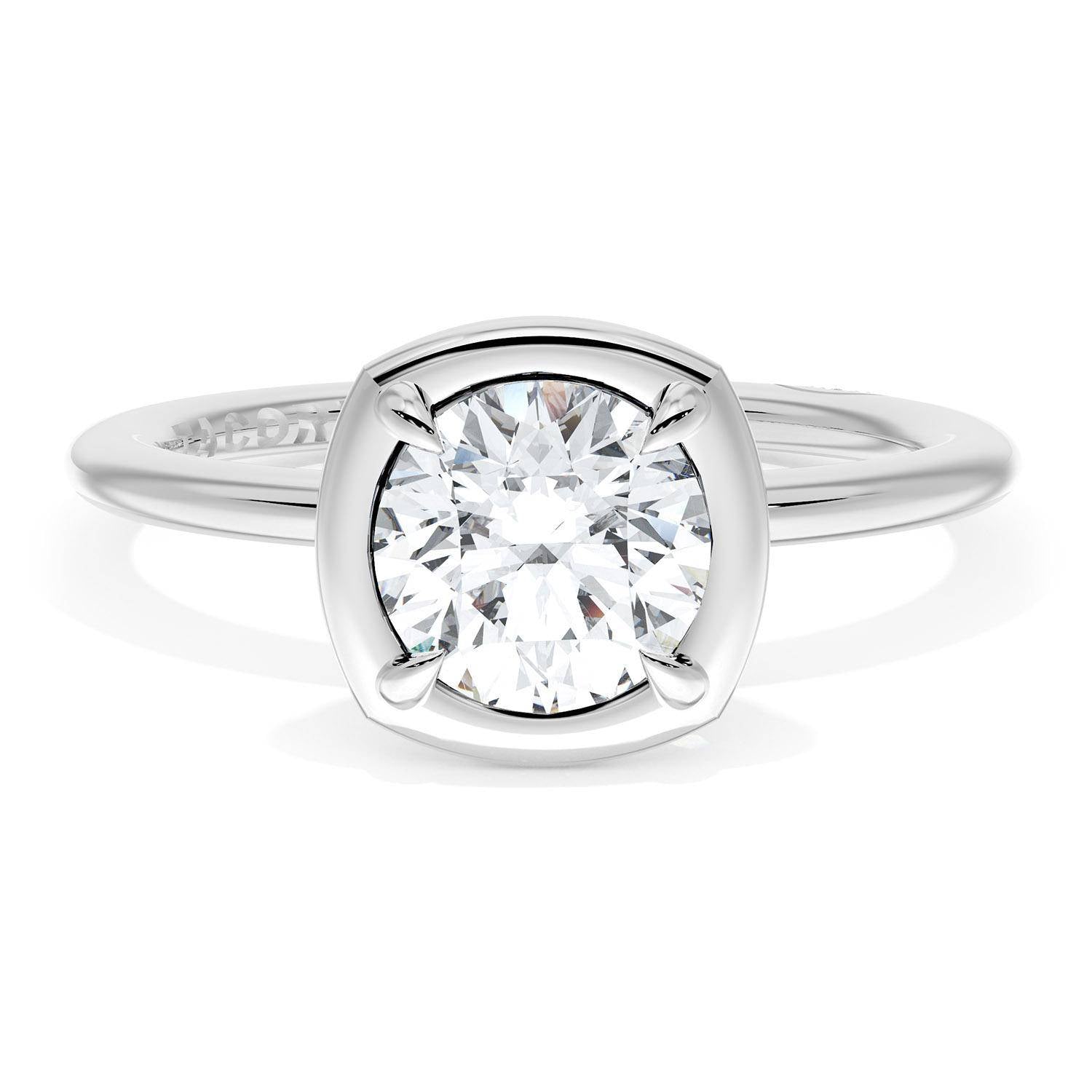 A Round Solitaire is set into a unique corset-inspired crown on a high-polish 18kt White Gold foundation. A diamond-studded Founder's Crescent marks the resting point.