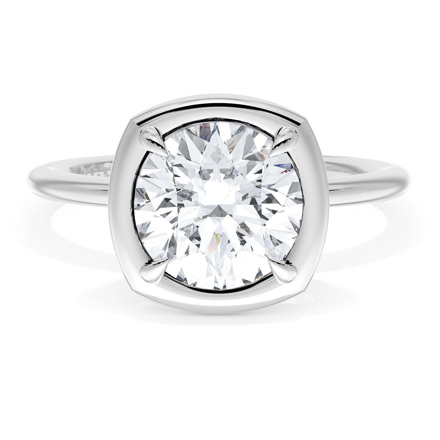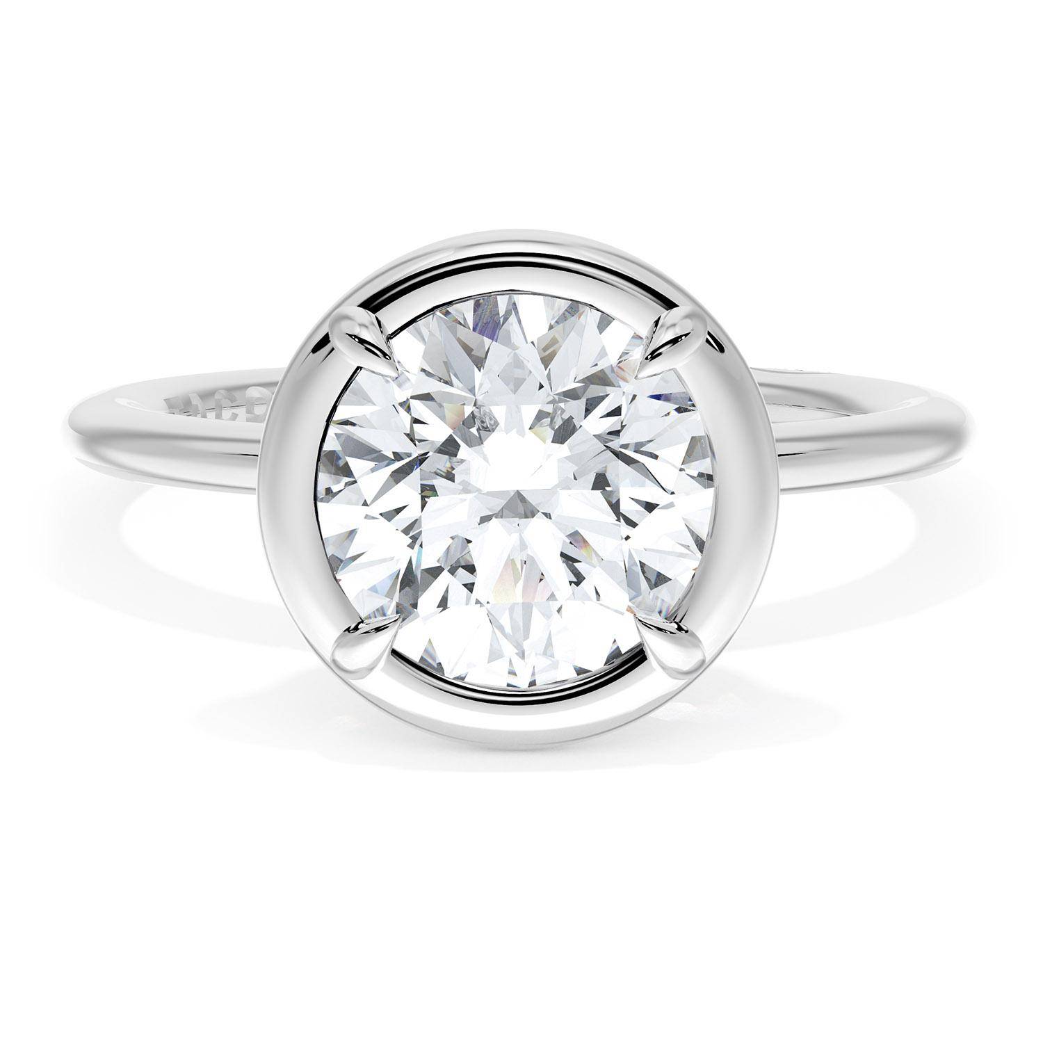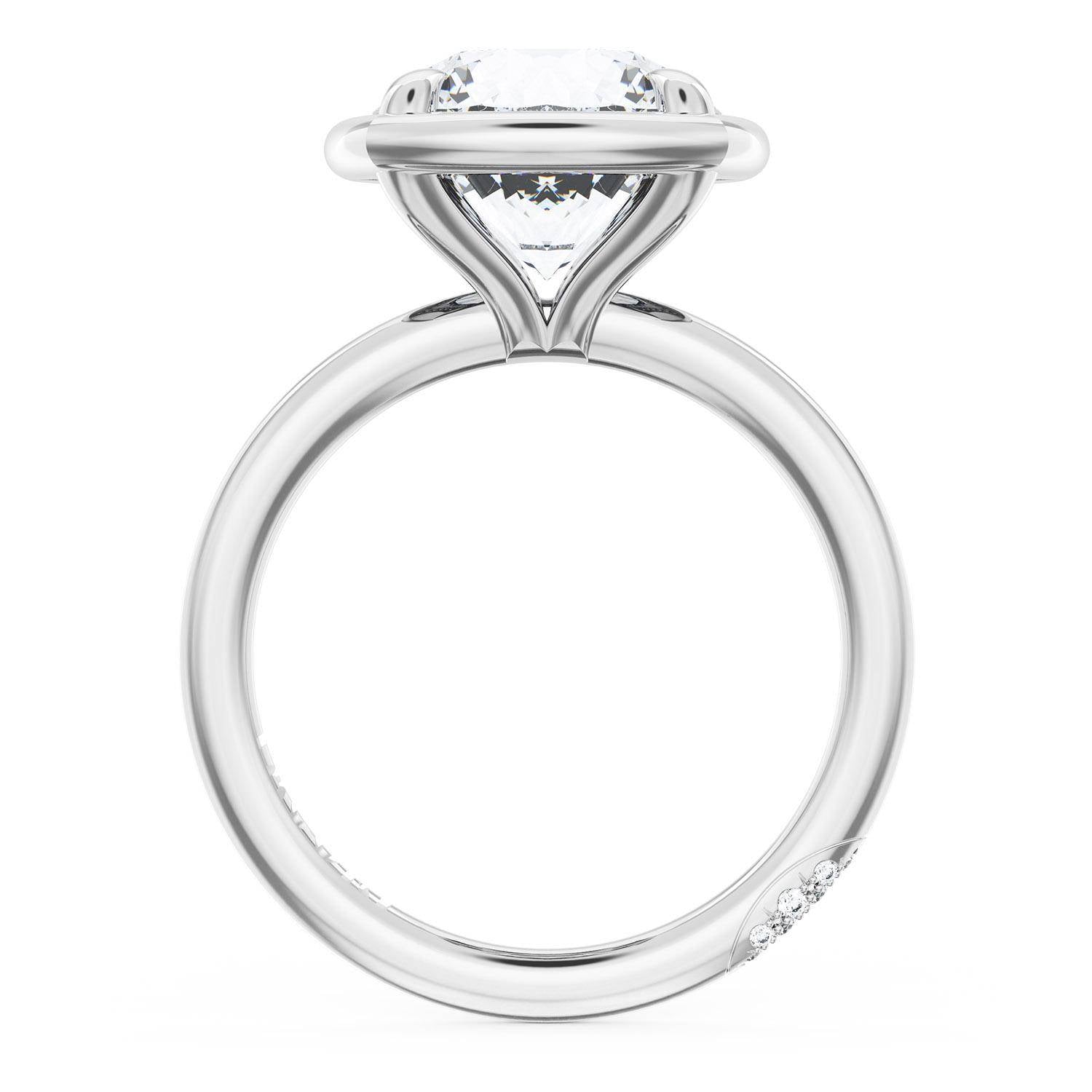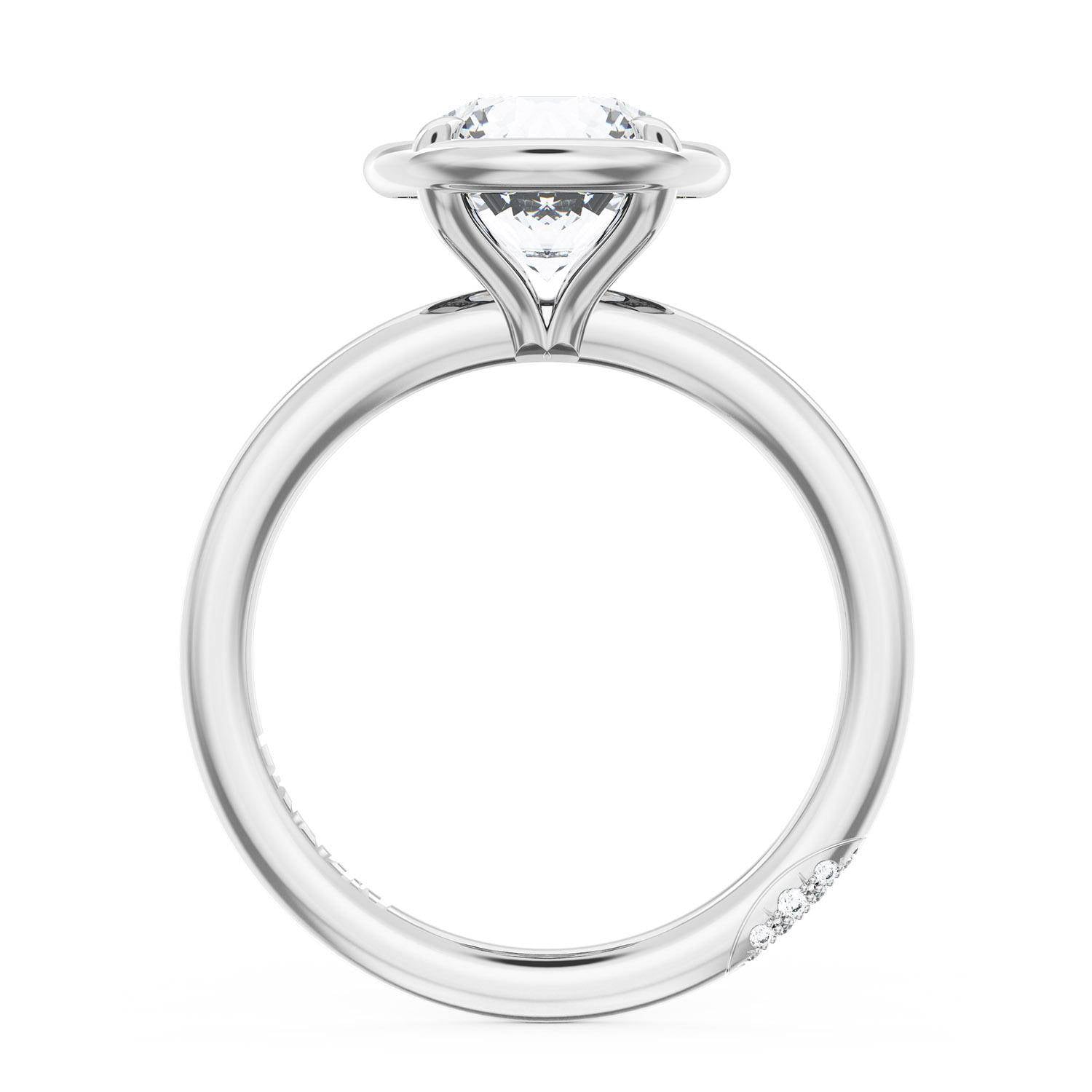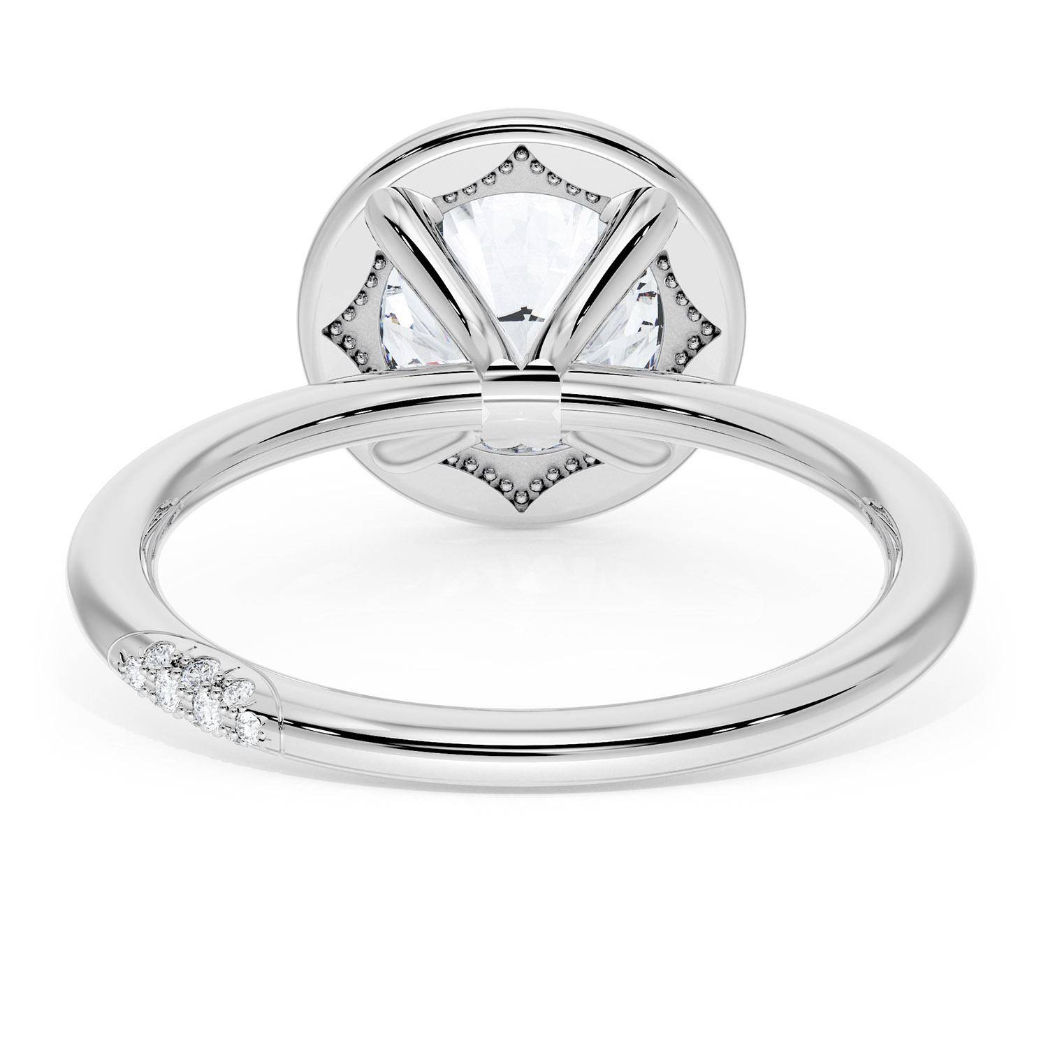 A Round Solitaire is set into a unique corset-inspired crown on a high-polish 18kt White Gold foundation. A diamond-studded Founder's Crescent marks the resting point.