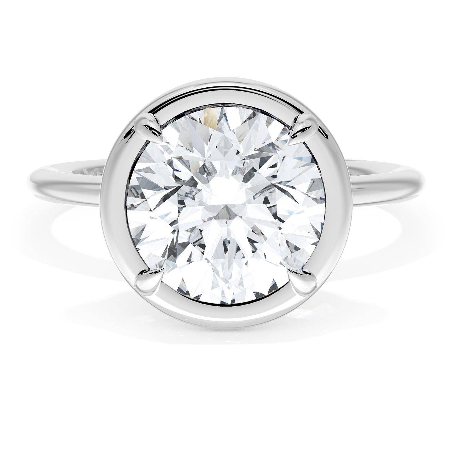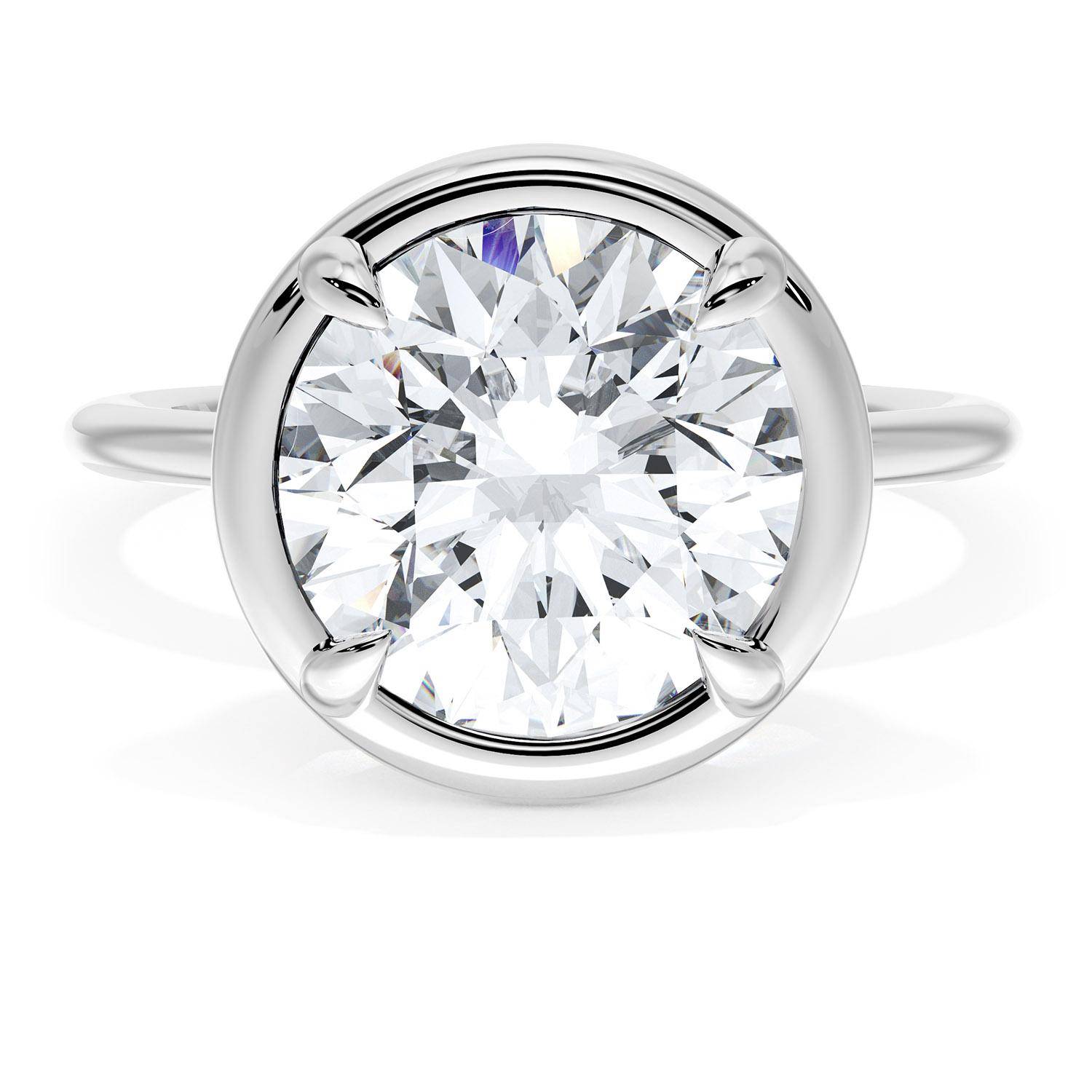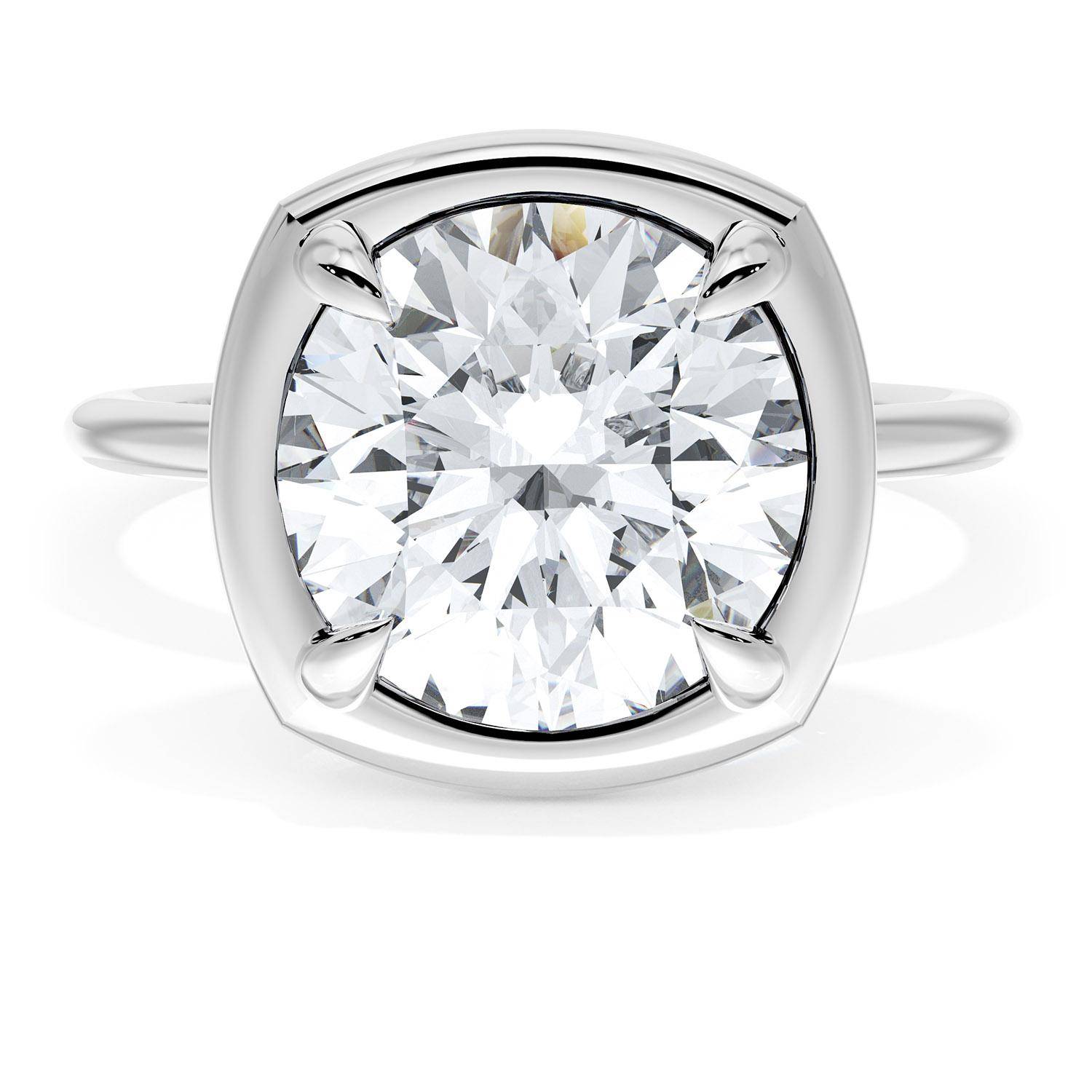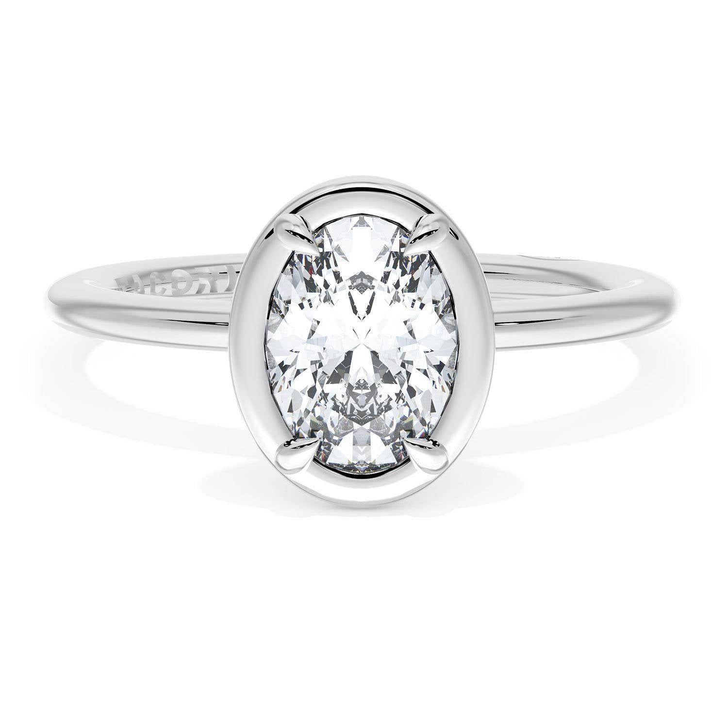 A Round Solitaire is set into a unique corset-inspired crown on a high-polish 18kt White Gold foundation. A diamond-studded Founder's Crescent marks the resting point.
