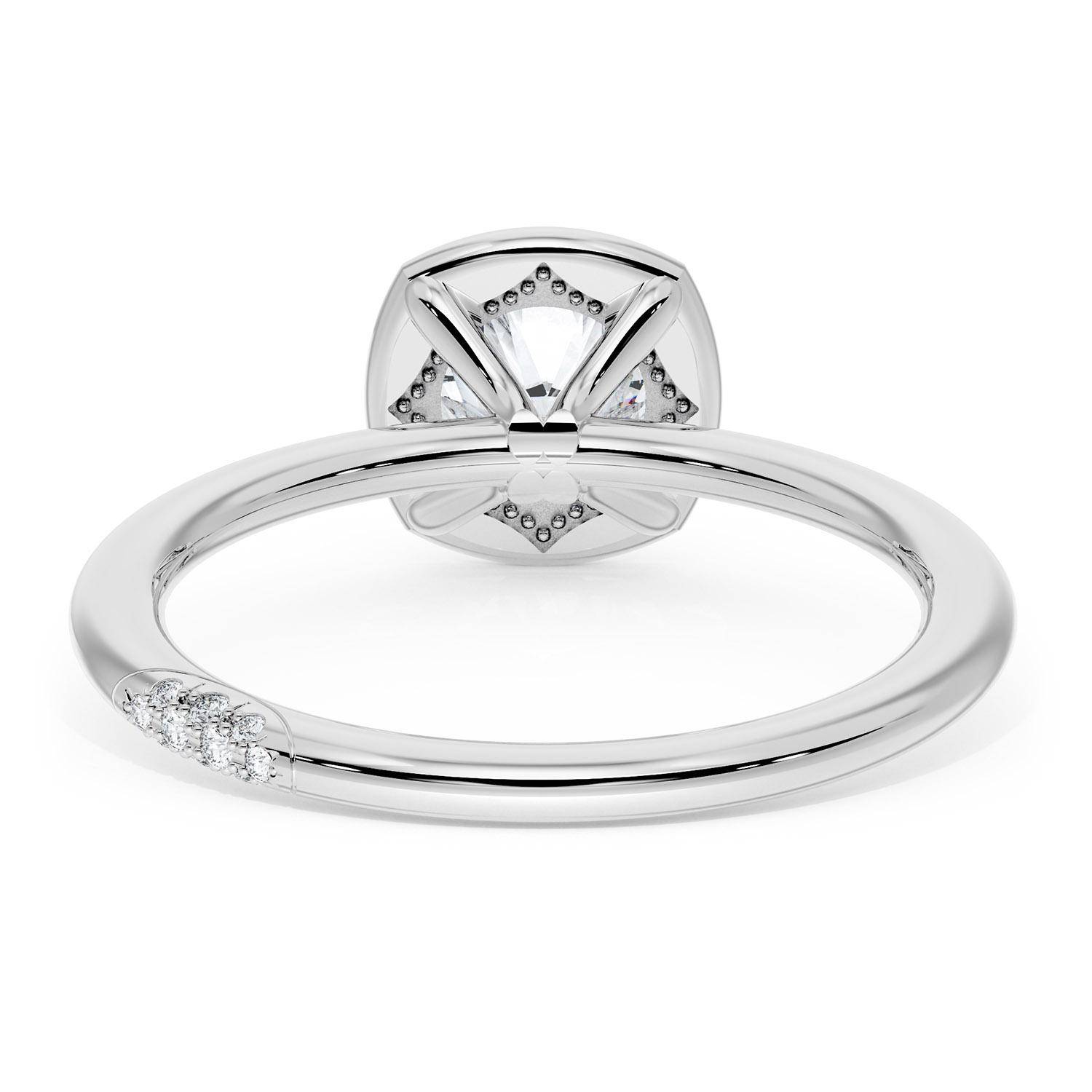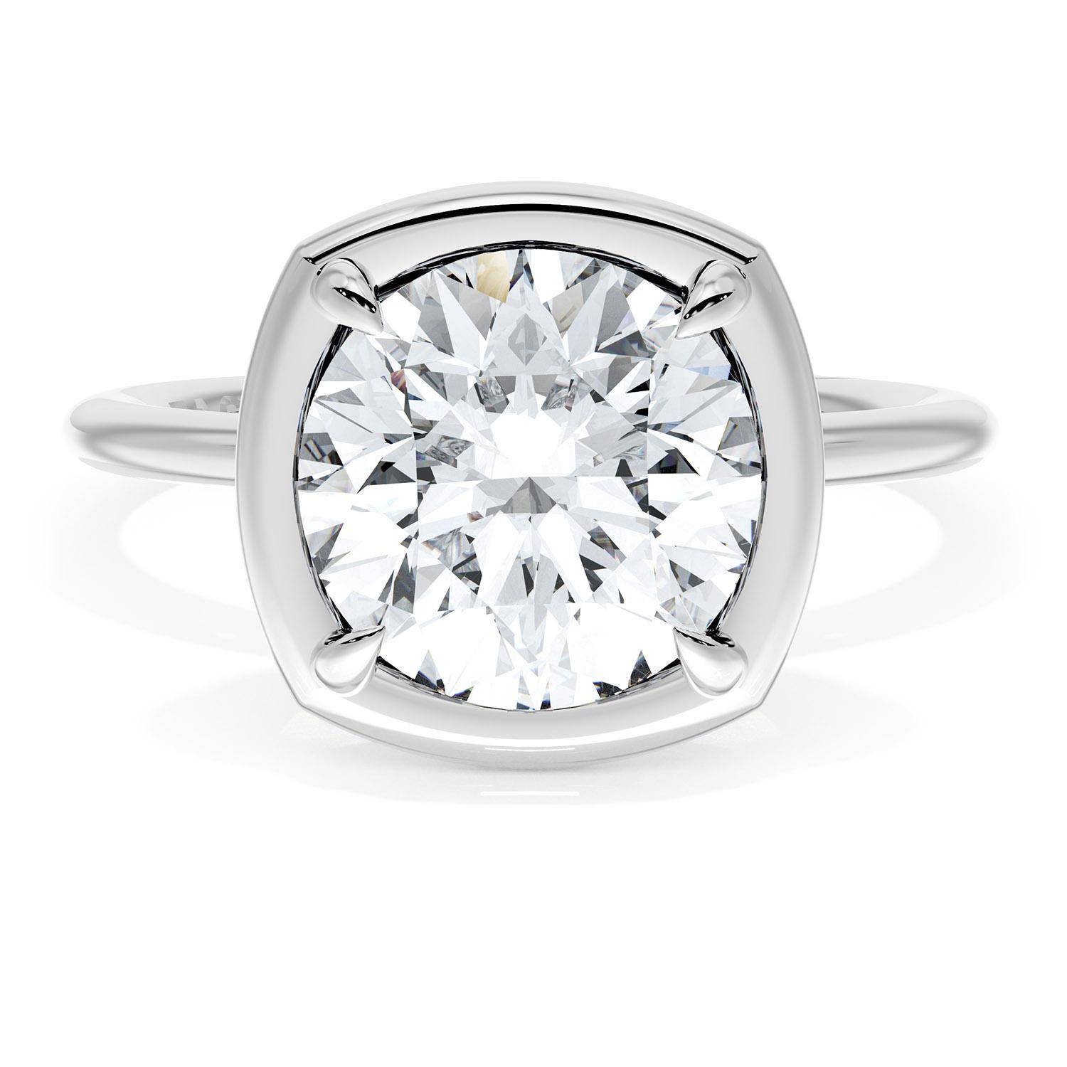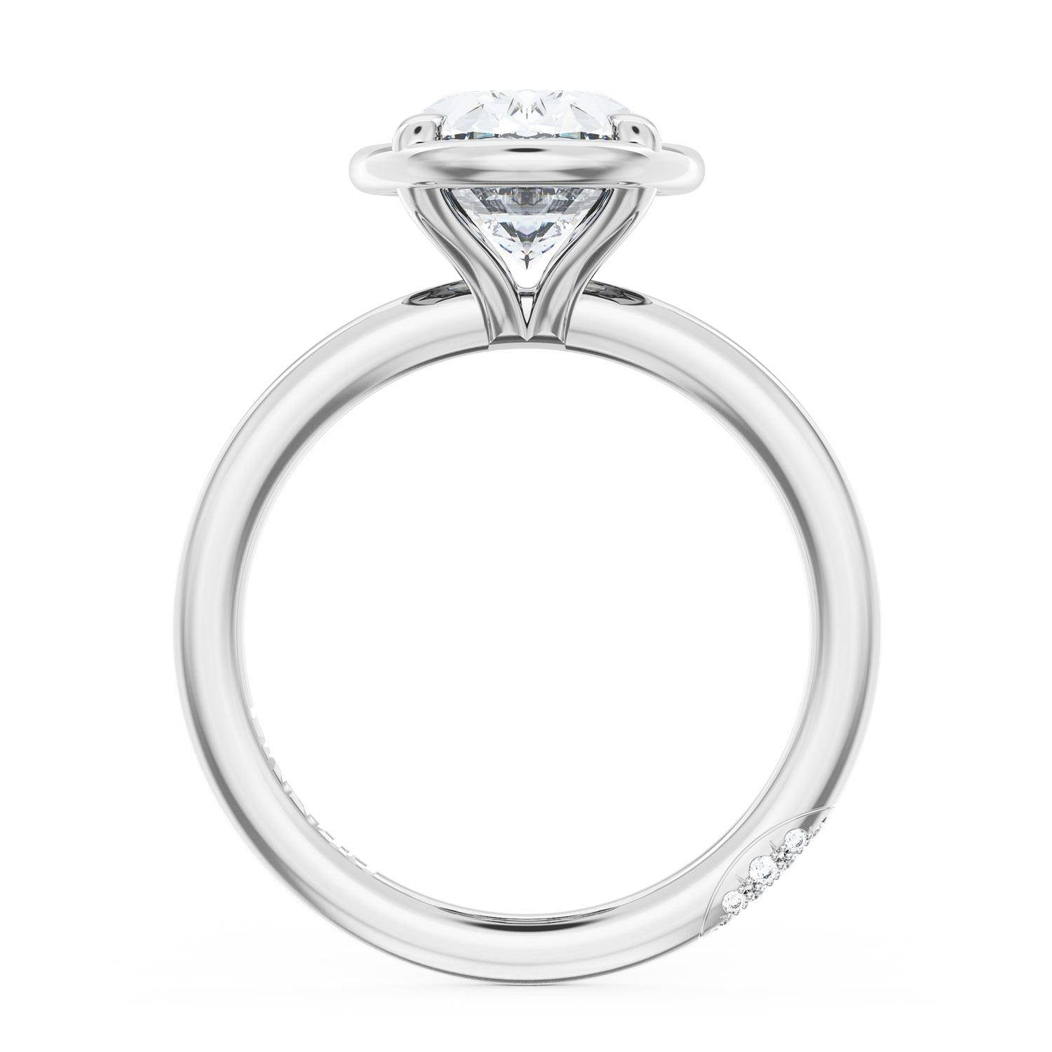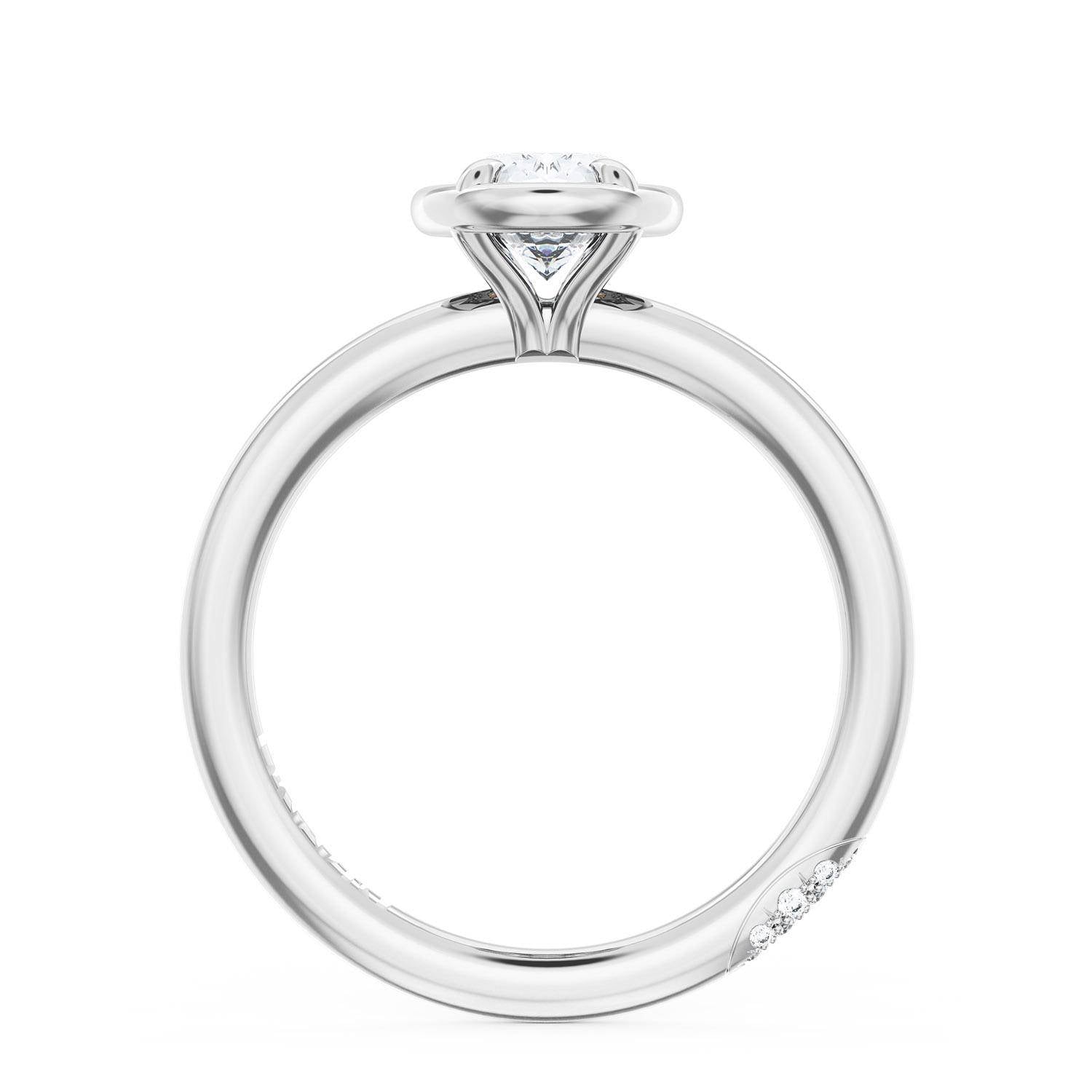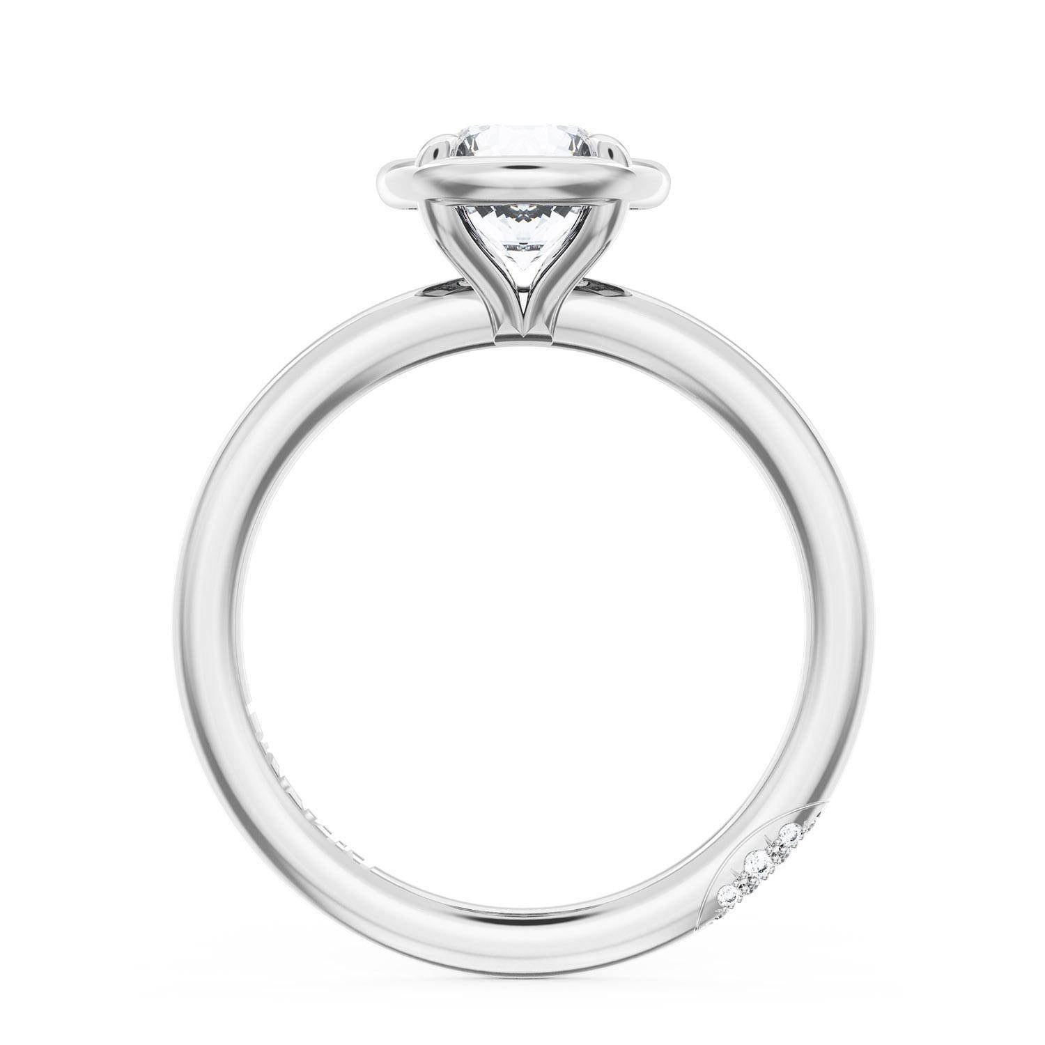 A Round Solitaire is set into a unique corset-inspired crown on a high-polish 18kt White Gold foundation. A diamond-studded Founder's Crescent marks the resting point.