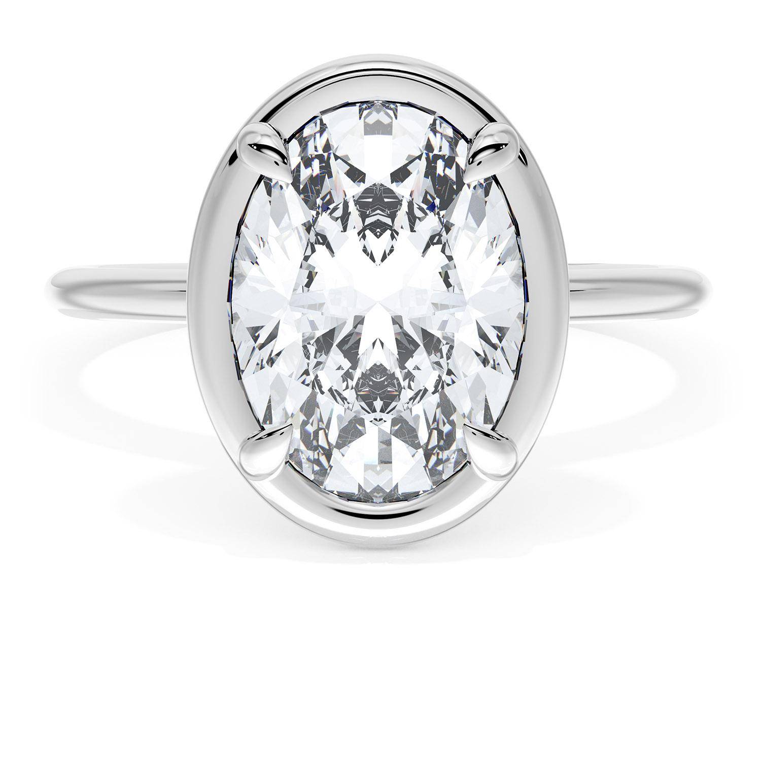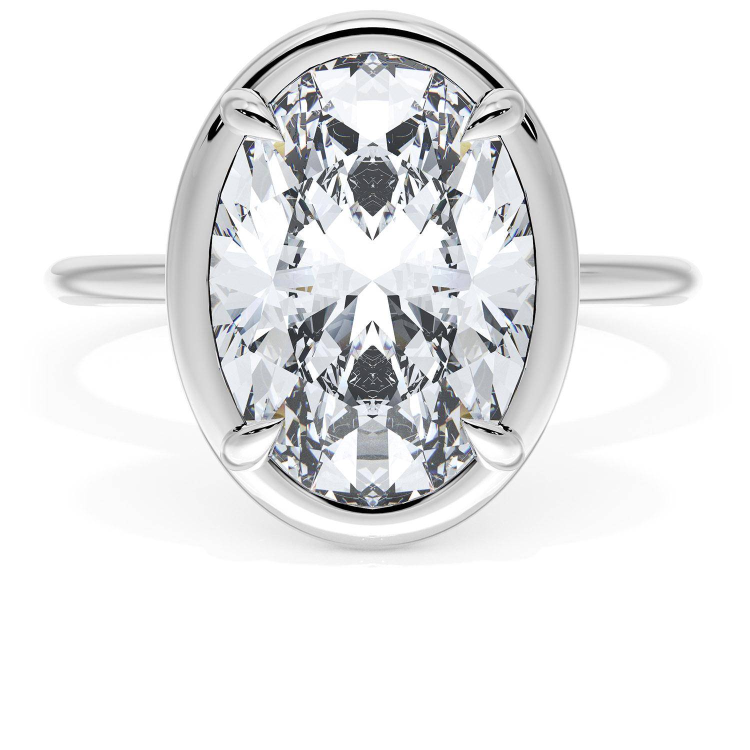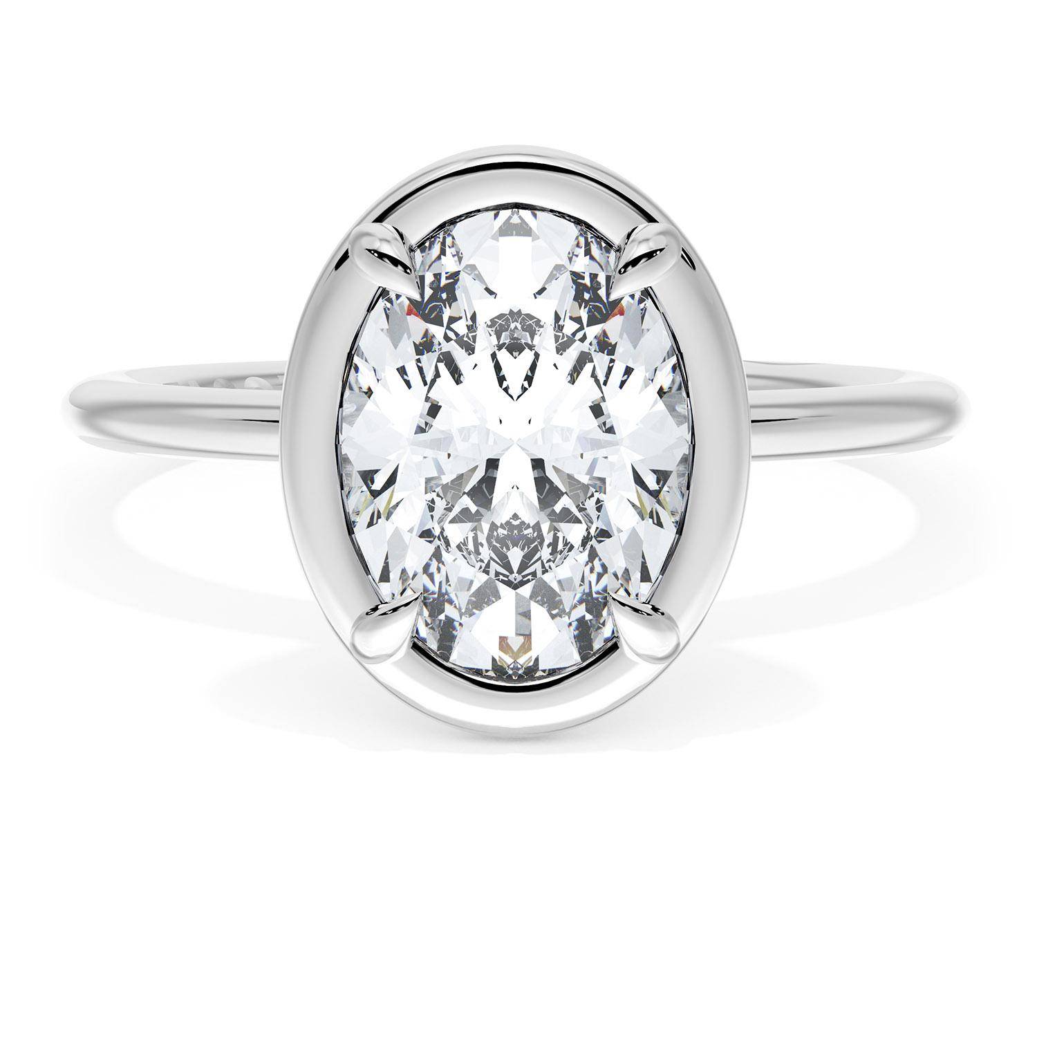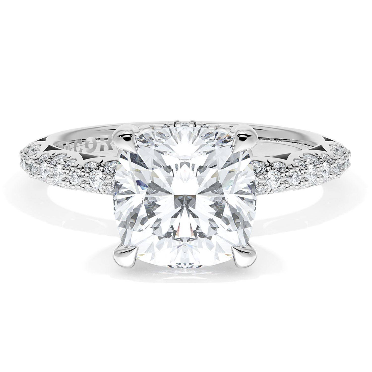 A Round Solitaire is set into a unique corset-inspired crown on a high-polish 18kt White Gold foundation. A diamond-studded Founder's Crescent marks the resting point.