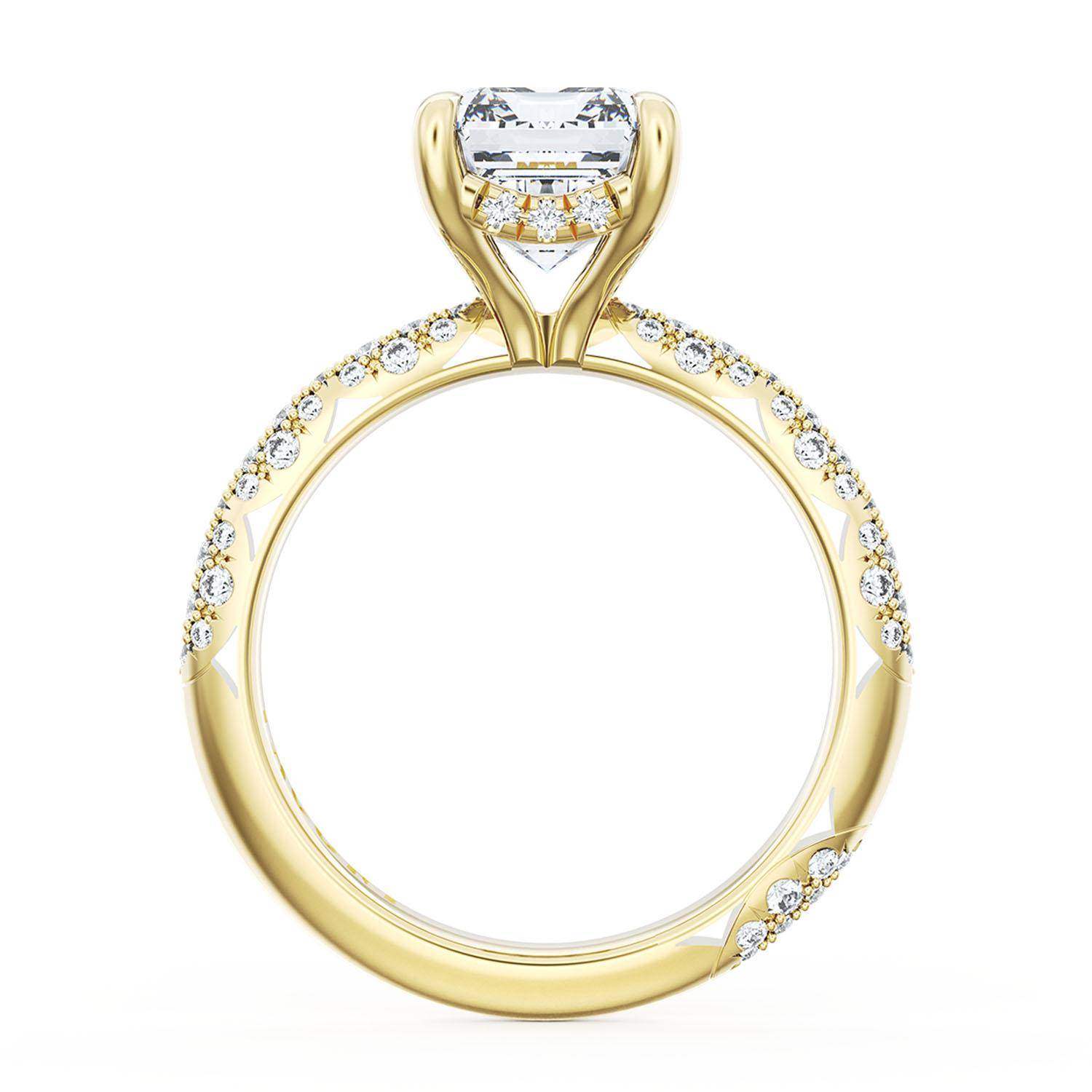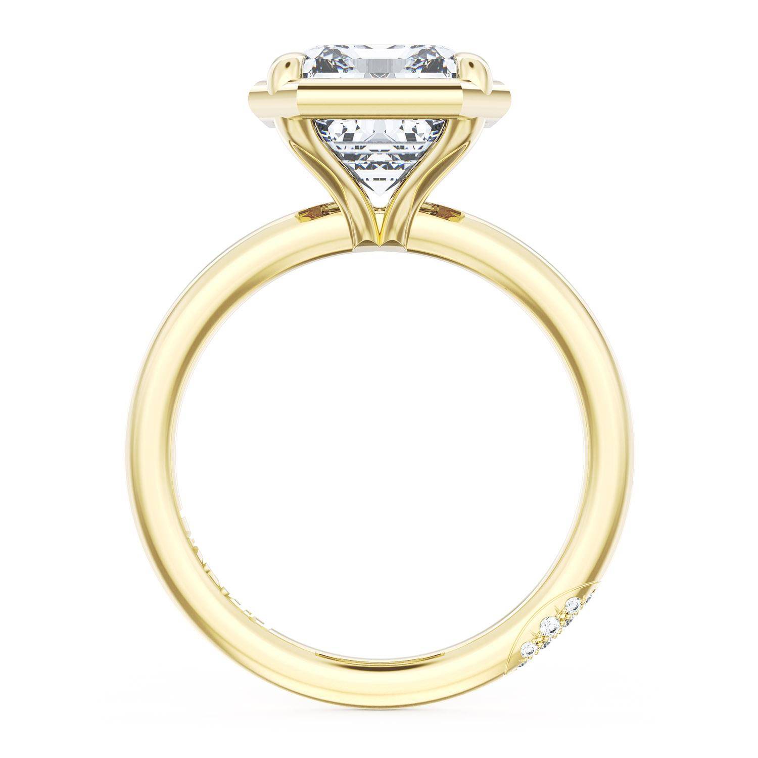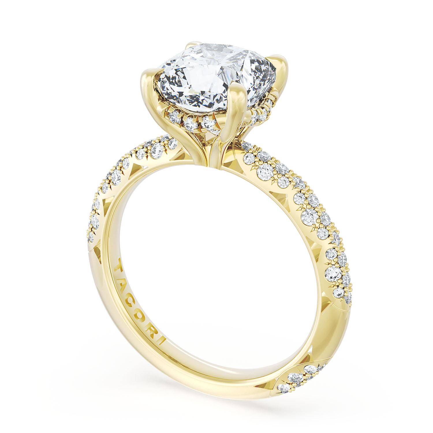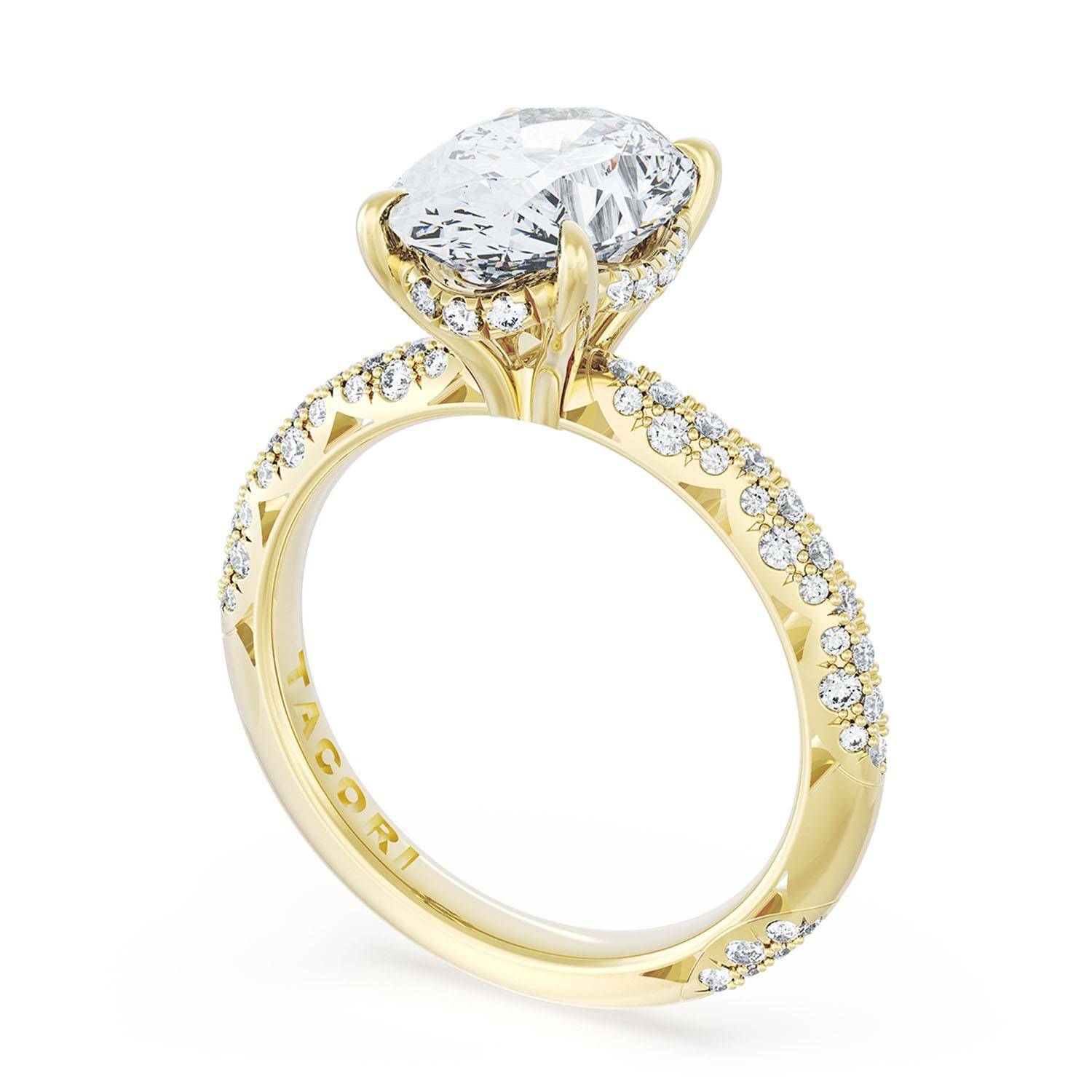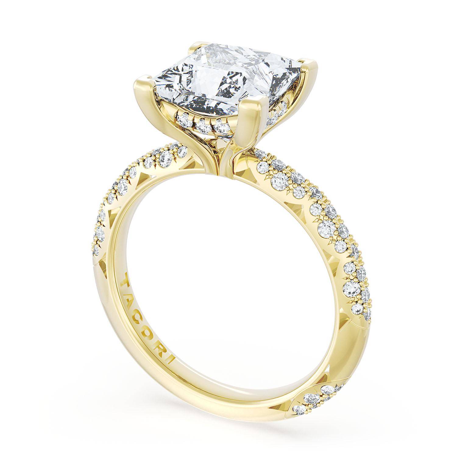 A Princess Solitaire is set into a unique corset-inspired crown on a 18kt Yellow Gold foundation. Pavé-set diamonds decorate the ceiling and a diamond-studded Founder's Crescent marks the resting point.