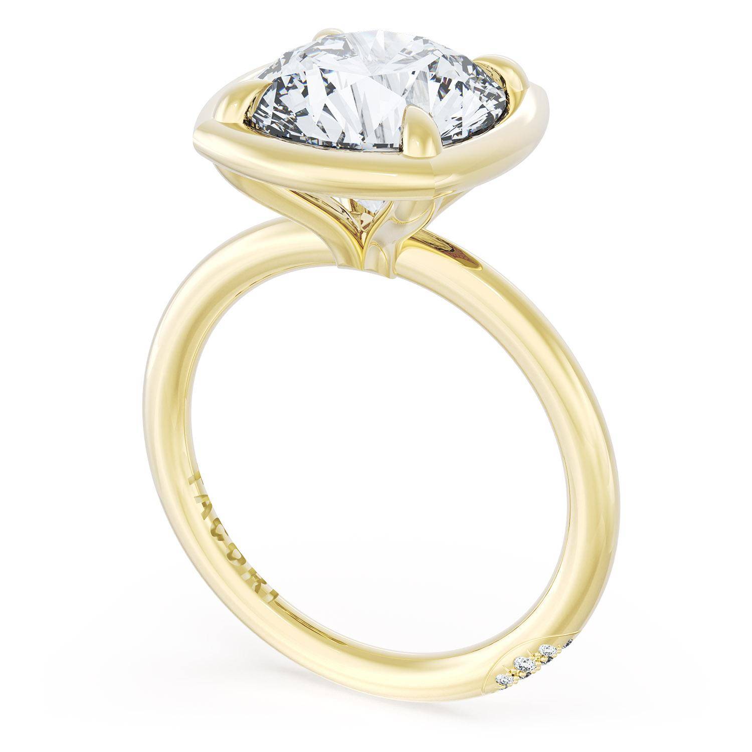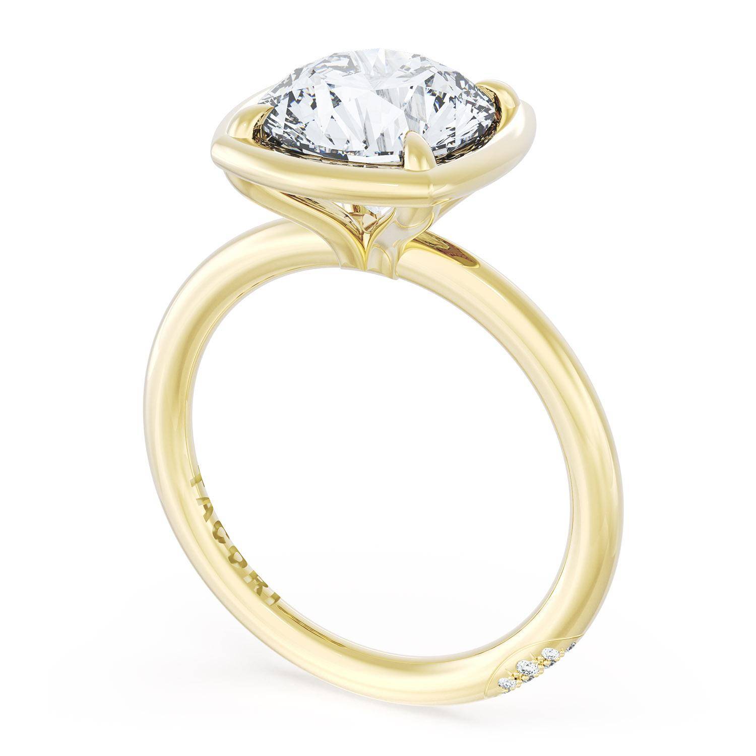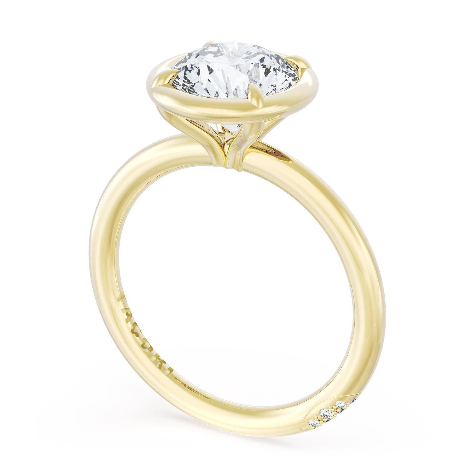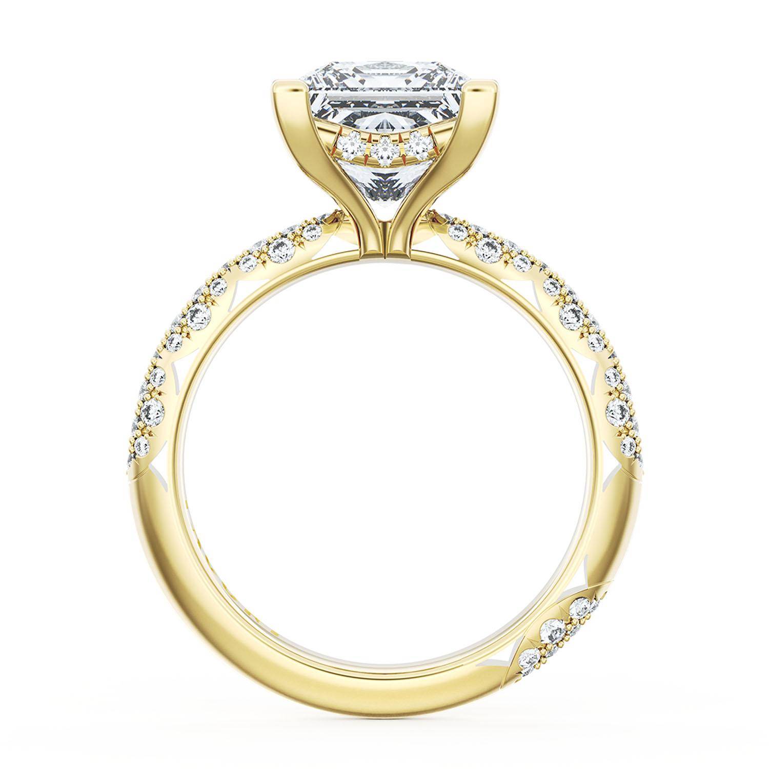 A Princess Solitaire is set into a unique corset-inspired crown on a 18kt Yellow Gold foundation. Pavé-set diamonds decorate the ceiling and a diamond-studded Founder's Crescent marks the resting point.