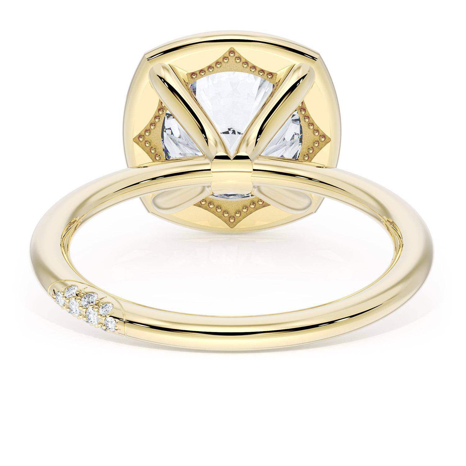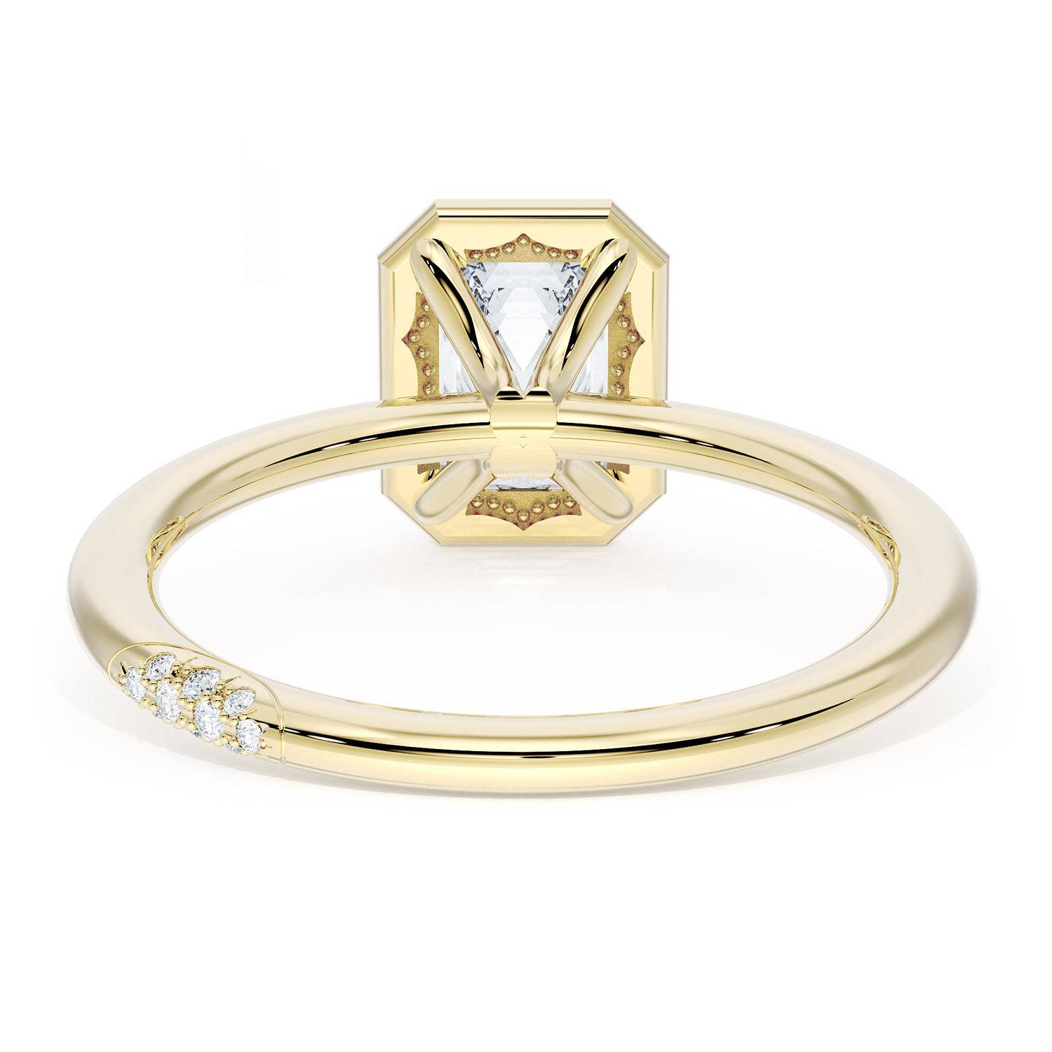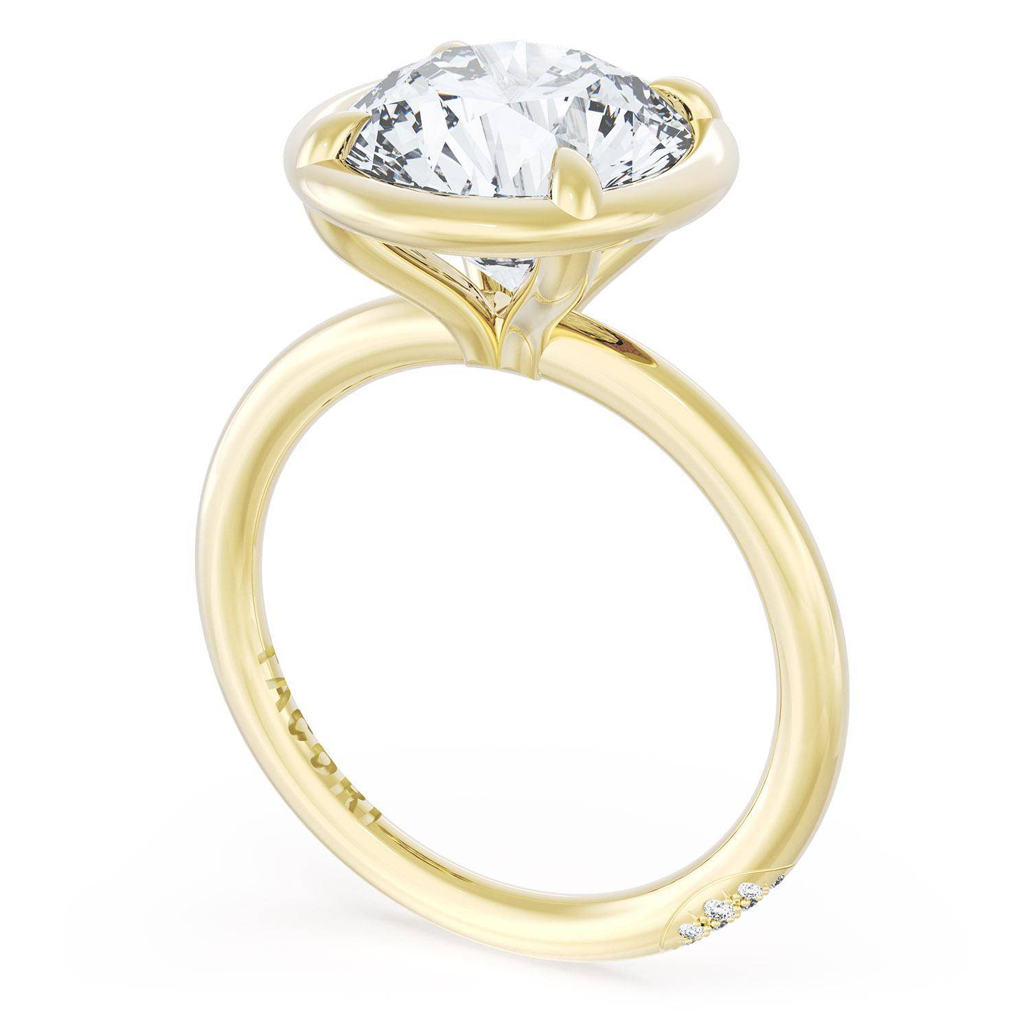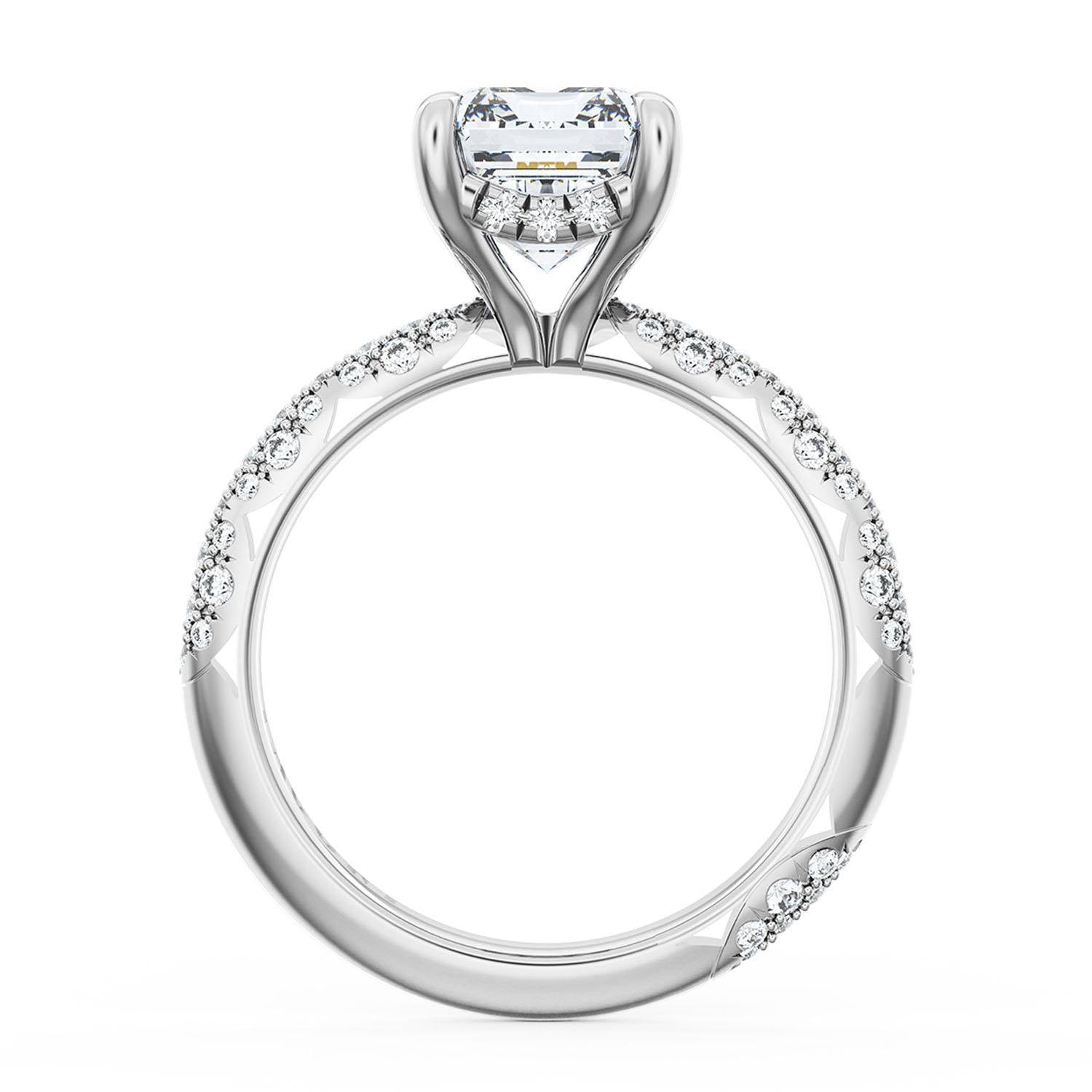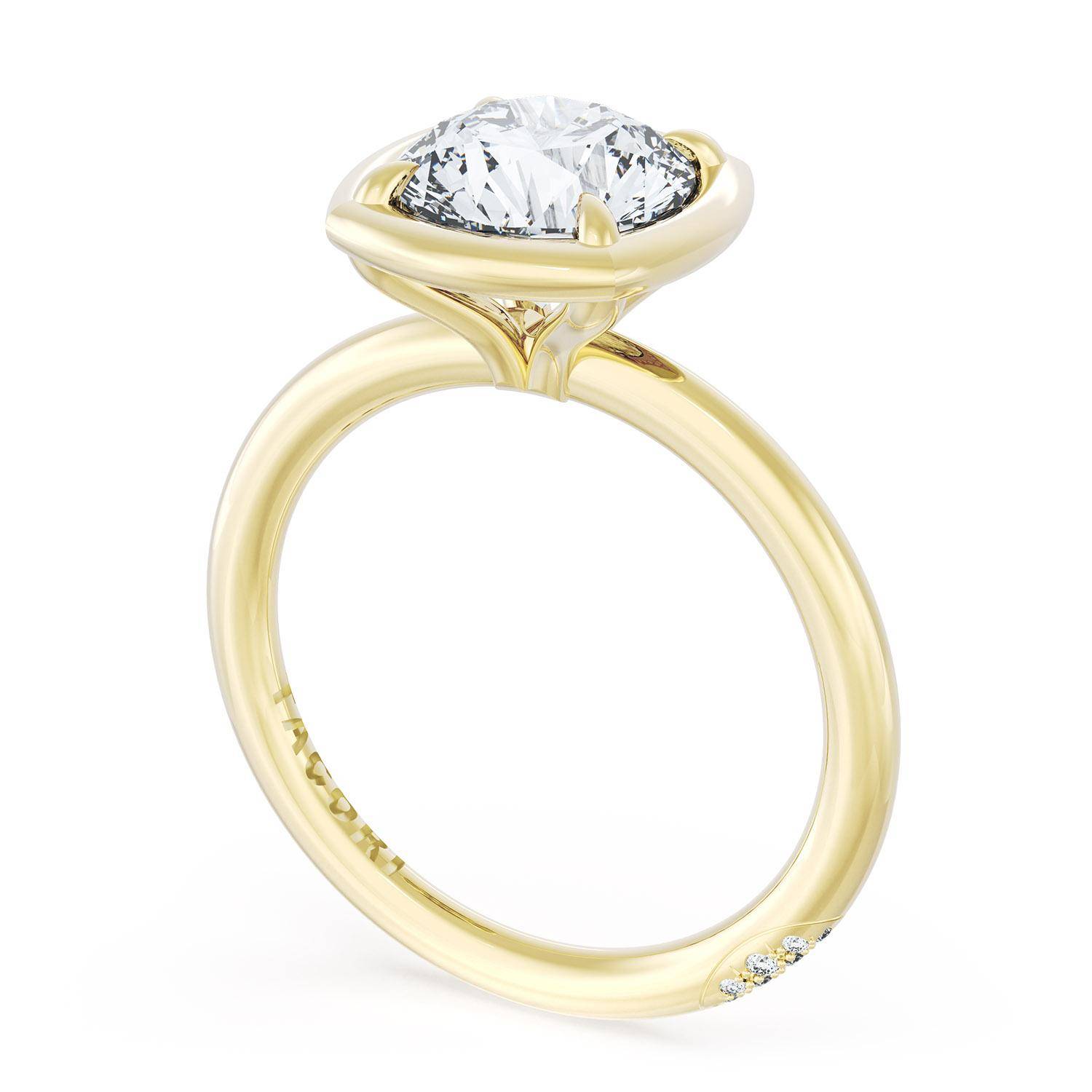 A Princess Solitaire is set into a unique corset-inspired crown on a 18kt Yellow Gold foundation. Pavé-set diamonds decorate the ceiling and a diamond-studded Founder's Crescent marks the resting point.