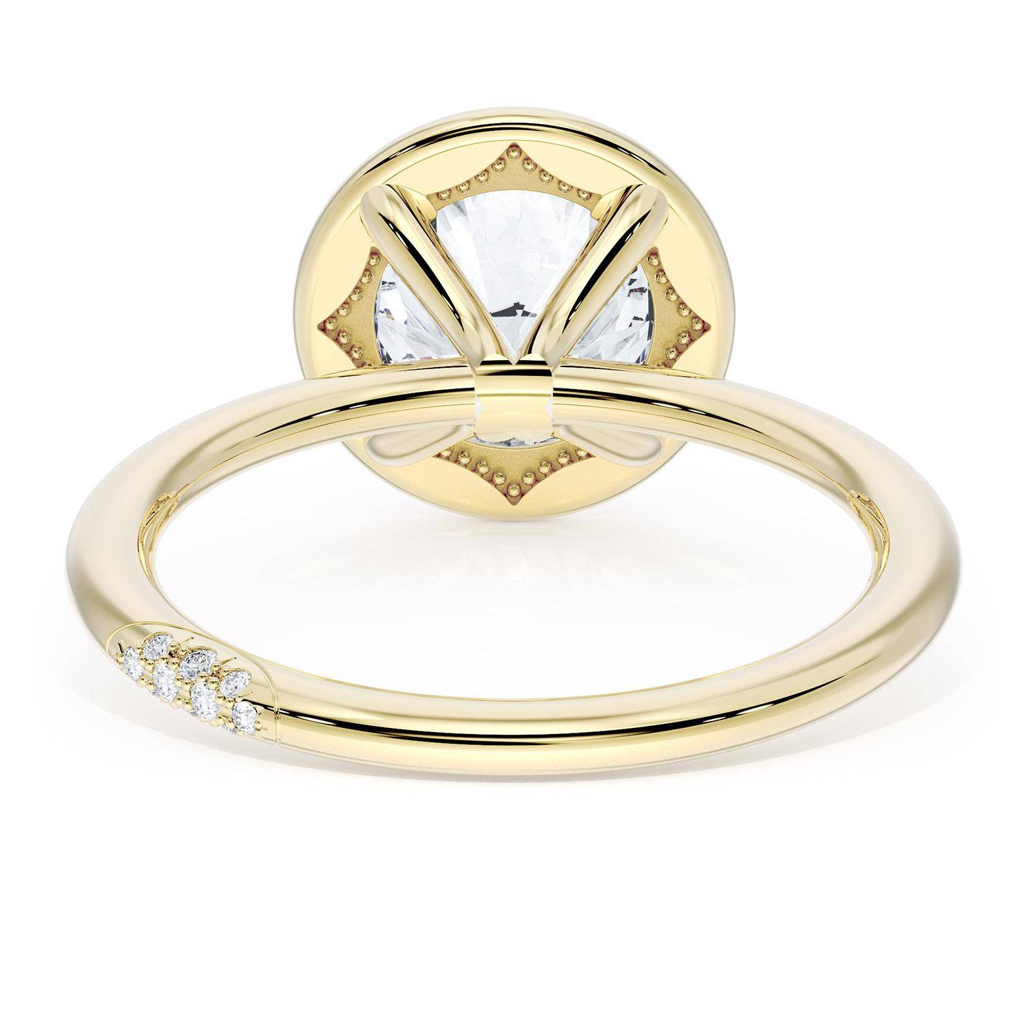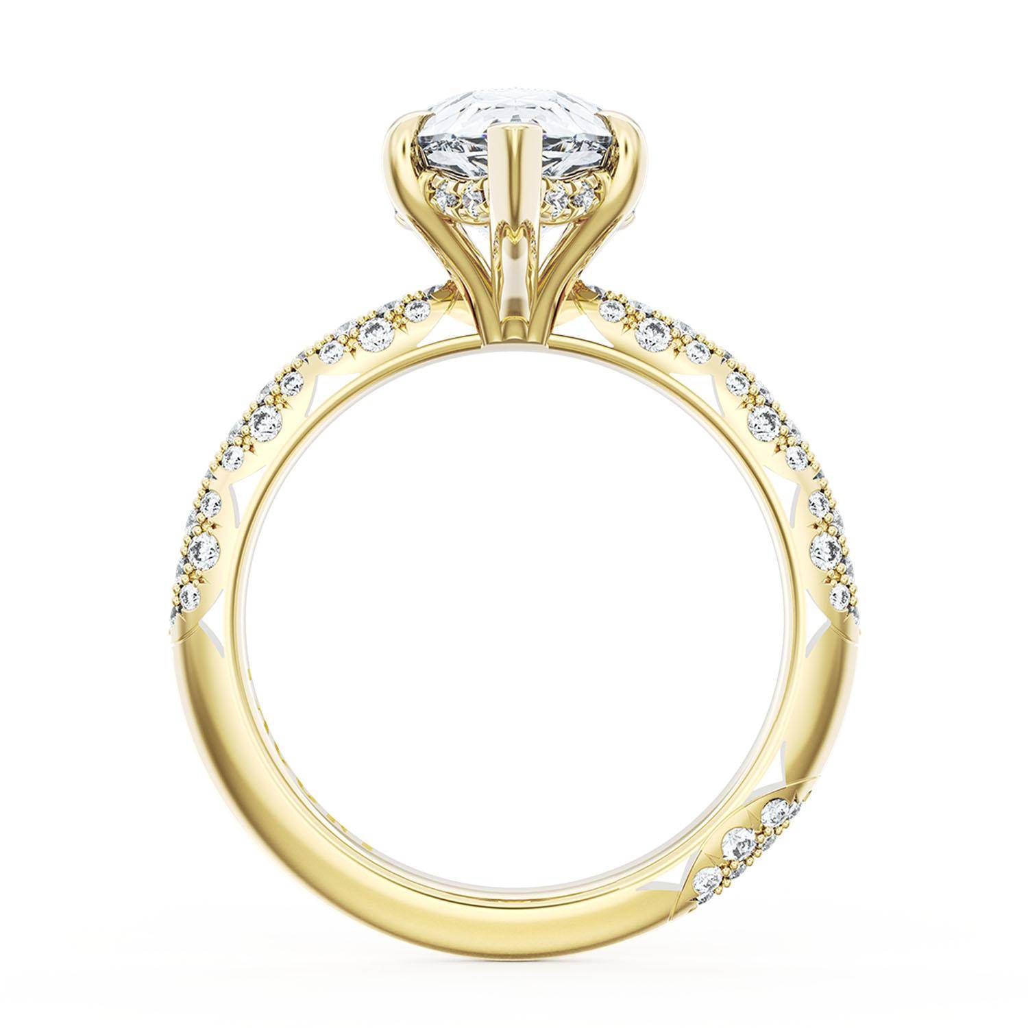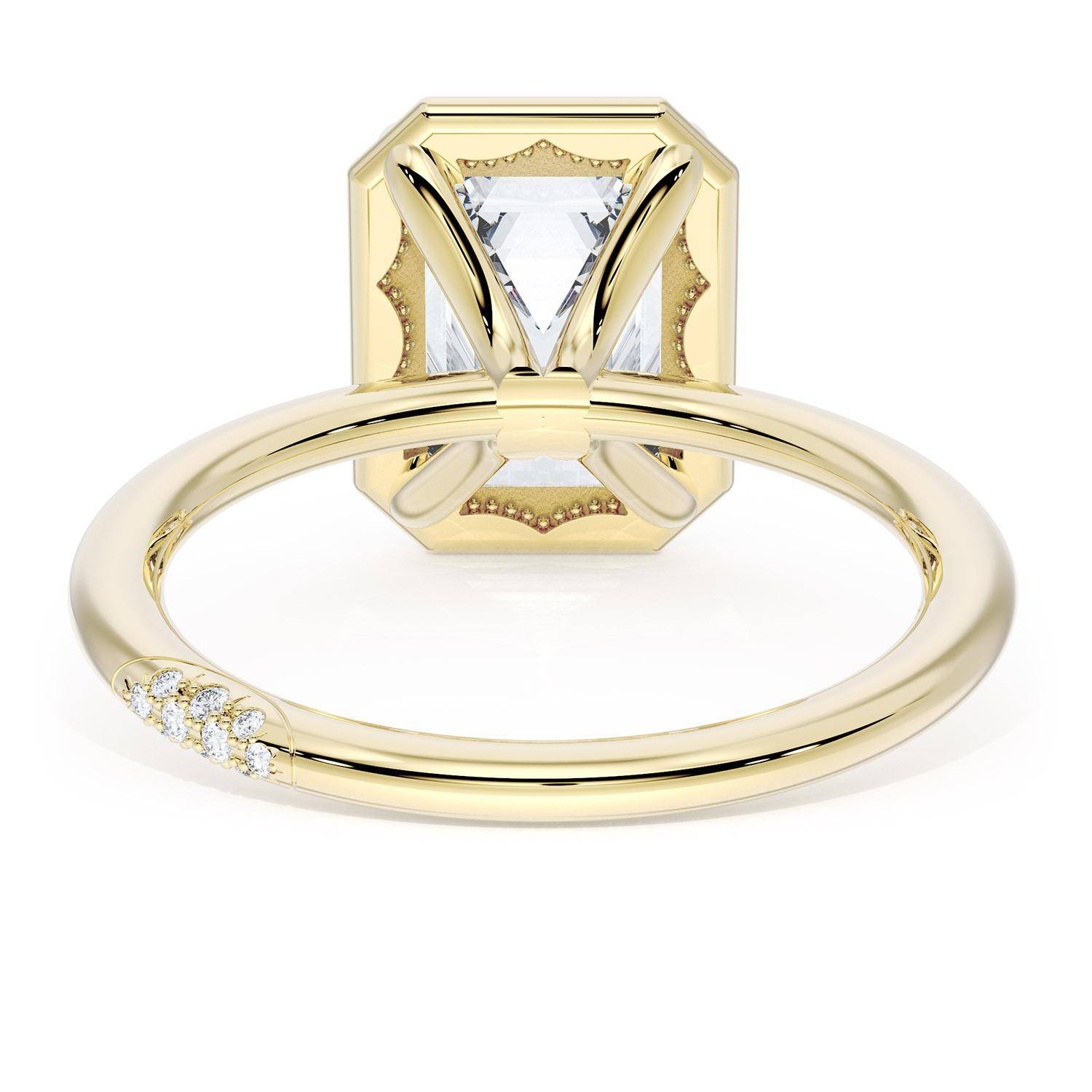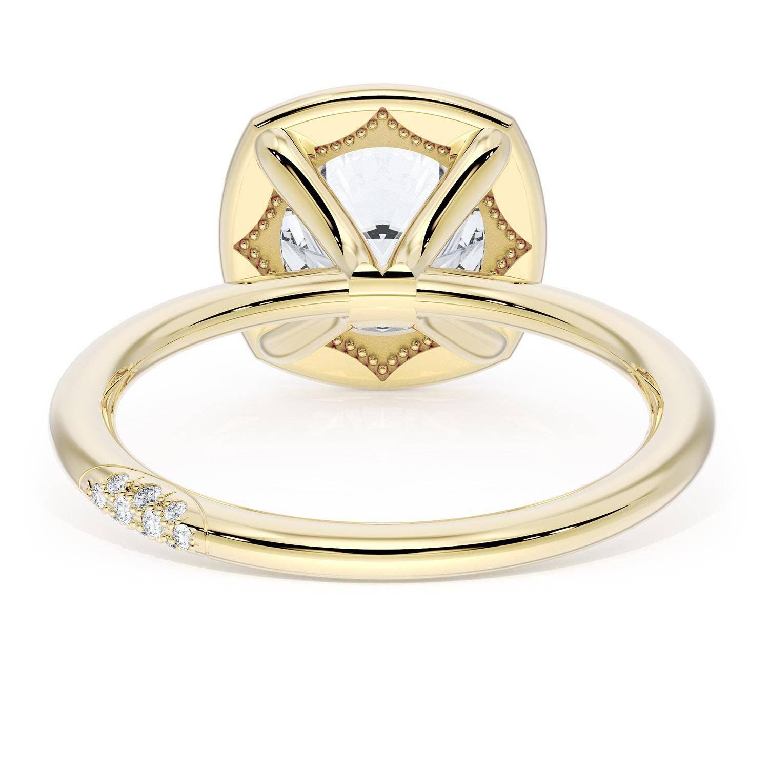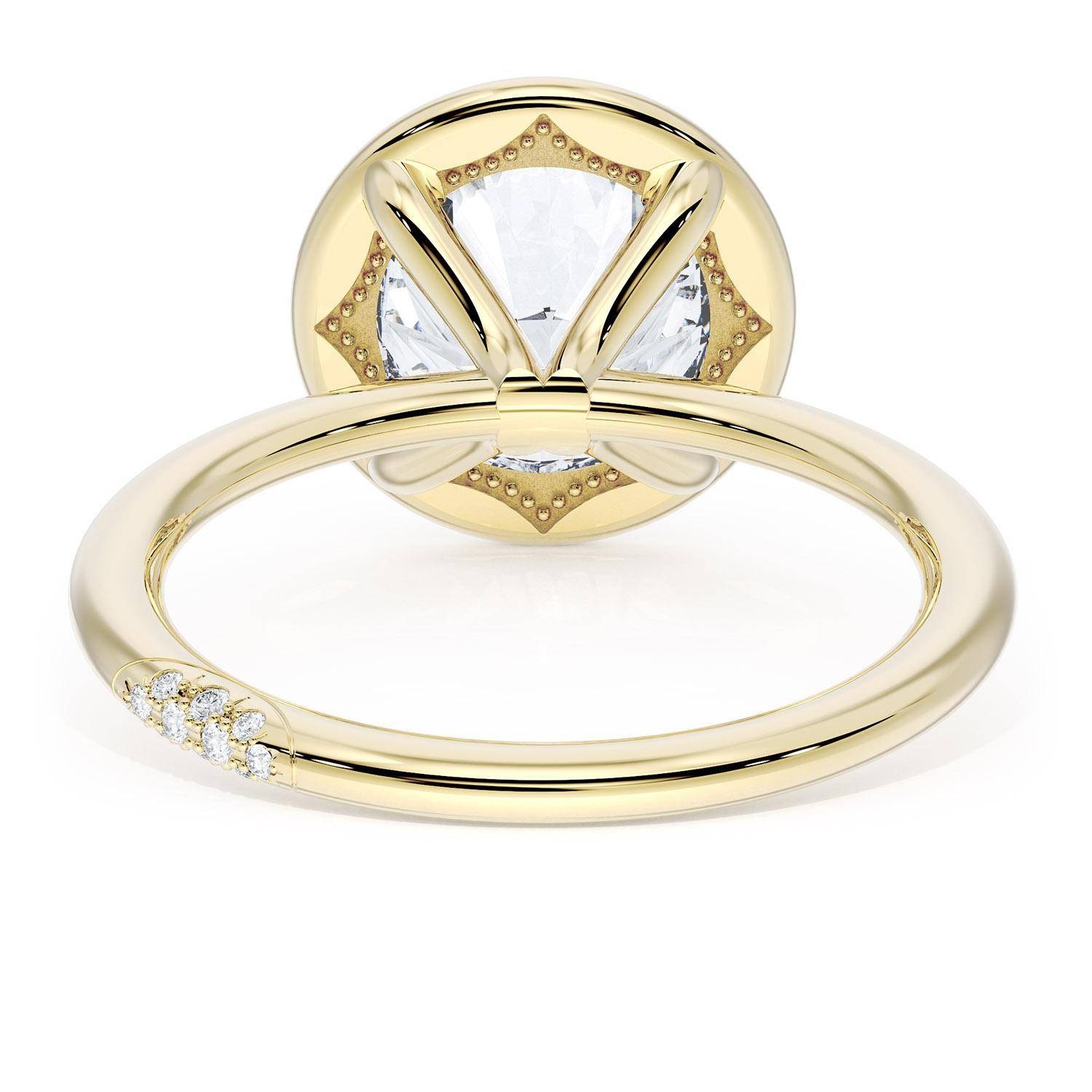 A Princess Solitaire is set into a unique corset-inspired crown on a 18kt Yellow Gold foundation. Pavé-set diamonds decorate the ceiling and a diamond-studded Founder's Crescent marks the resting point.