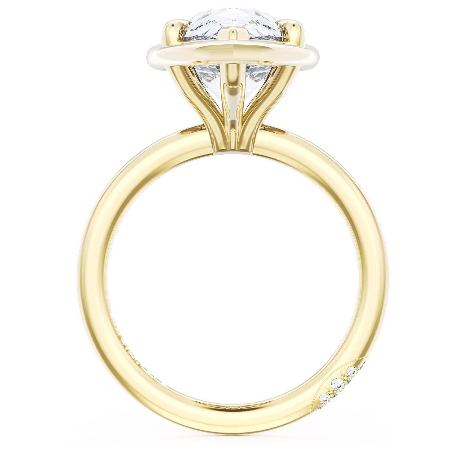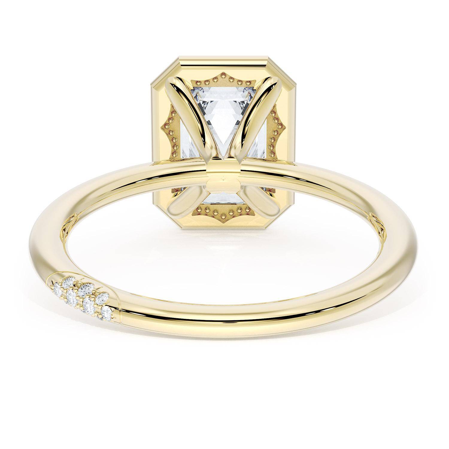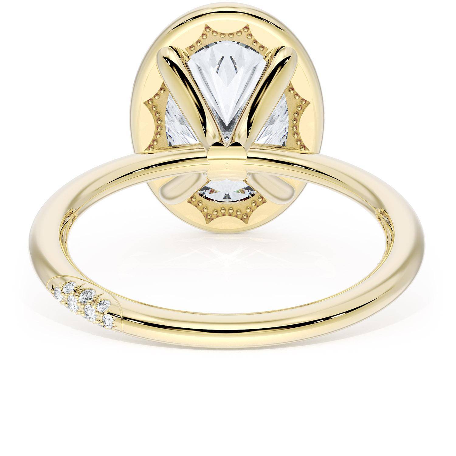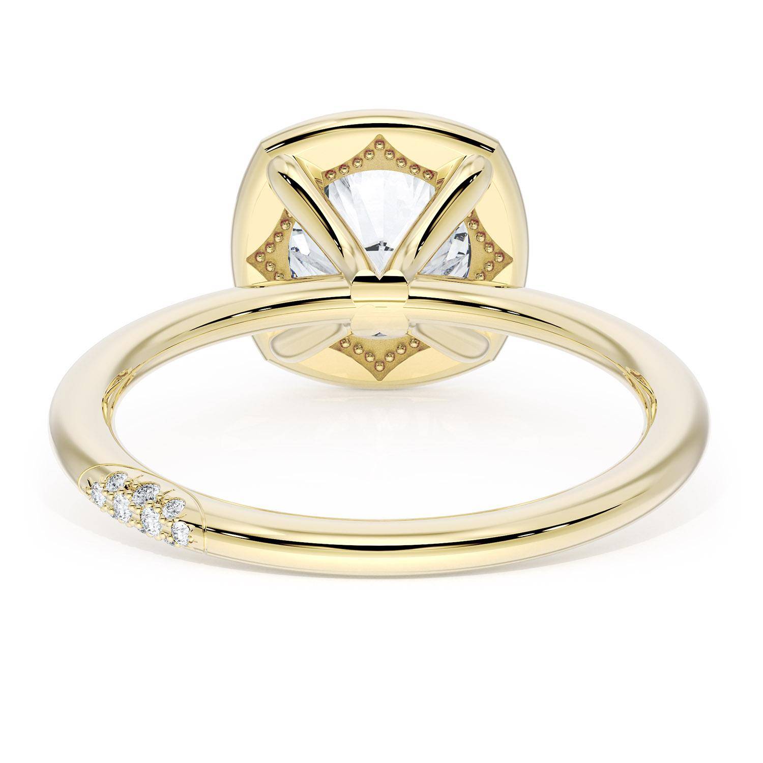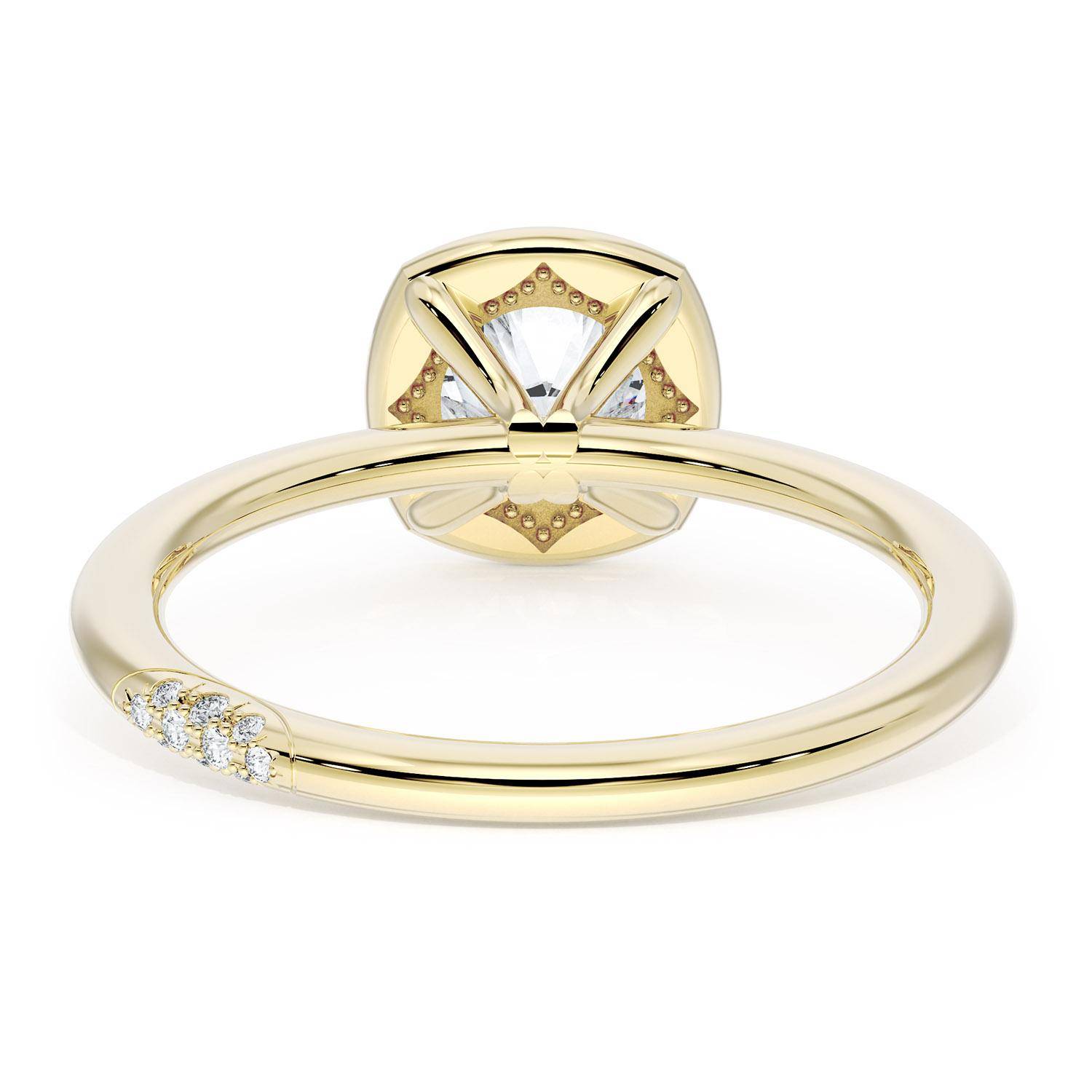 A Princess Solitaire is set into a unique corset-inspired crown on a 18kt Yellow Gold foundation. Pavé-set diamonds decorate the ceiling and a diamond-studded Founder's Crescent marks the resting point.
