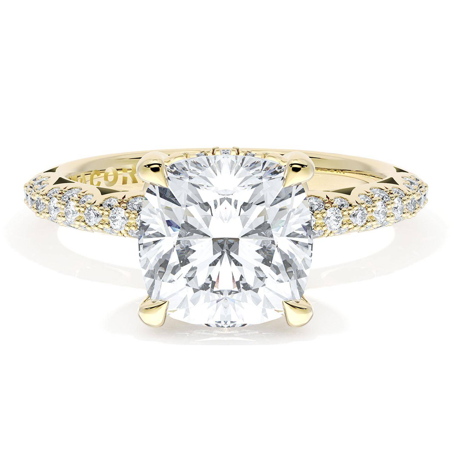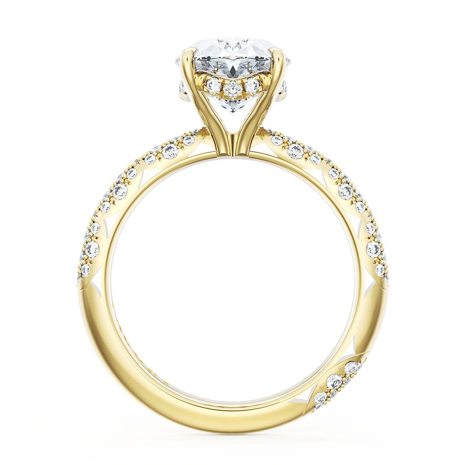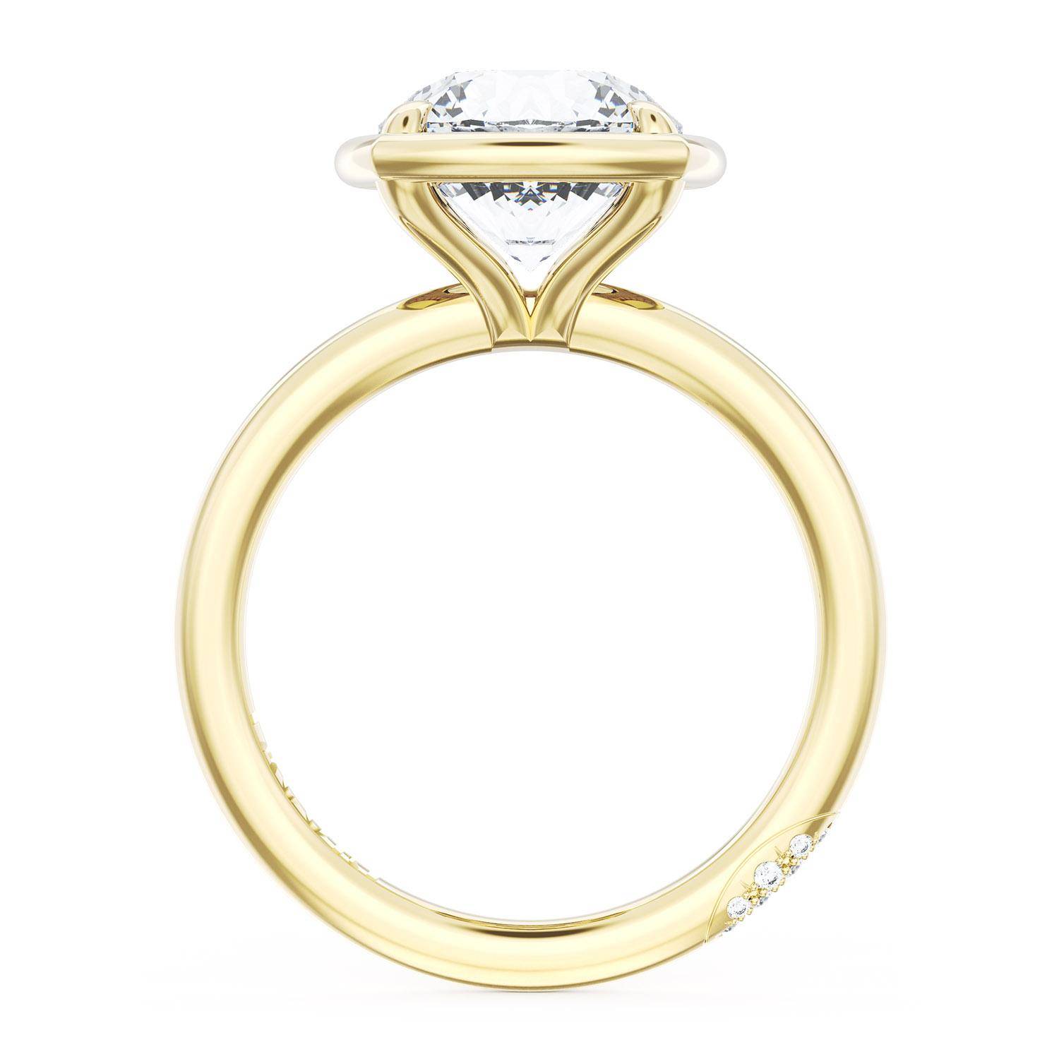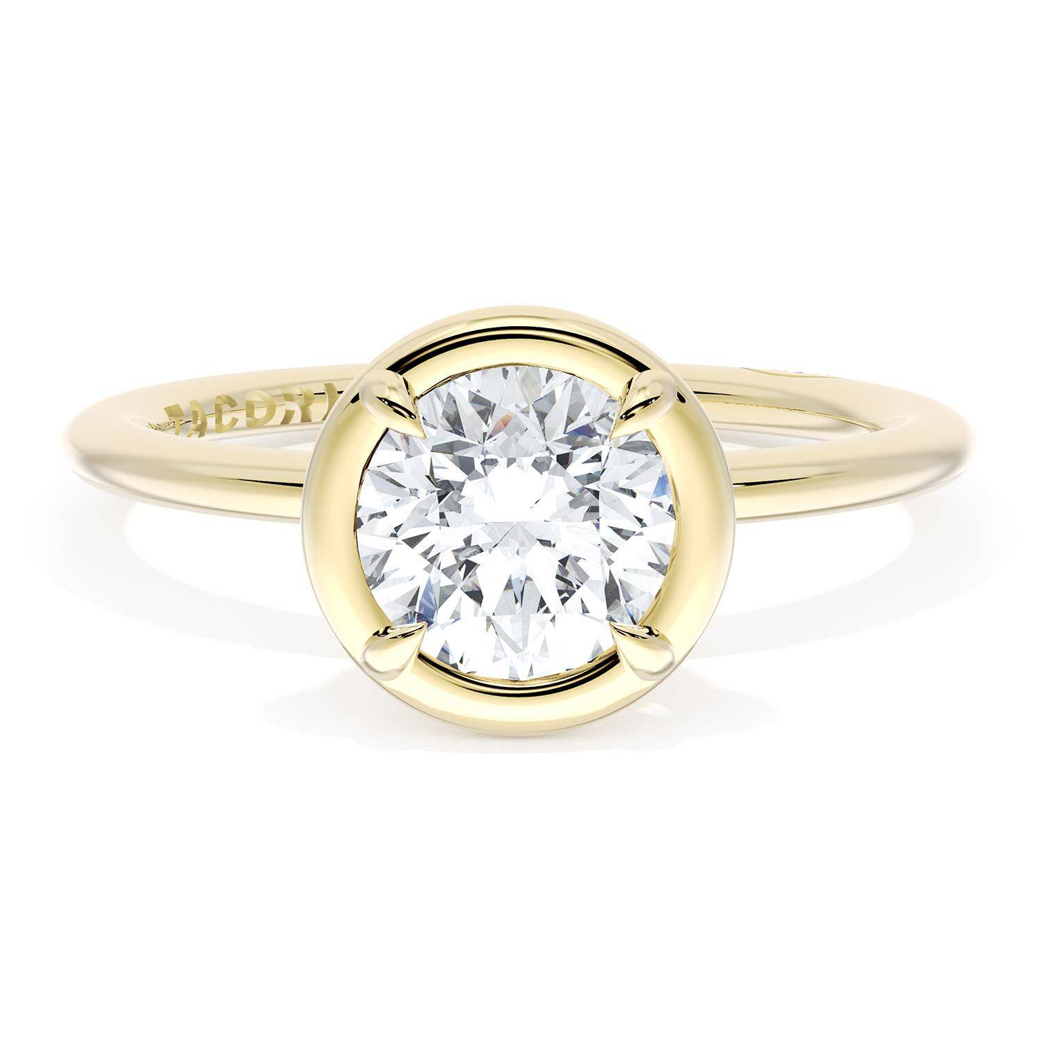 A Princess Solitaire is set into a unique corset-inspired crown on a 18kt Yellow Gold foundation. Pavé-set diamonds decorate the ceiling and a diamond-studded Founder's Crescent marks the resting point.