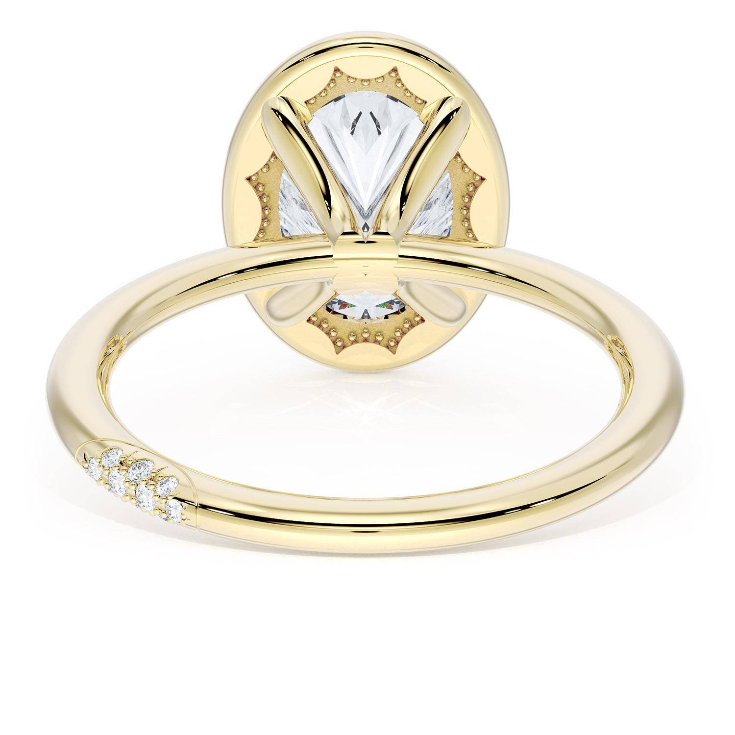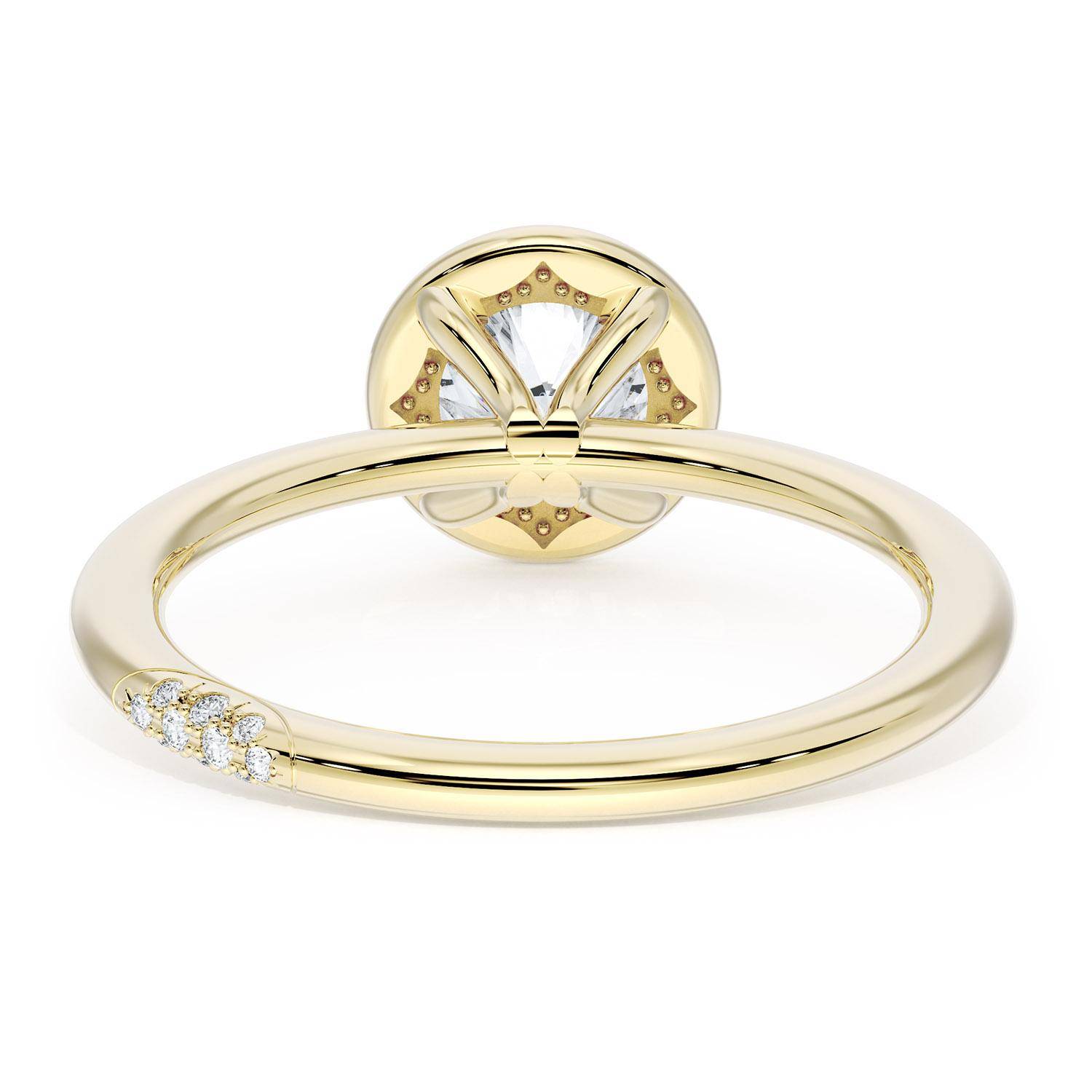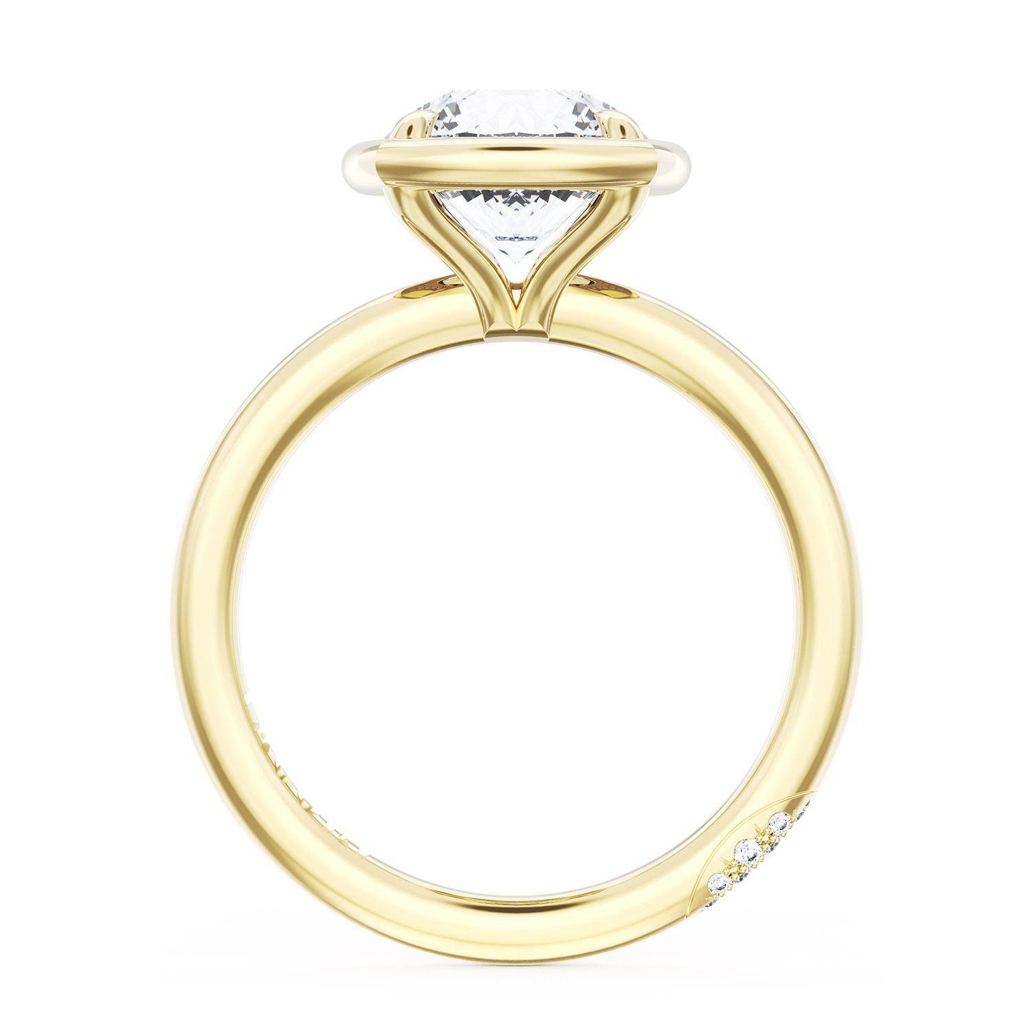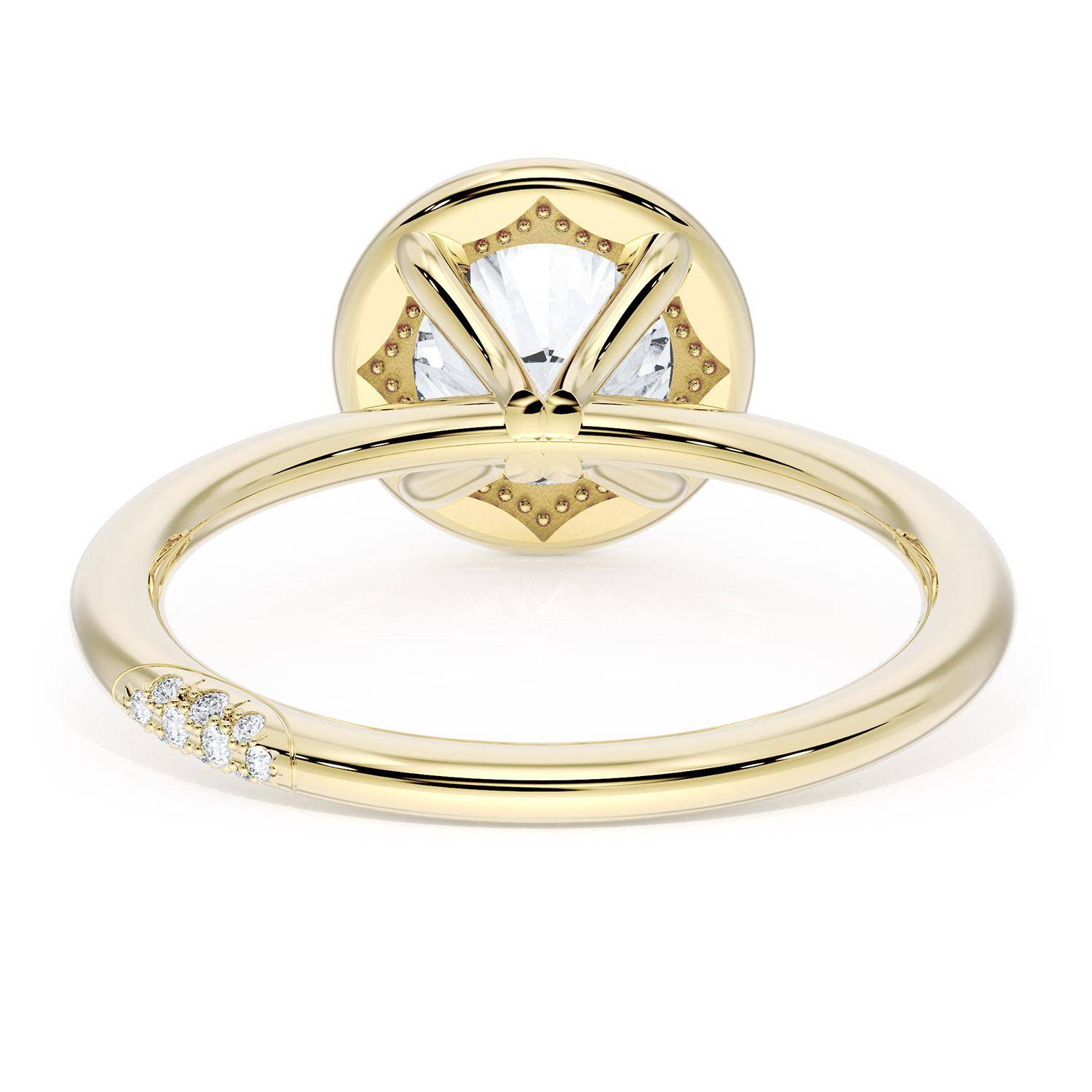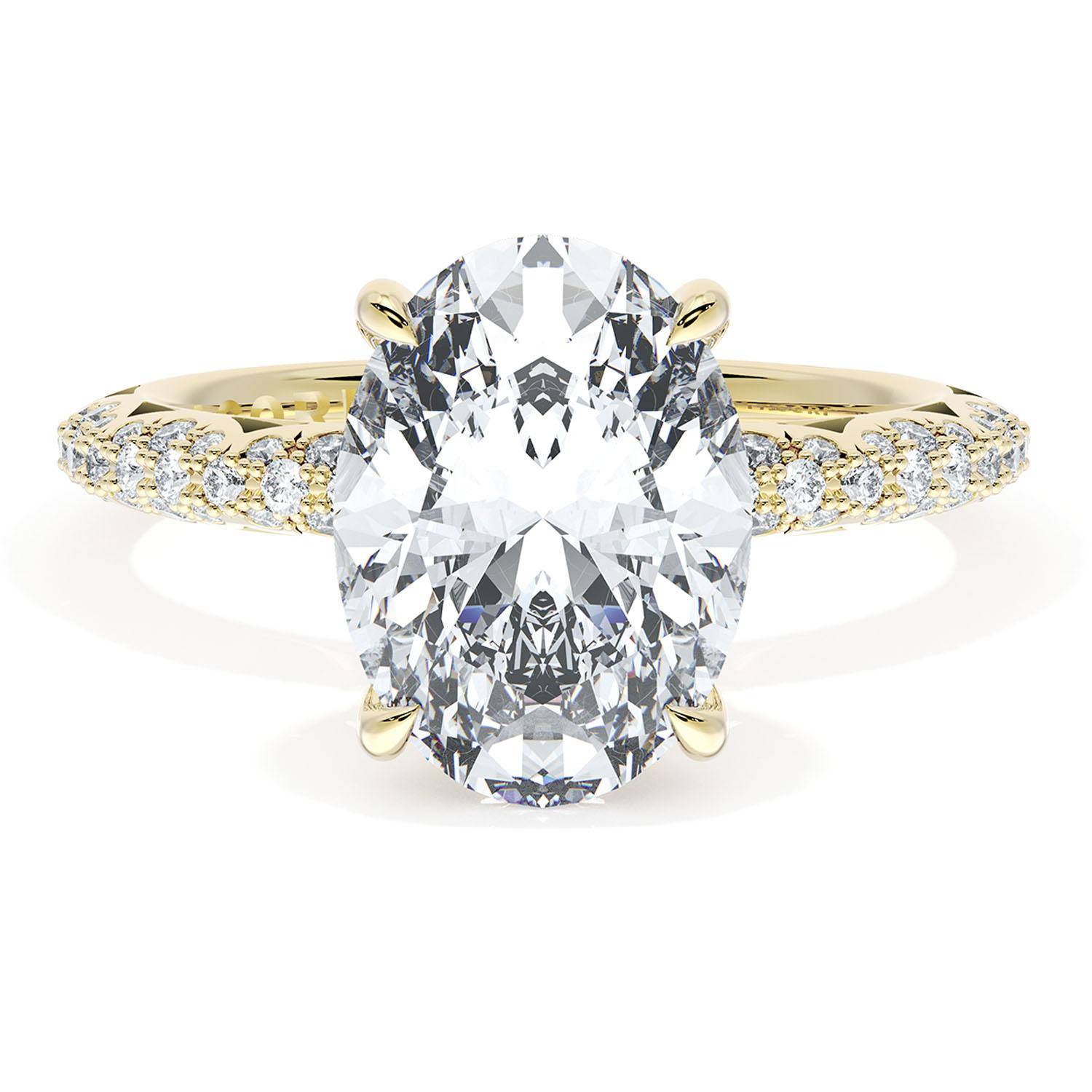 A Princess Solitaire is set into a unique corset-inspired crown on a 18kt Yellow Gold foundation. Pavé-set diamonds decorate the ceiling and a diamond-studded Founder's Crescent marks the resting point.
