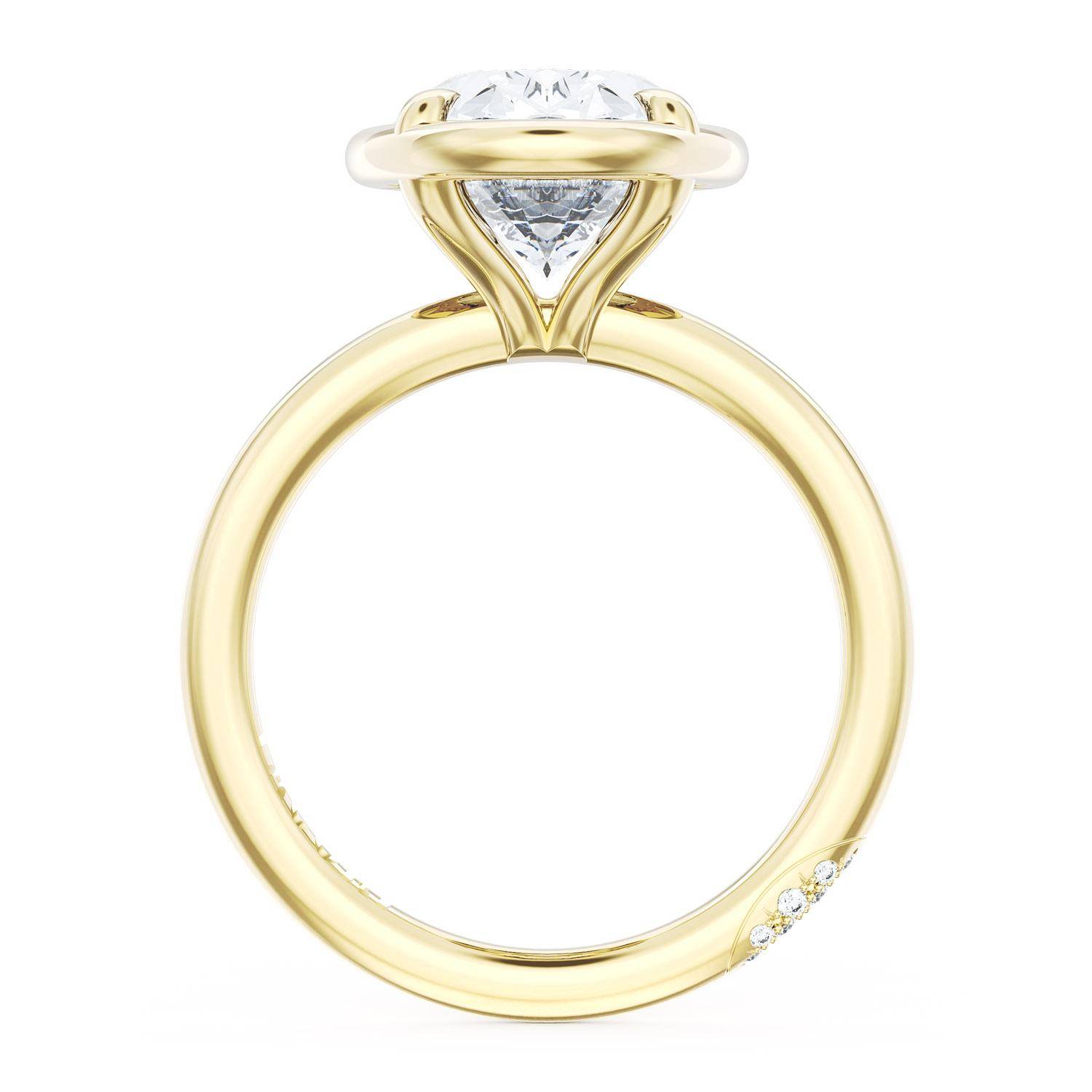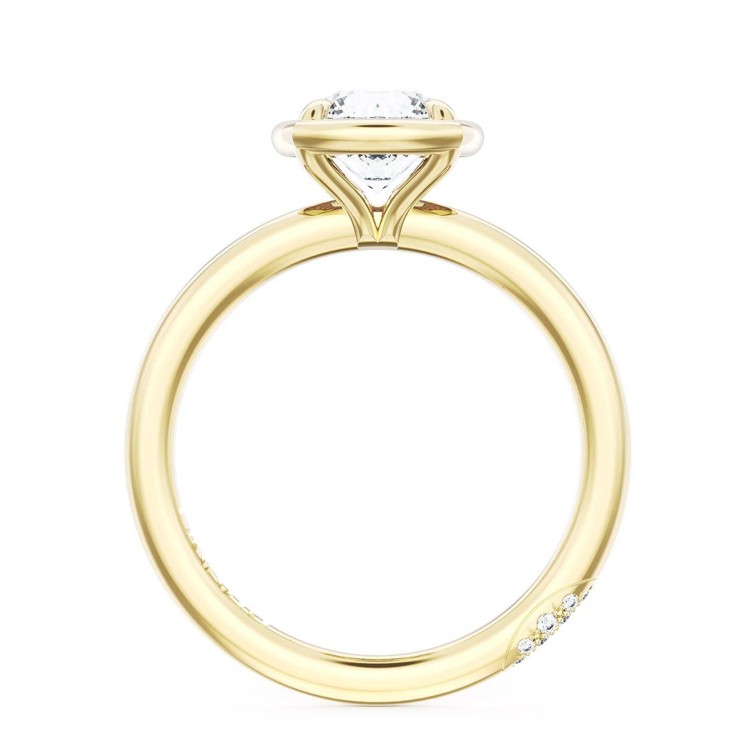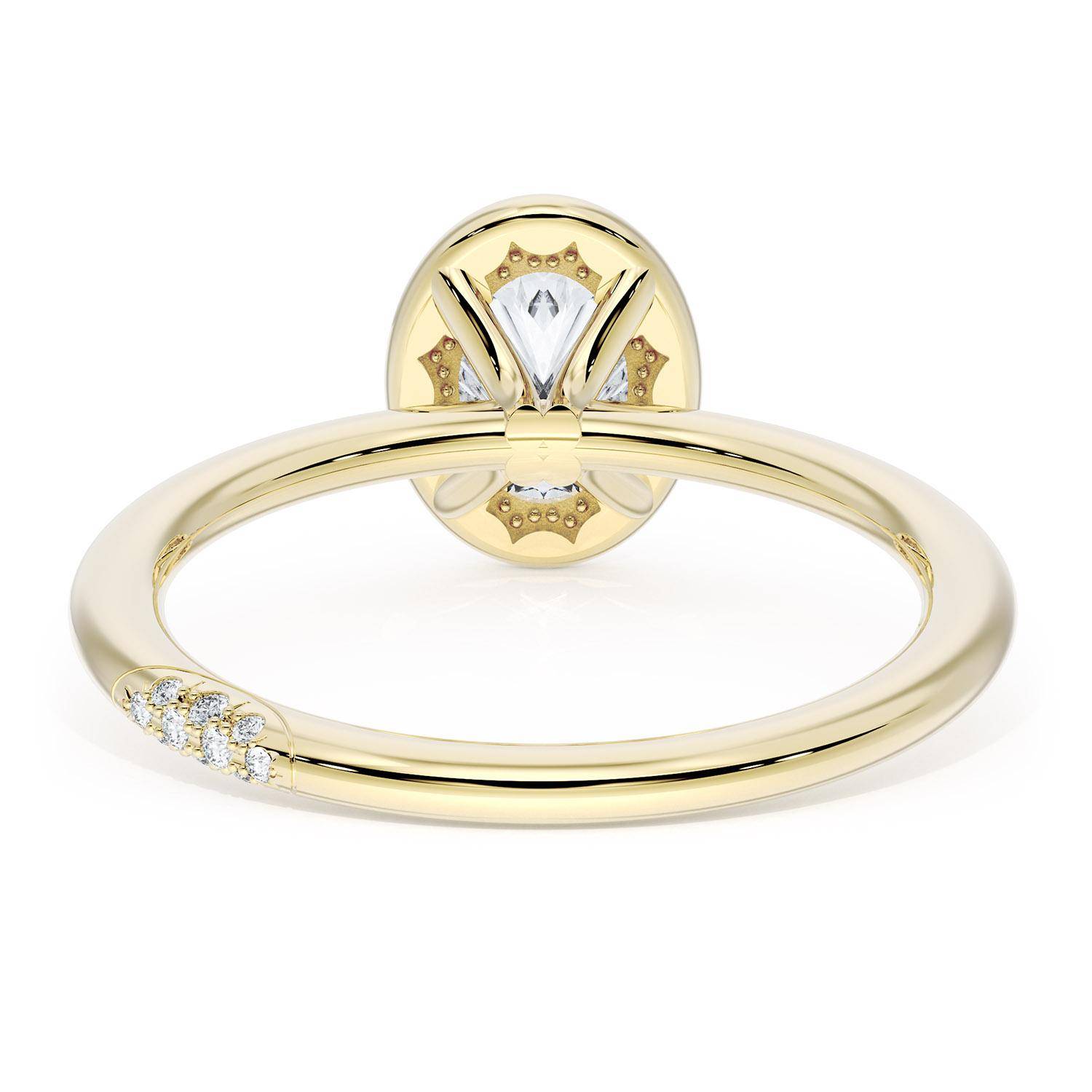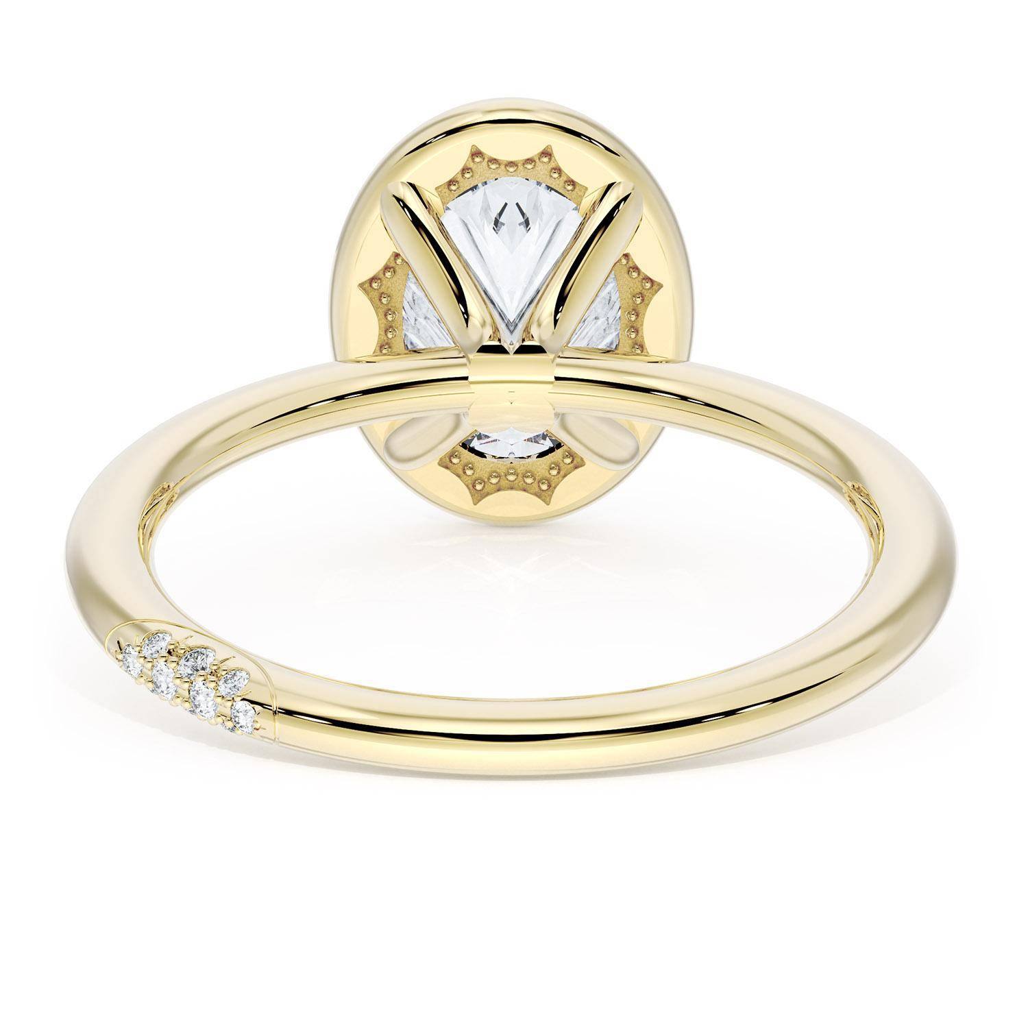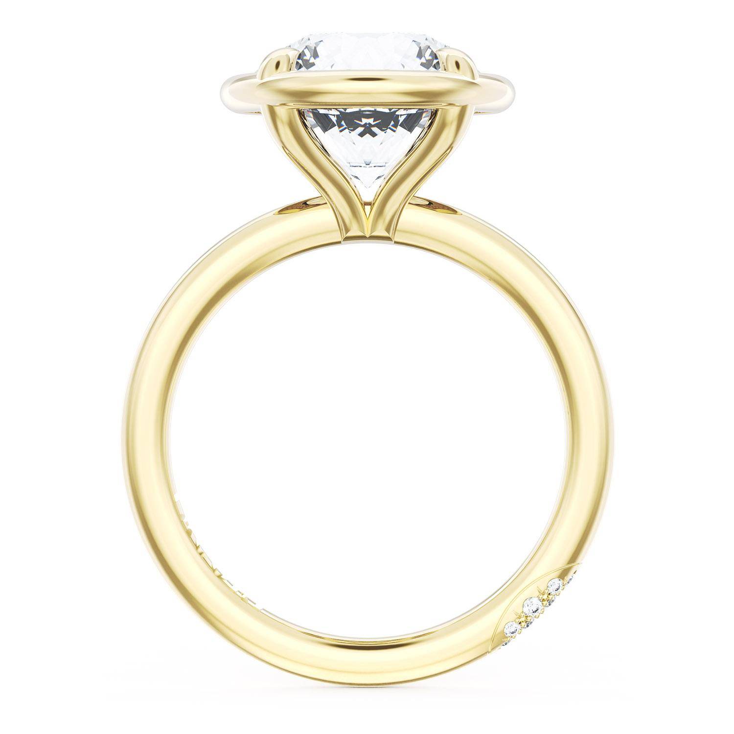 A Princess Solitaire is set into a unique corset-inspired crown on a 18kt Yellow Gold foundation. Pavé-set diamonds decorate the ceiling and a diamond-studded Founder's Crescent marks the resting point.