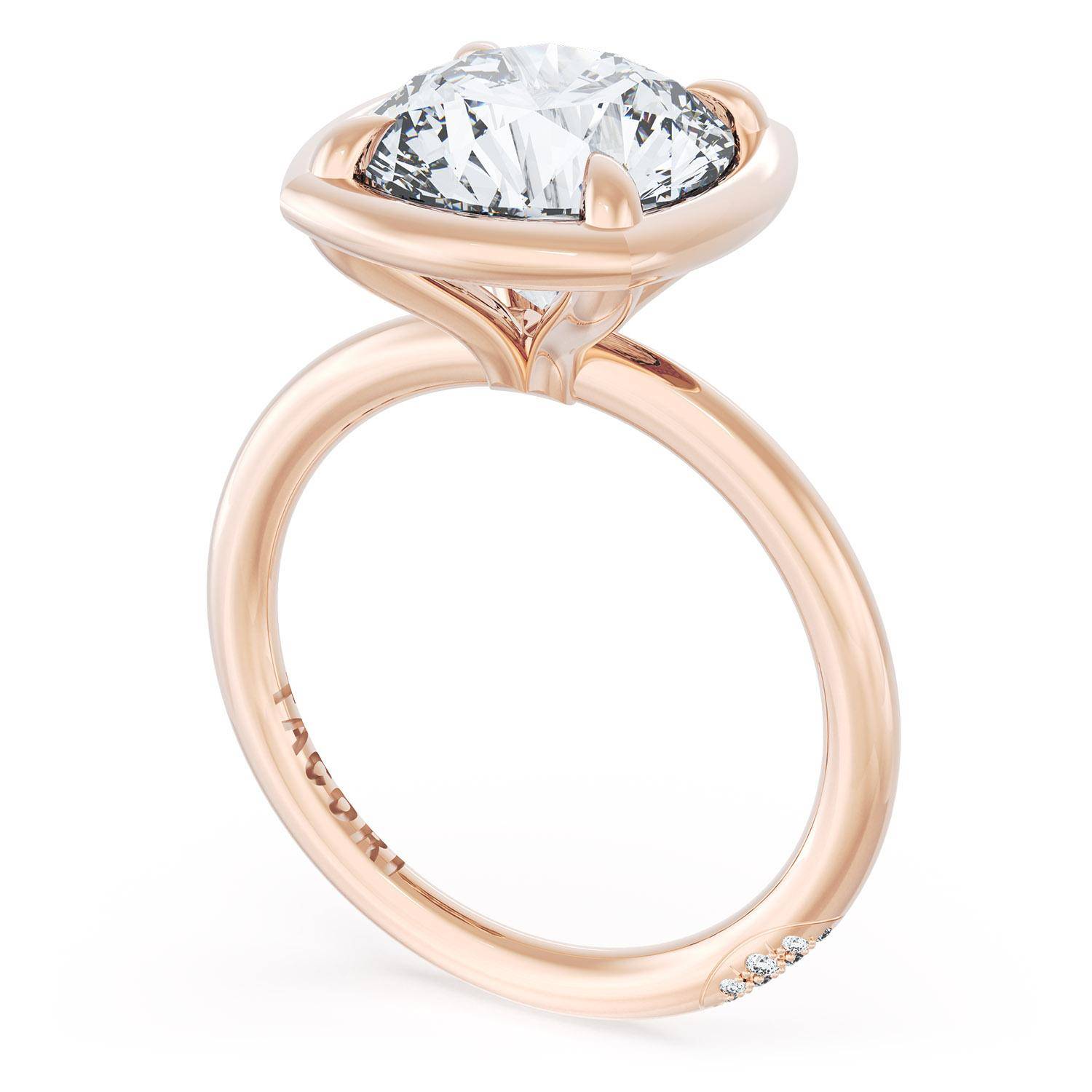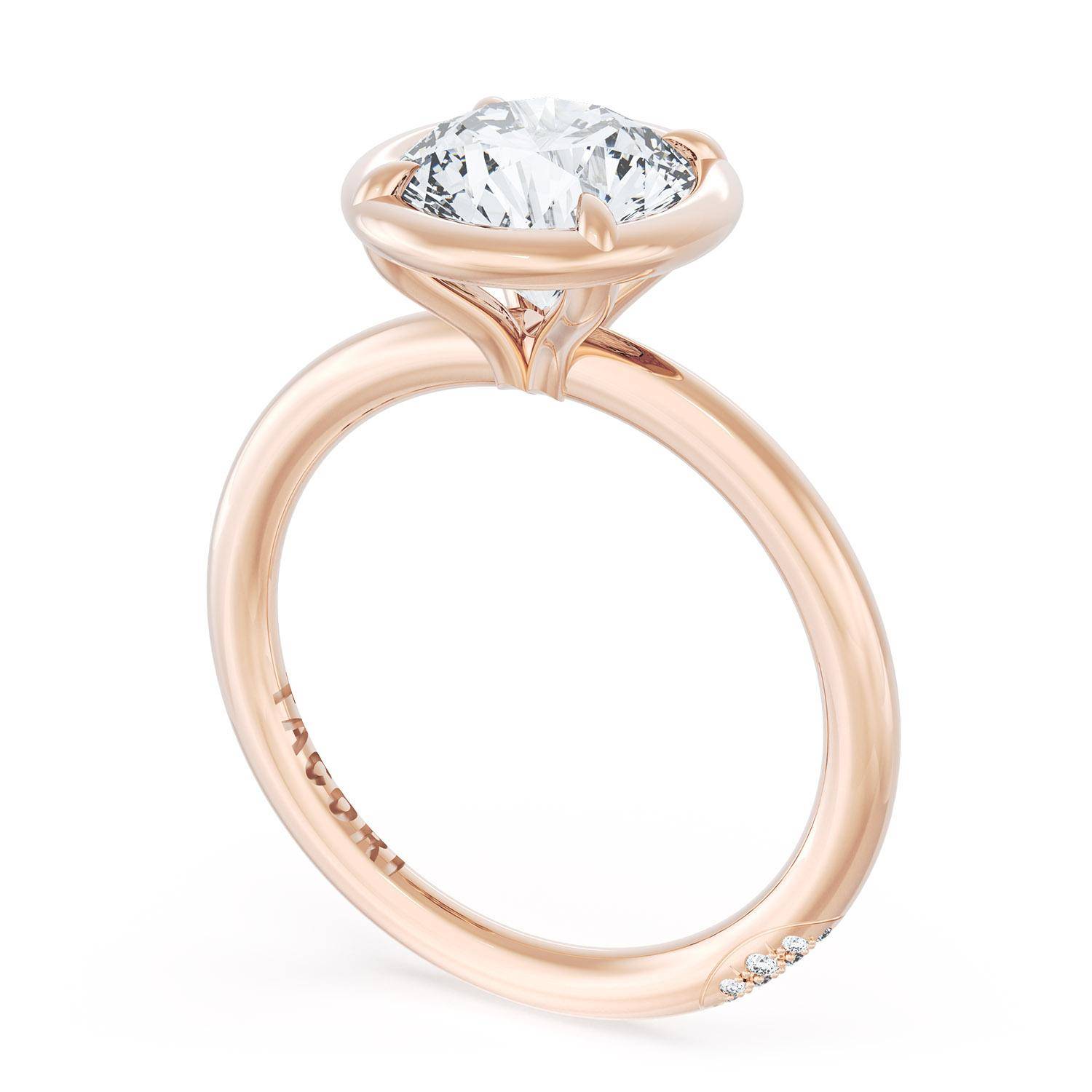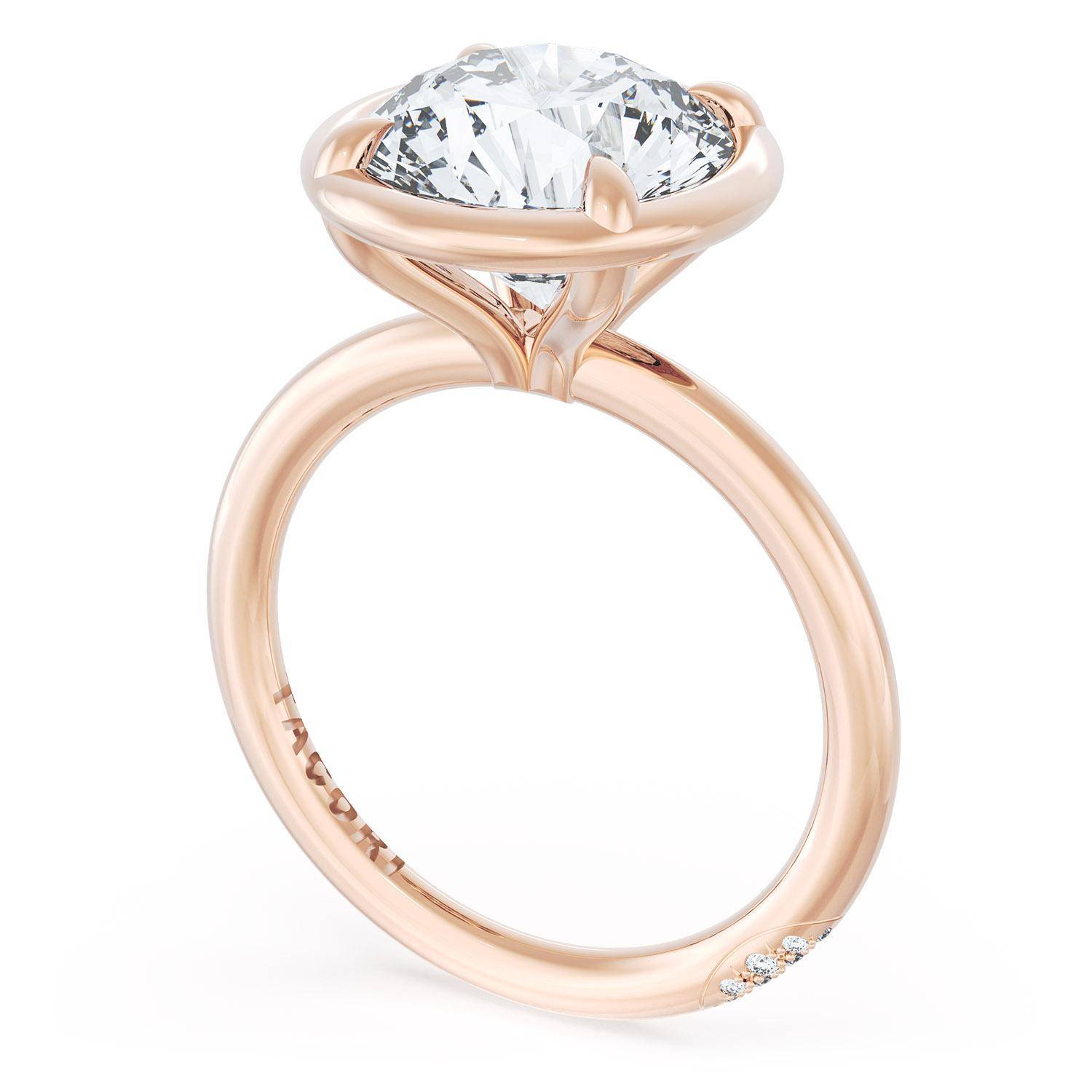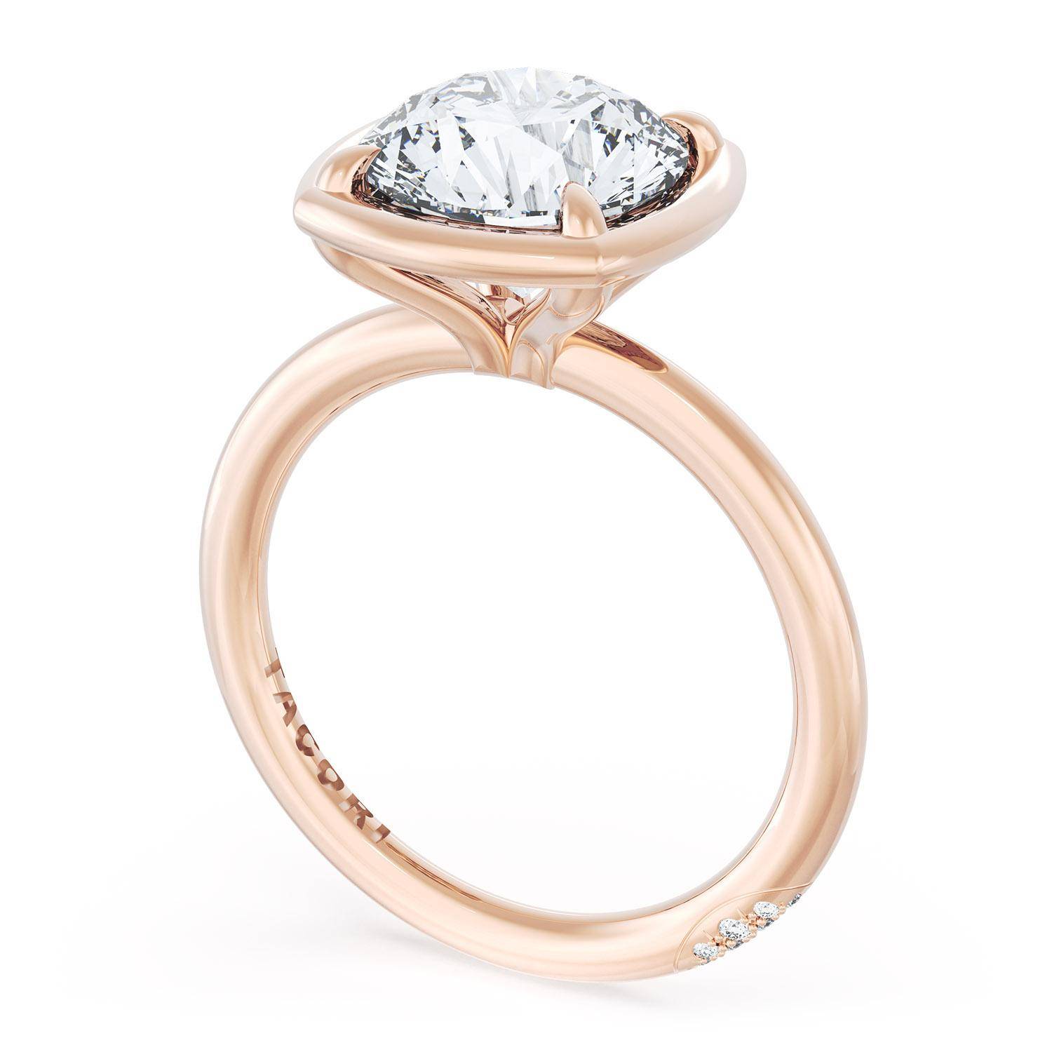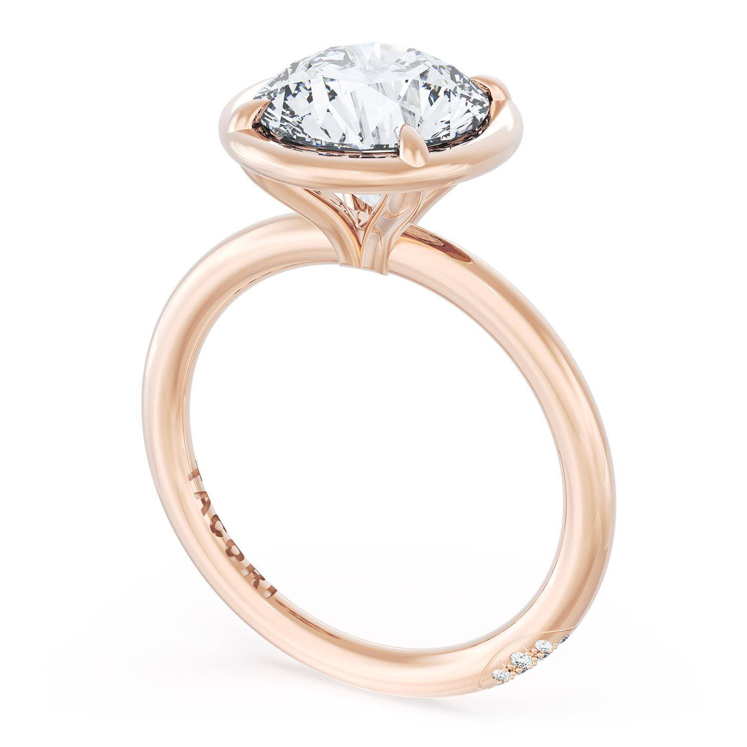 A Round solitaire is elevated by a modern bloom of round brilliant diamonds, and set into a high-polish 18kt Rose Gold foundation. TACORI Crescents add hidden detail to the underside of the crown.