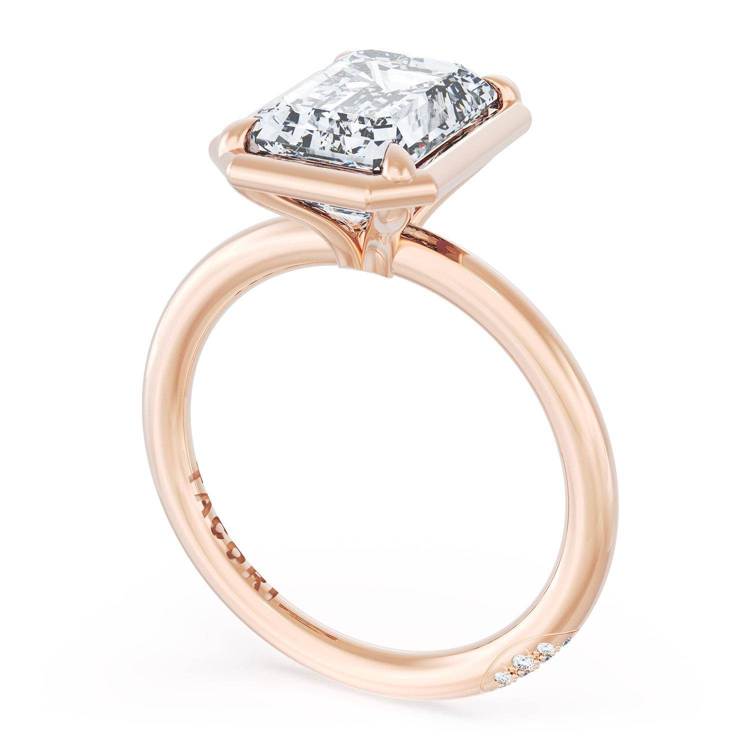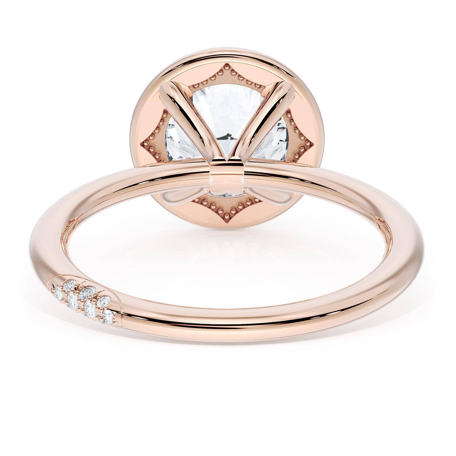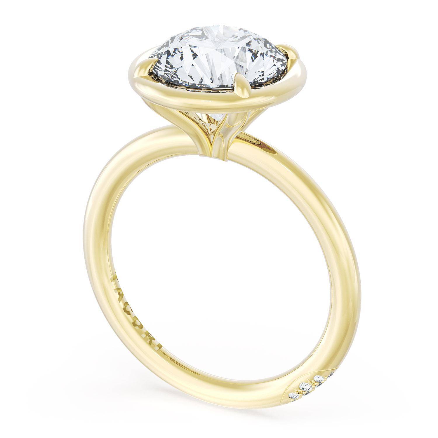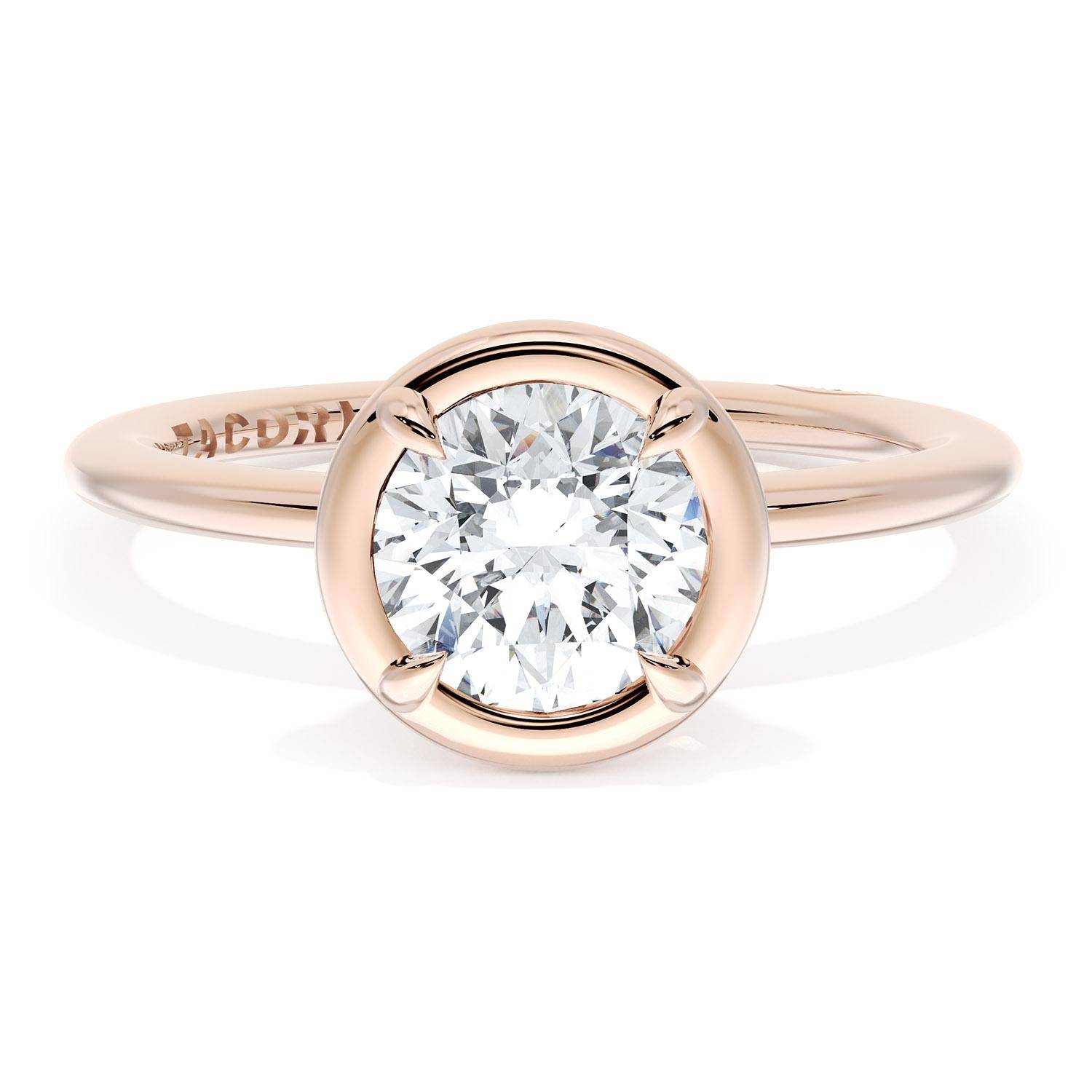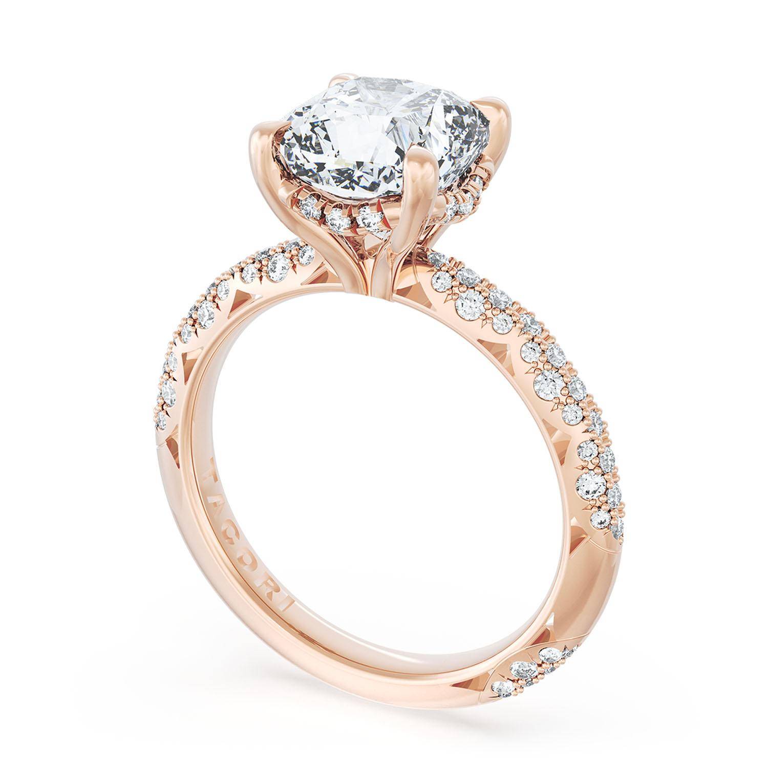 A Round solitaire is elevated by a modern bloom of round brilliant diamonds, and set into a high-polish 18kt Rose Gold foundation. TACORI Crescents add hidden detail to the underside of the crown.