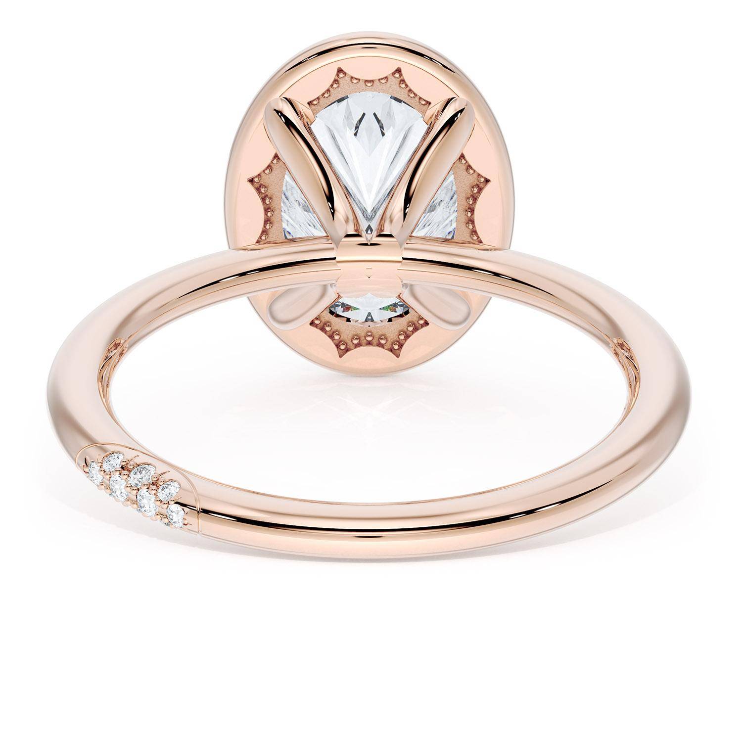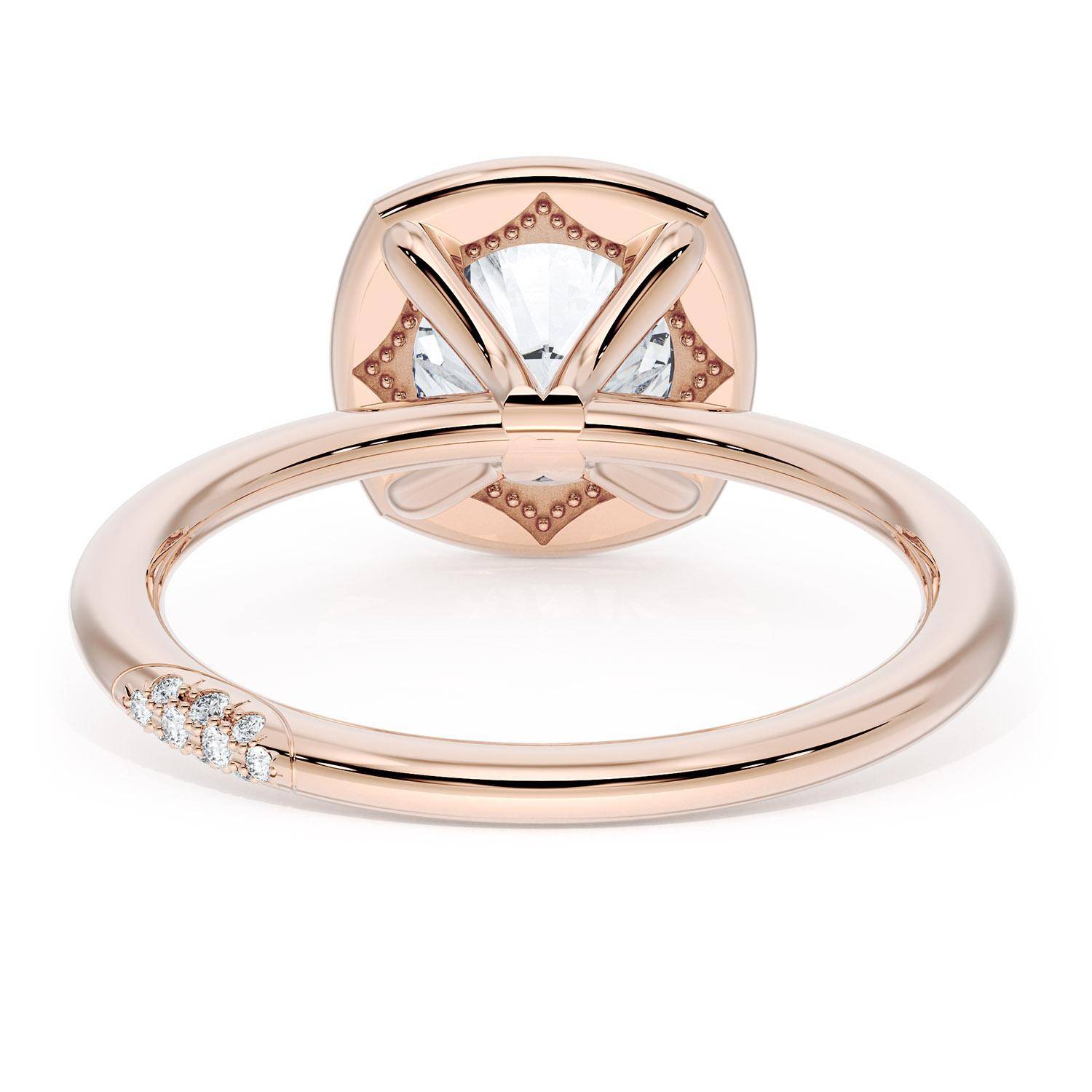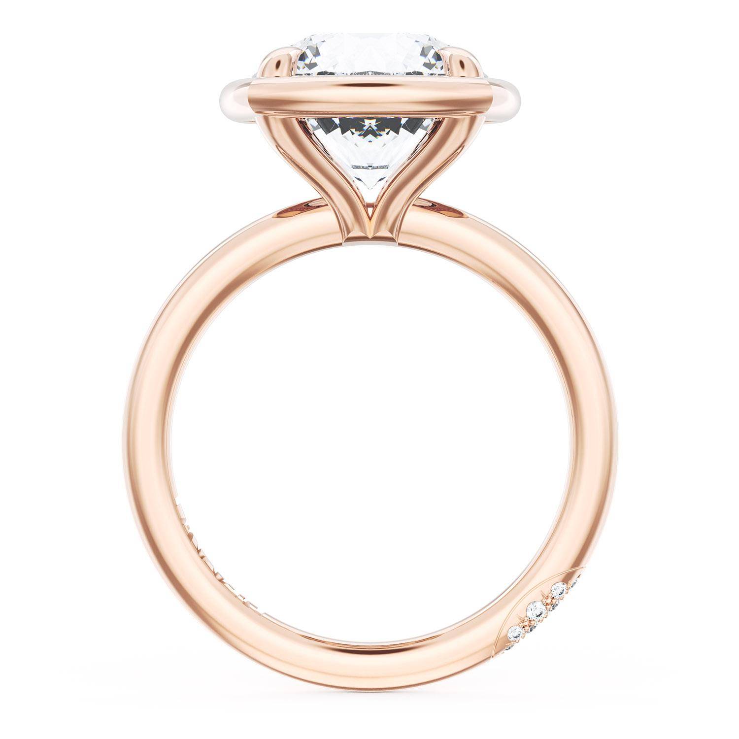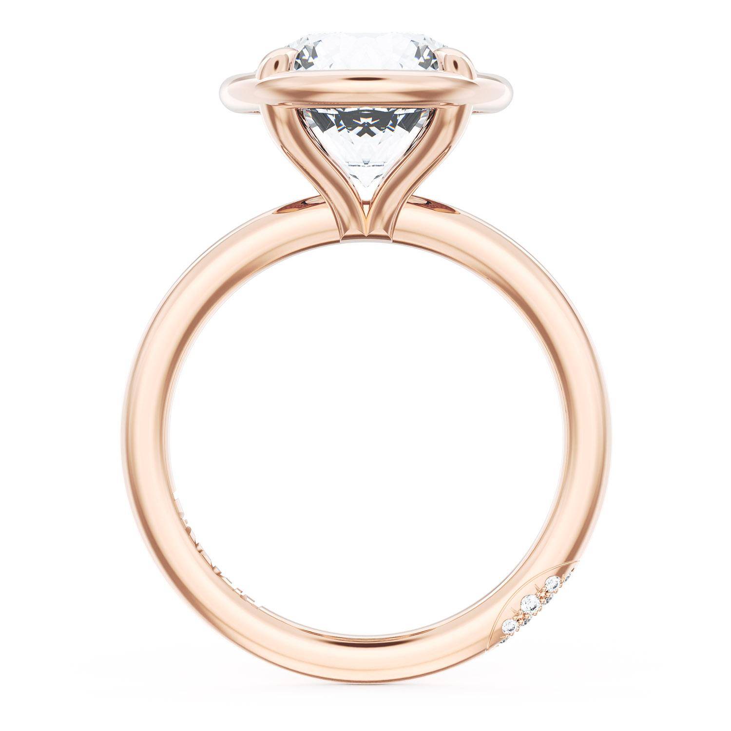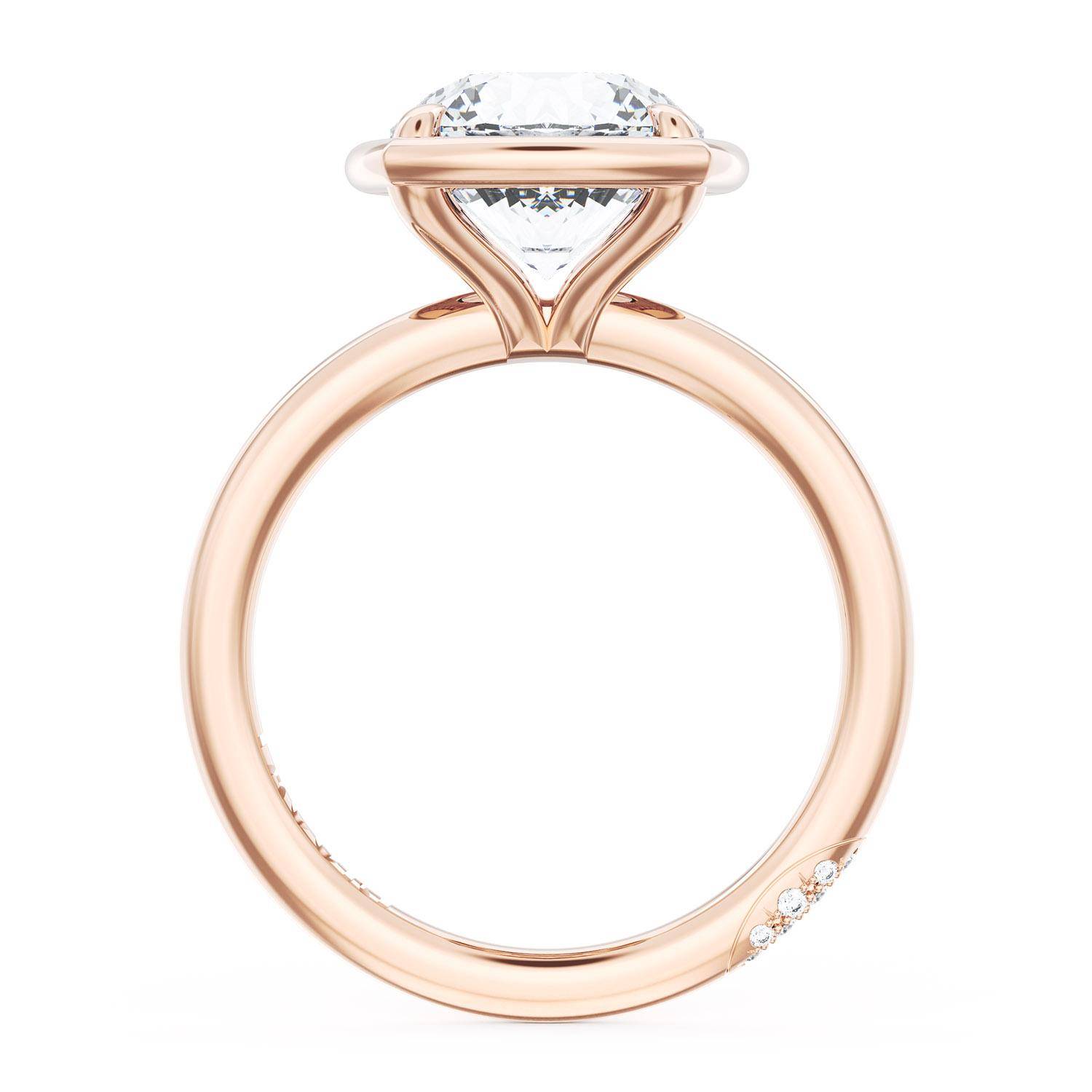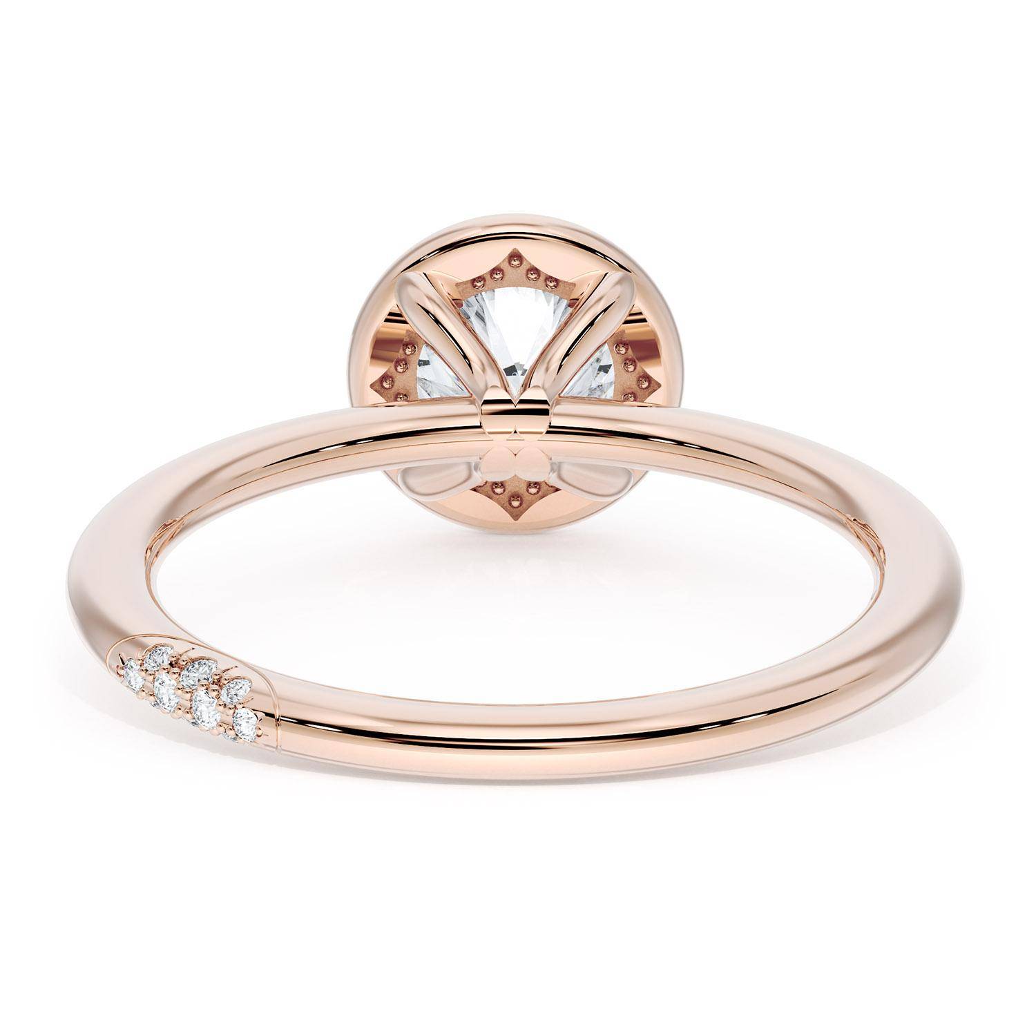 A Round solitaire is elevated by a modern bloom of round brilliant diamonds, and set into a high-polish 18kt Rose Gold foundation. TACORI Crescents add hidden detail to the underside of the crown.