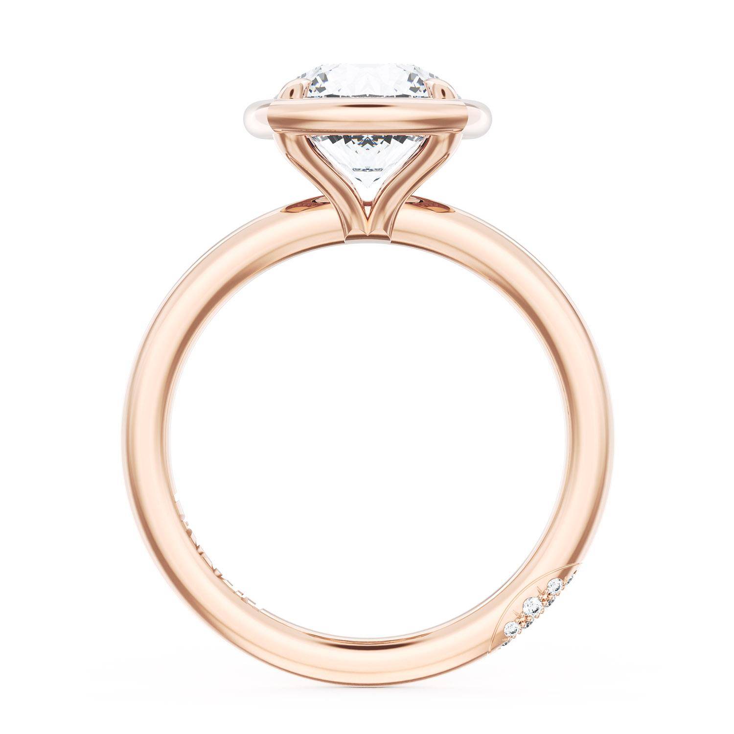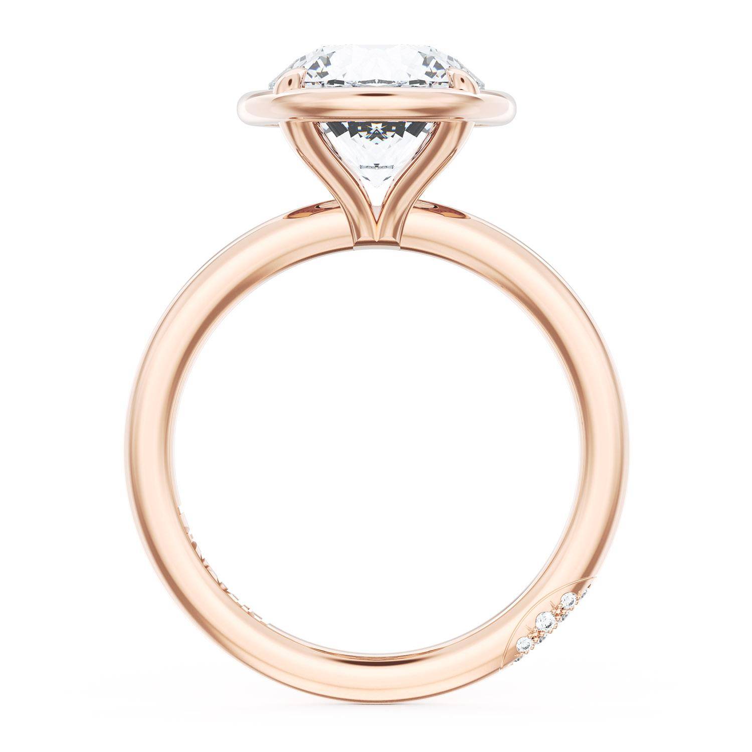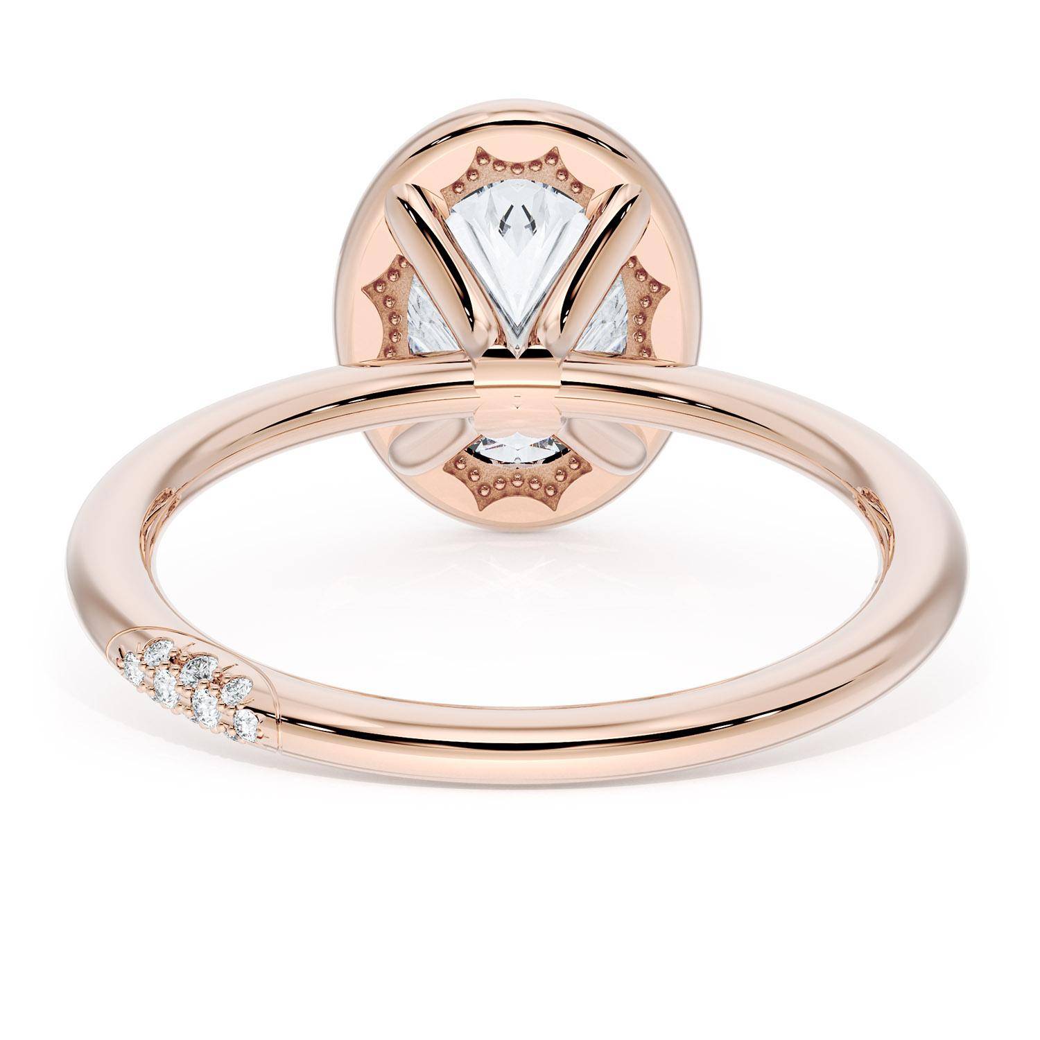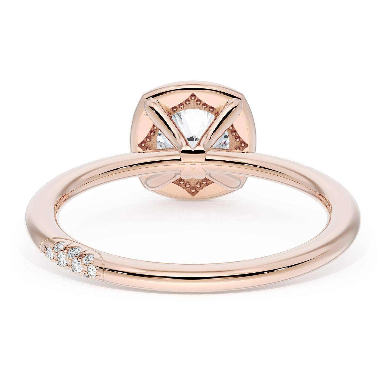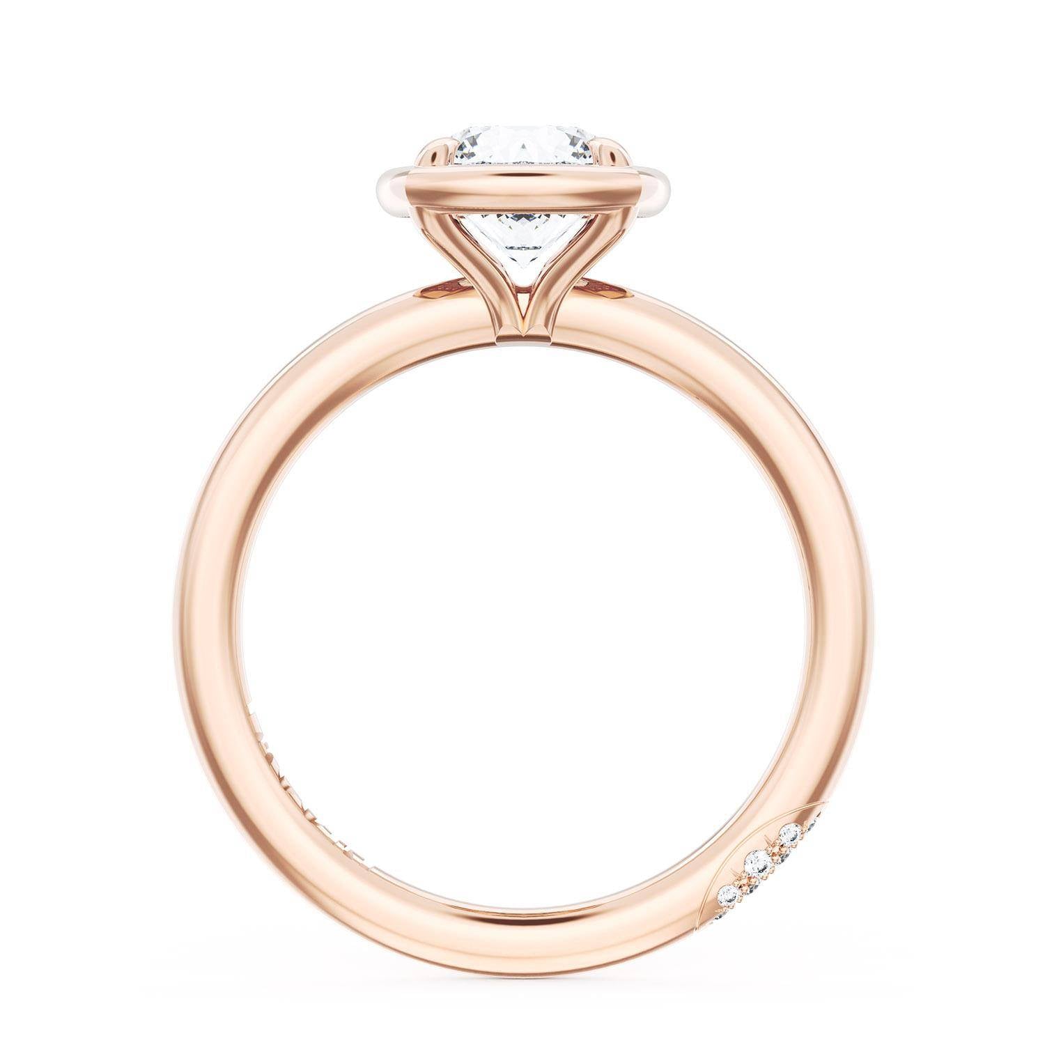 A Round solitaire is elevated by a modern bloom of round brilliant diamonds, and set into a high-polish 18kt Rose Gold foundation. TACORI Crescents add hidden detail to the underside of the crown.
