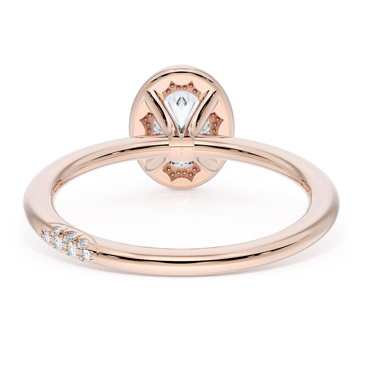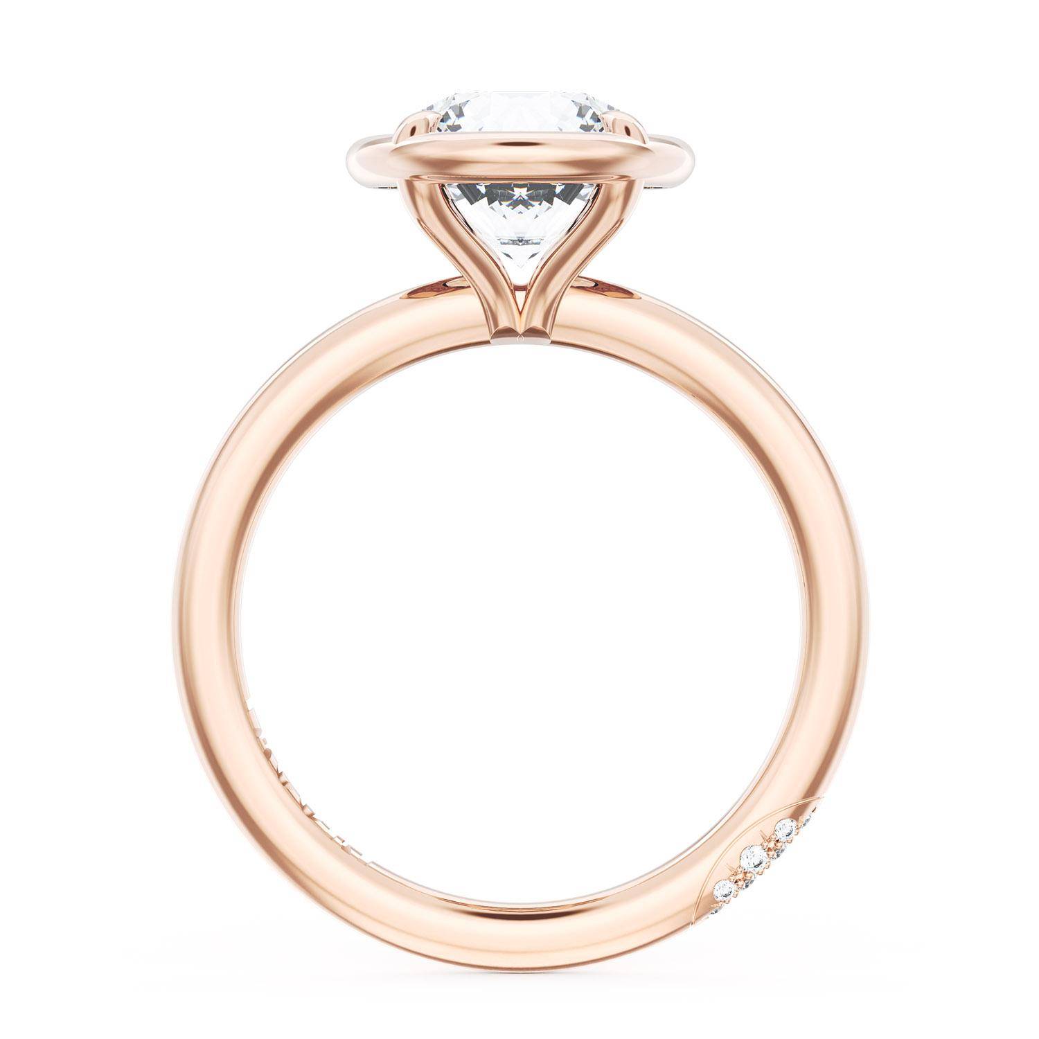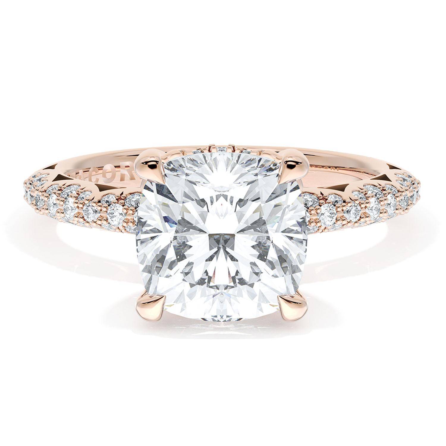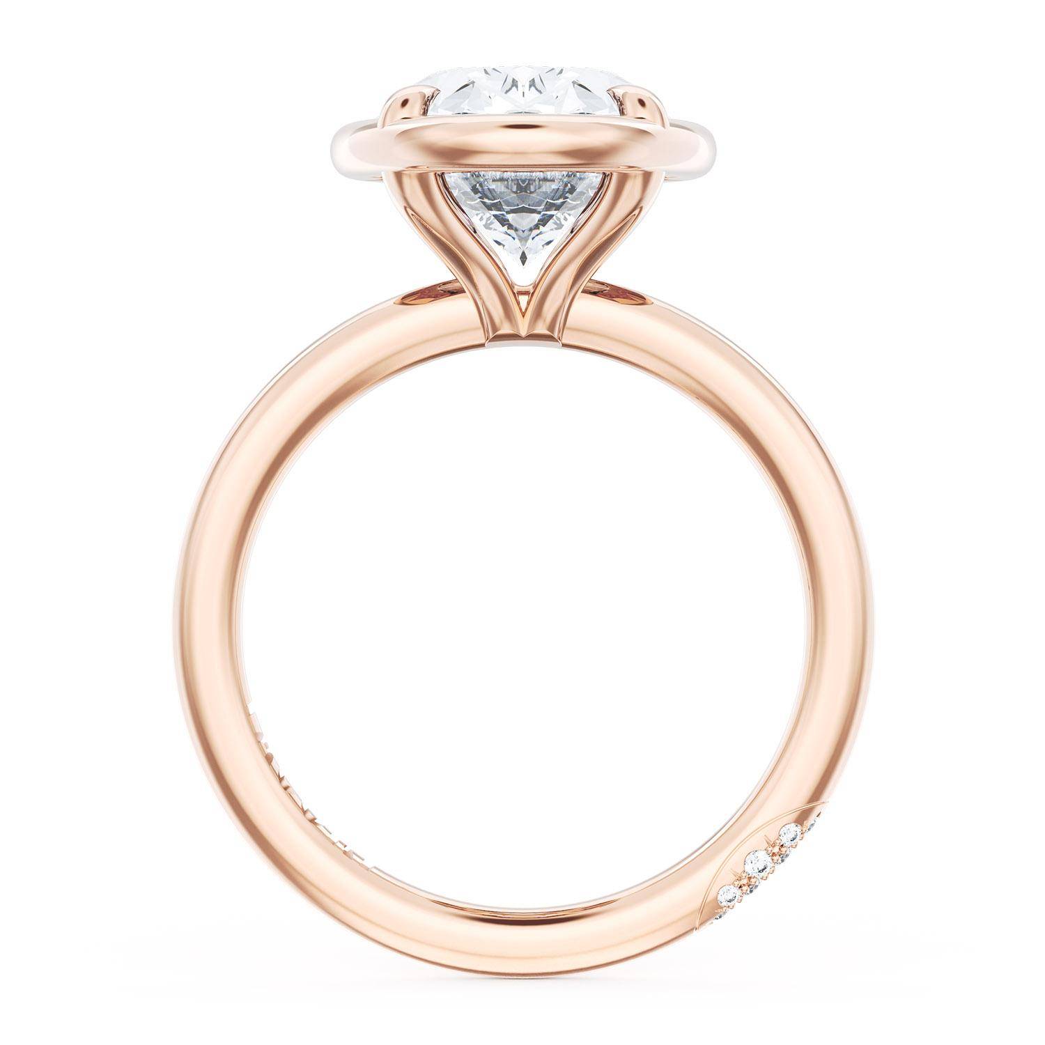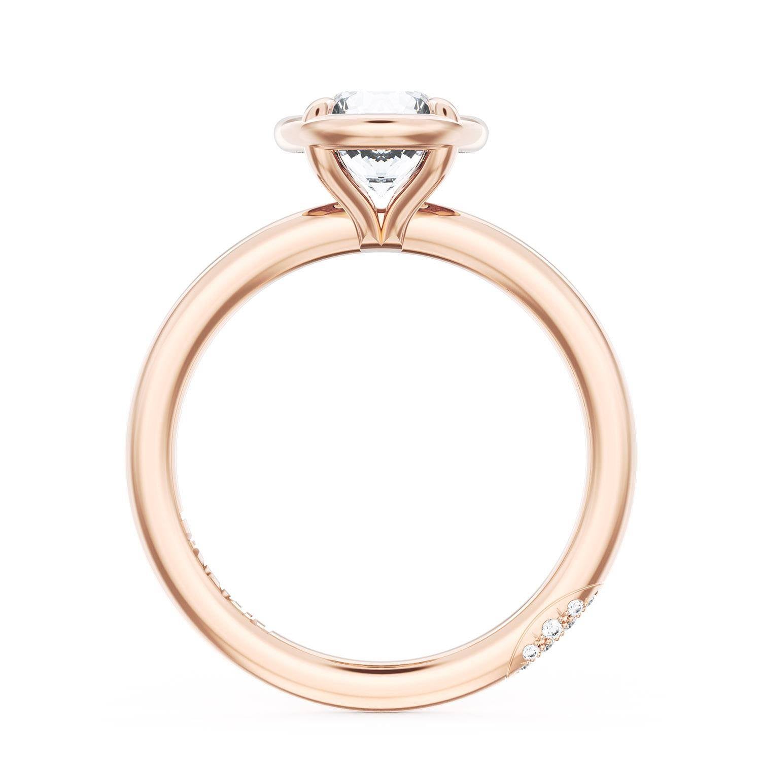 A Round solitaire is elevated by a modern bloom of round brilliant diamonds, and set into a high-polish 18kt Rose Gold foundation. TACORI Crescents add hidden detail to the underside of the crown.