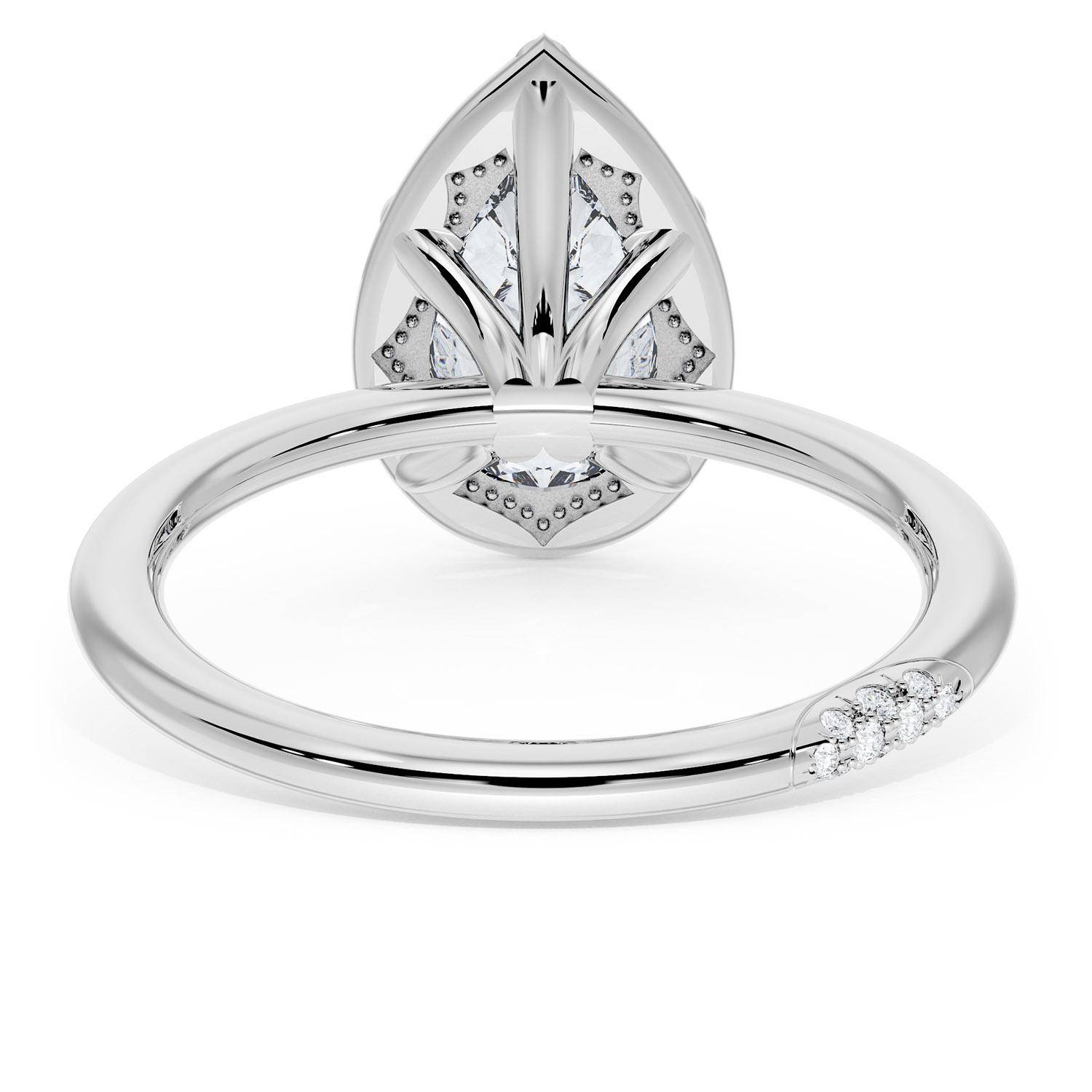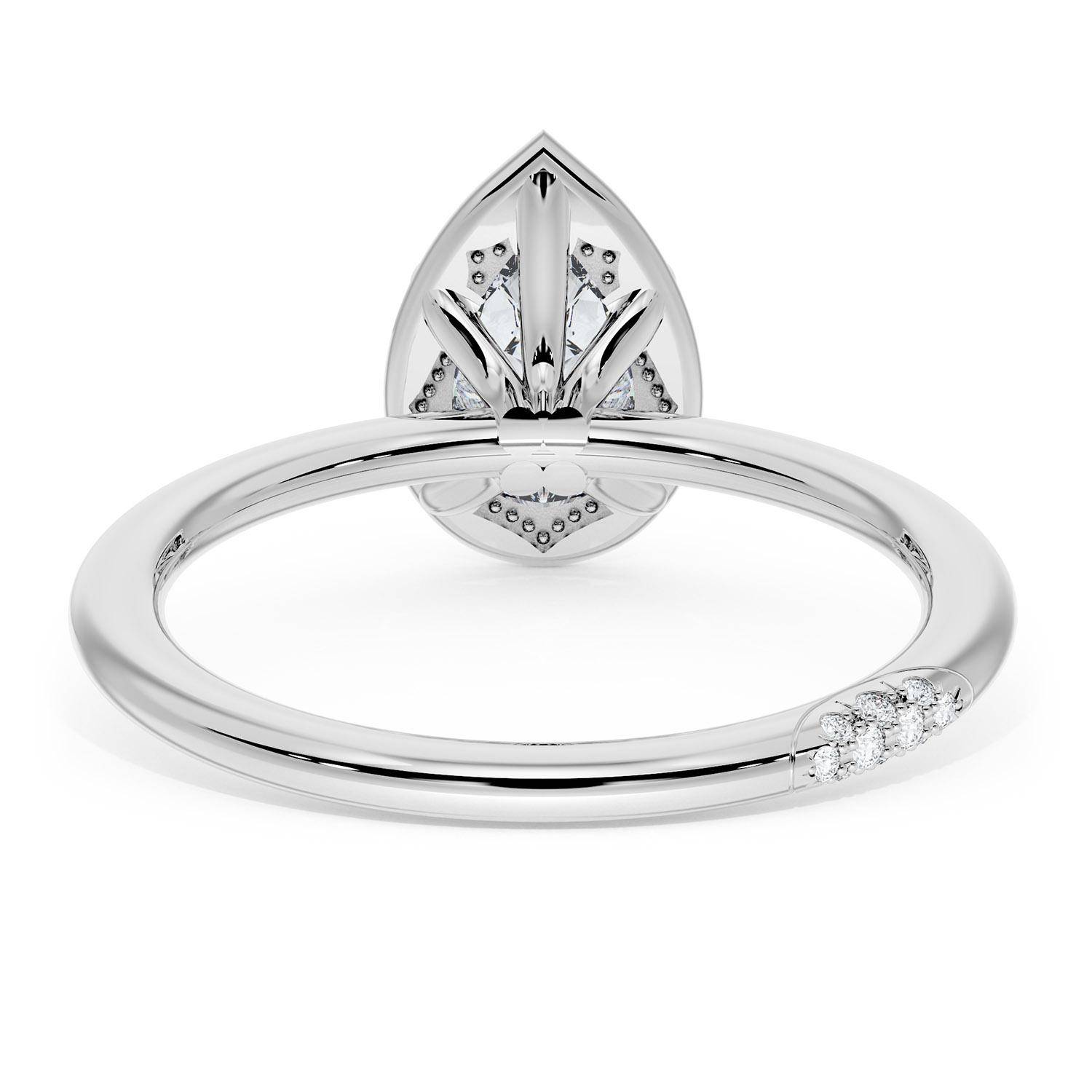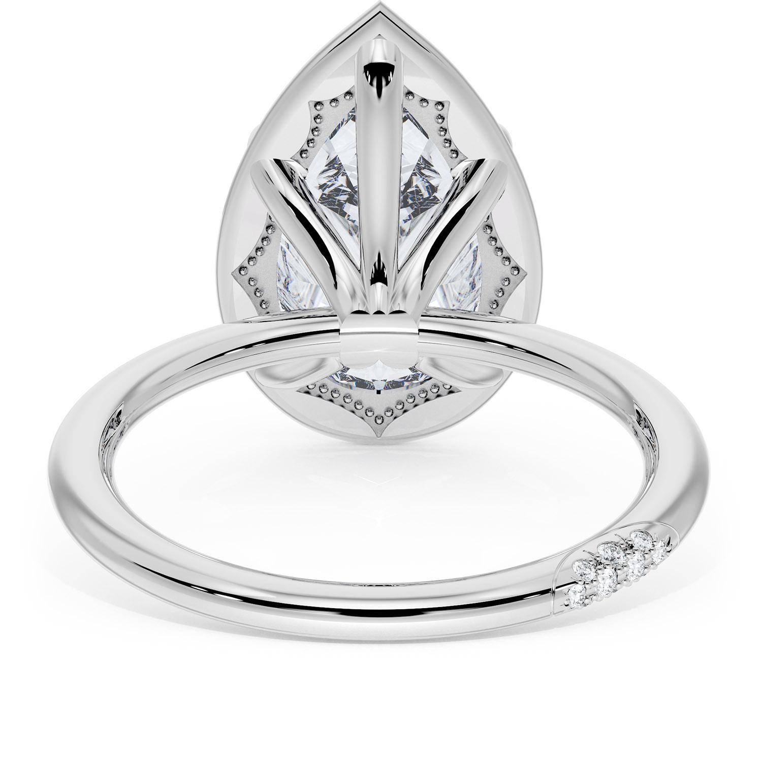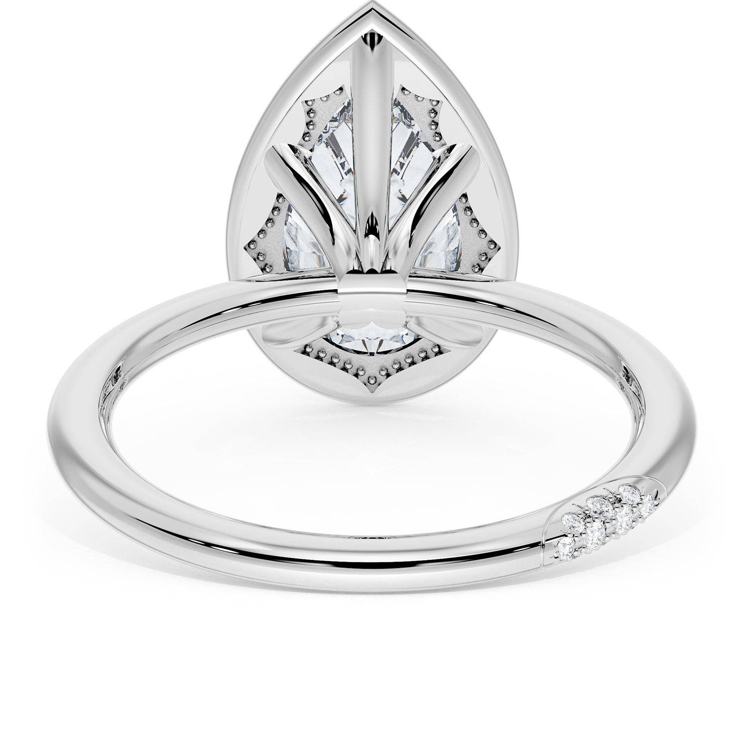 A Pear Solitaire is set into a unique corset-inspired crown on a 18kt White Gold foundation. Pavé-set diamonds decorate the ceiling and a diamond-studded Founder's Crescent marks the resting point.