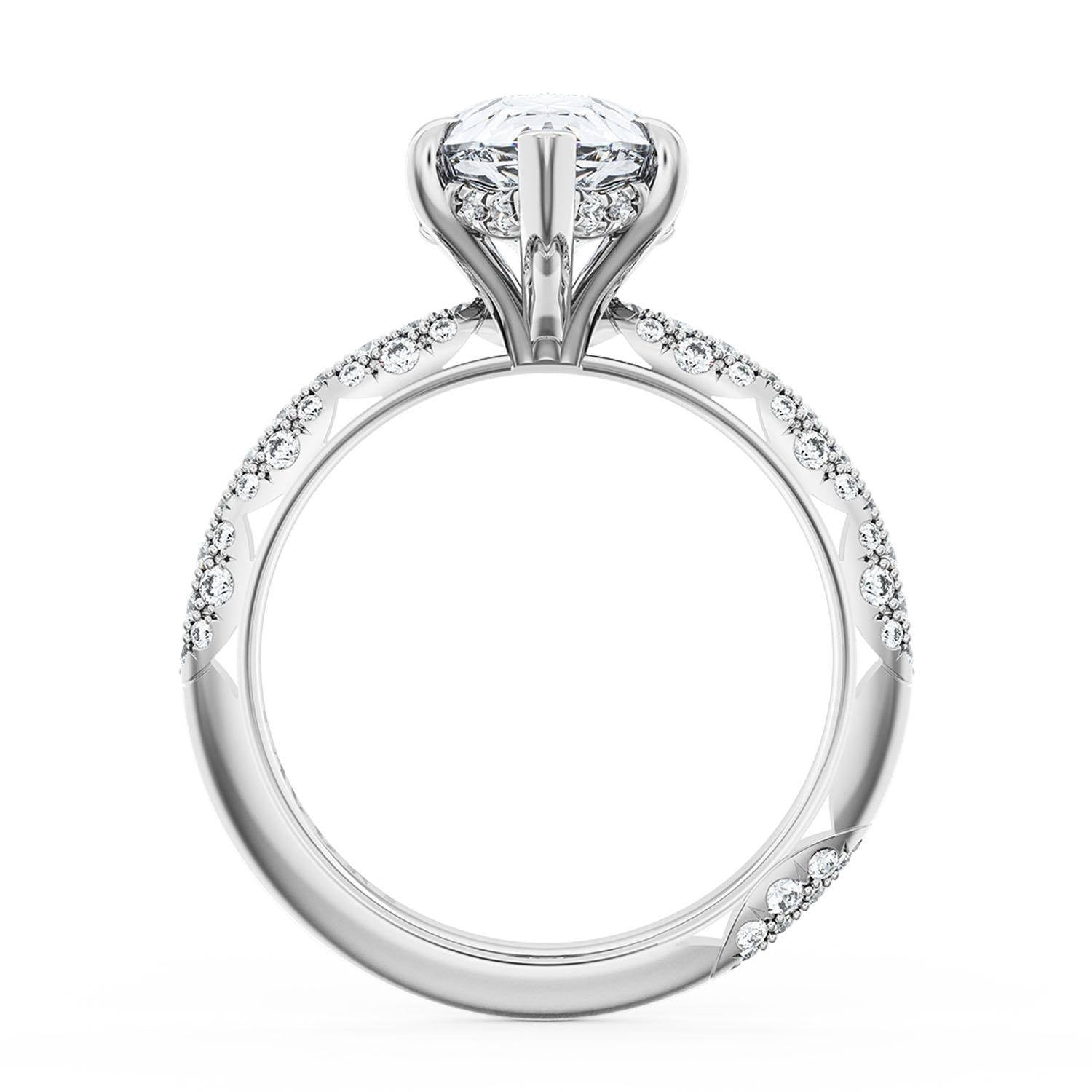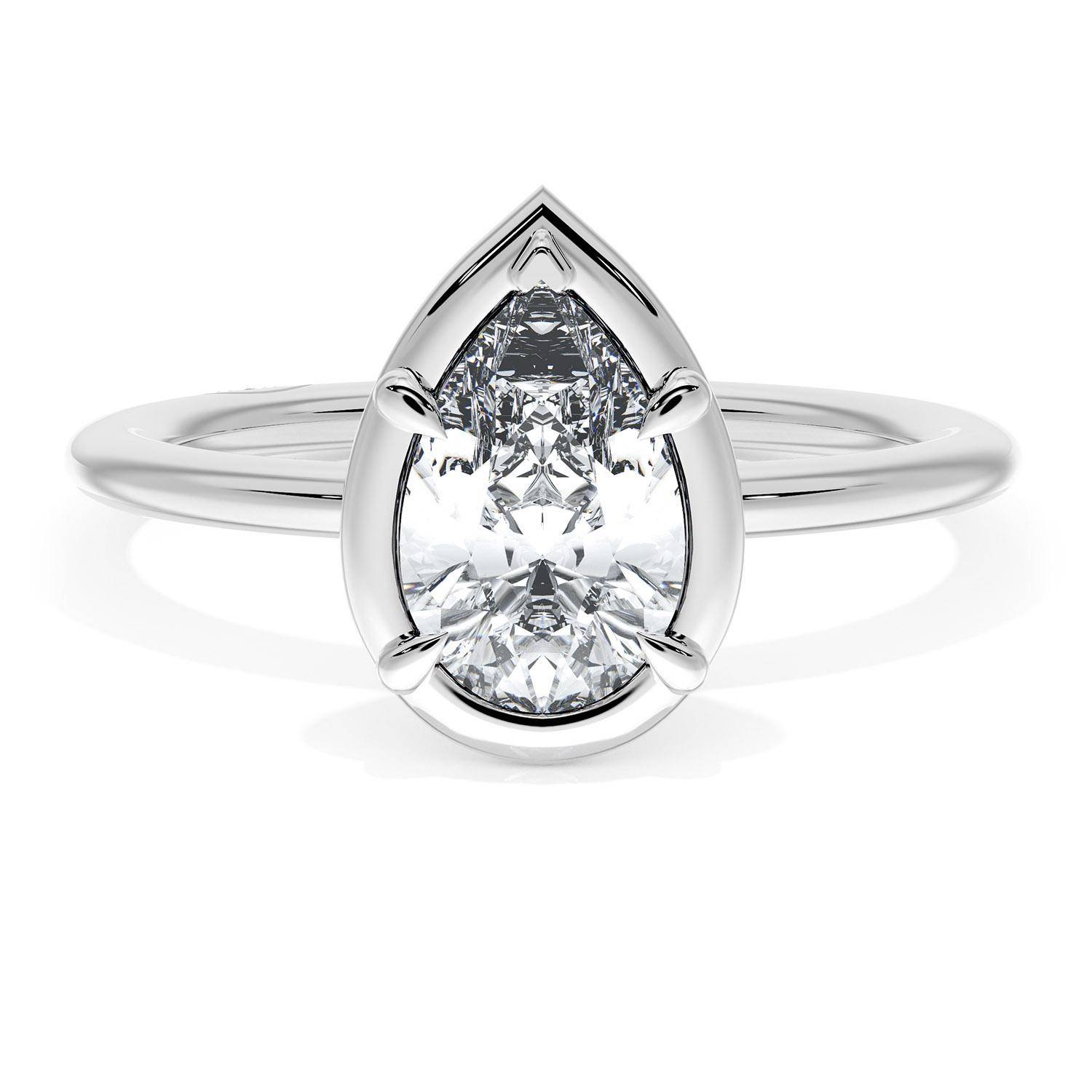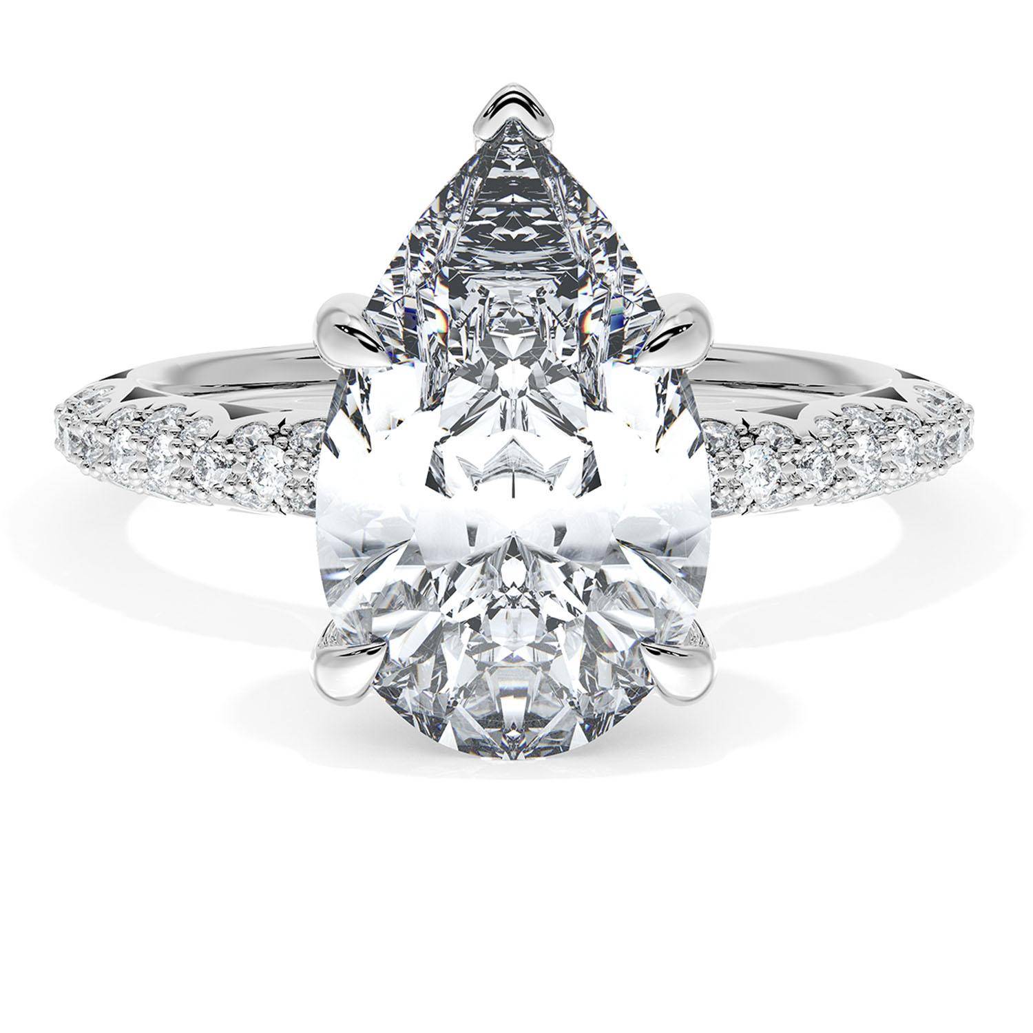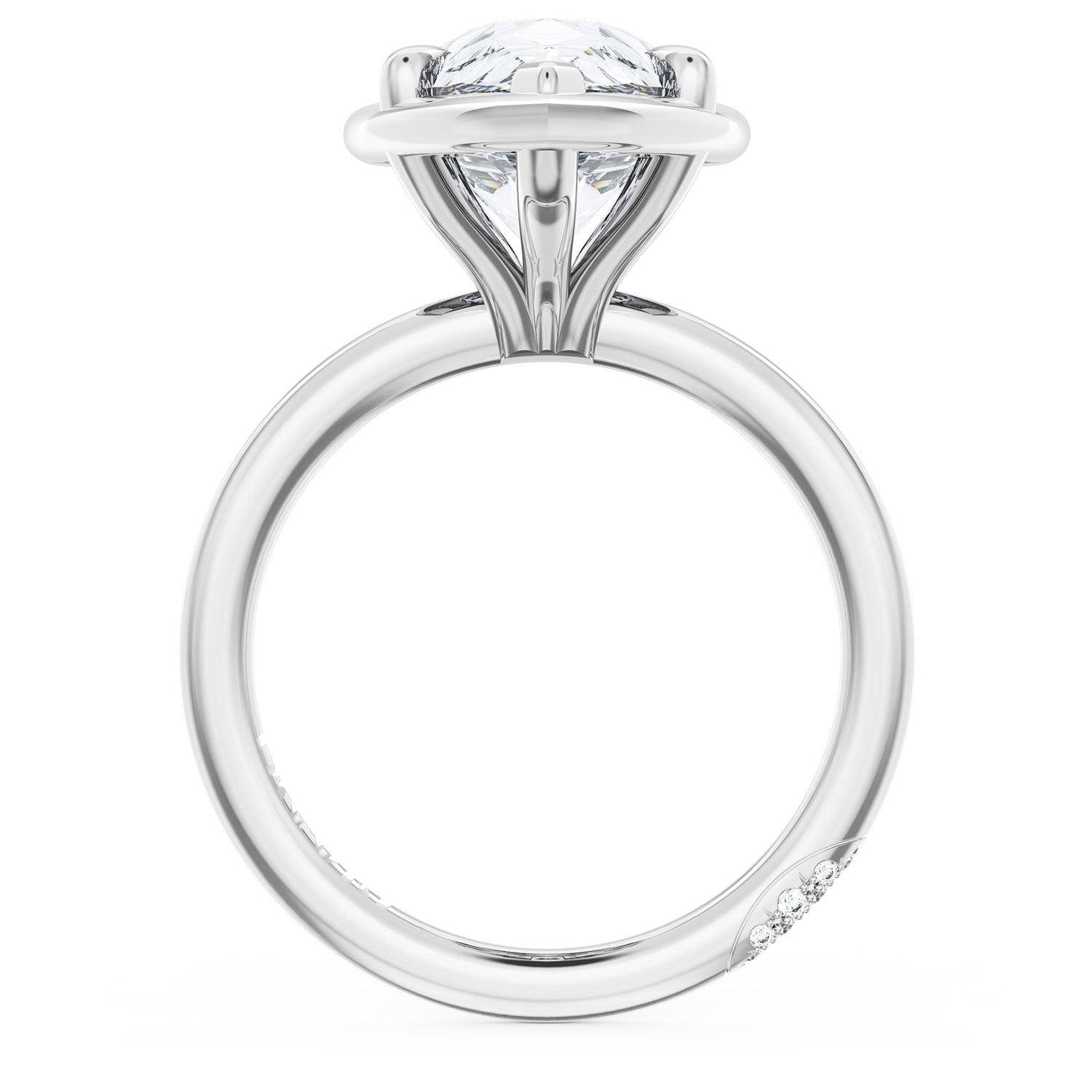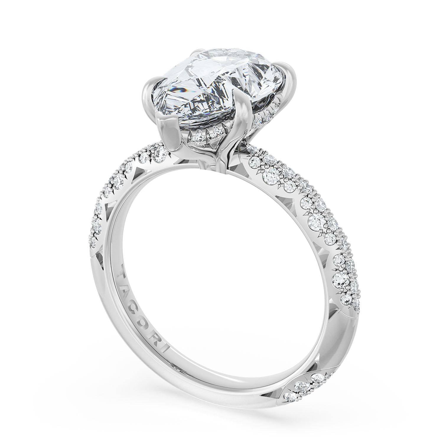 A Pear Solitaire is set into a unique corset-inspired crown on a 18kt White Gold foundation. Pavé-set diamonds decorate the ceiling and a diamond-studded Founder's Crescent marks the resting point.