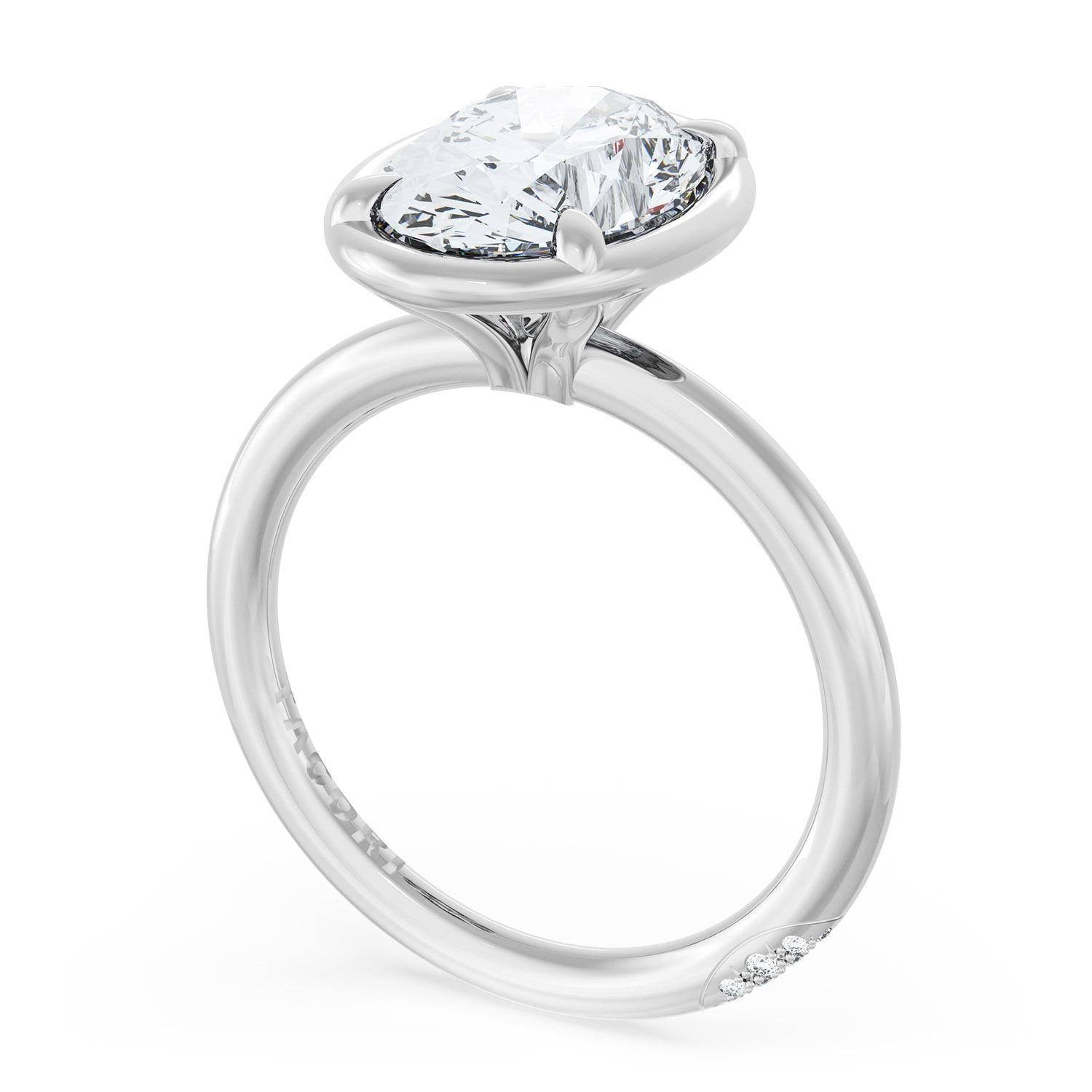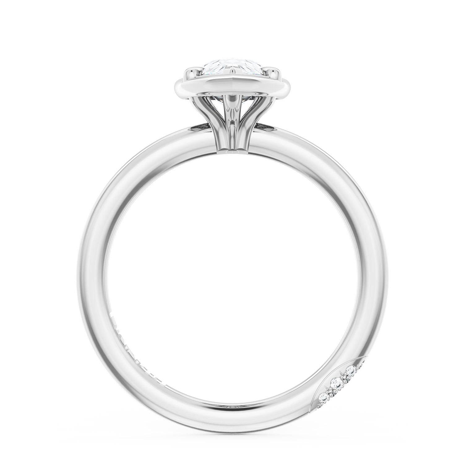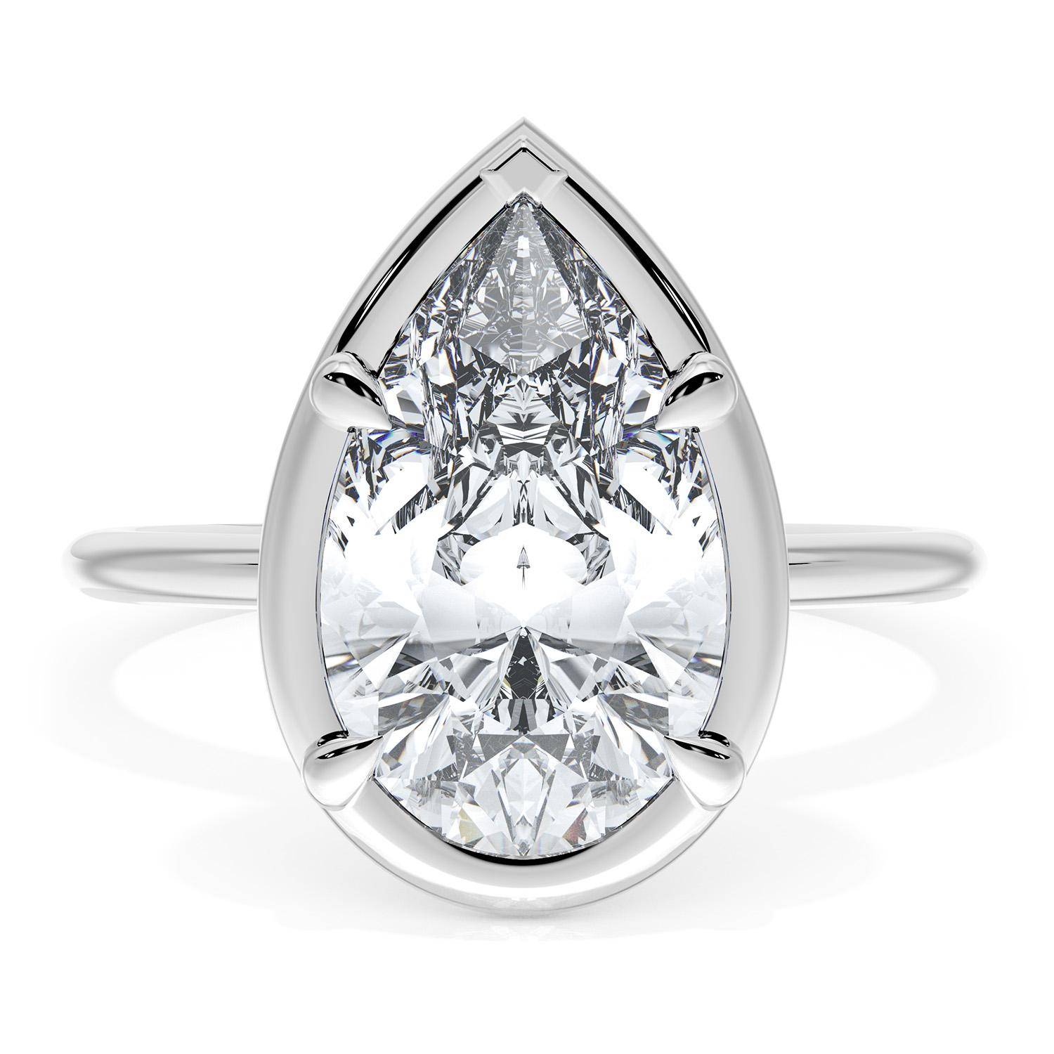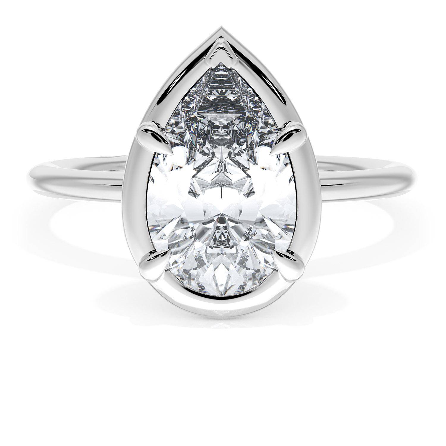 A Pear Solitaire is set into a unique corset-inspired crown on a 18kt White Gold foundation. Pavé-set diamonds decorate the ceiling and a diamond-studded Founder's Crescent marks the resting point.
