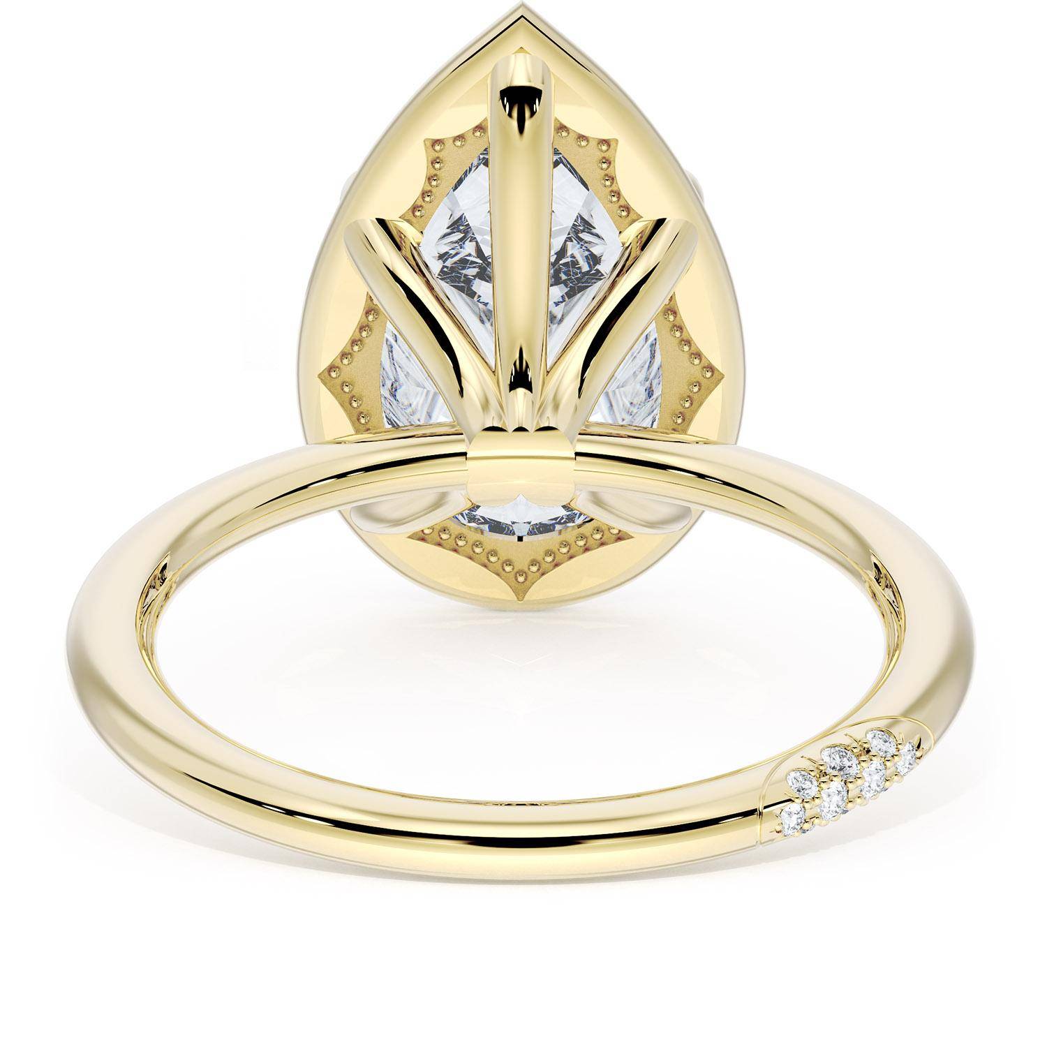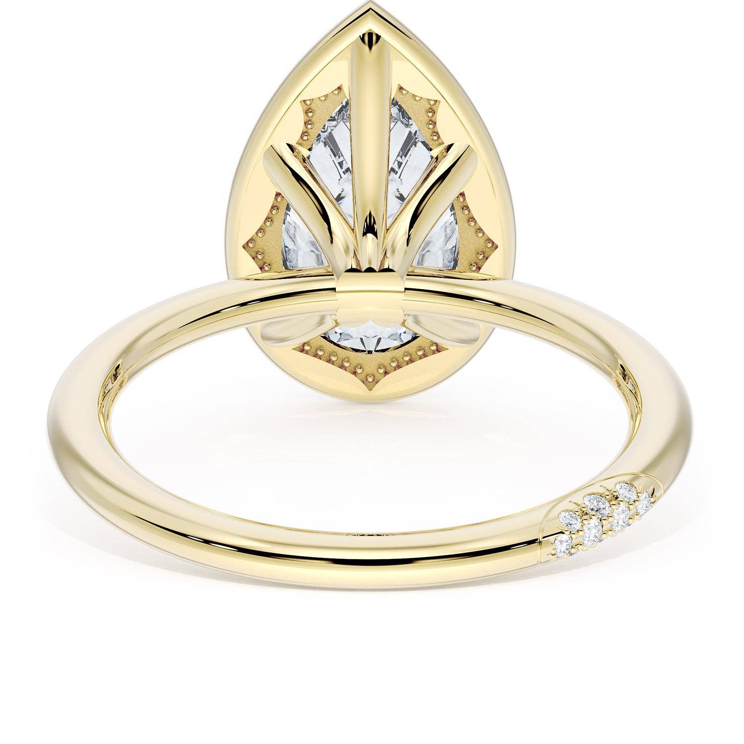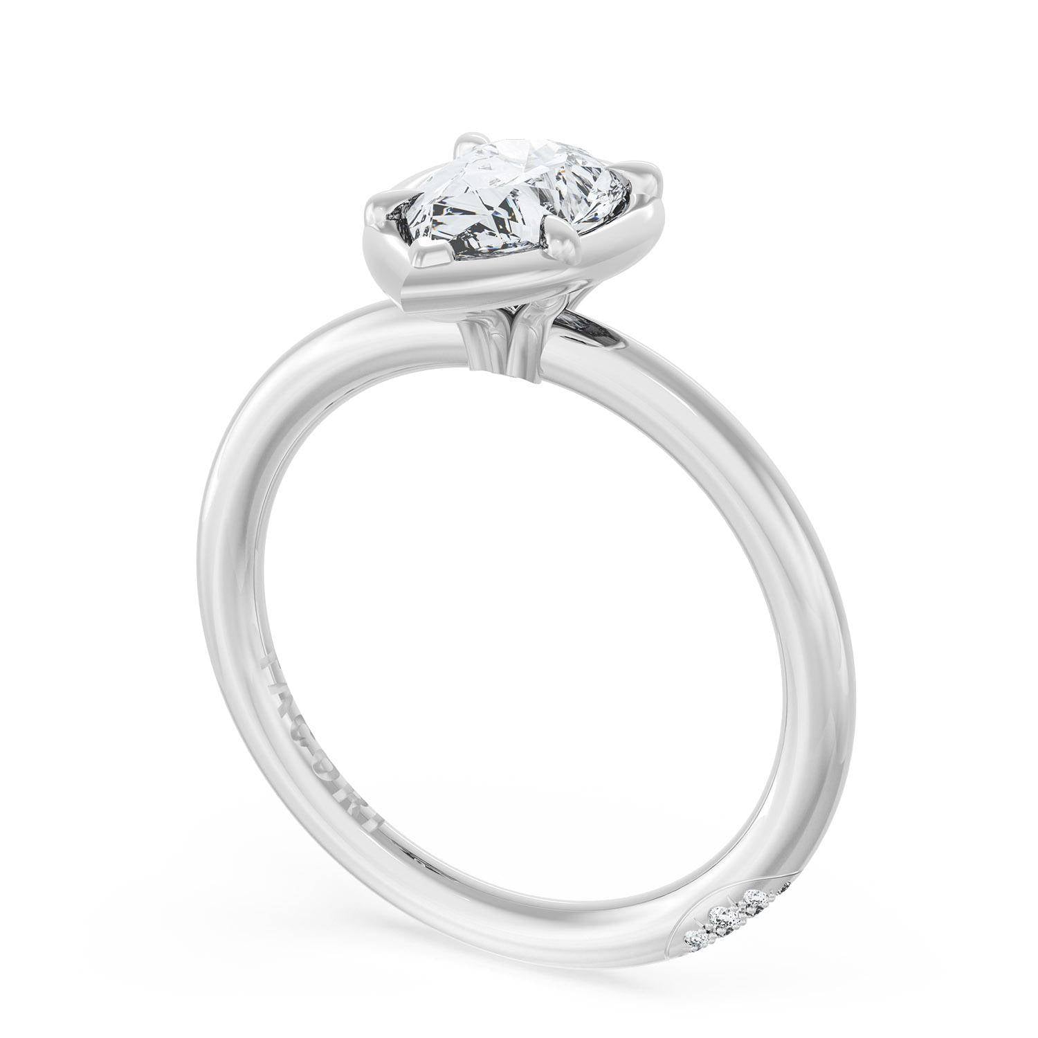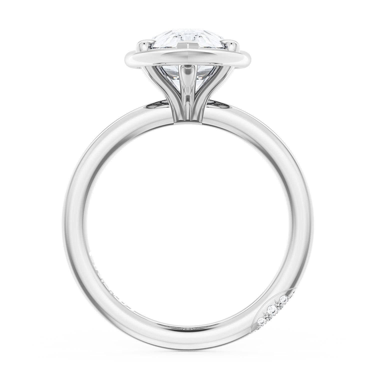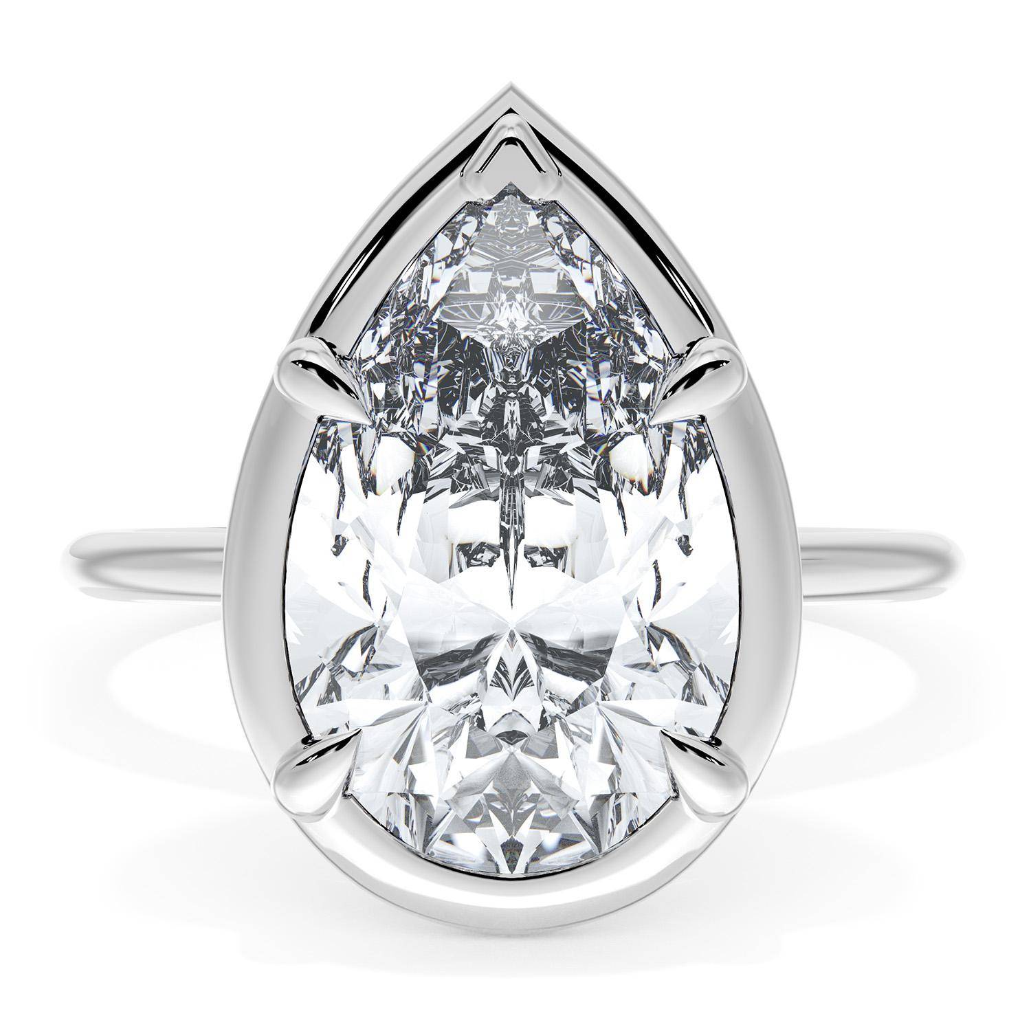 A Pear Solitaire is set into a unique corset-inspired crown on a 18kt White Gold foundation. Pavé-set diamonds decorate the ceiling and a diamond-studded Founder's Crescent marks the resting point.