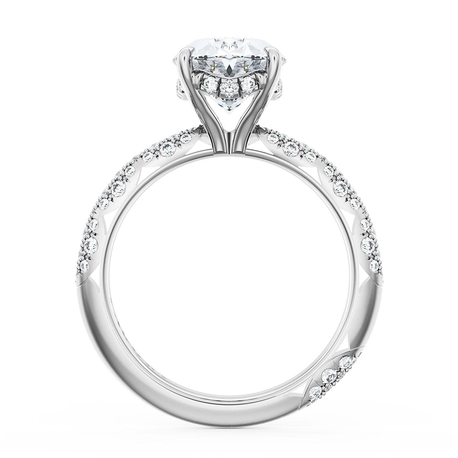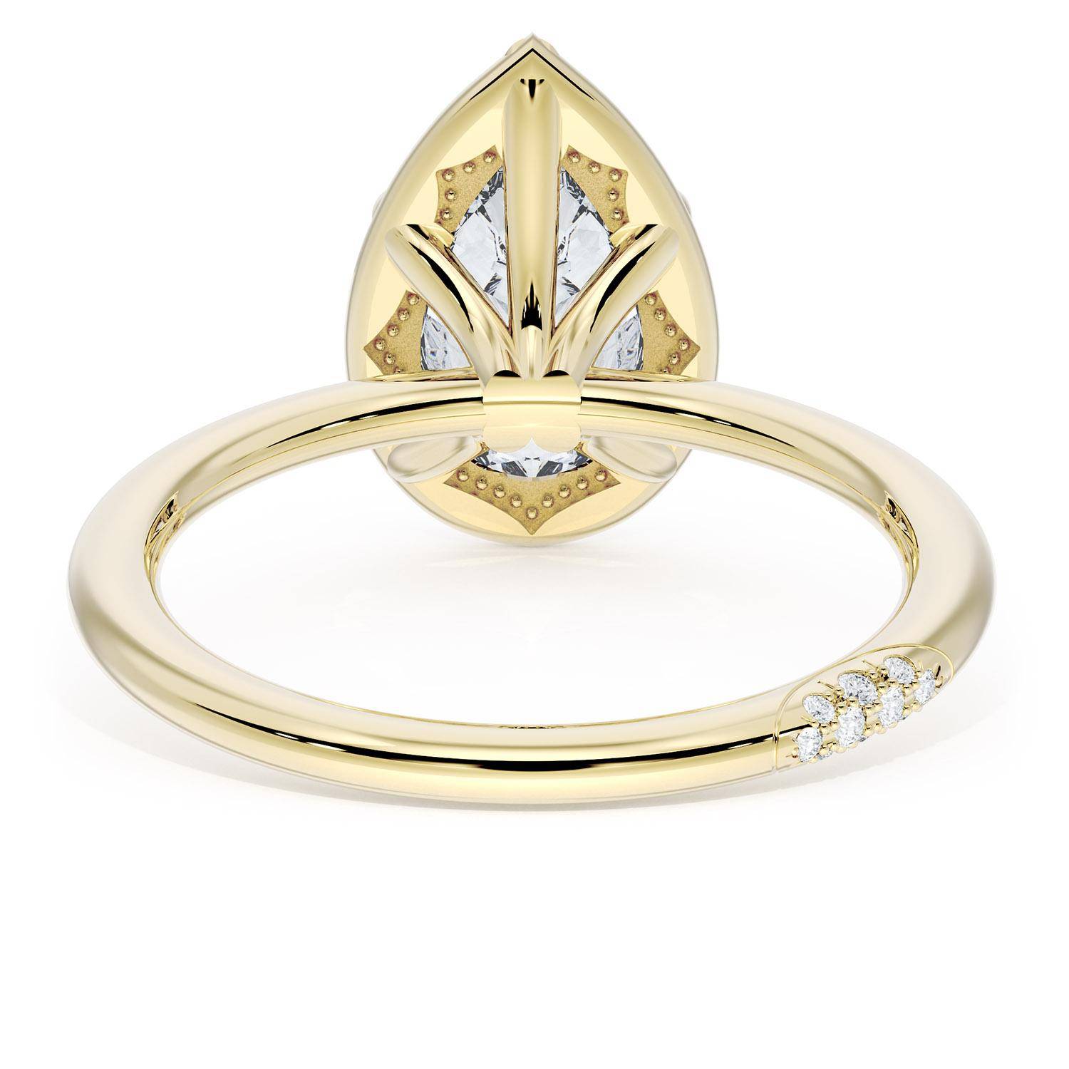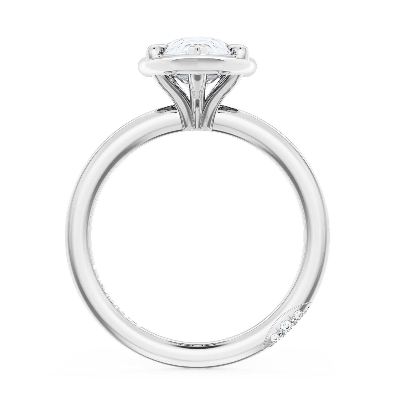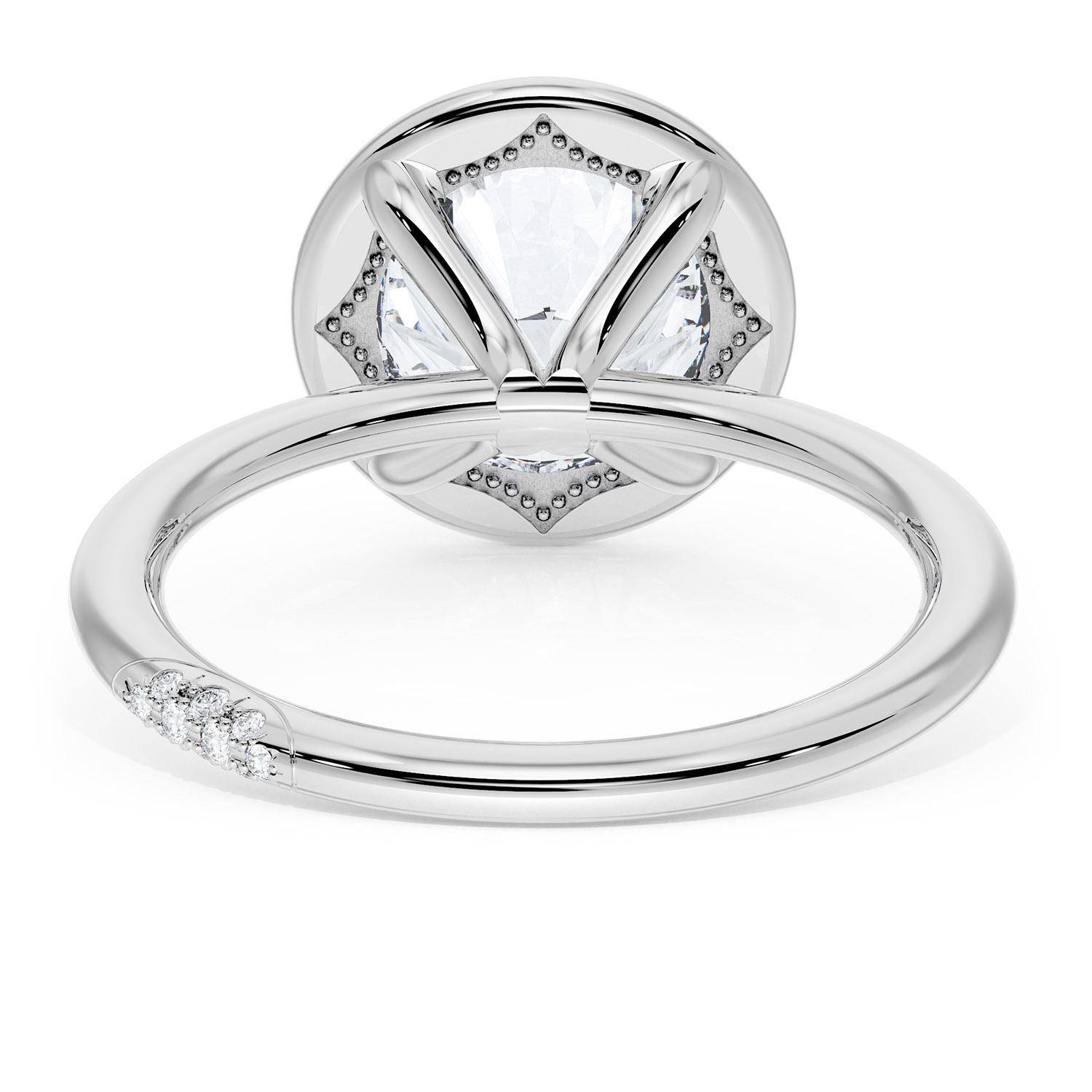 A Pear Solitaire is set into a unique corset-inspired crown on a 18kt White Gold foundation. Pavé-set diamonds decorate the ceiling and a diamond-studded Founder's Crescent marks the resting point.