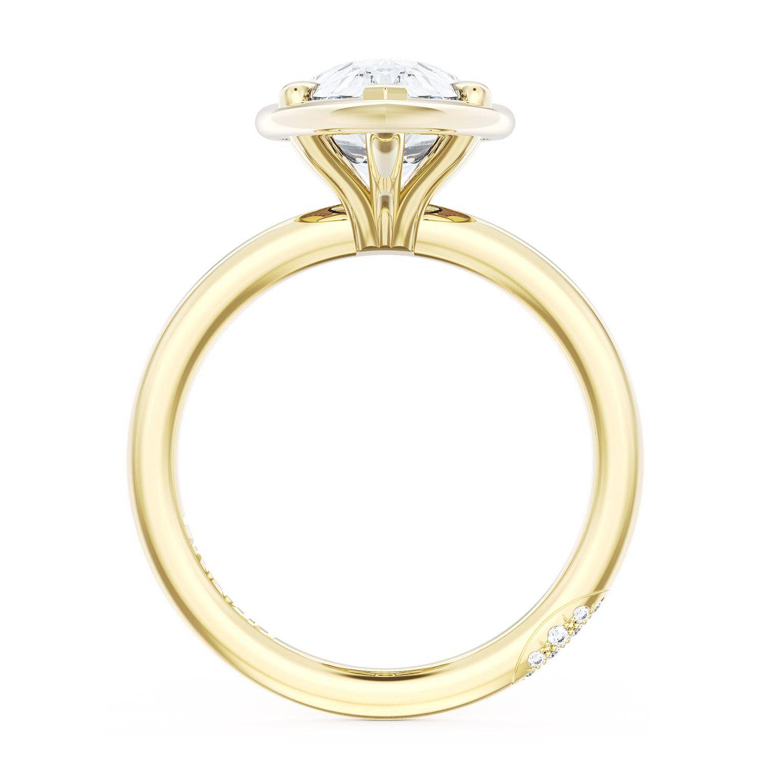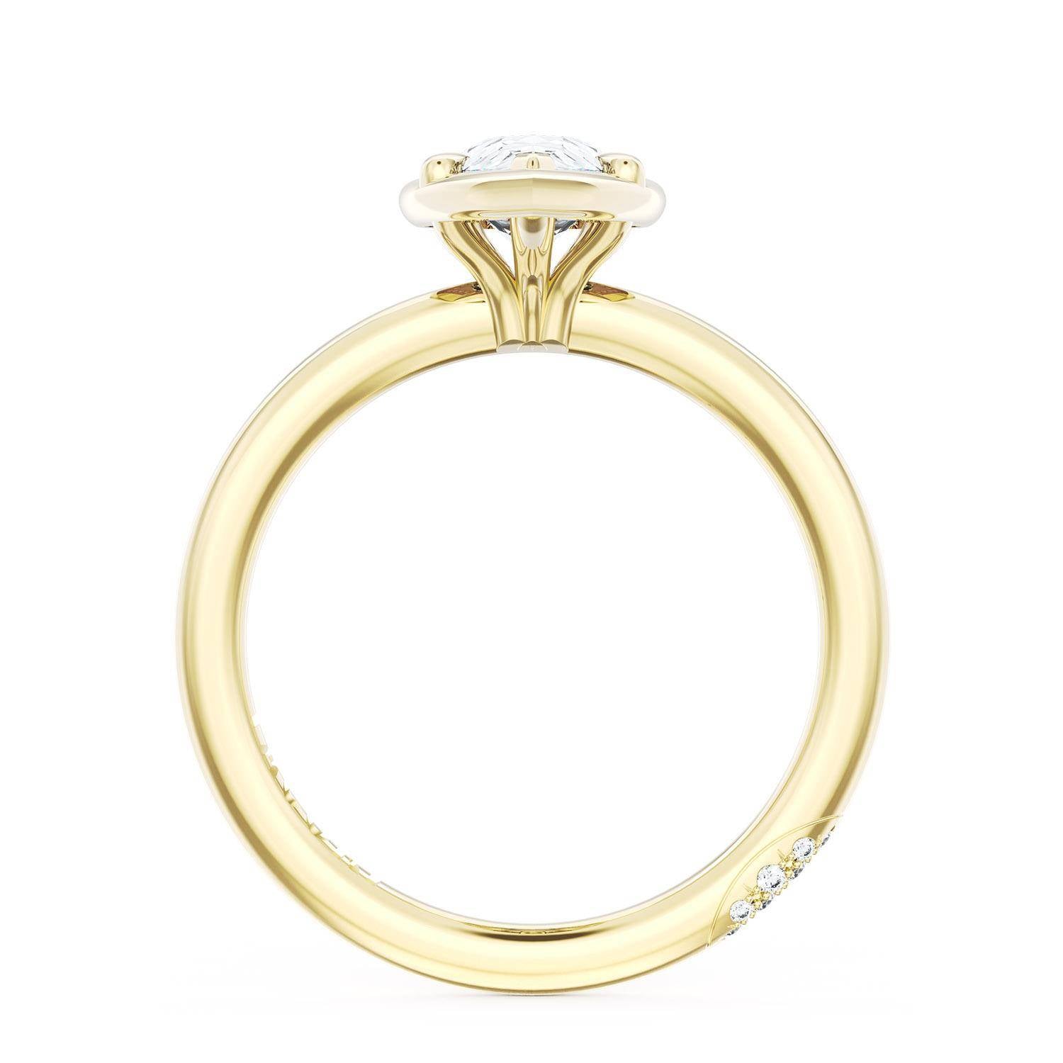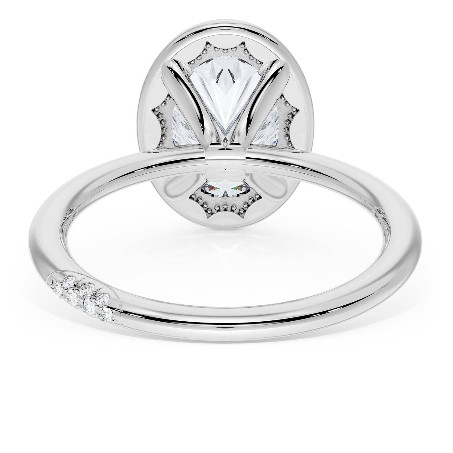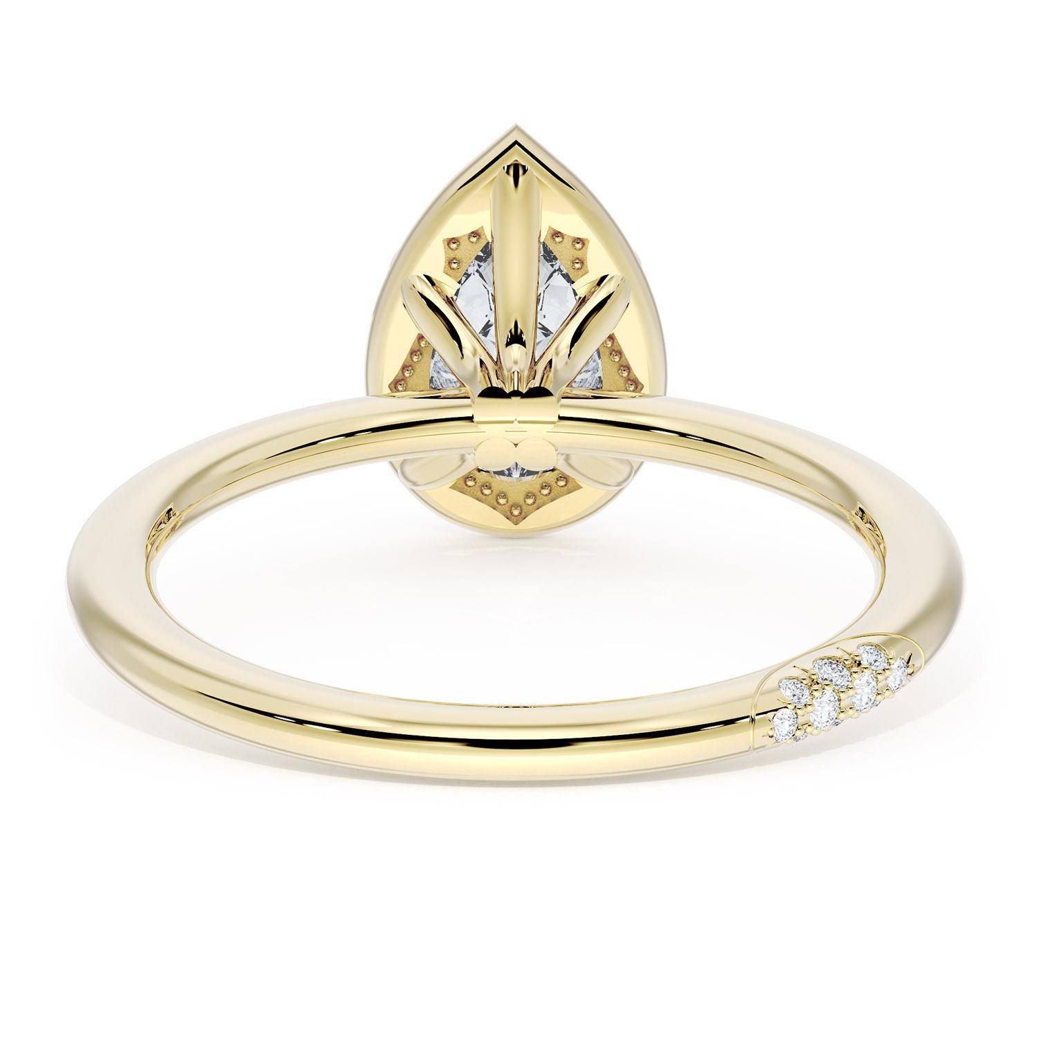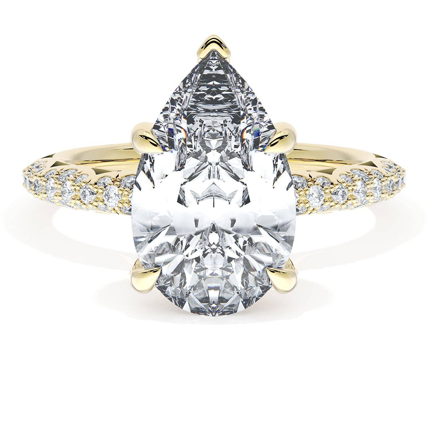 A Pear Solitaire is set into a unique corset-inspired crown on a 18kt White Gold foundation. Pavé-set diamonds decorate the ceiling and a diamond-studded Founder's Crescent marks the resting point.