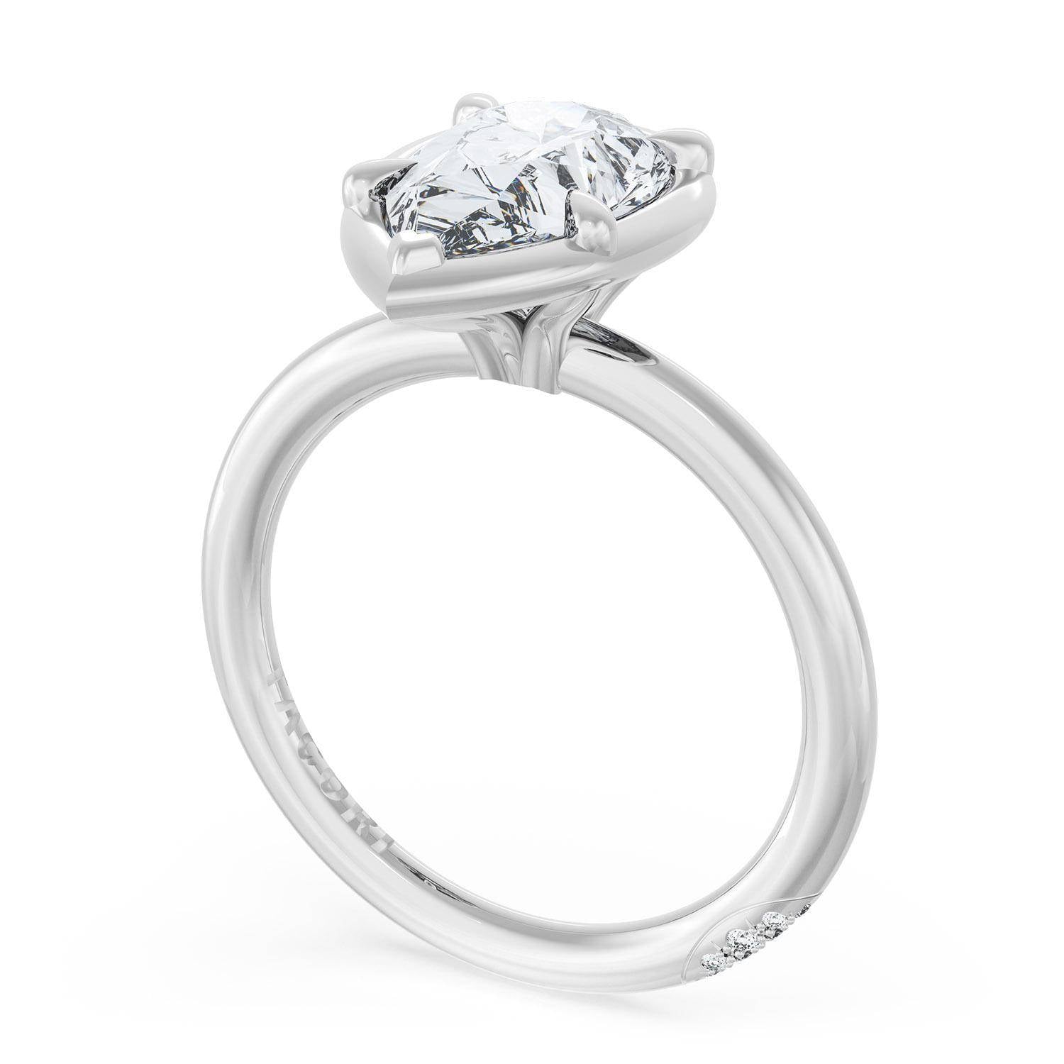 A Pear solitaire is elevated by a modern bloom of round brilliant diamonds, and set into a high-polish 18kt White Gold foundation. TACORI Crescents add hidden detail to the underside of the crown.