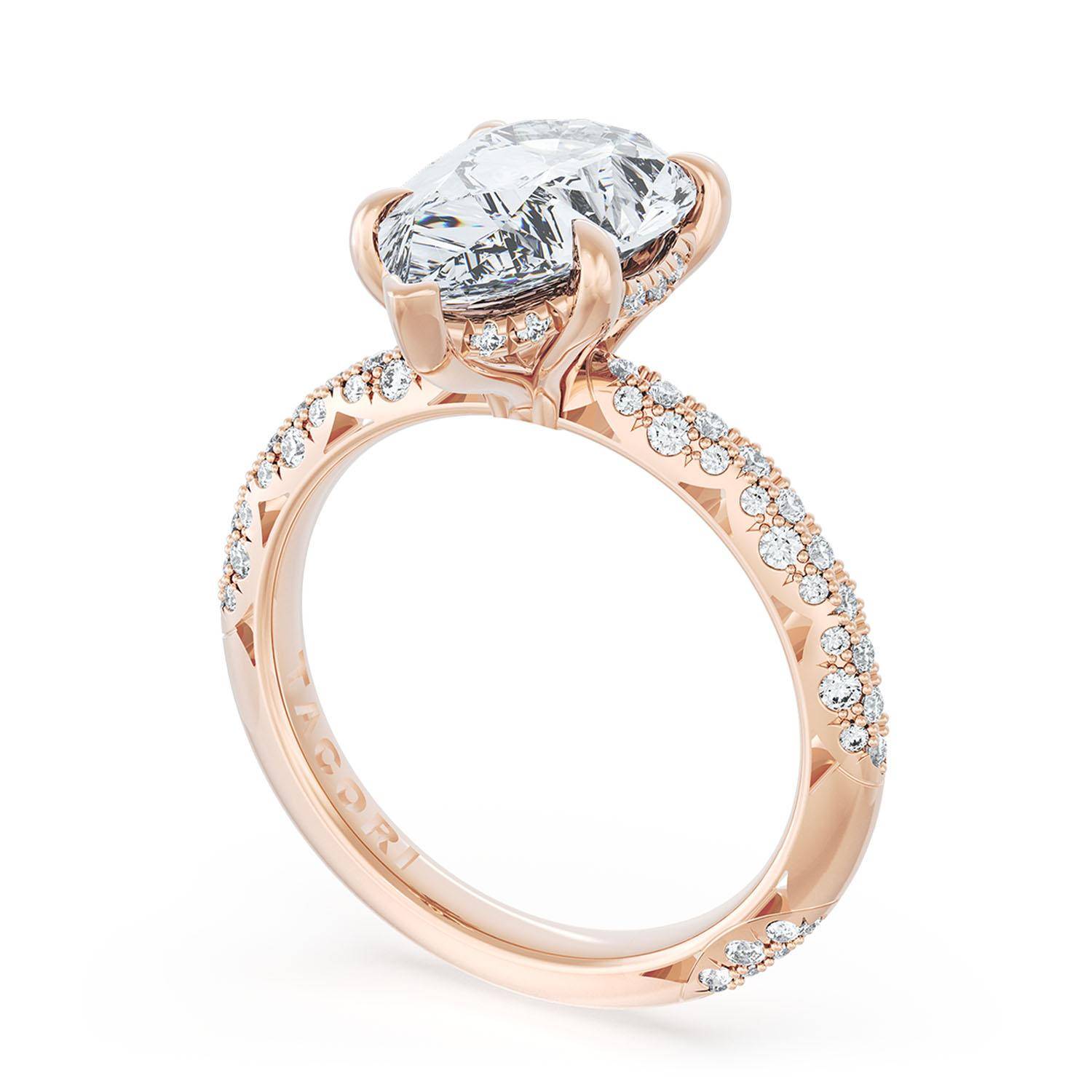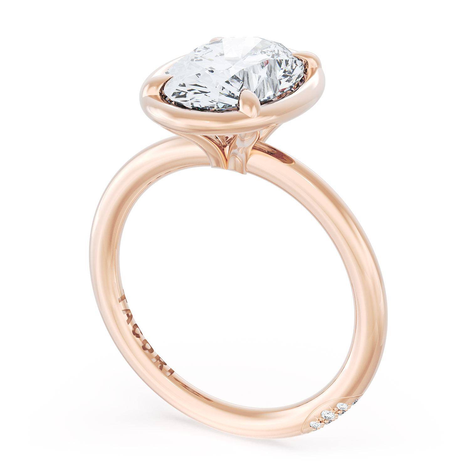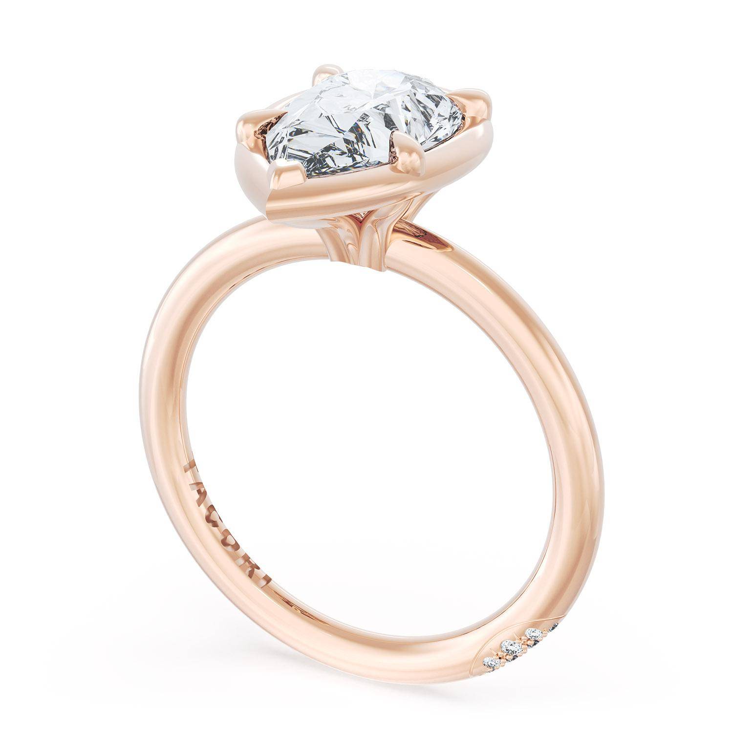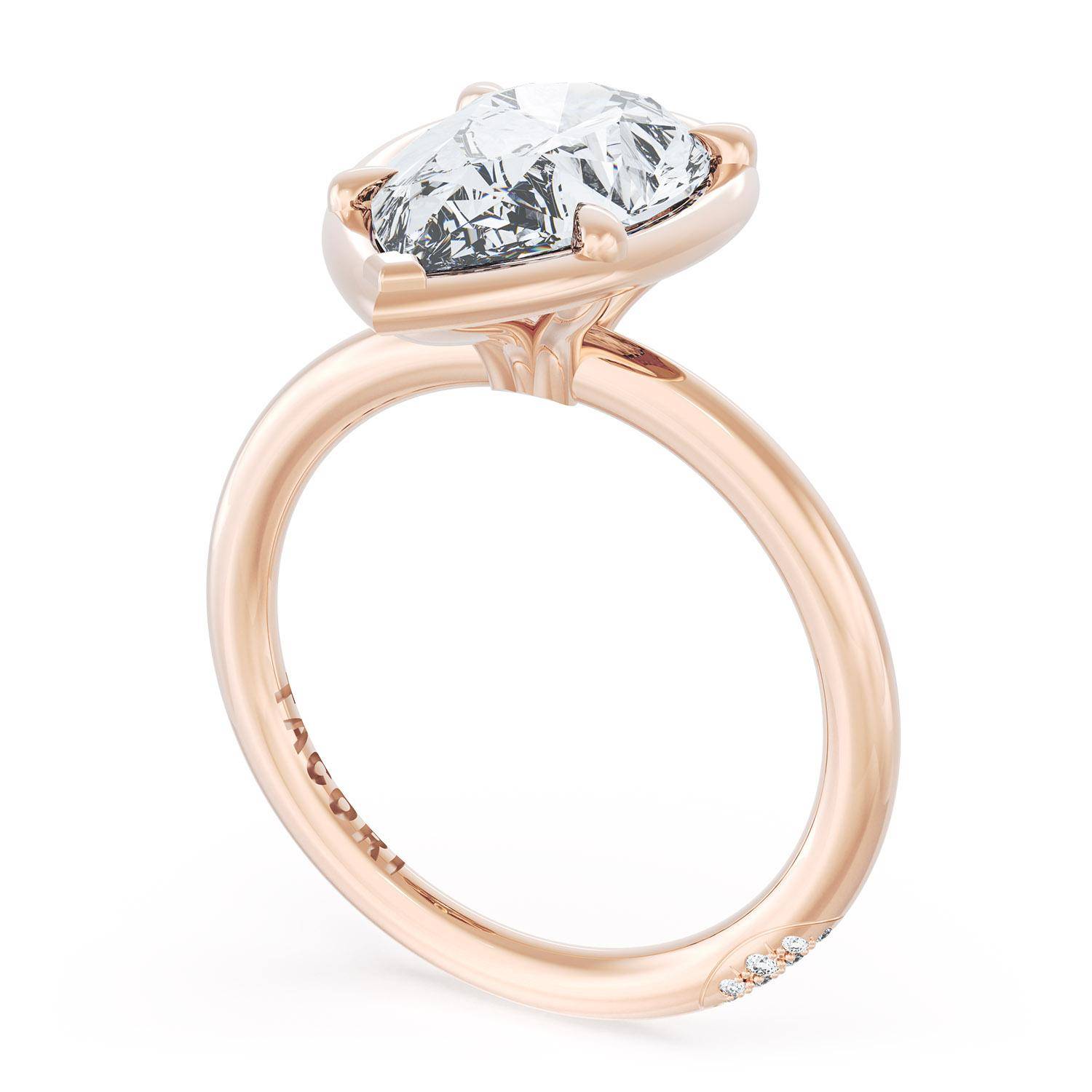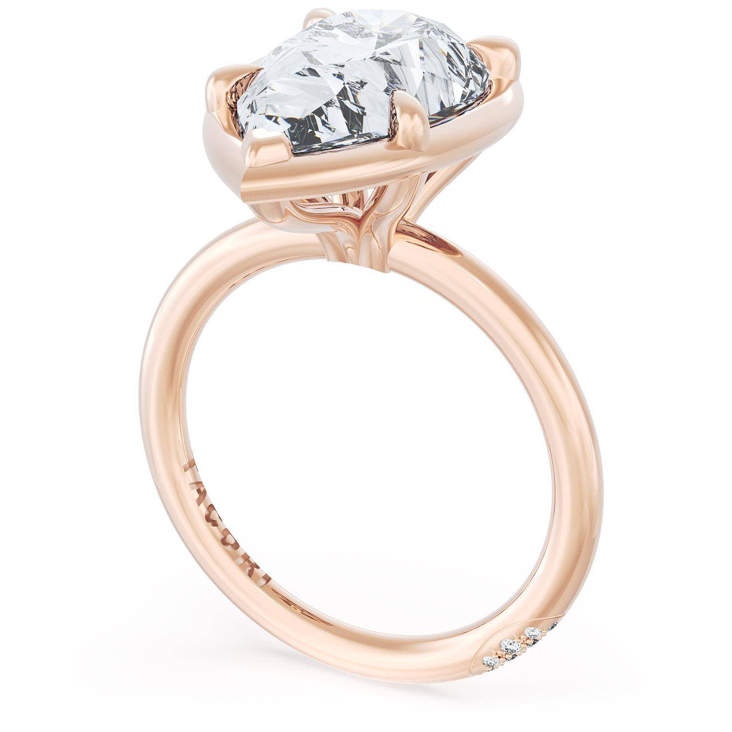 A Pear solitaire is elevated by a modern bloom of round brilliant diamonds, and set into a high-polish 18kt Rose Gold foundation. TACORI Crescents add hidden detail to the underside of the crown.