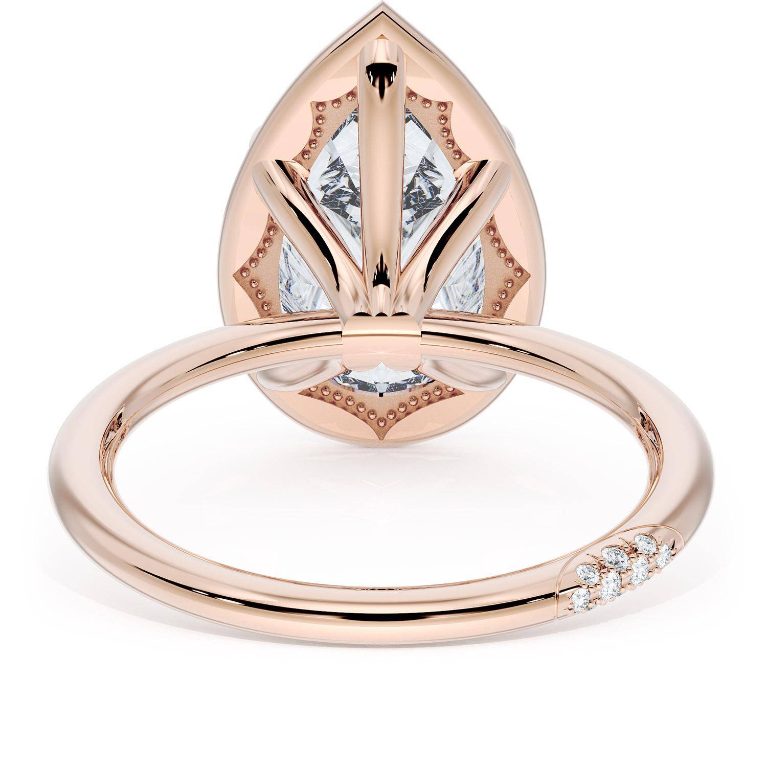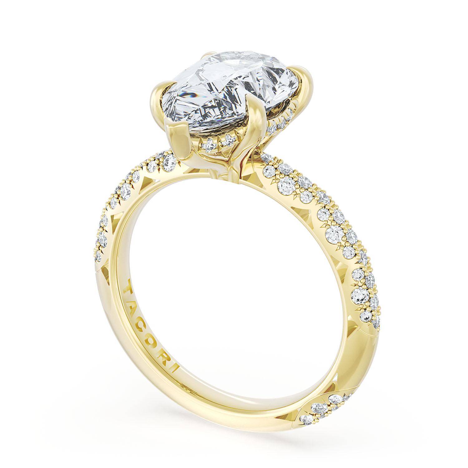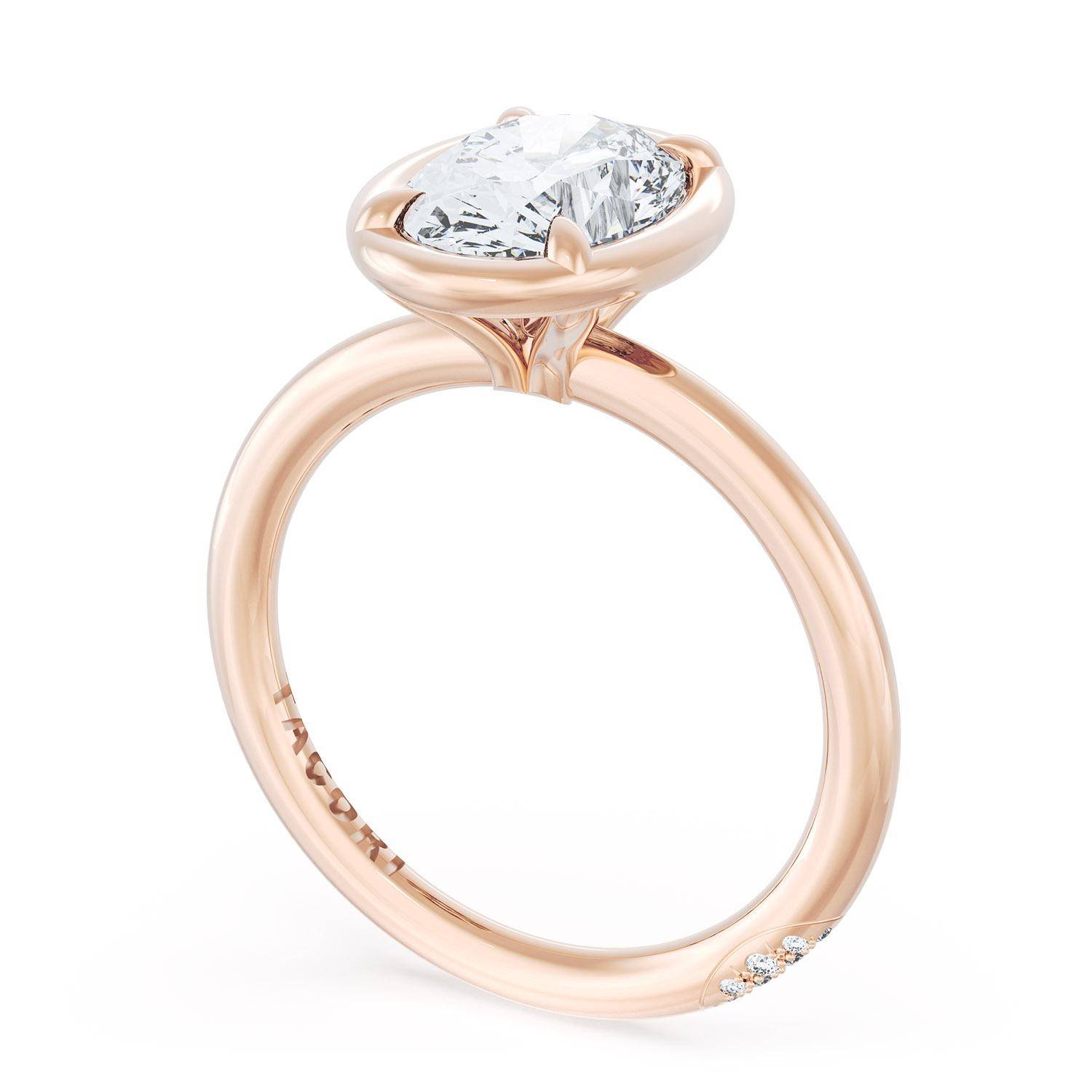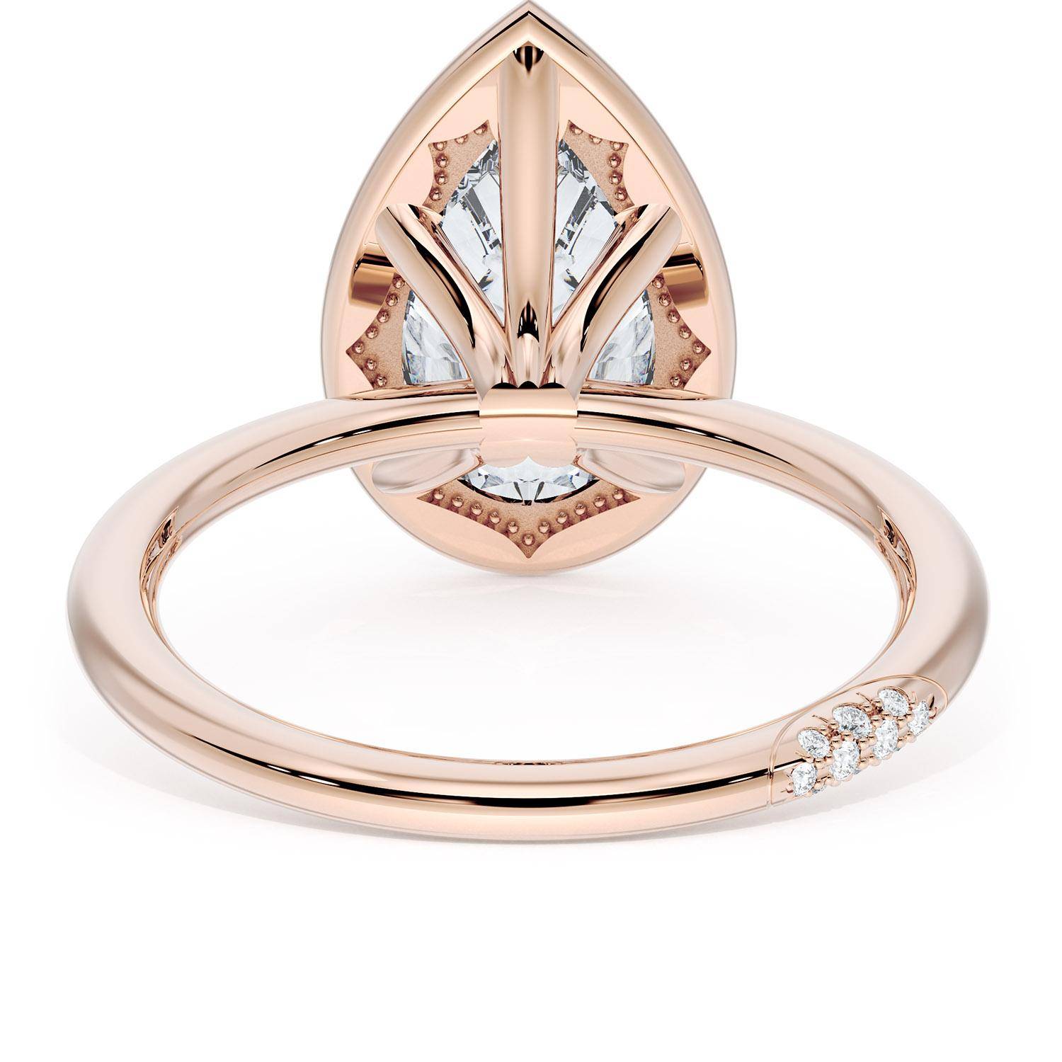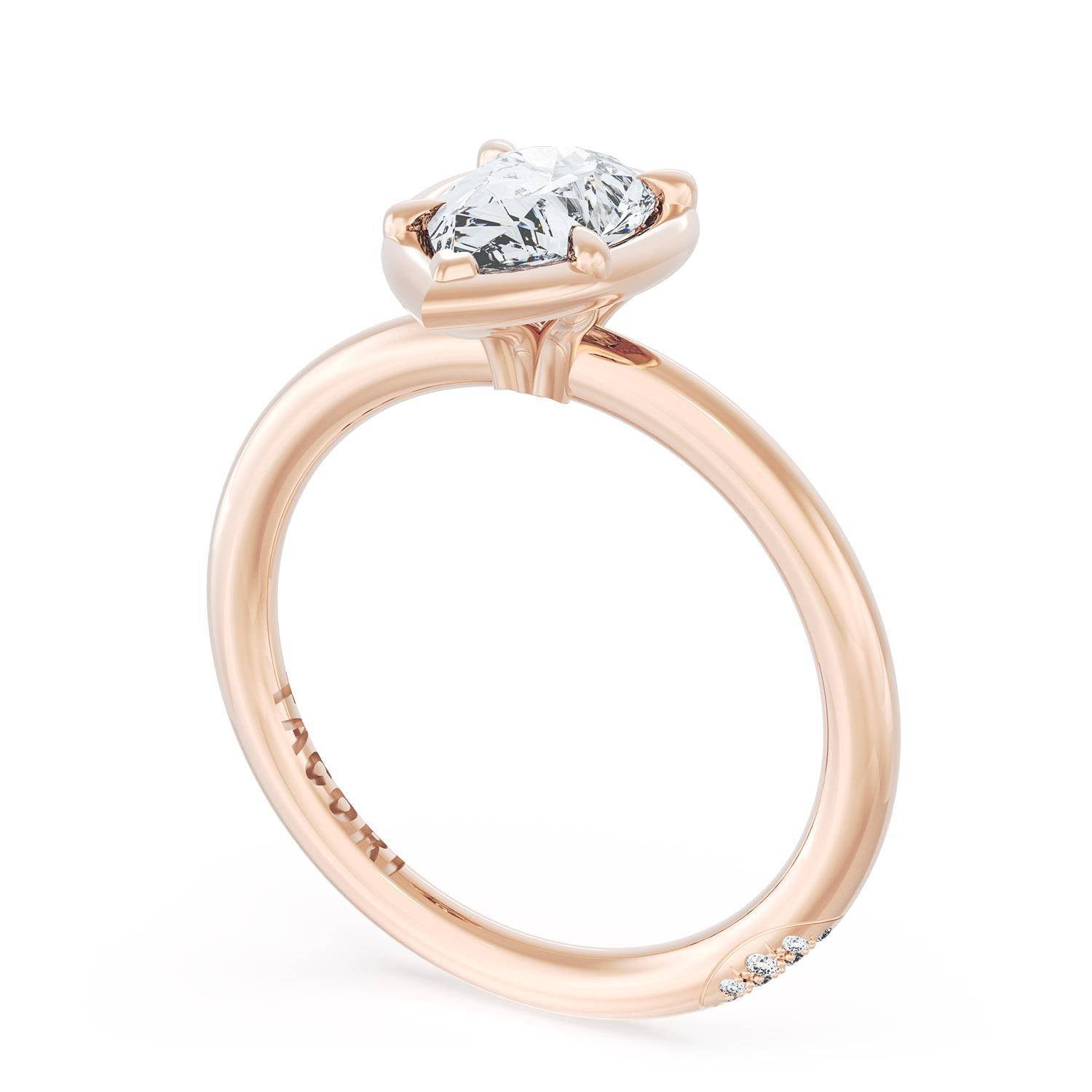 A Pear solitaire is elevated by a modern bloom of round brilliant diamonds, and set into a high-polish 18kt Rose Gold foundation. TACORI Crescents add hidden detail to the underside of the crown.