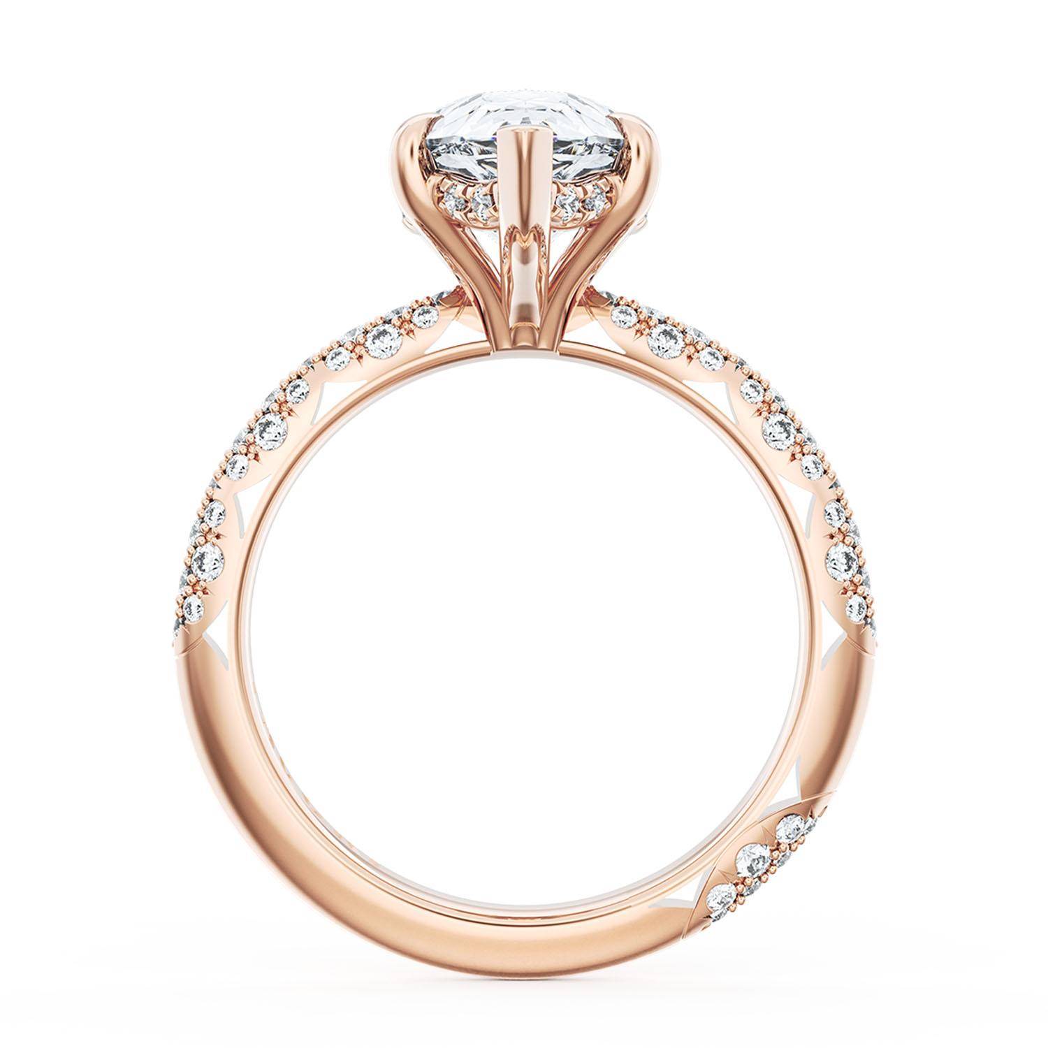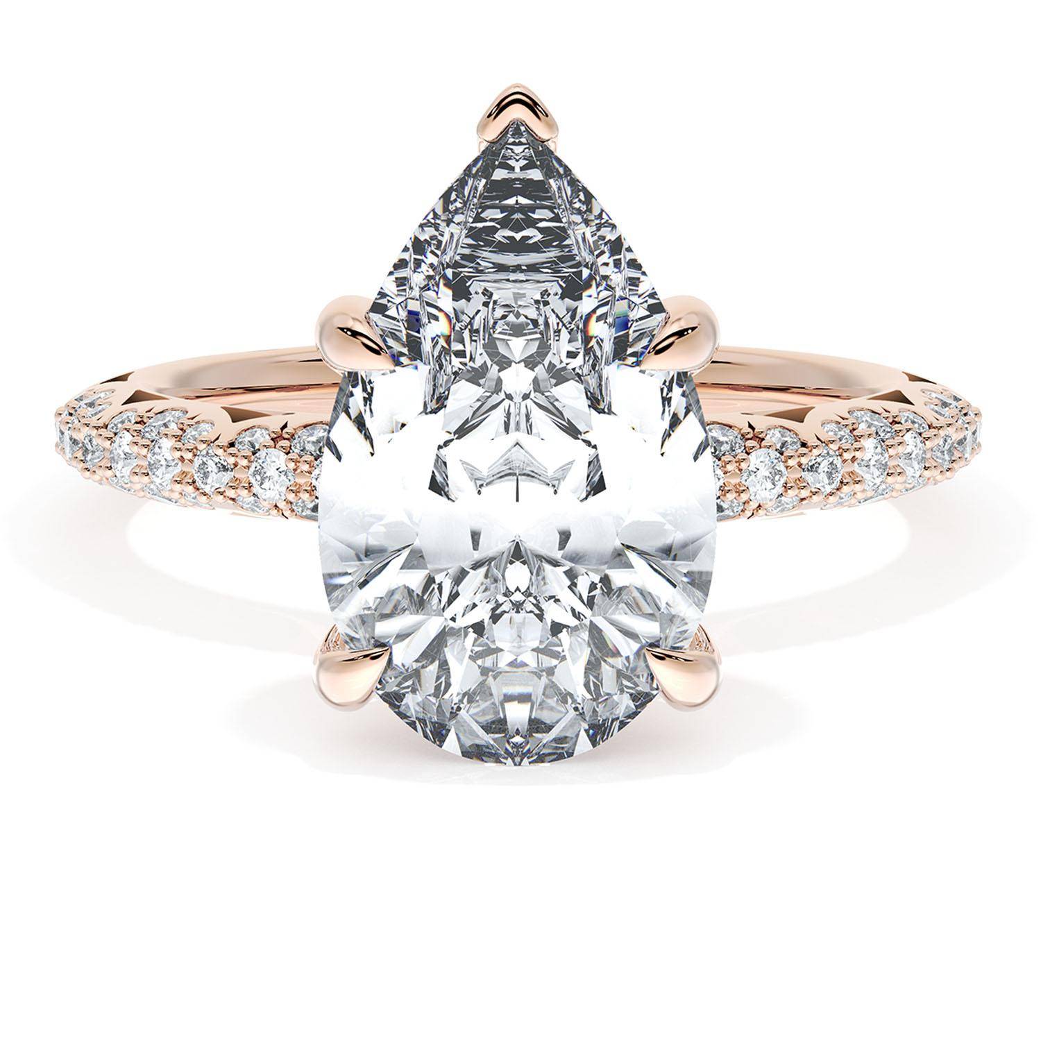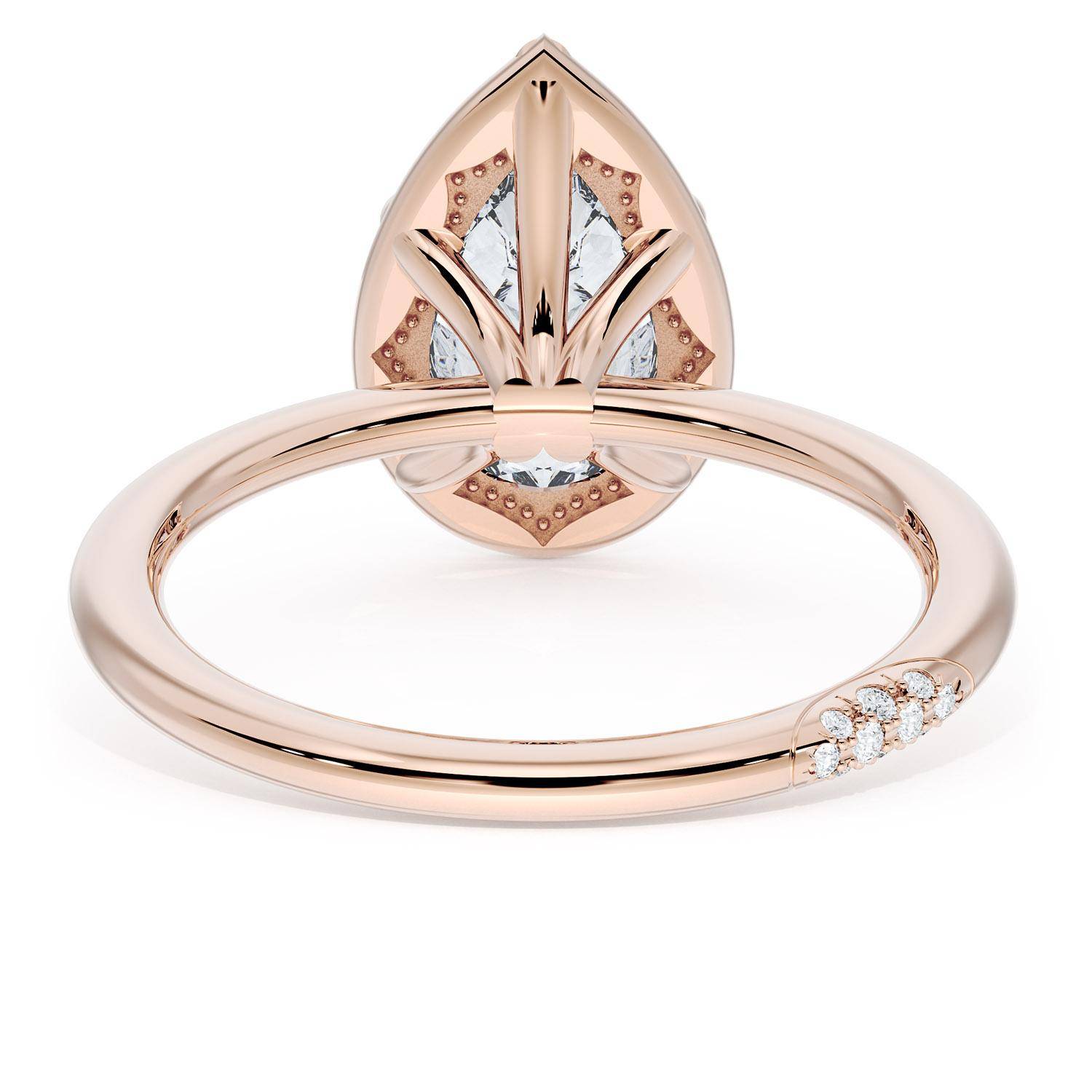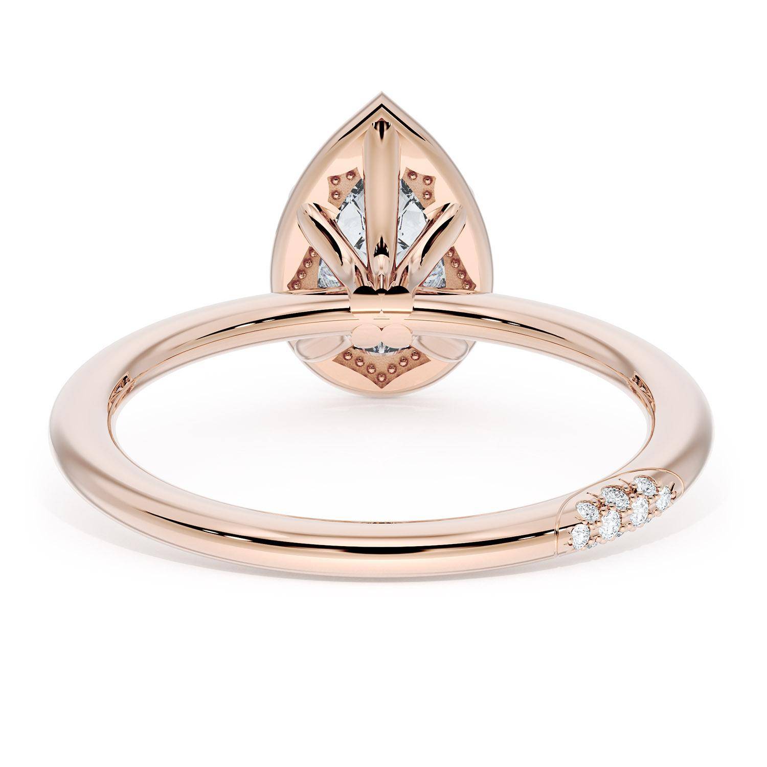 A Pear solitaire is elevated by a modern bloom of round brilliant diamonds, and set into a high-polish 18kt Rose Gold foundation. TACORI Crescents add hidden detail to the underside of the crown.