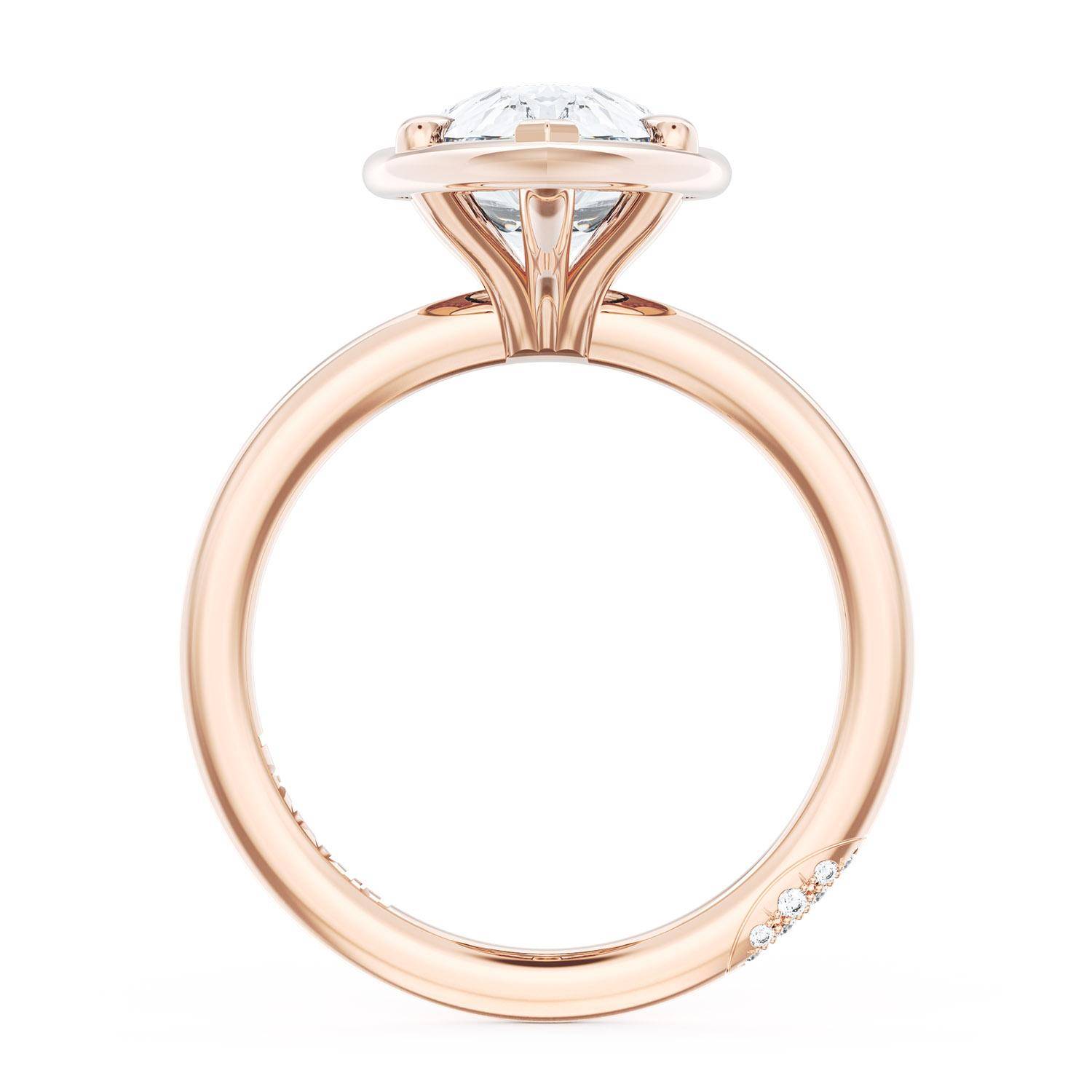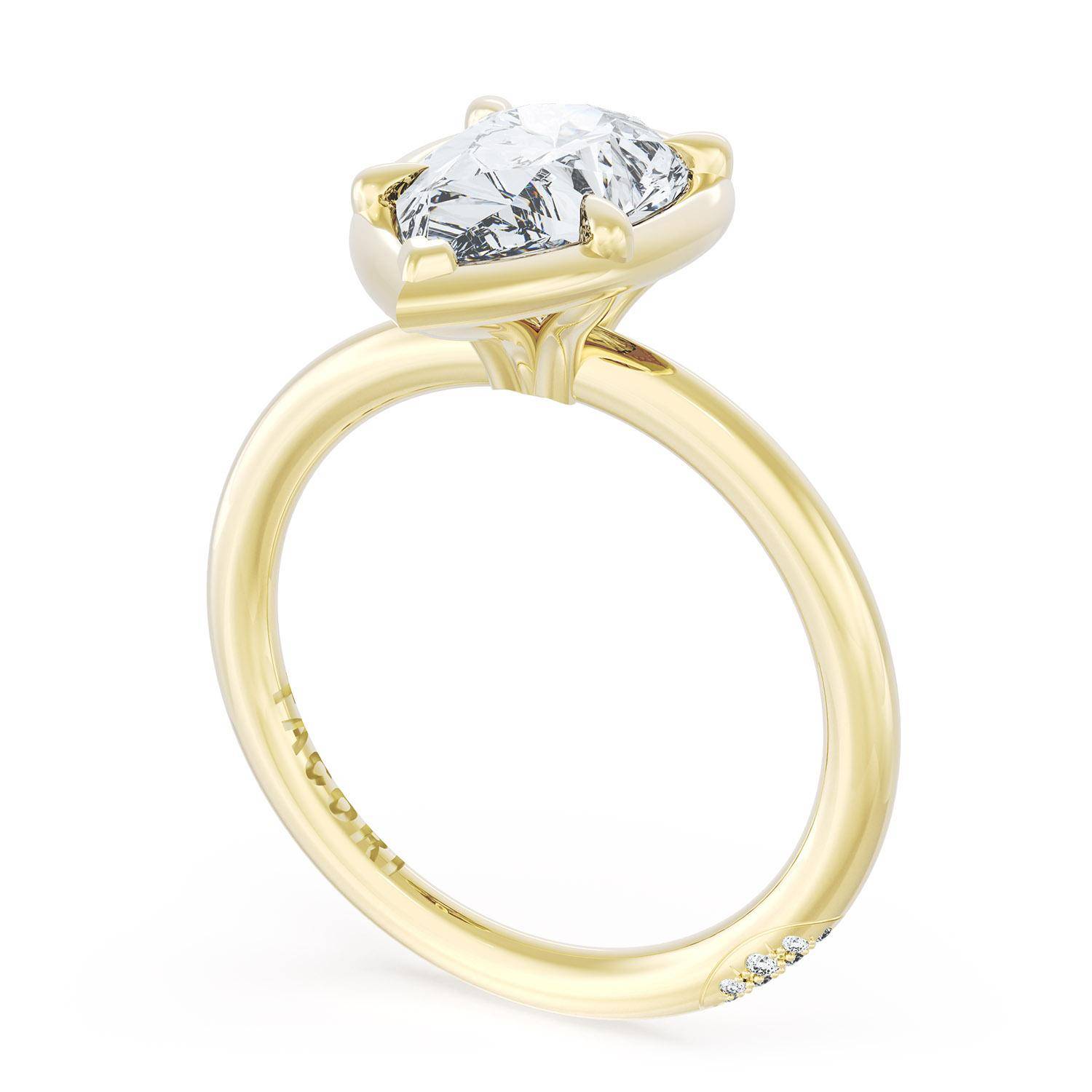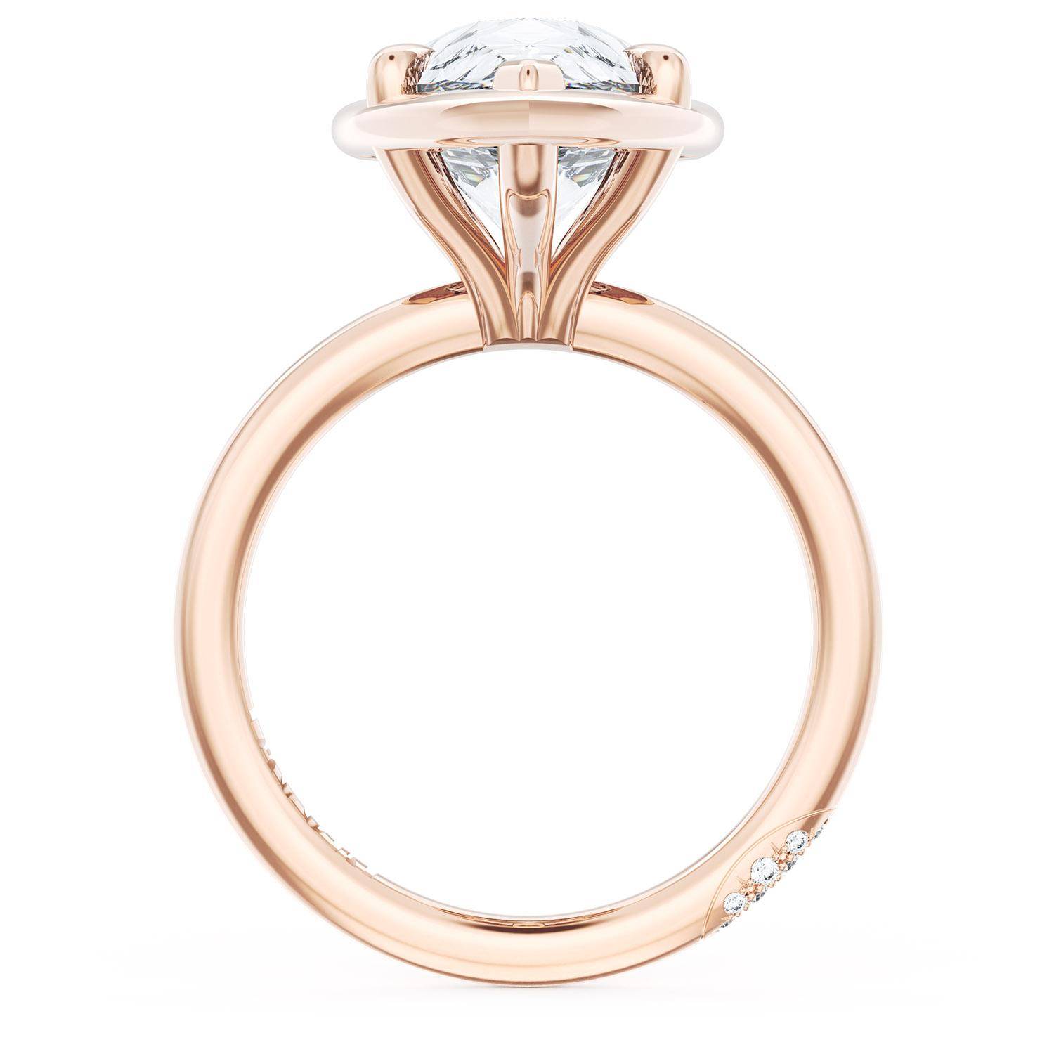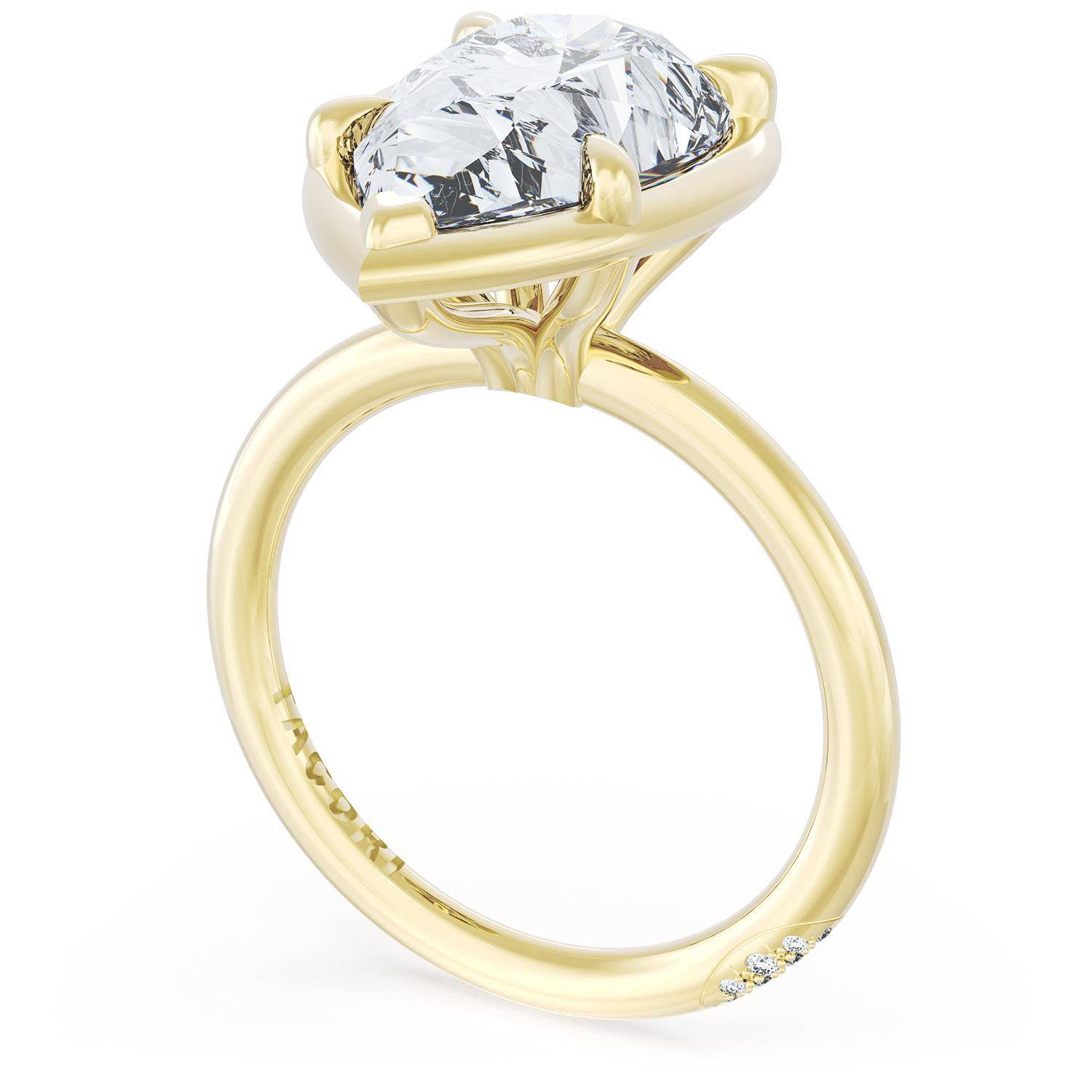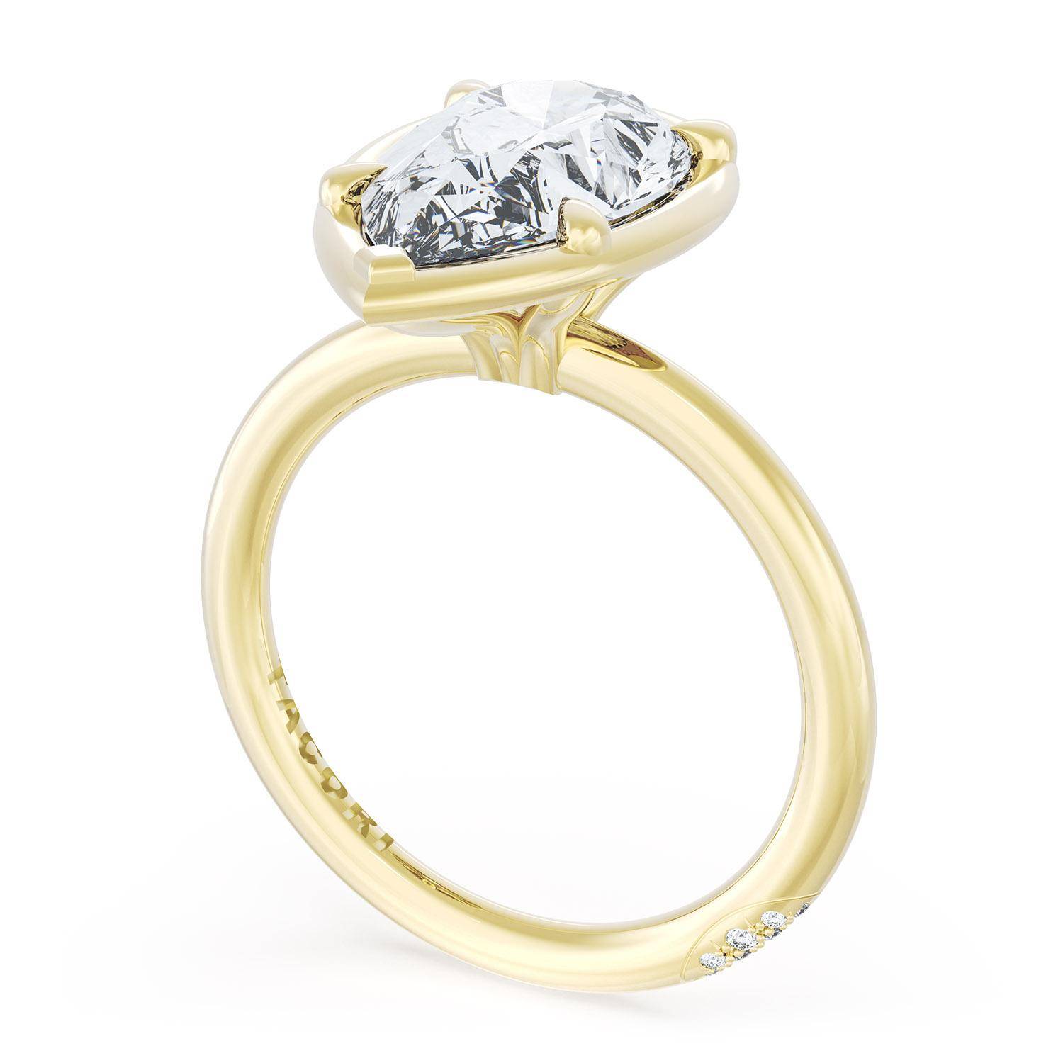 A Pear solitaire is elevated by a modern bloom of round brilliant diamonds, and set into a high-polish 18kt Rose Gold foundation. TACORI Crescents add hidden detail to the underside of the crown.