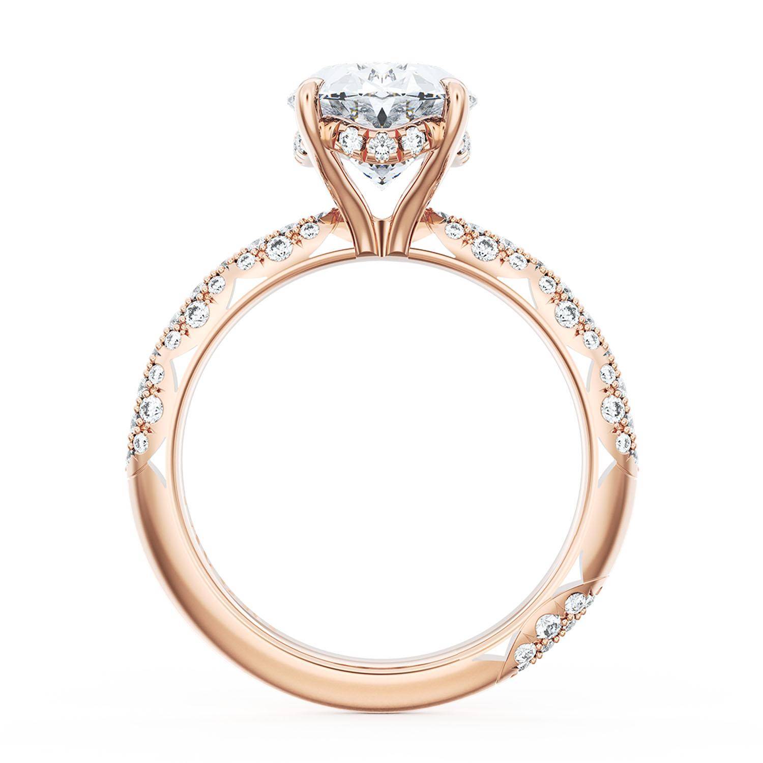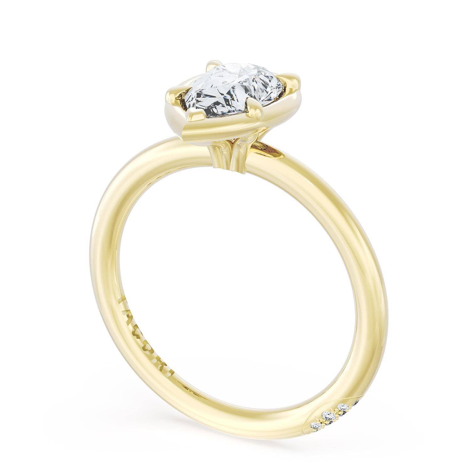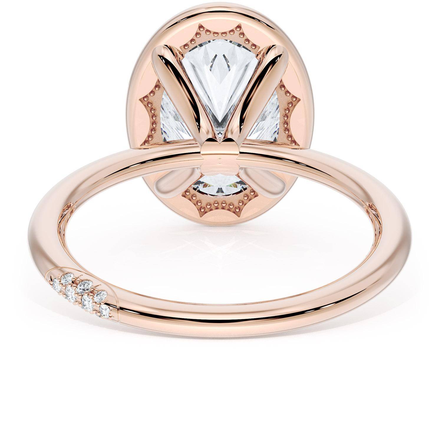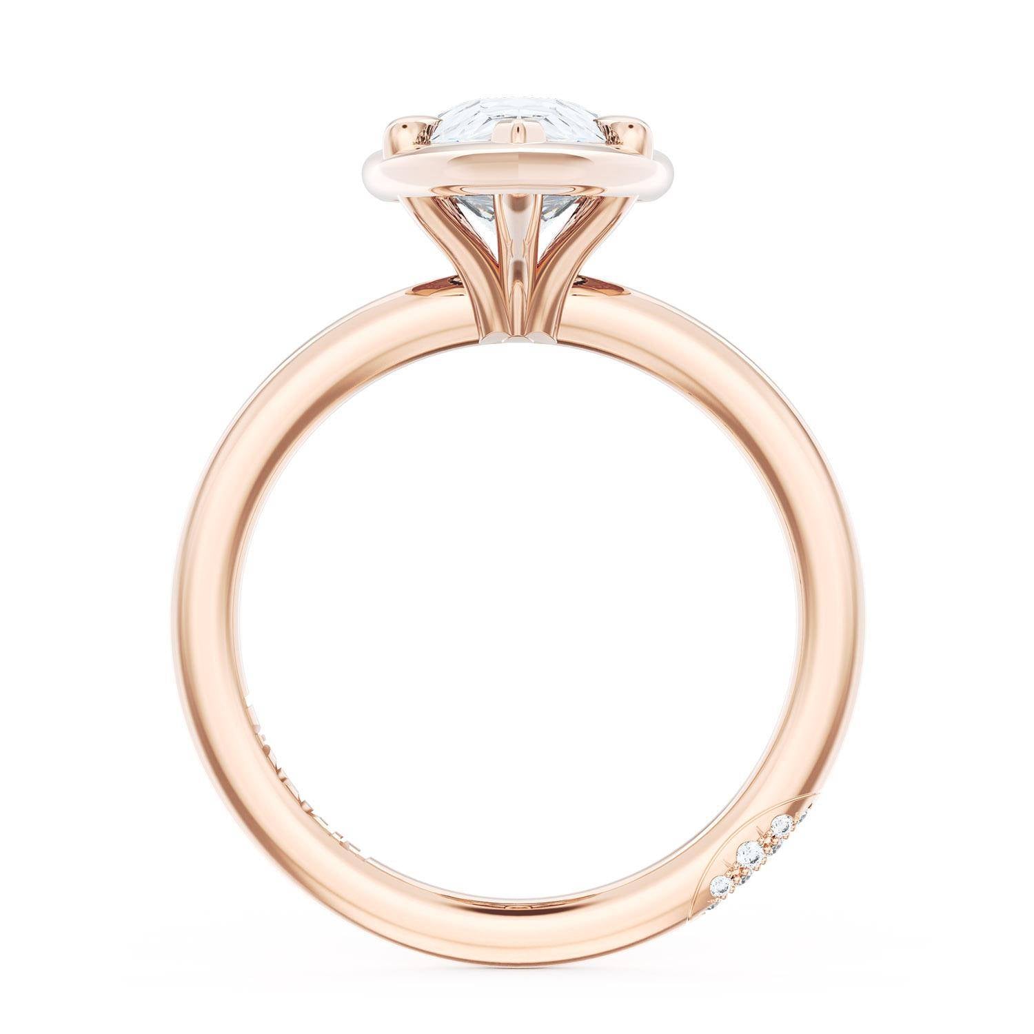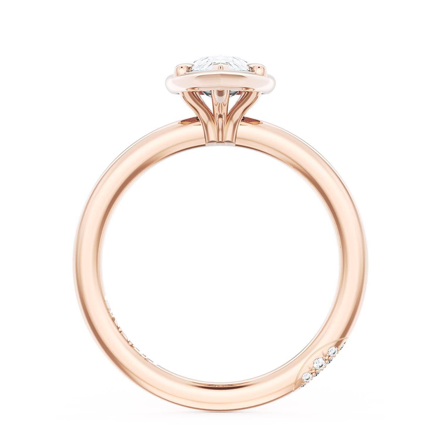 A Pear solitaire is elevated by a modern bloom of round brilliant diamonds, and set into a high-polish 18kt Rose Gold foundation. TACORI Crescents add hidden detail to the underside of the crown.