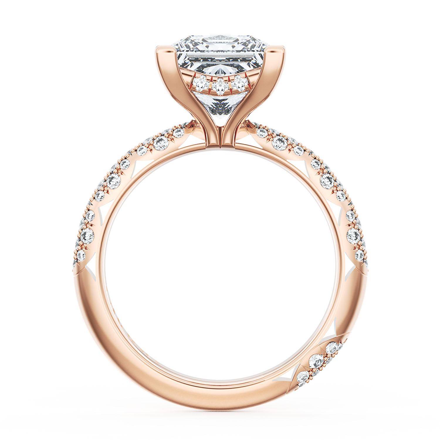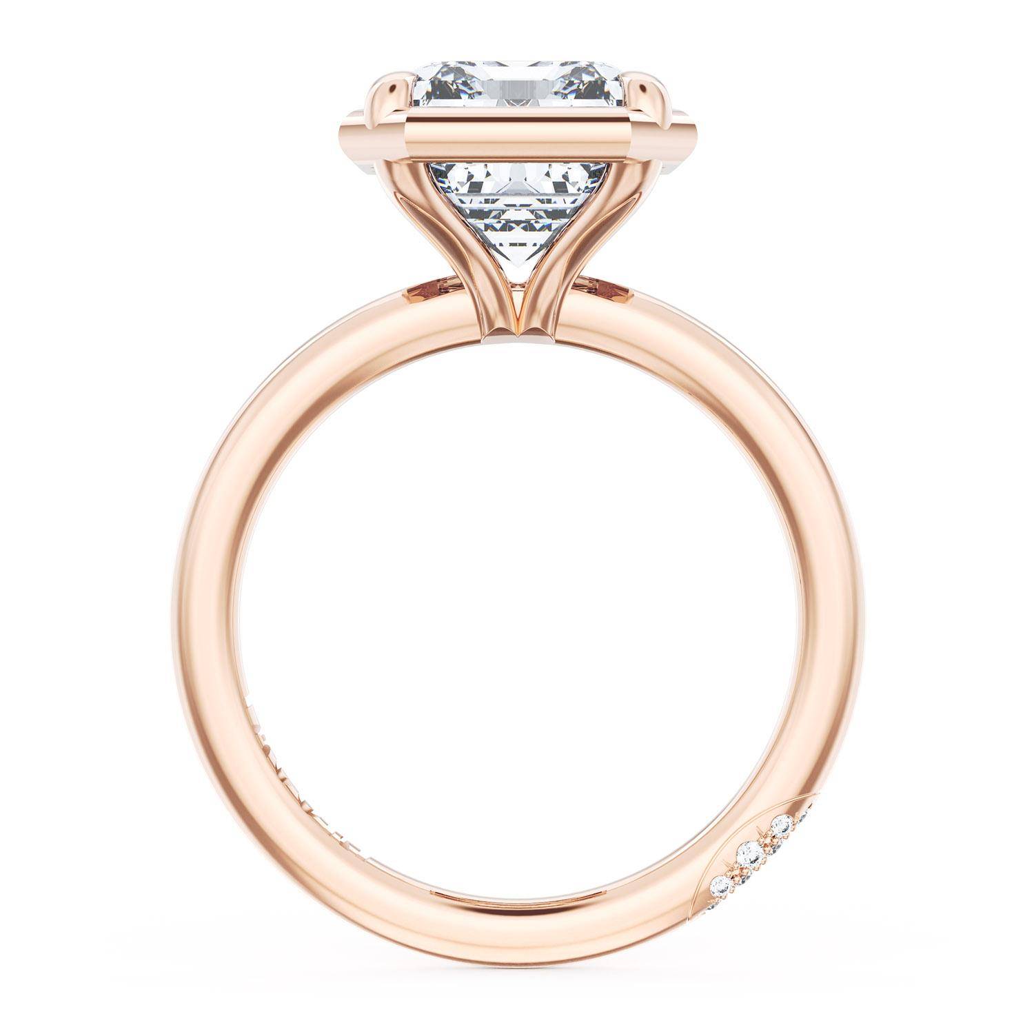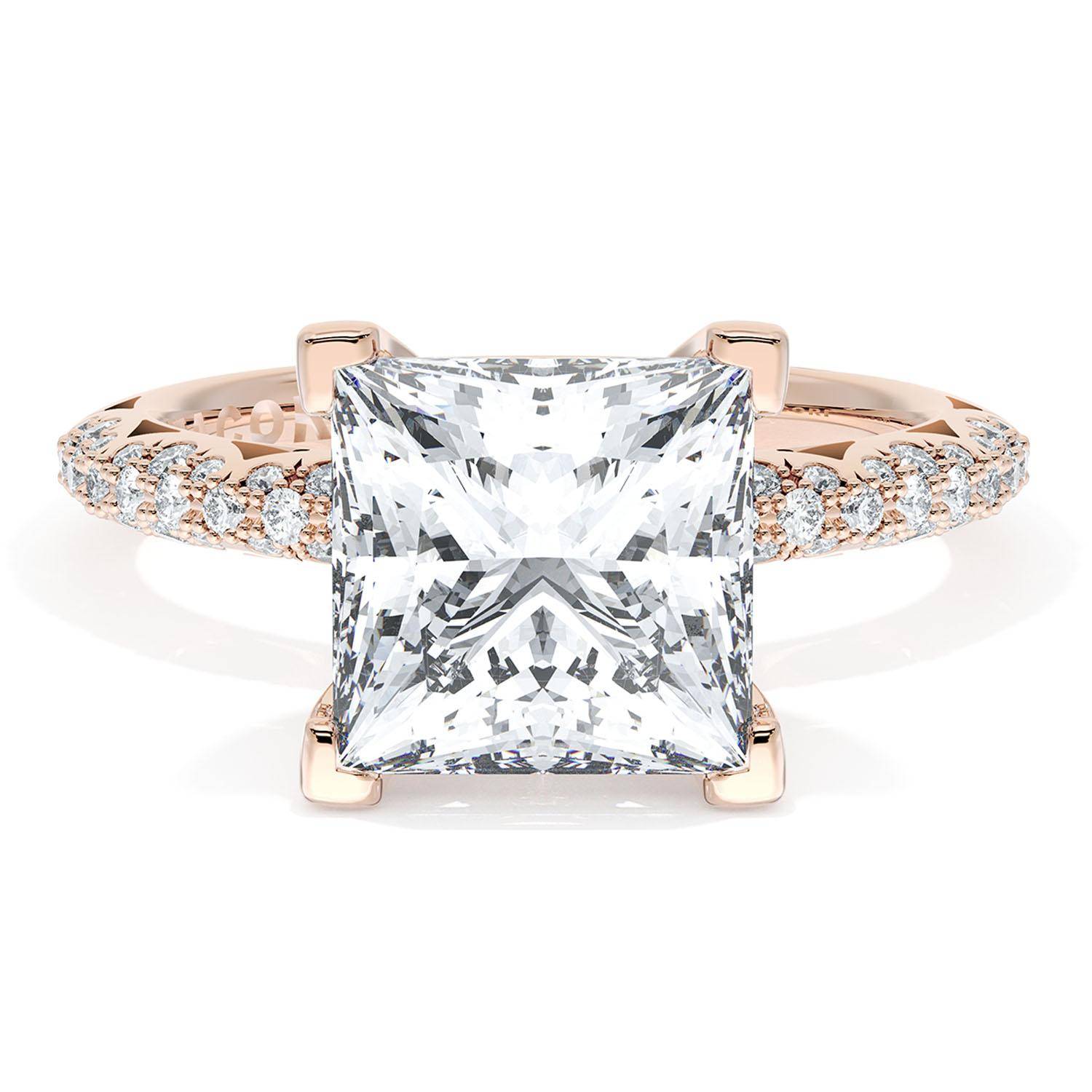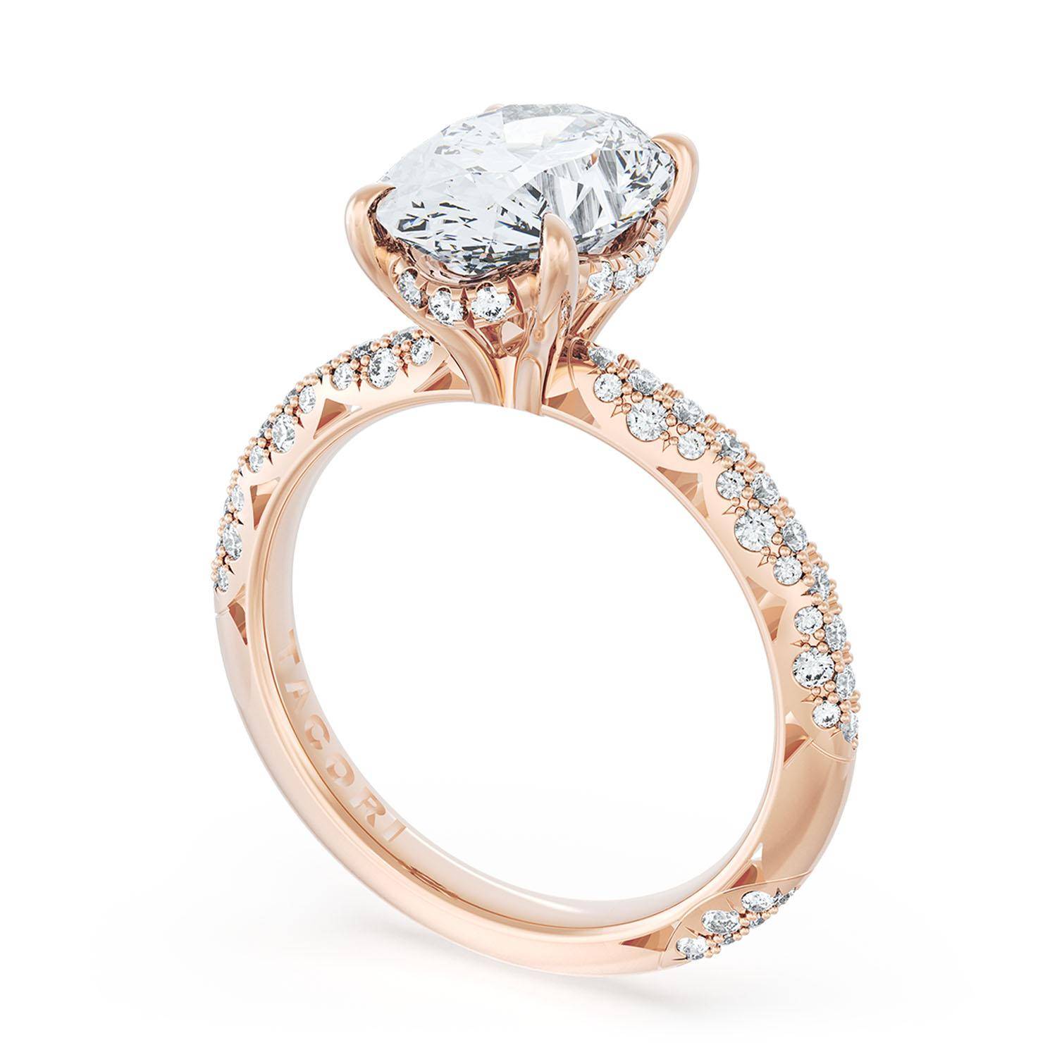 A Princess Solitaire is set into a unique corset-inspired crown on a 18kt Rose Gold foundation. Pavé-set diamonds decorate the ceiling and a diamond-studded Founder's Crescent marks the resting point.