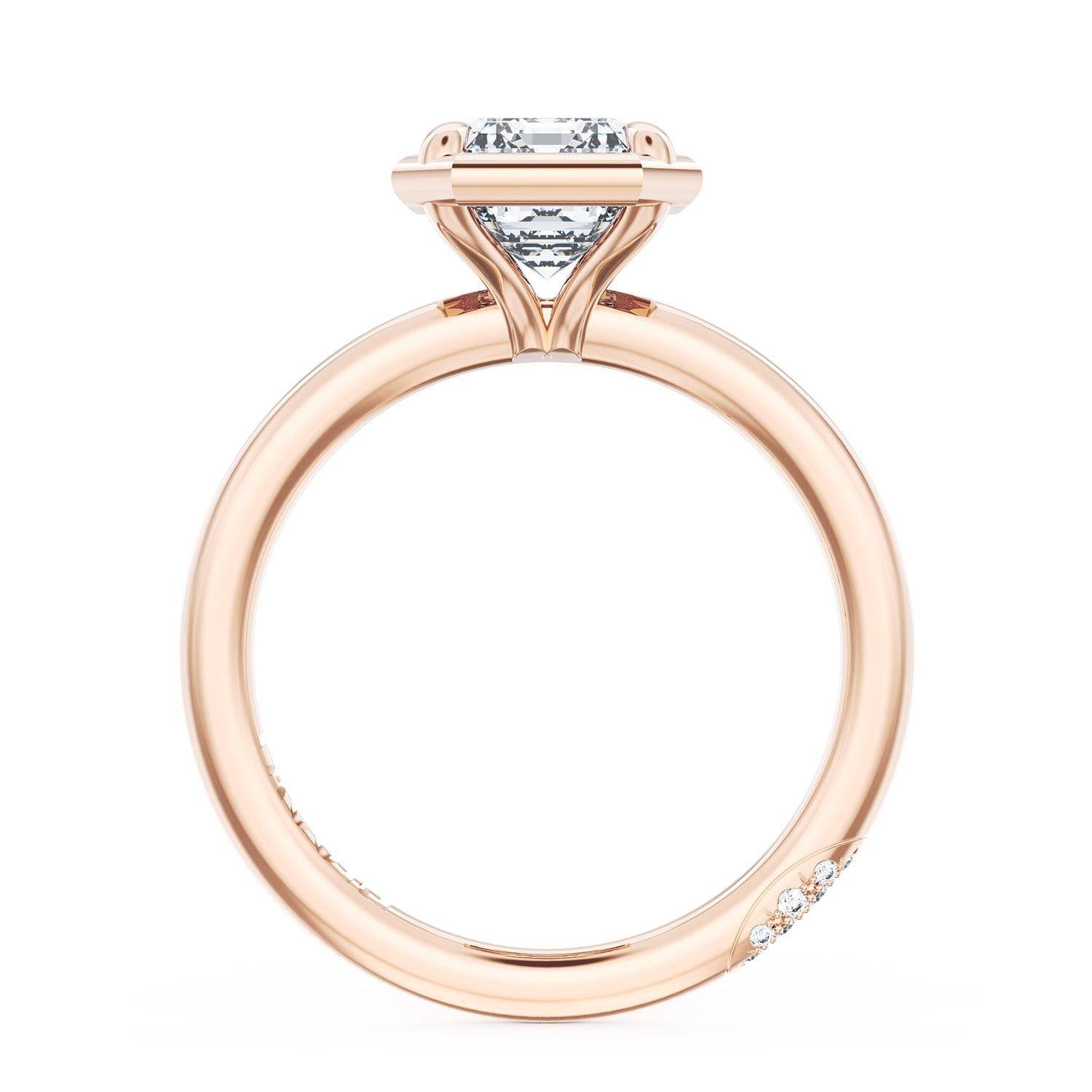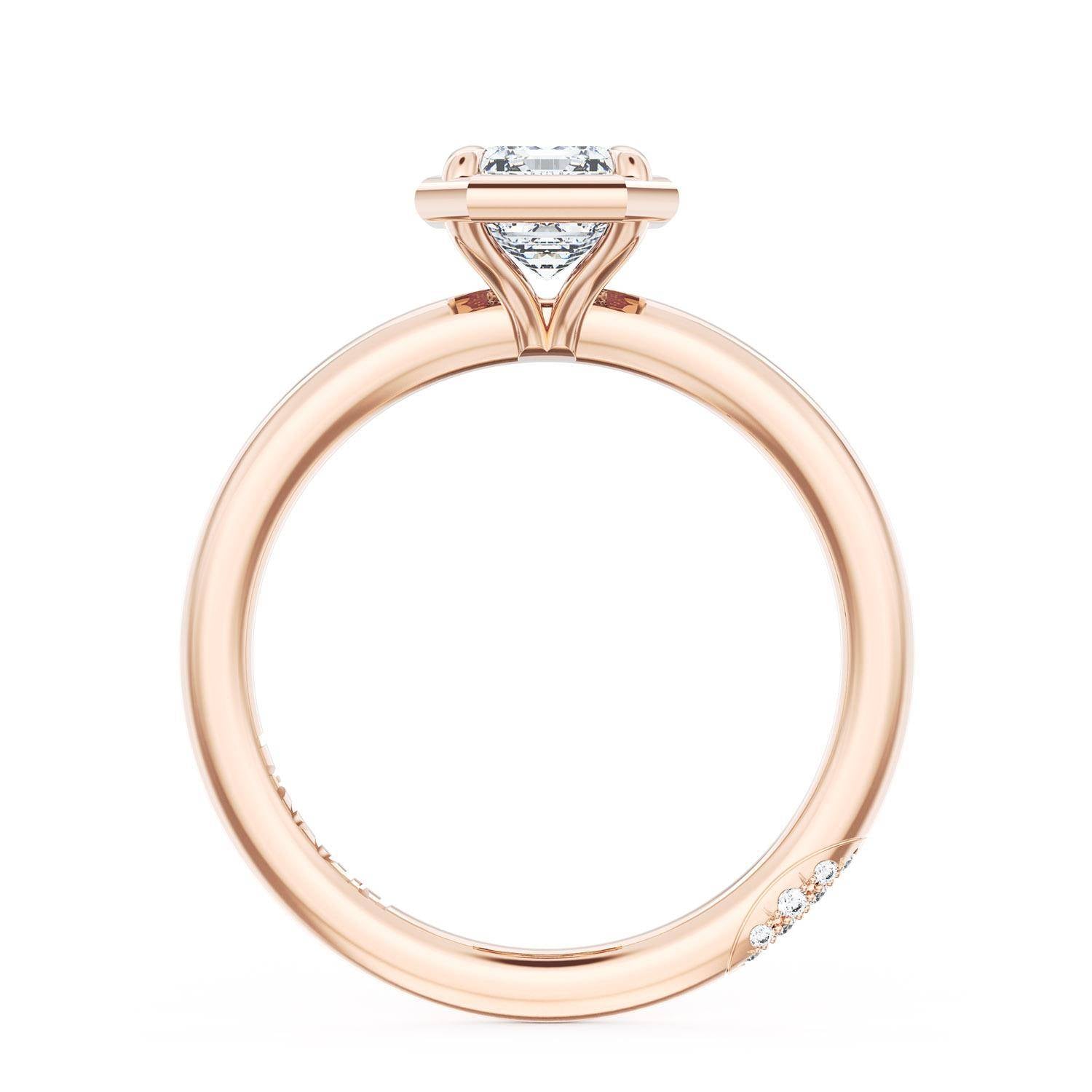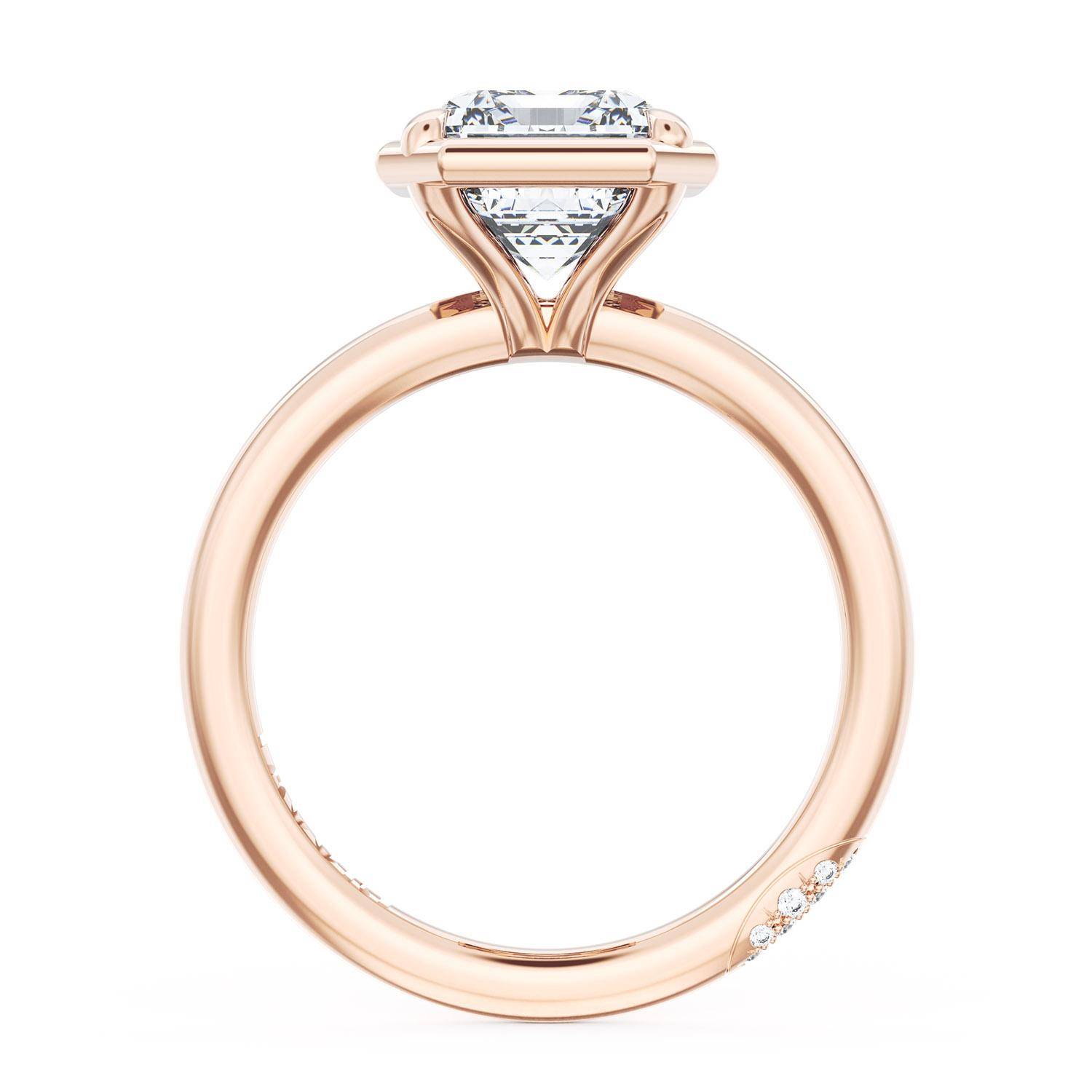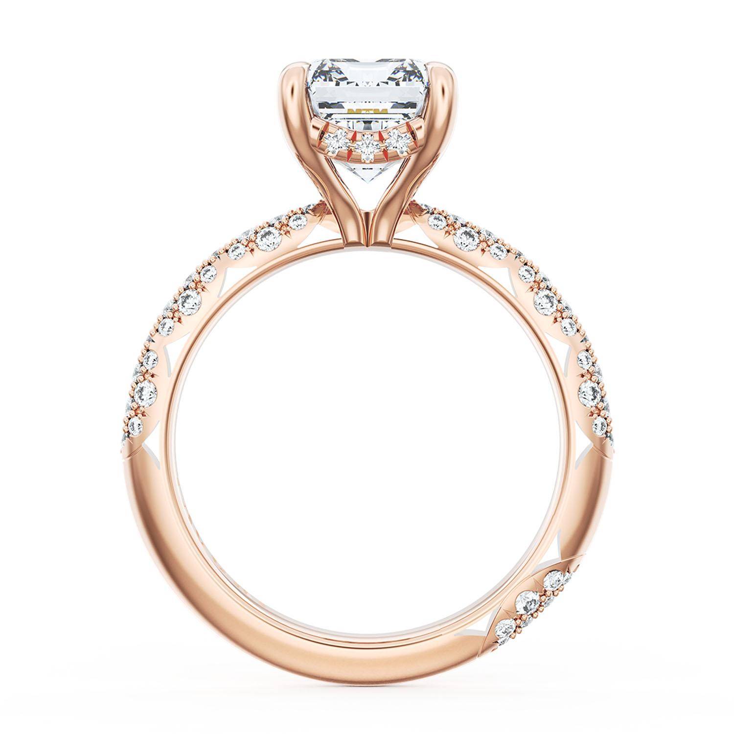 A Princess Solitaire is set into a unique corset-inspired crown on a 18kt Rose Gold foundation. Pavé-set diamonds decorate the ceiling and a diamond-studded Founder's Crescent marks the resting point.