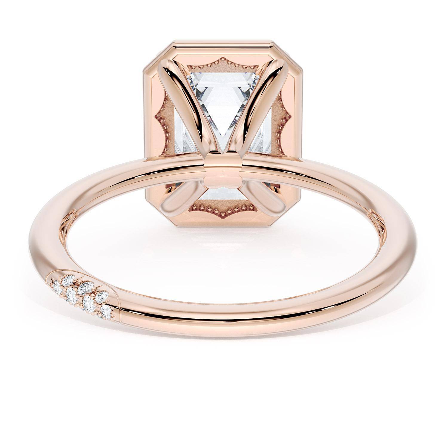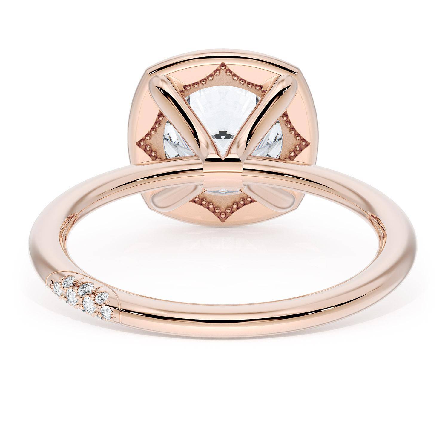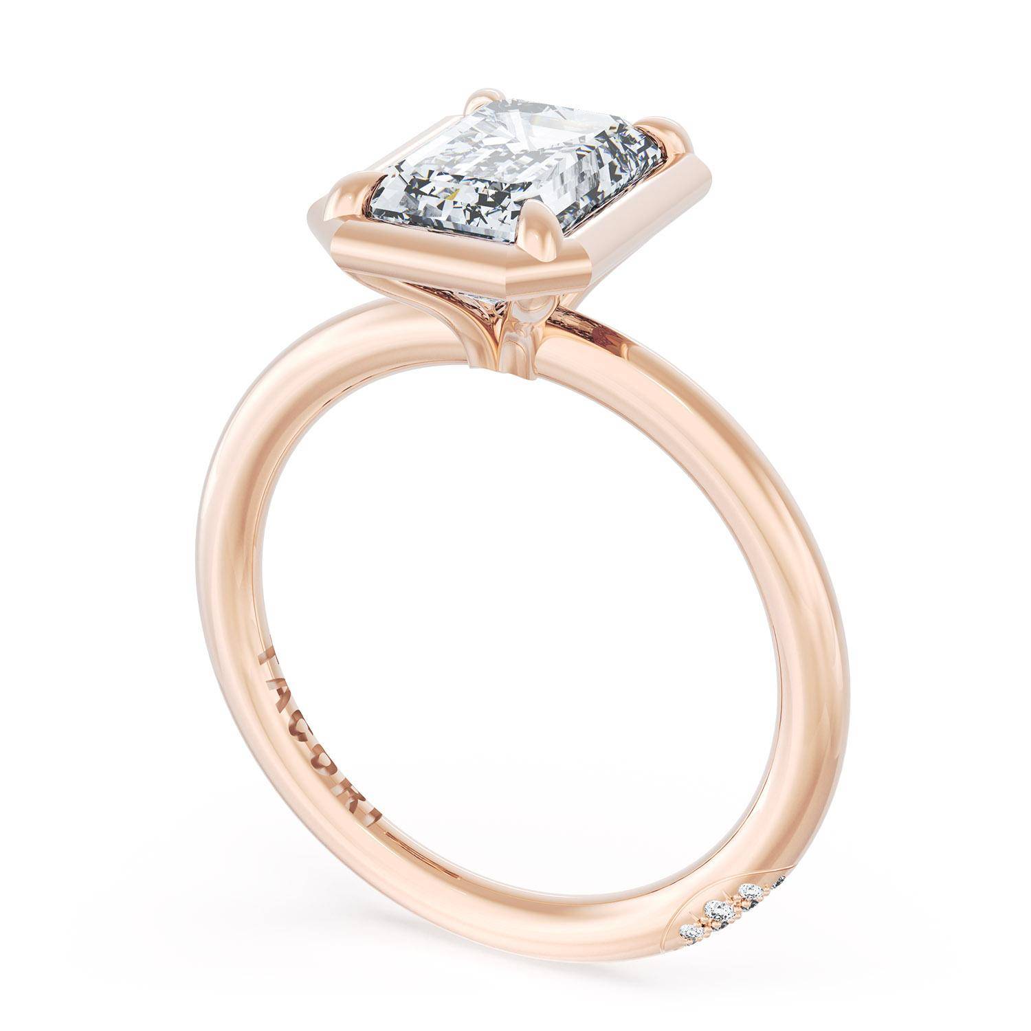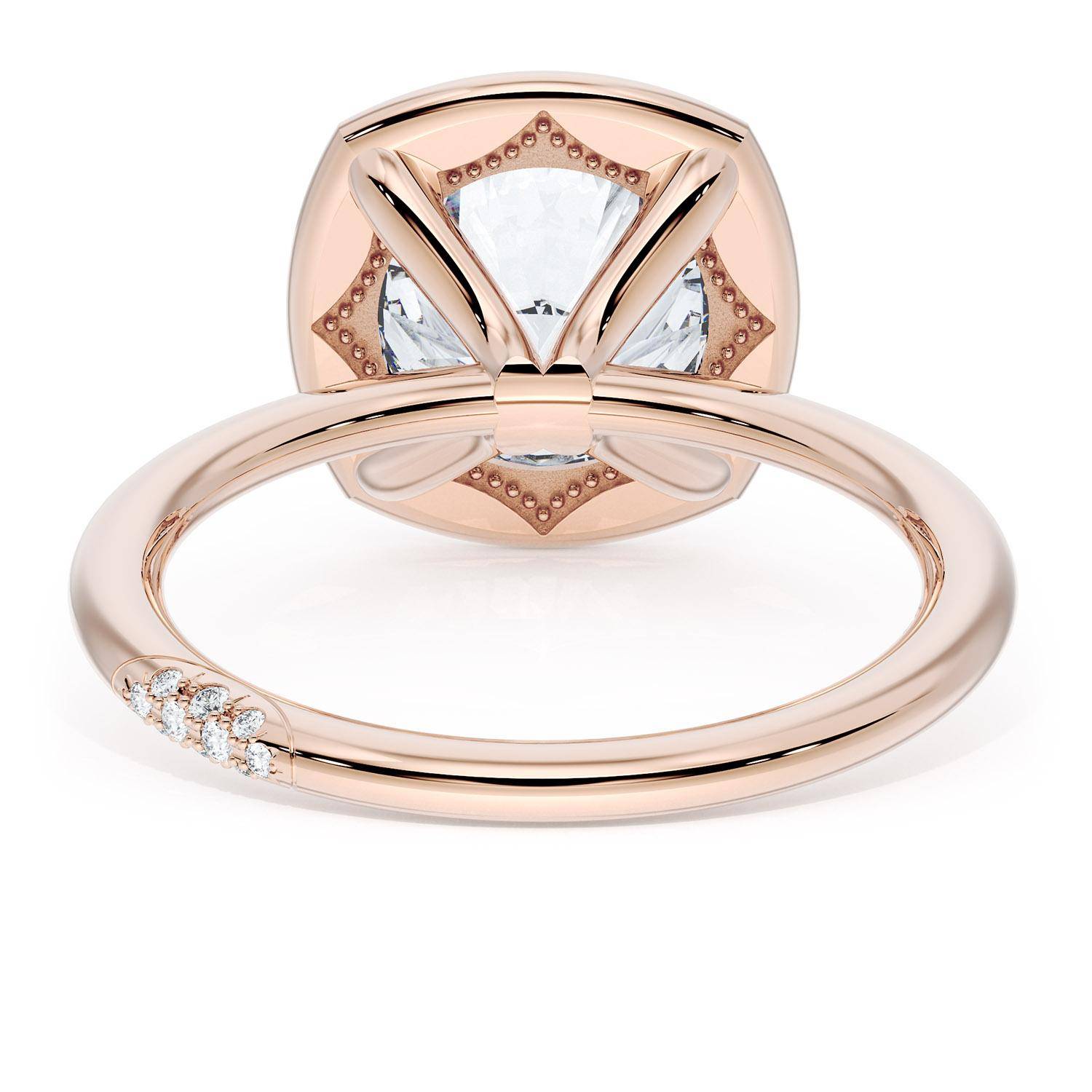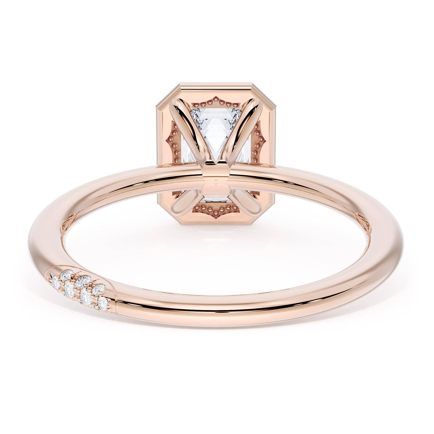 A Princess Solitaire is set into a unique corset-inspired crown on a 18kt Rose Gold foundation. Pavé-set diamonds decorate the ceiling and a diamond-studded Founder's Crescent marks the resting point.