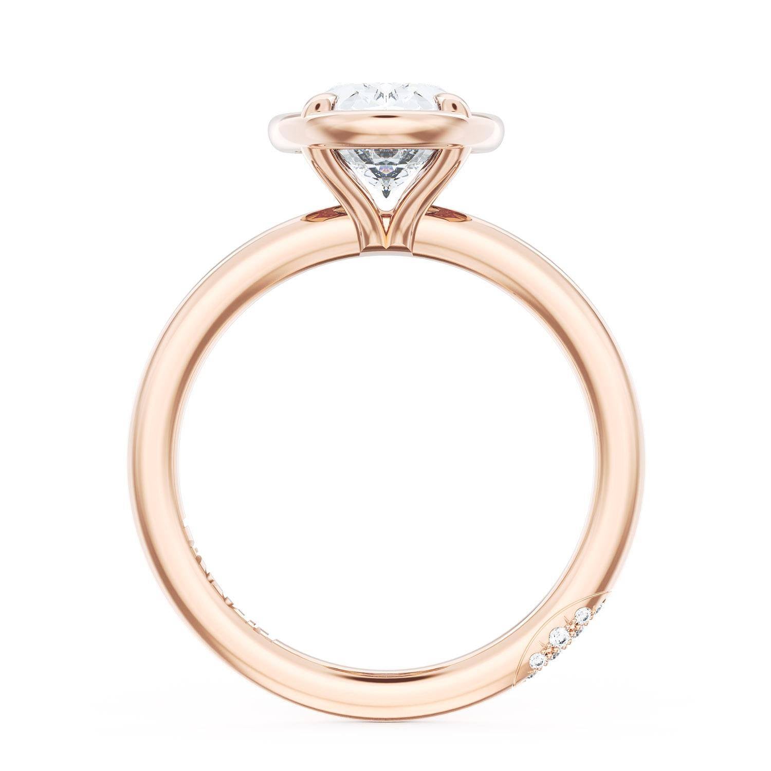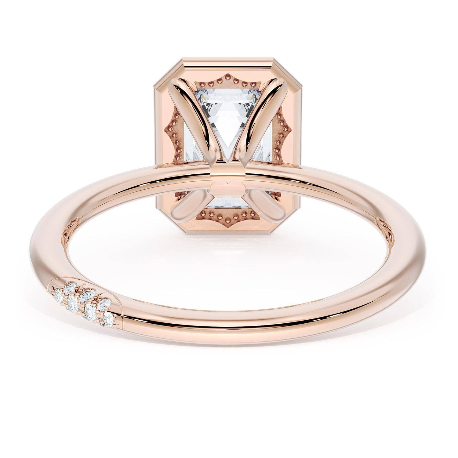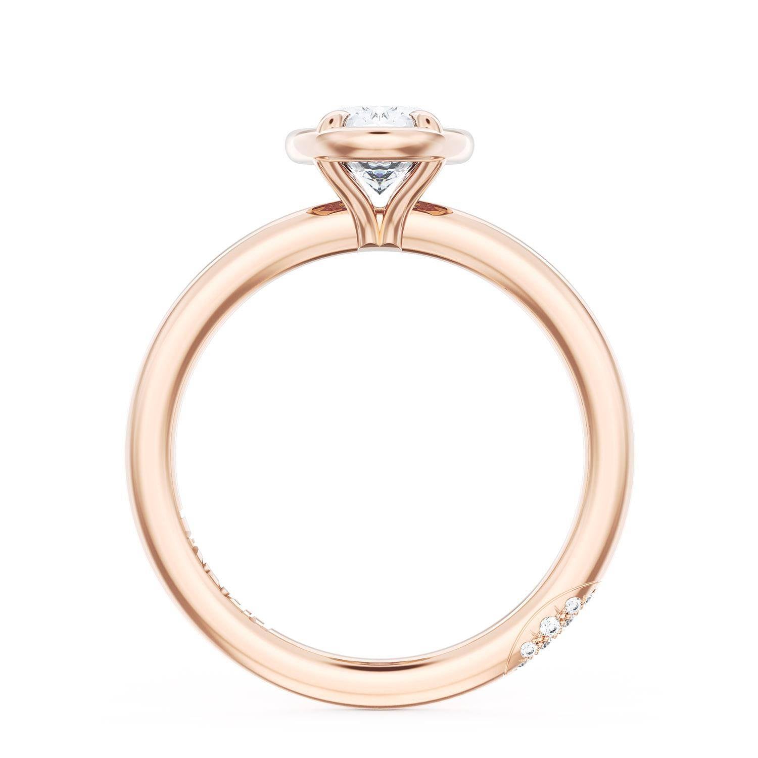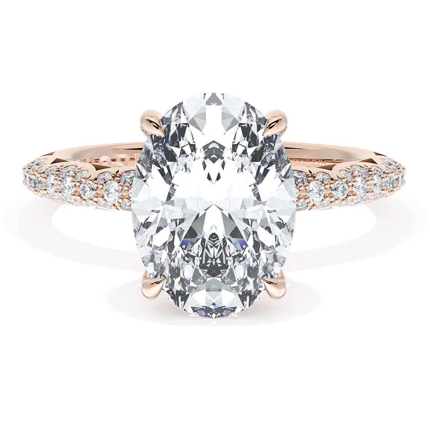 A Princess Solitaire is set into a unique corset-inspired crown on a 18kt Rose Gold foundation. Pavé-set diamonds decorate the ceiling and a diamond-studded Founder's Crescent marks the resting point.