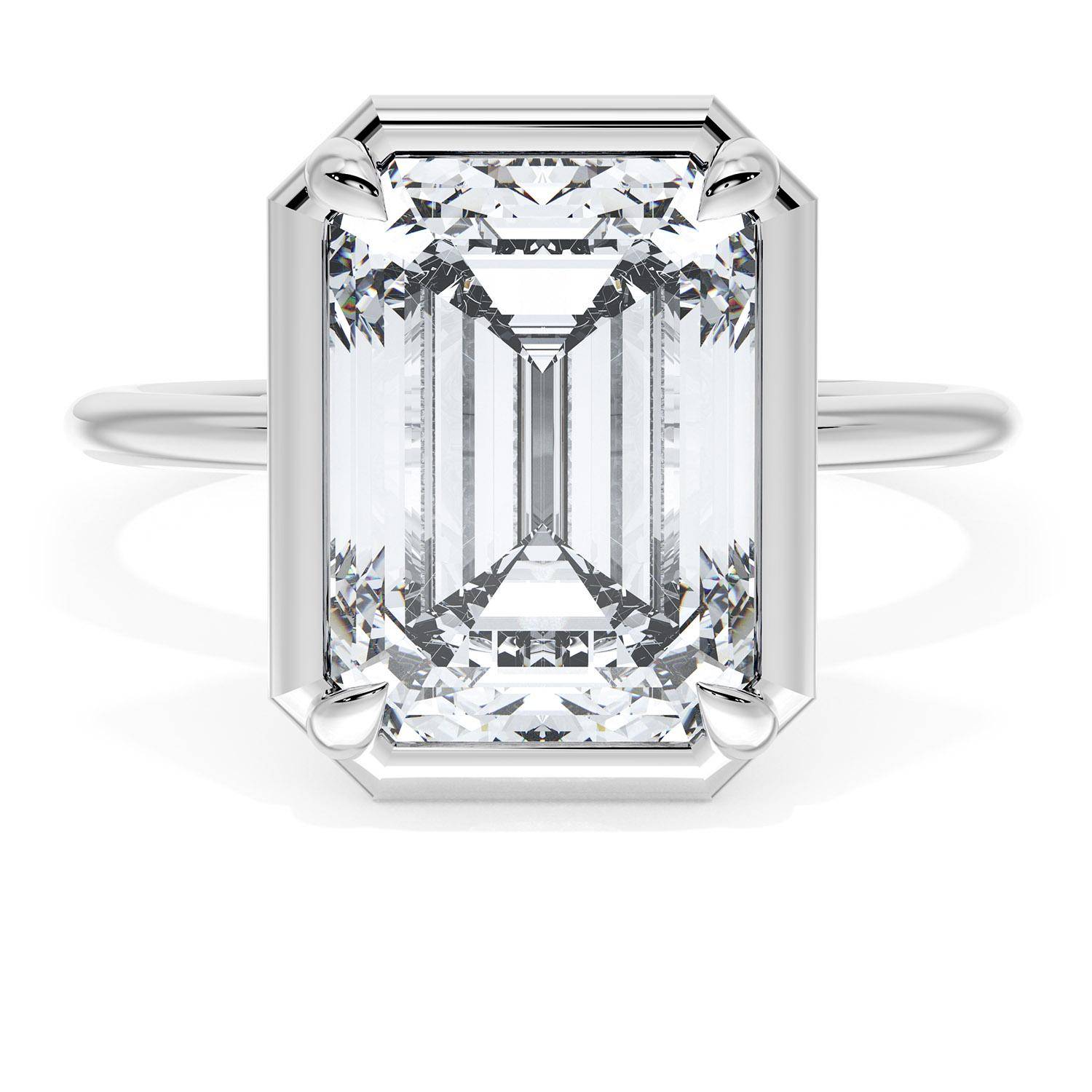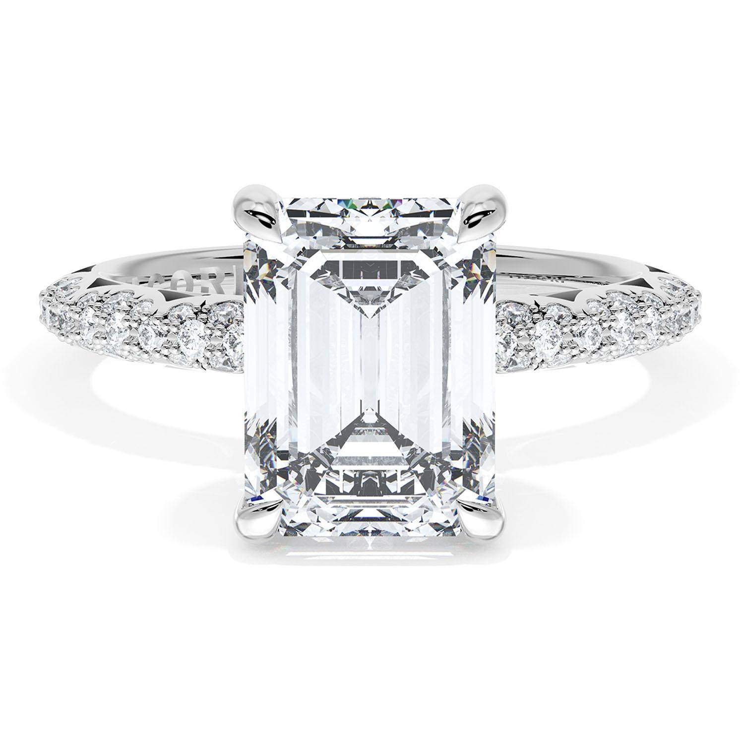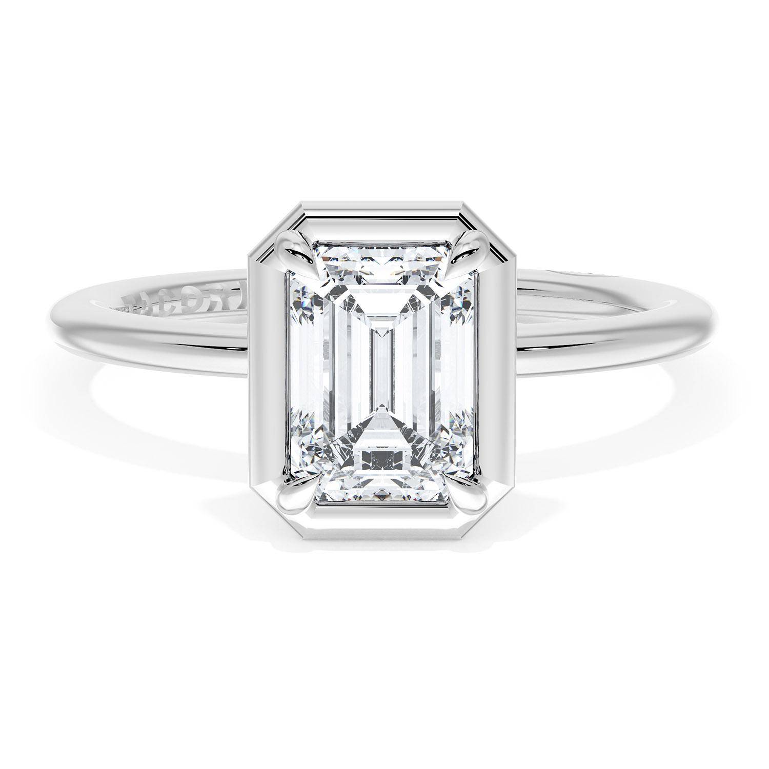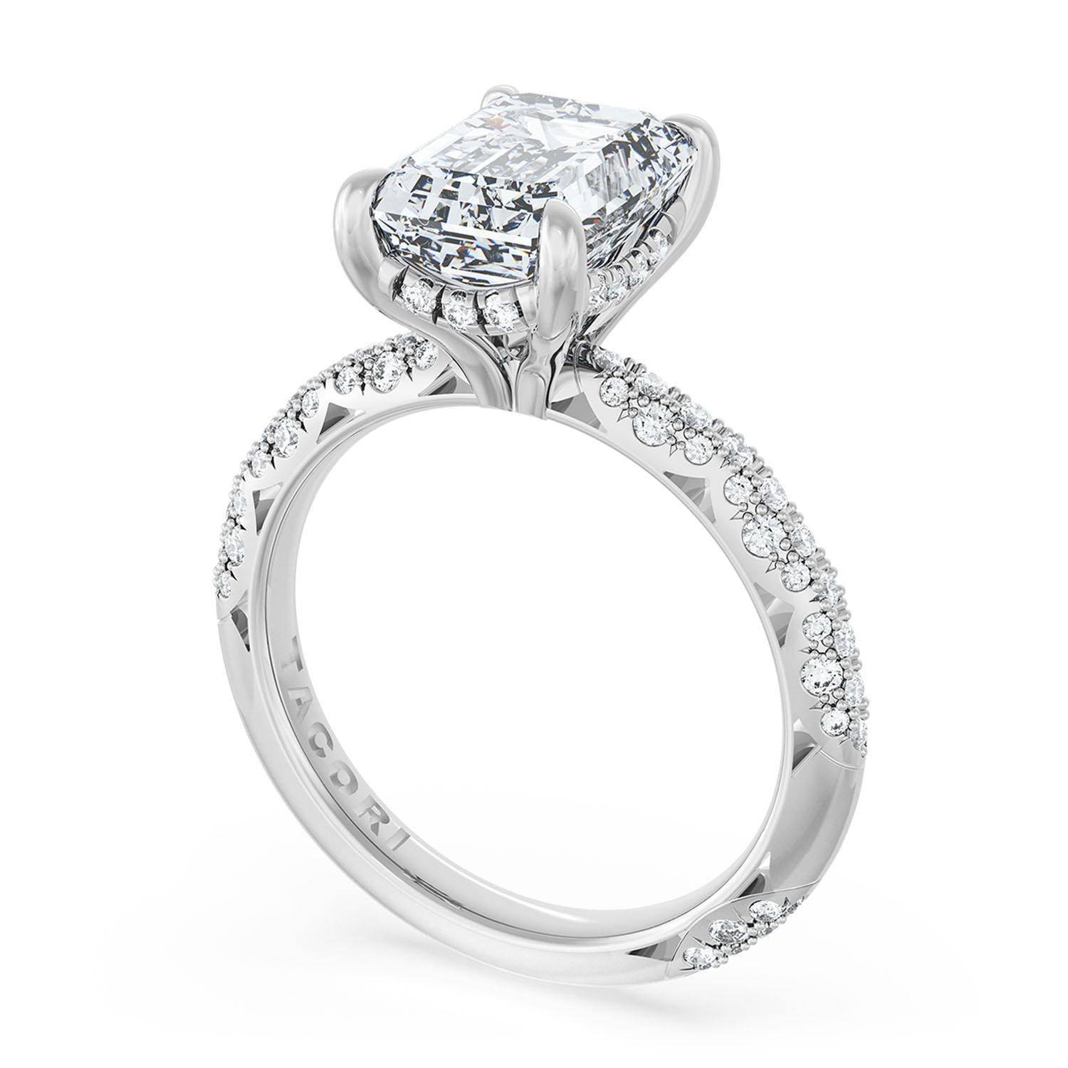 An Emerald Solitaire is set into a unique corset-inspired crown on a Platinum foundation. Pavé-set diamonds decorate the ceiling and a diamond-studded Founder's Crescent marks the resting point.