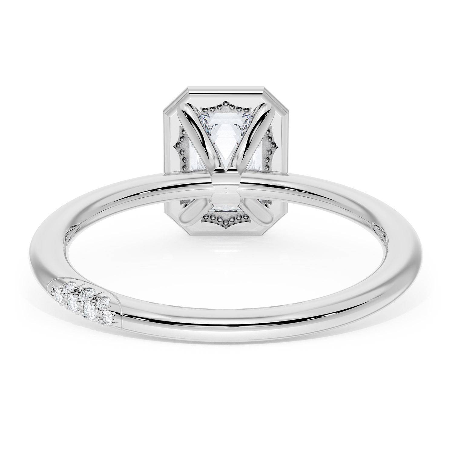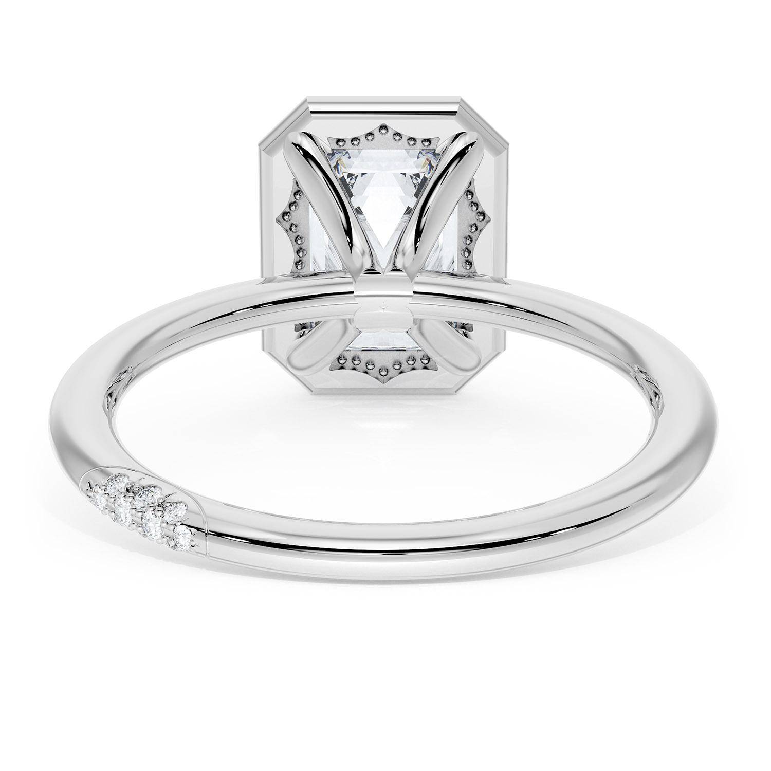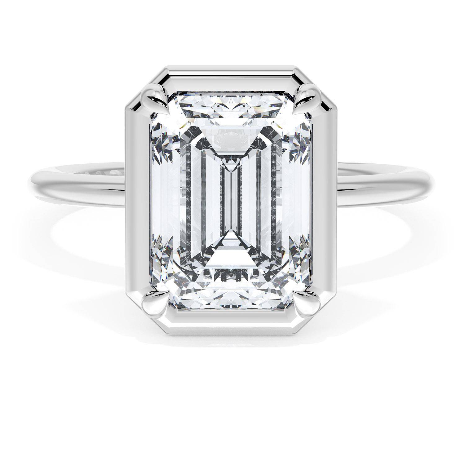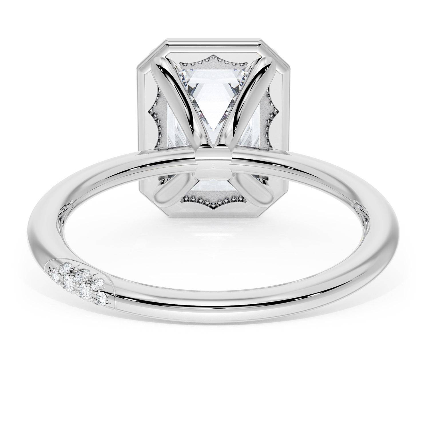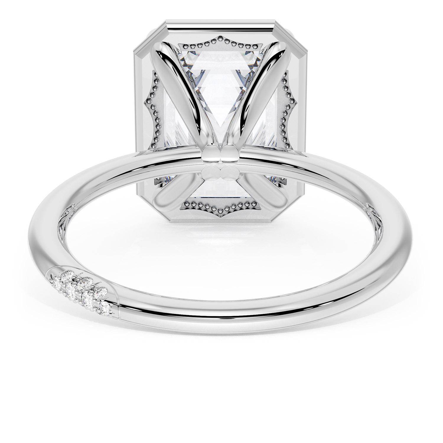 An Emerald Solitaire is set into a unique corset-inspired crown on a Platinum foundation. Pavé-set diamonds decorate the ceiling and a diamond-studded Founder's Crescent marks the resting point.