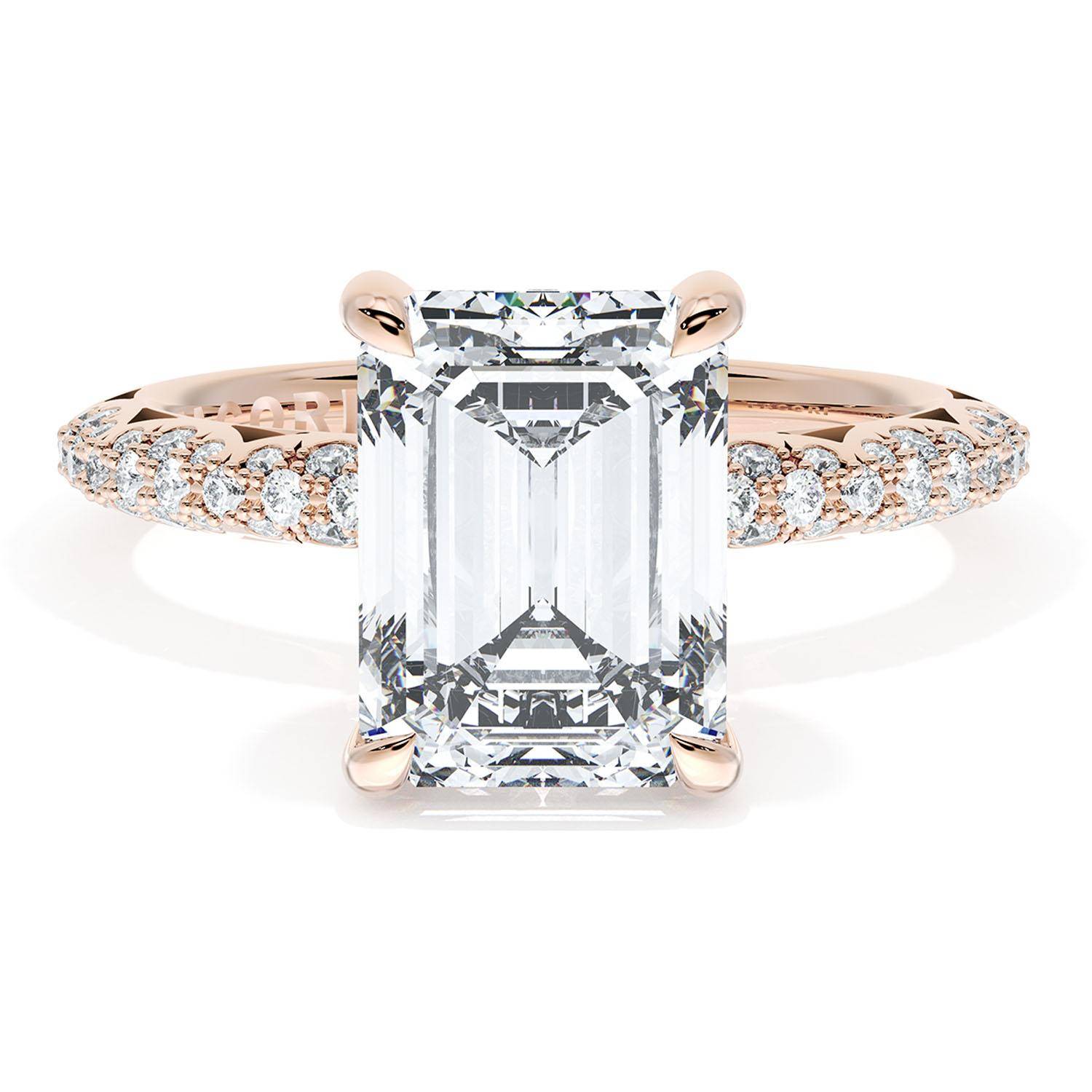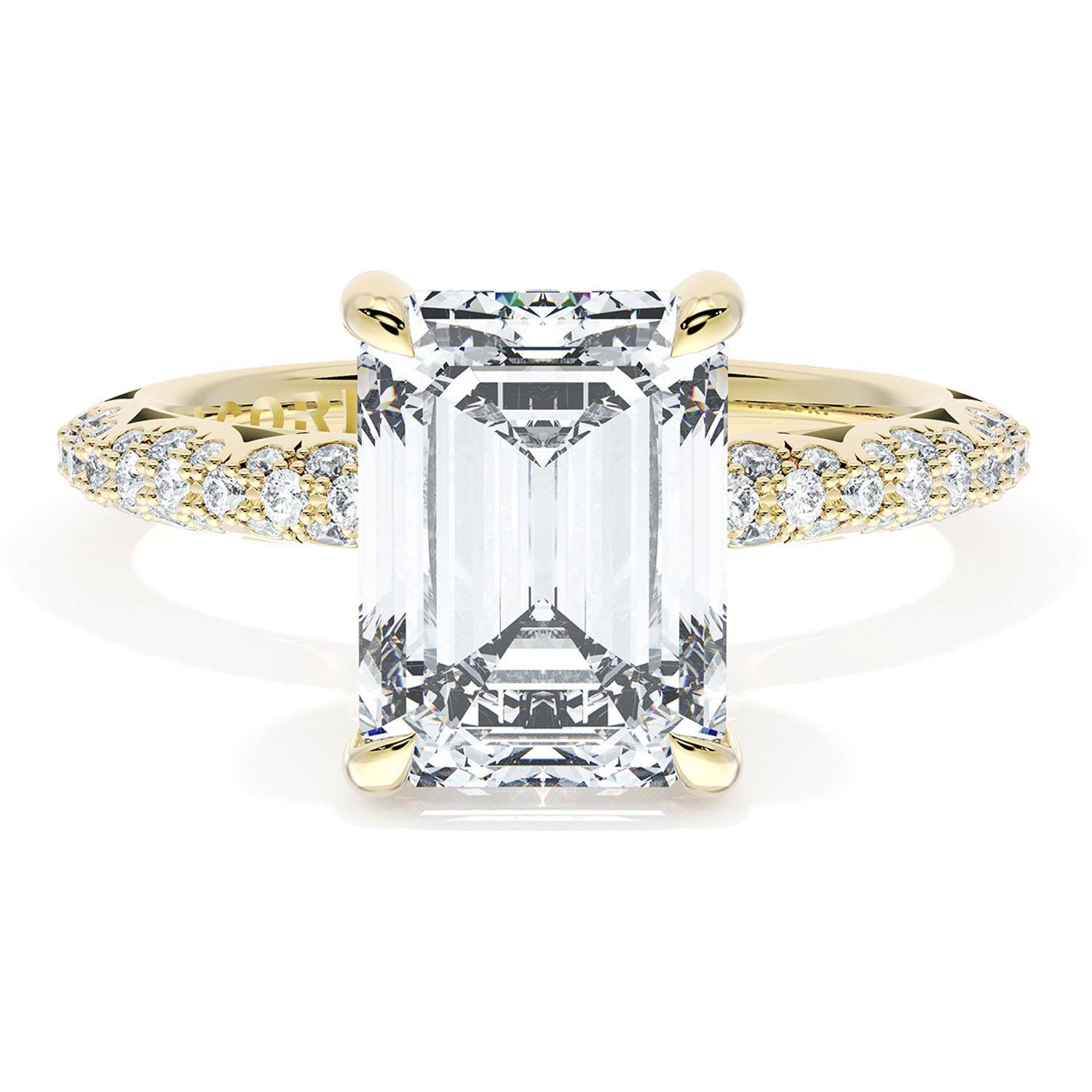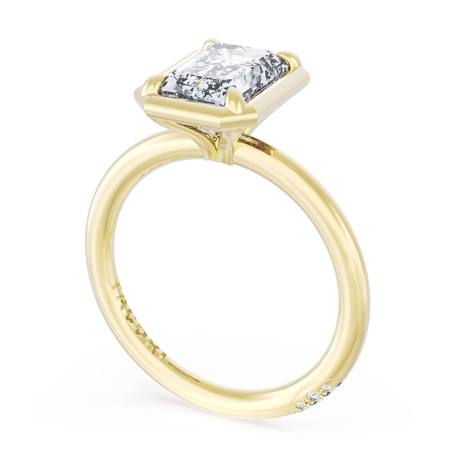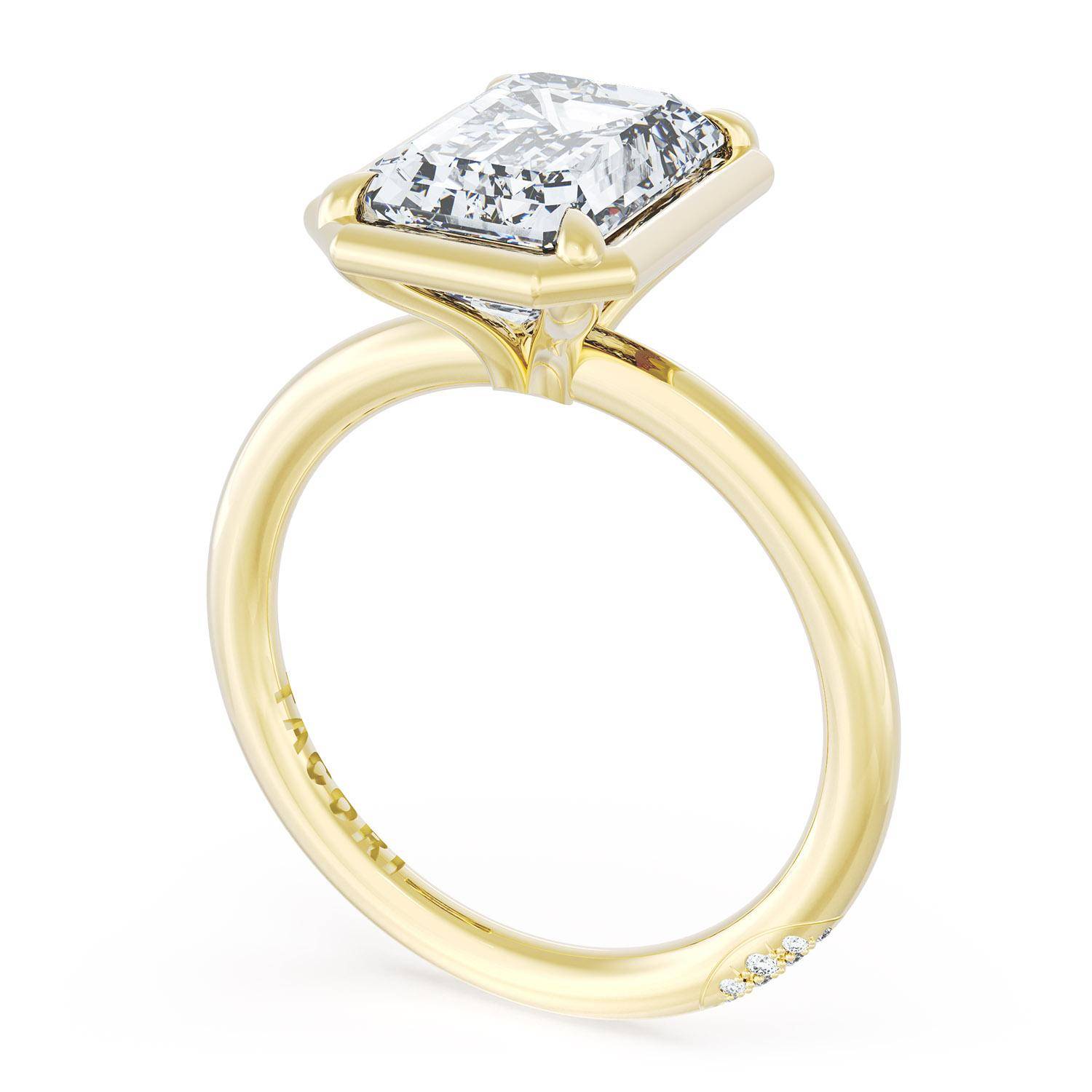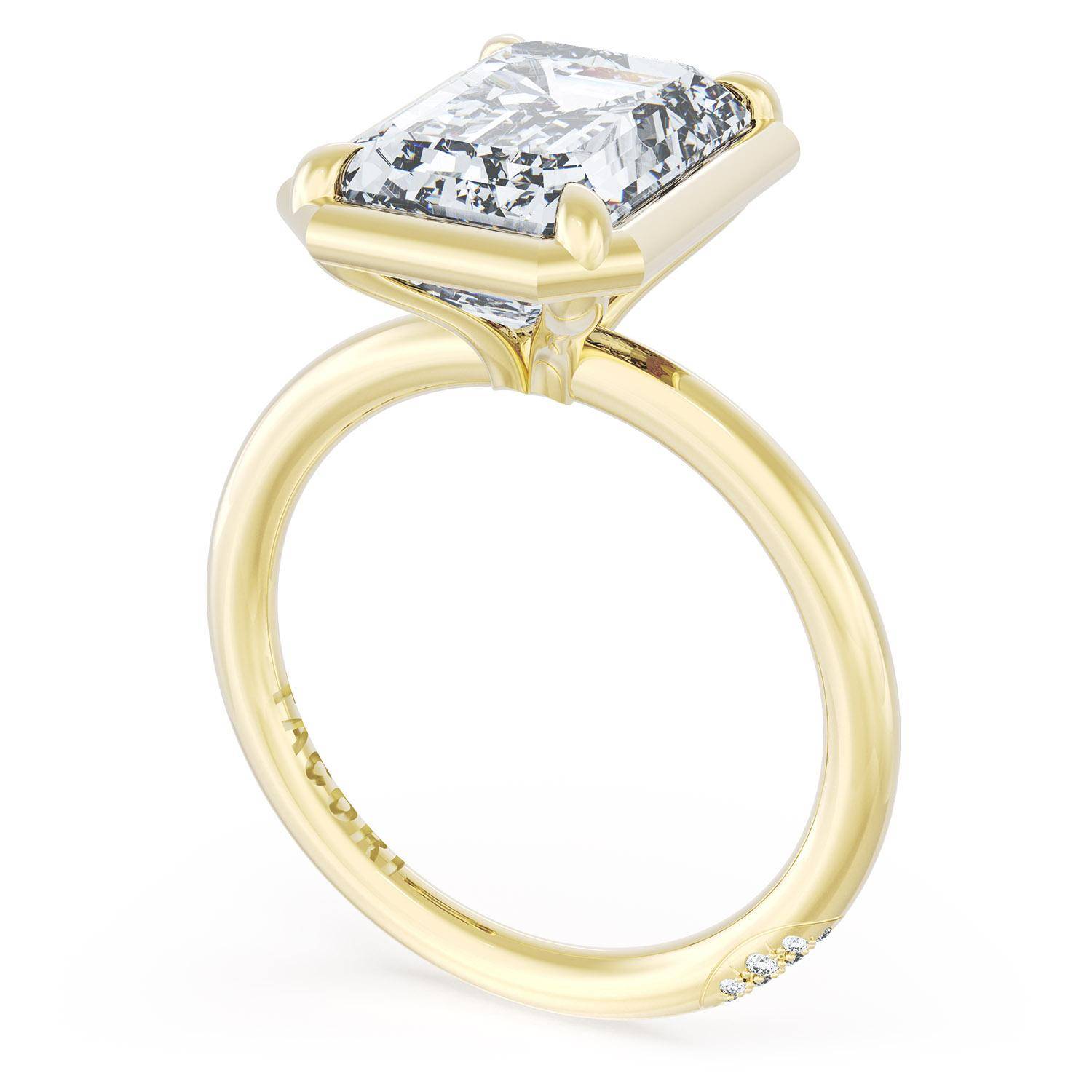 An Emerald solitaire is elevated by a modern bloom of round brilliant diamonds, and set into a high-polish 18kt Yellow Gold foundation. TACORI Crescents add hidden detail to the underside of the crown.