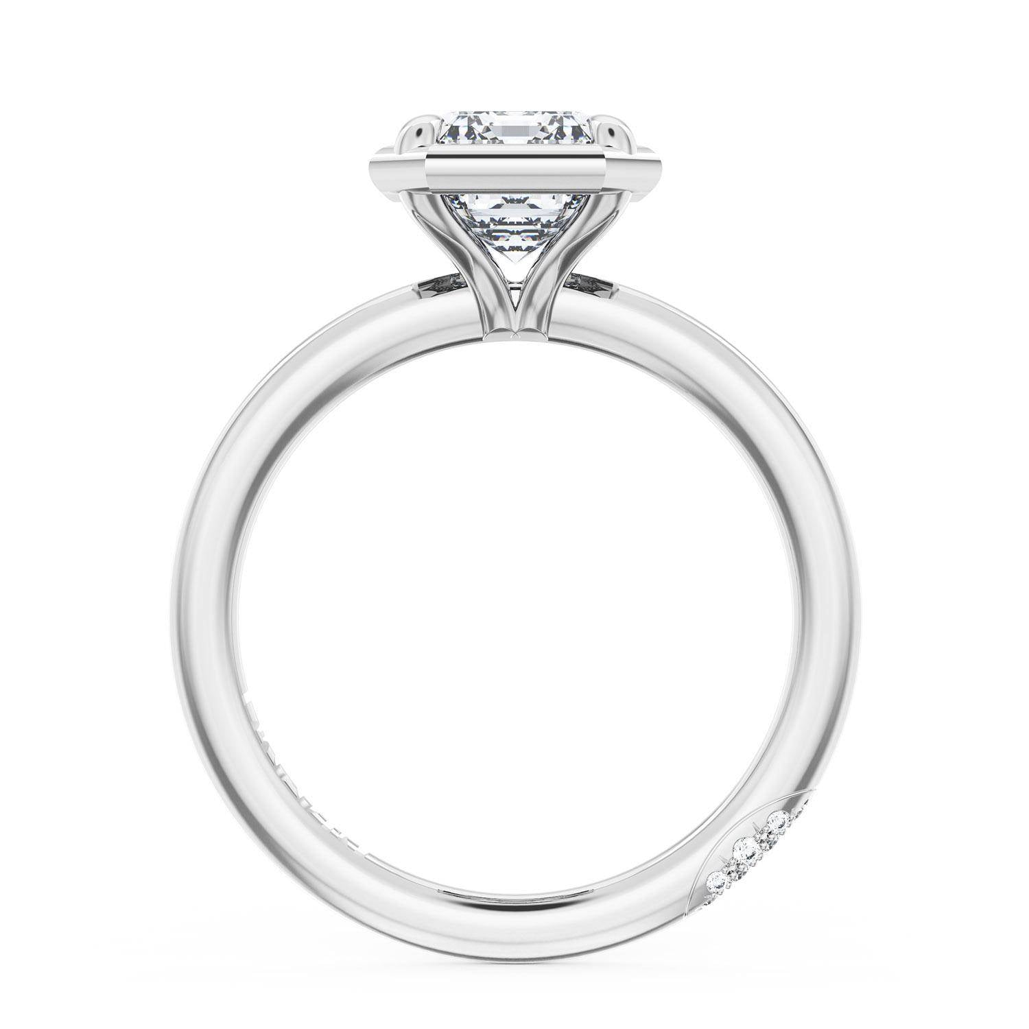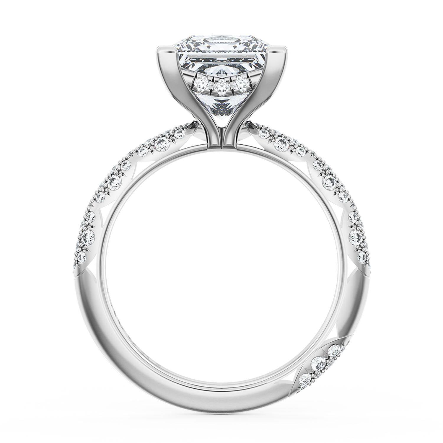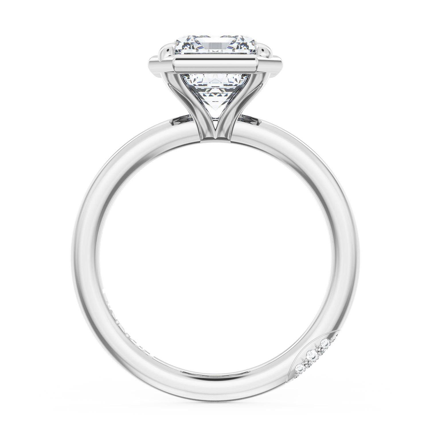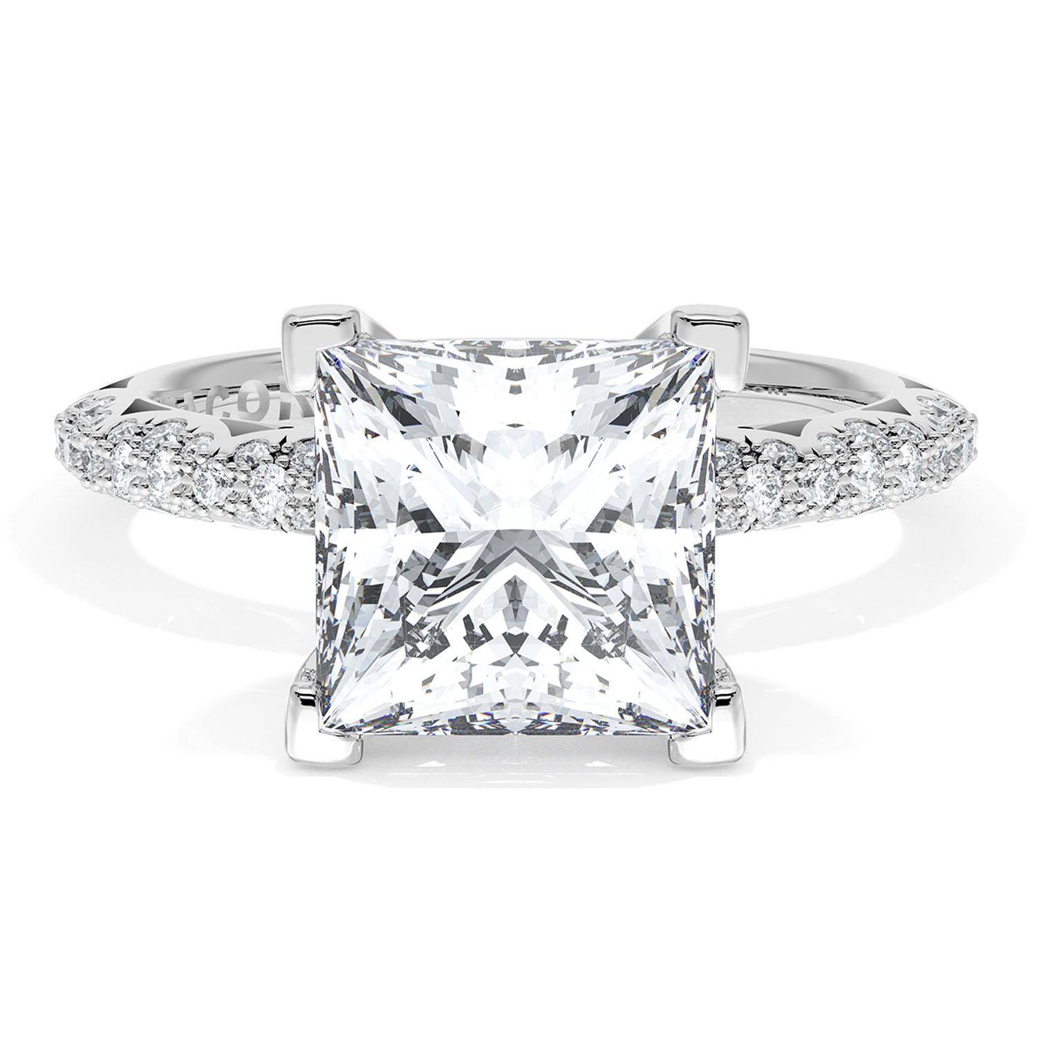 A Princess Solitaire is set into a unique corset-inspired crown on a 18kt White Gold foundation. Pavé-set diamonds decorate the ceiling and a diamond-studded Founder's Crescent marks the resting point.