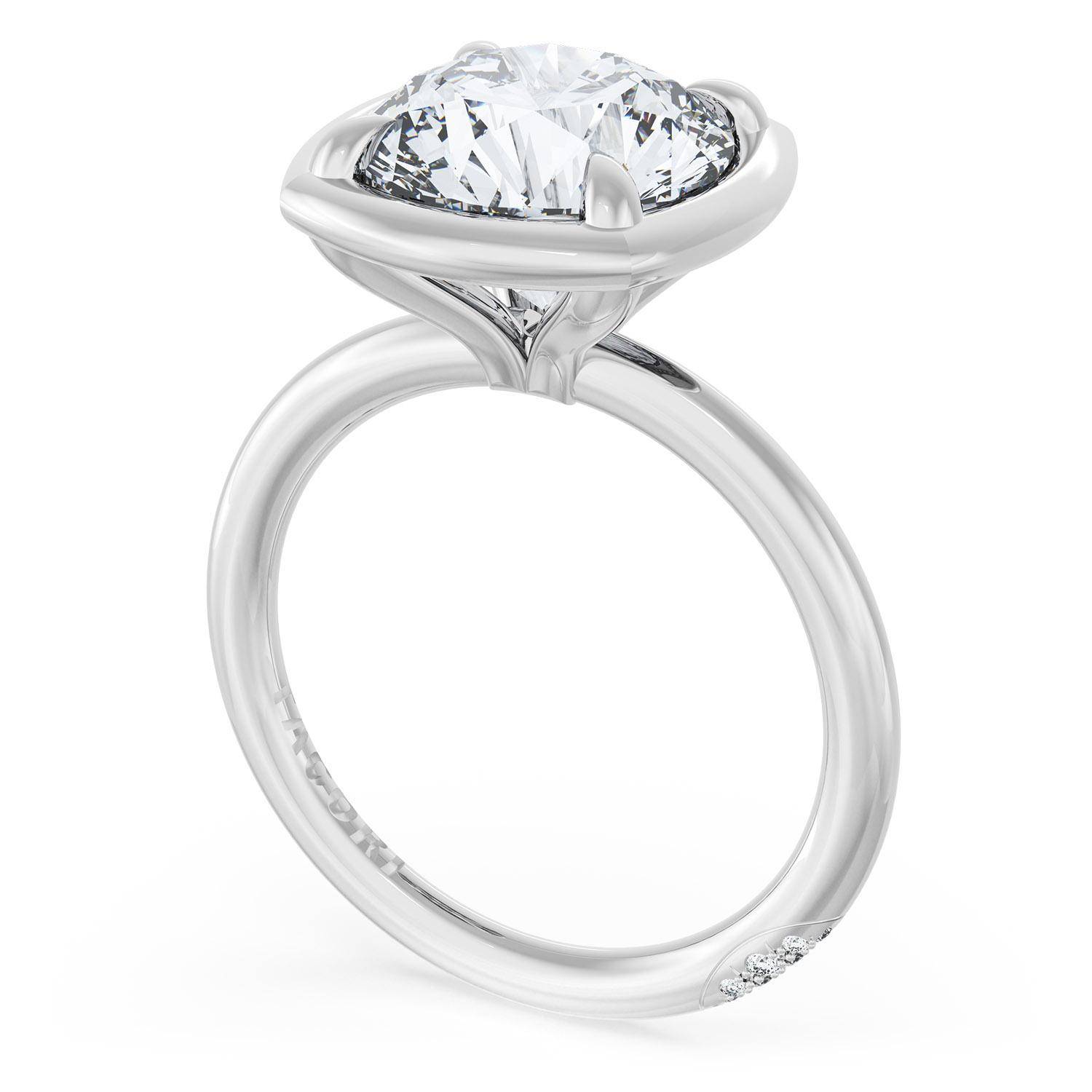A Round solitaire is elevated by a modern bloom of round brilliant diamonds, and set into a high-polish Platinum foundation. TACORI Crescents add hidden detail to the underside of the crown.