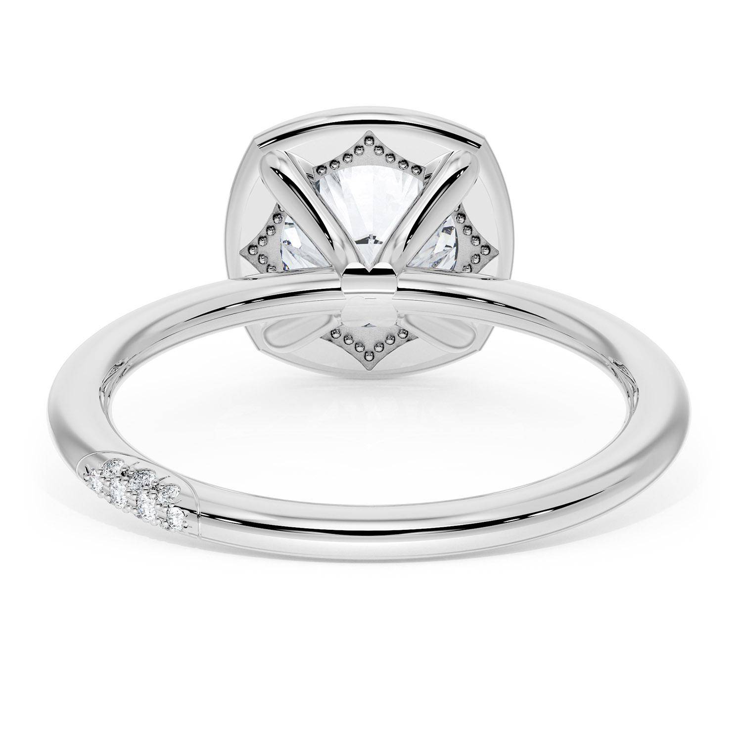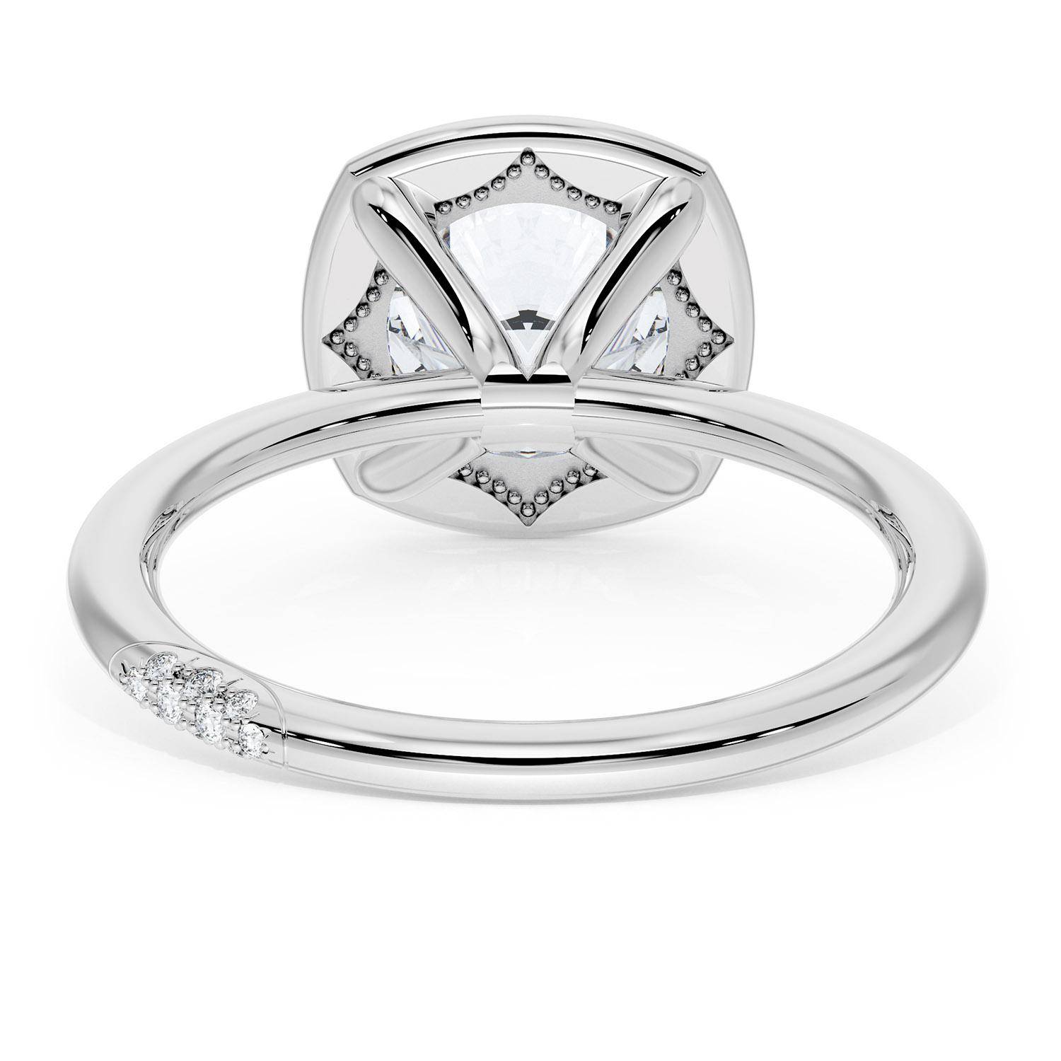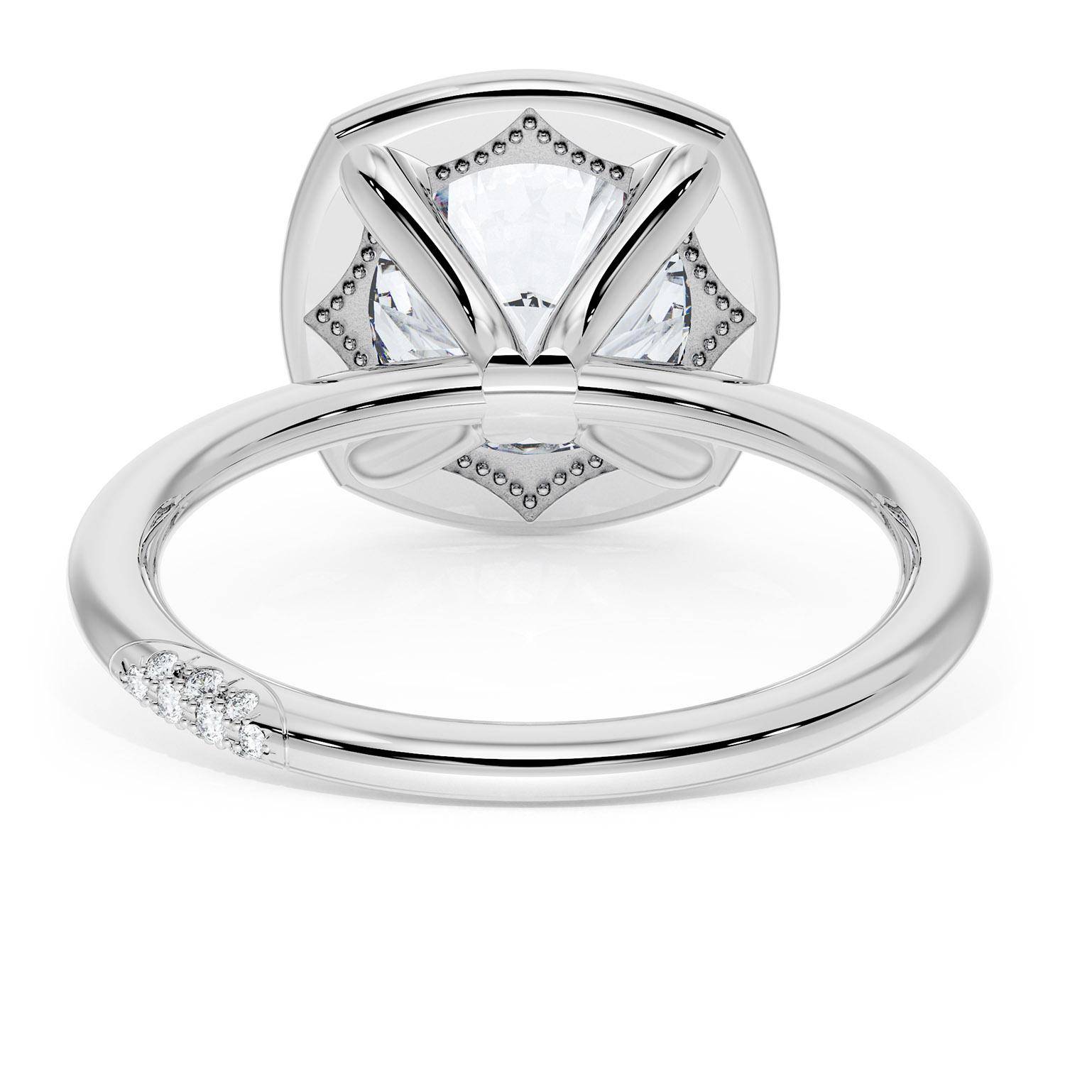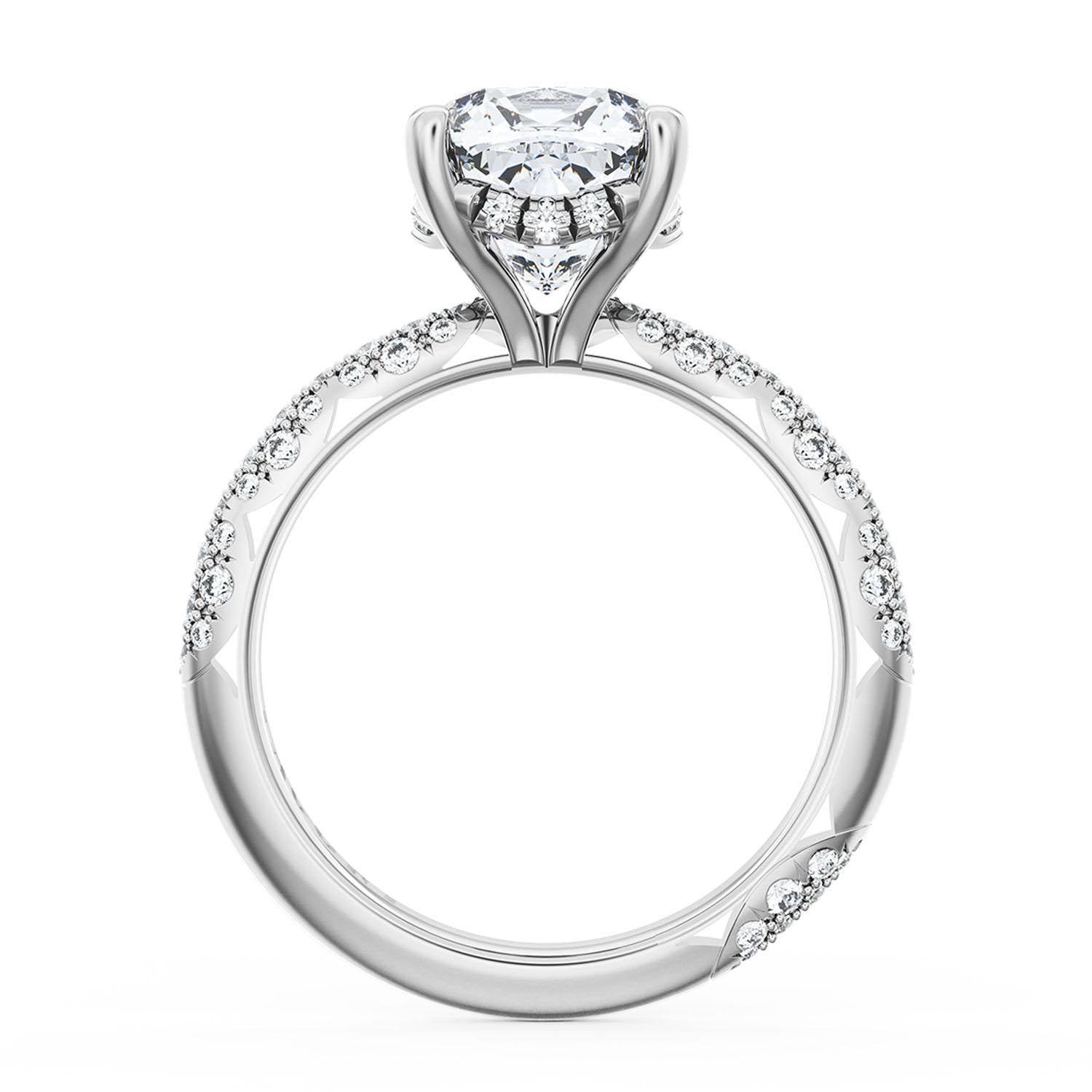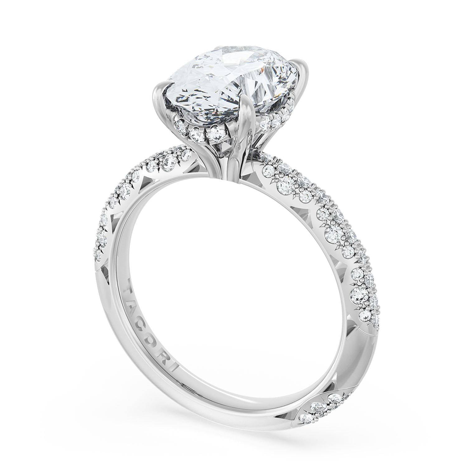 A cathedral foundation is accented with a hidden bloom of diamonds, while the Founder's Crescent Fabric wraps around the ceiling of the ring. The ring is finished with a diamond-studded Signature Crescent.